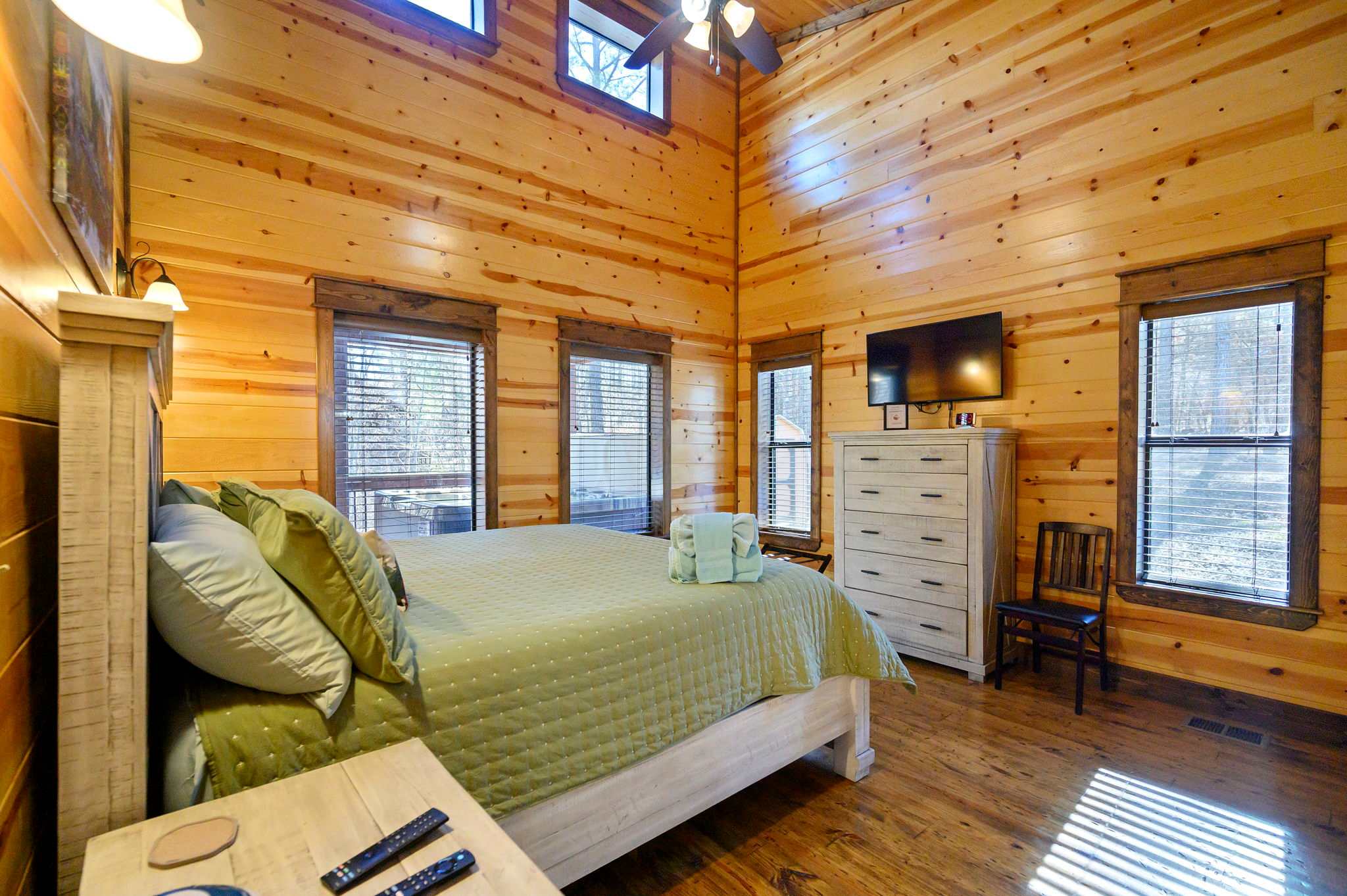 Bedroom #1 includes a king size bed, a smart TV, and an ensuite bathroom with a single vanity and a walk-in shower.