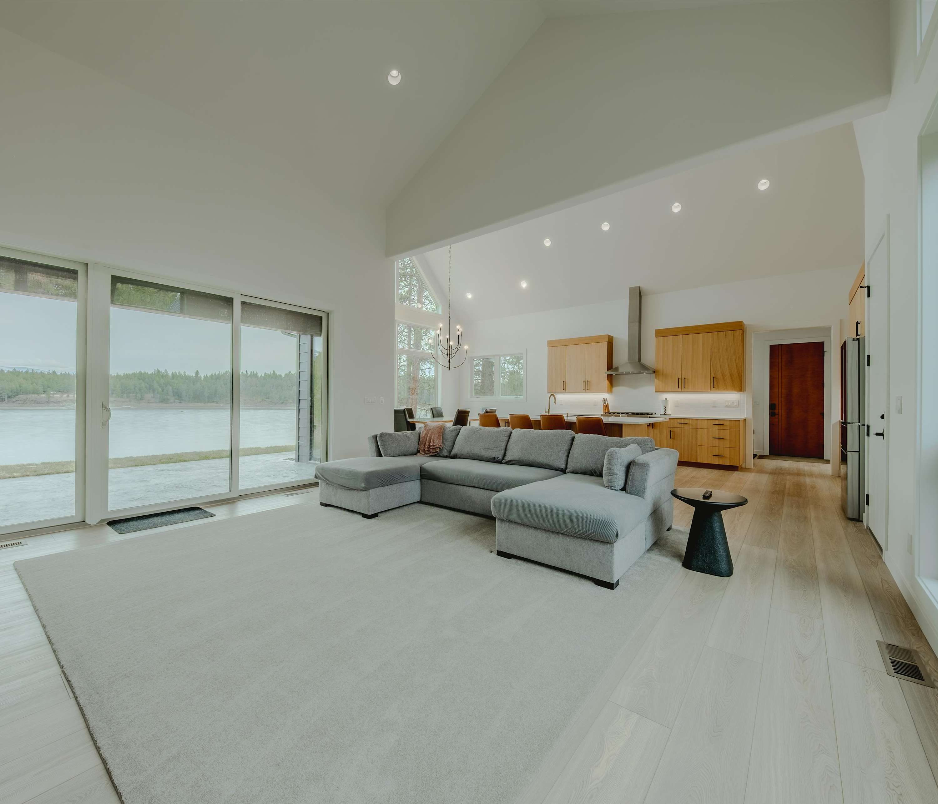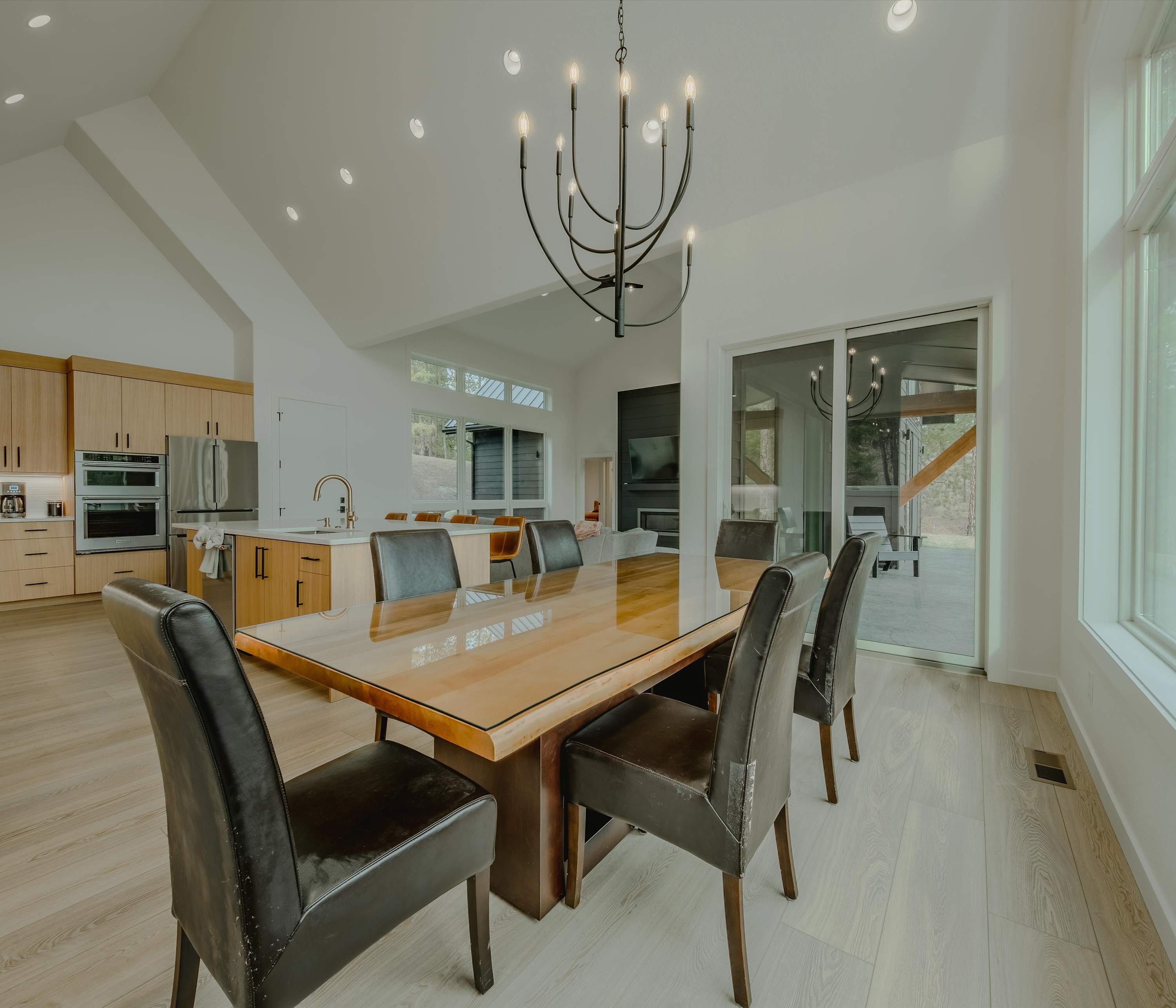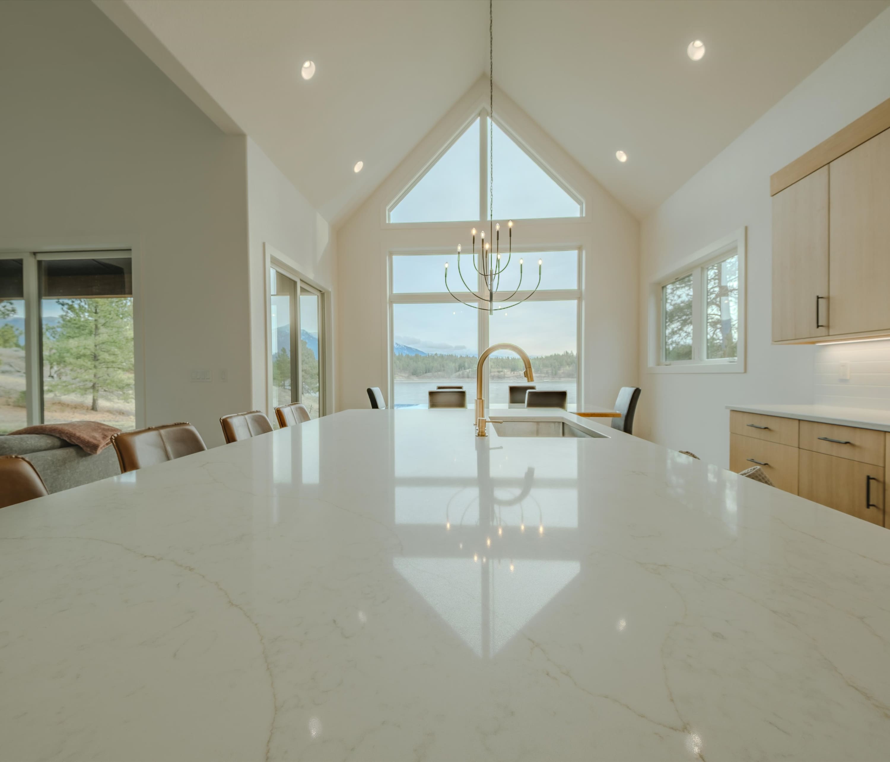 Step inside and you’re immediately greeted by walls of windows framing sparkling water and distant mountains. The living room is designed to keep those views front and center, featuring a fireplace, smart TV, and a spacious couch with two chaise loungers — perfect for stretching out after a day on the lake while still watching the light dance across the water. The kitchen blends warmth and modern style with rich cabinetry, sleek stone countertops, and stainless steel appliances. Counter seating for four keeps things casual for morning coffee or quick bites, while the dining table for six sits beside expansive windows overlooking the lake — turning every meal into a waterfront experience.