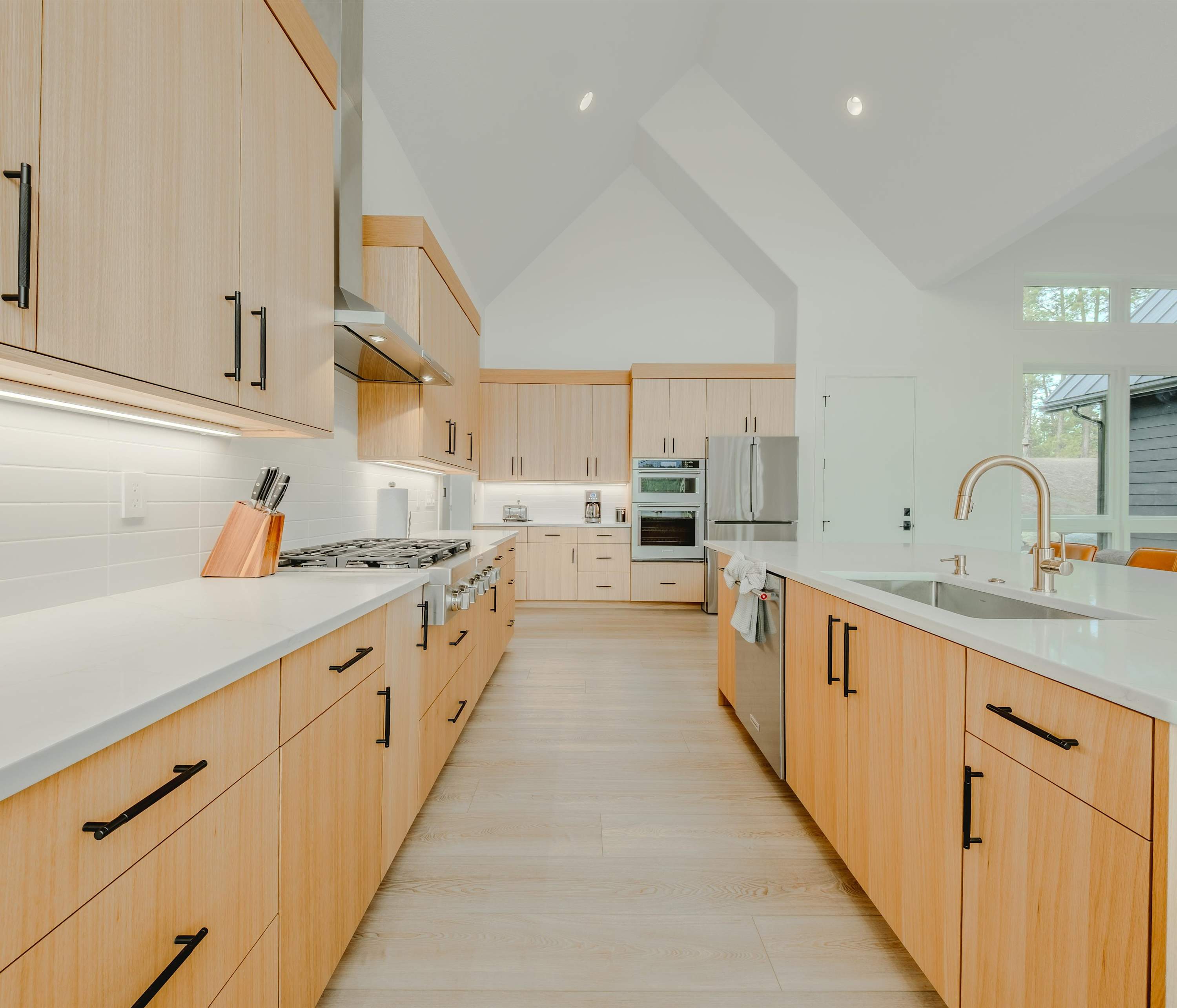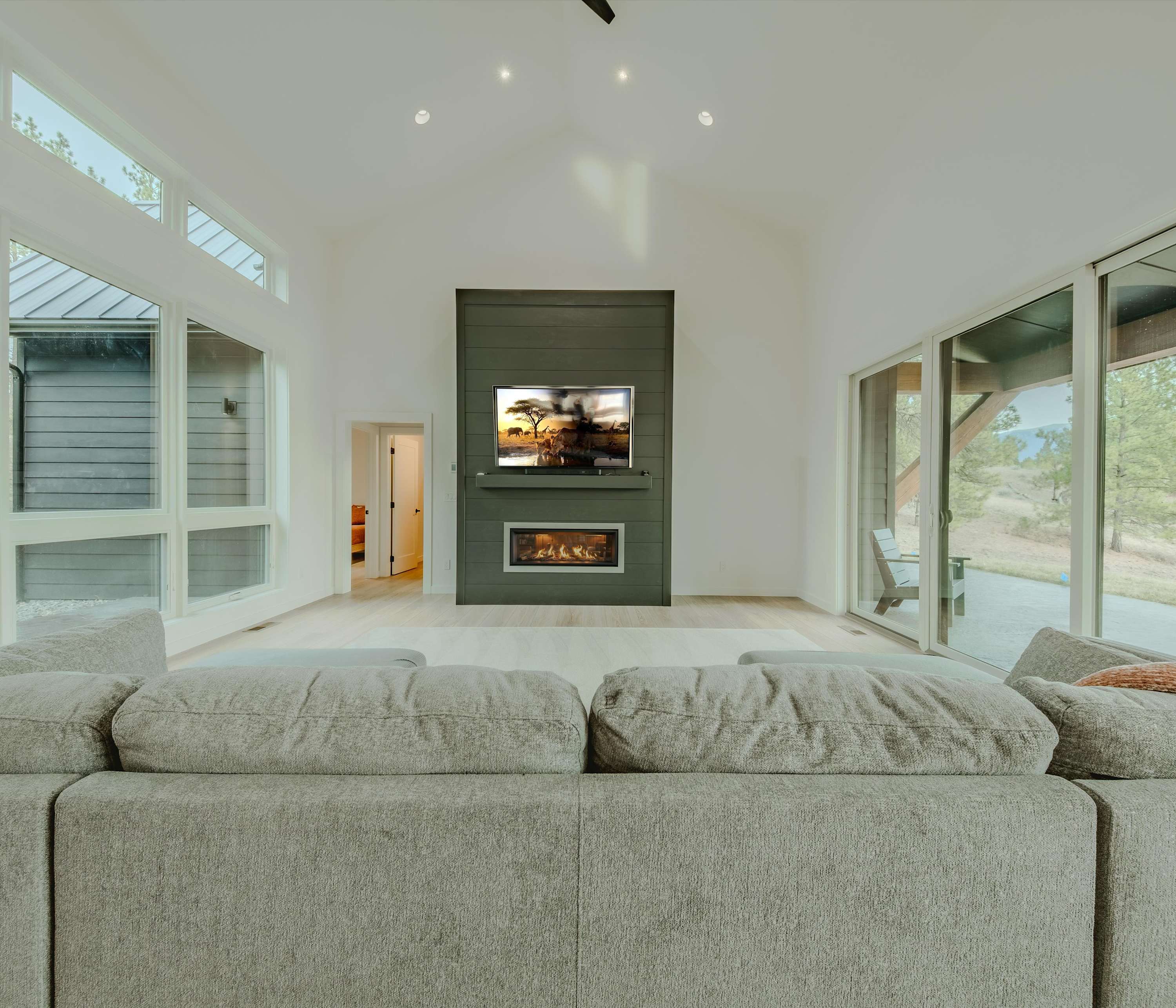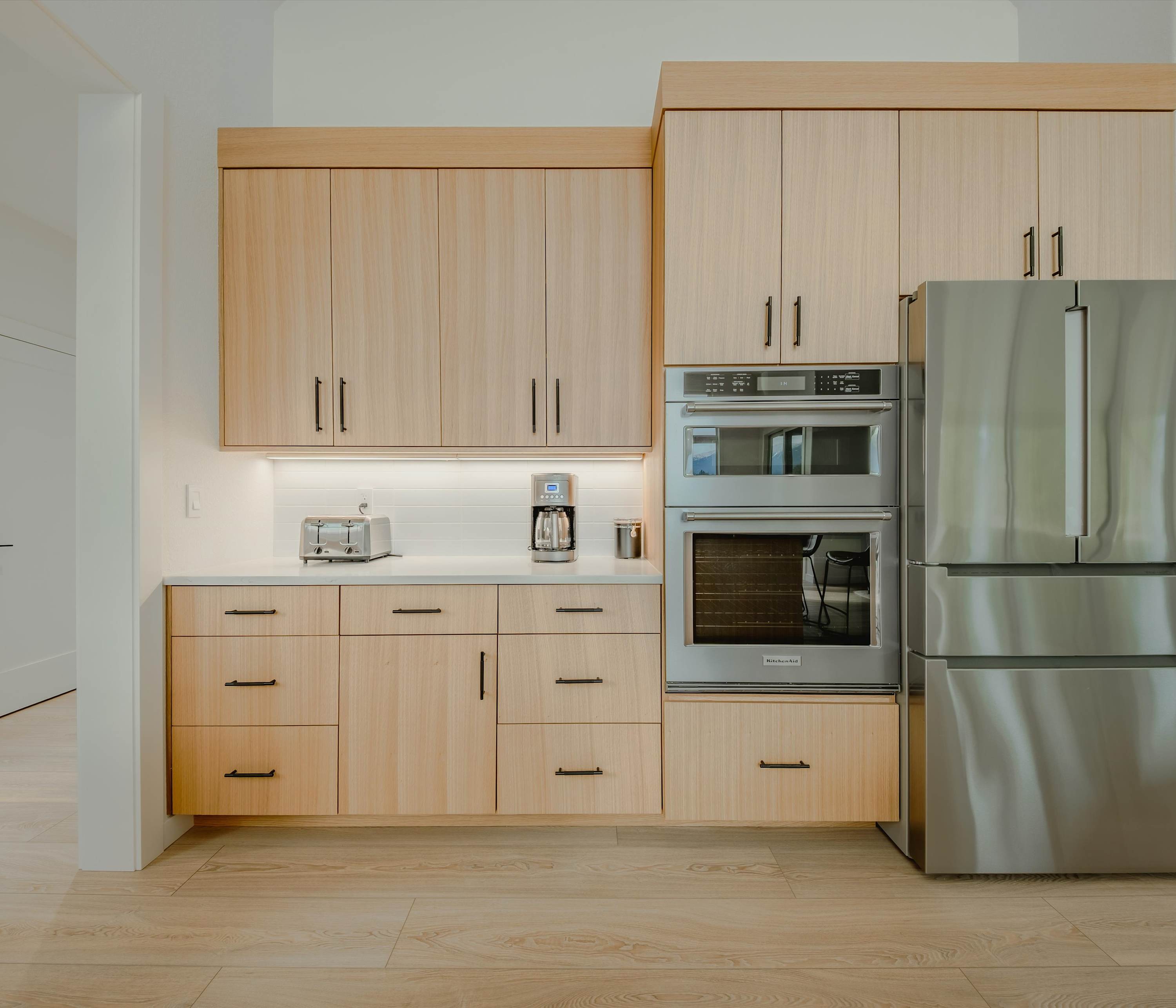 Step inside and you’re immediately greeted by walls of windows framing sparkling water and distant mountains. The living room is designed to keep those views front and center, featuring a fireplace, smart TV, and a spacious couch with two chaise loungers — perfect for stretching out after a day on the lake while still watching the light dance across the water. The kitchen blends warmth and modern style with rich cabinetry, sleek stone countertops, and stainless steel appliances. Counter seating for four keeps things casual for morning coffee or quick bites, while the dining table for six sits beside expansive windows overlooking the lake — turning every meal into a waterfront experience.