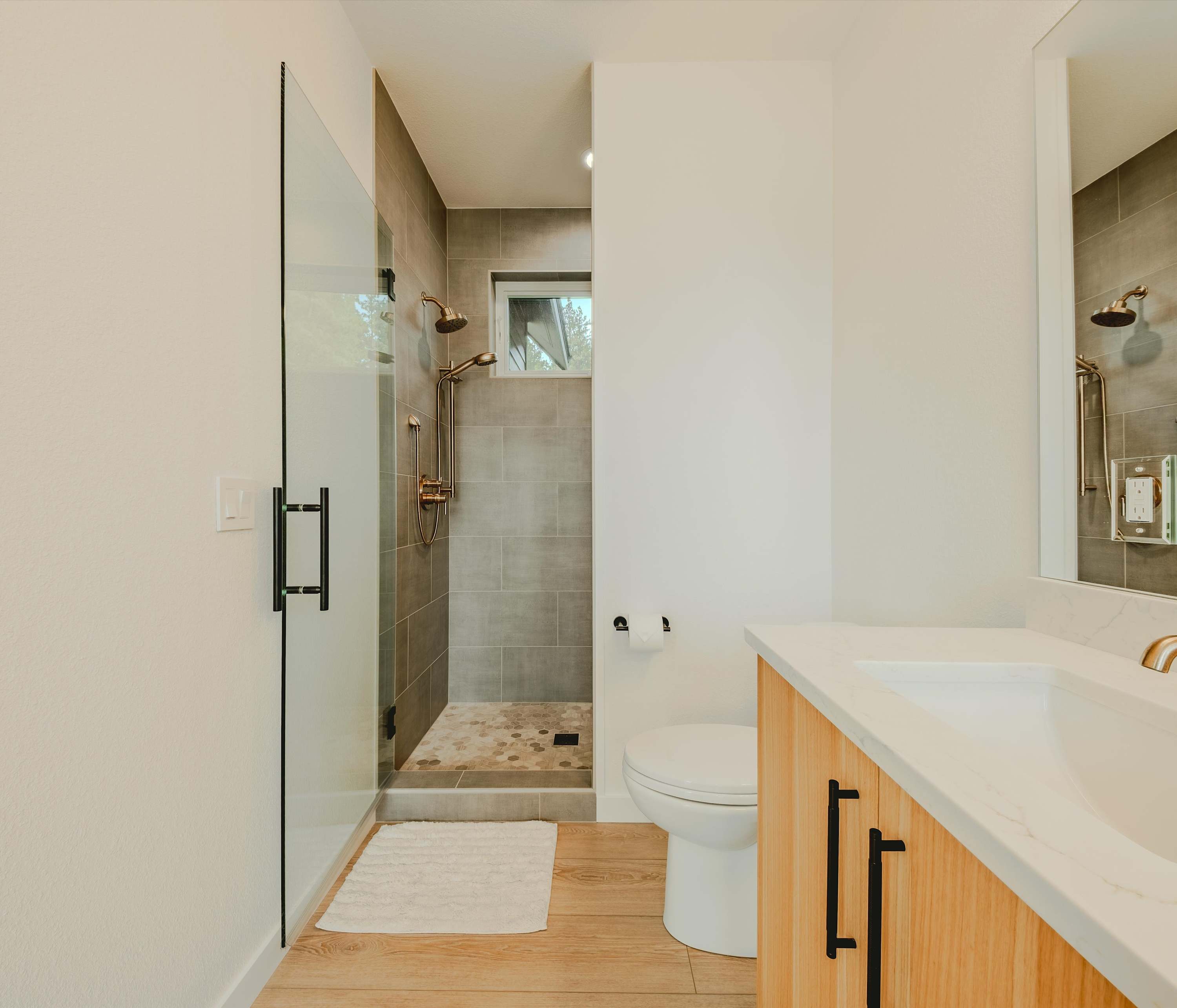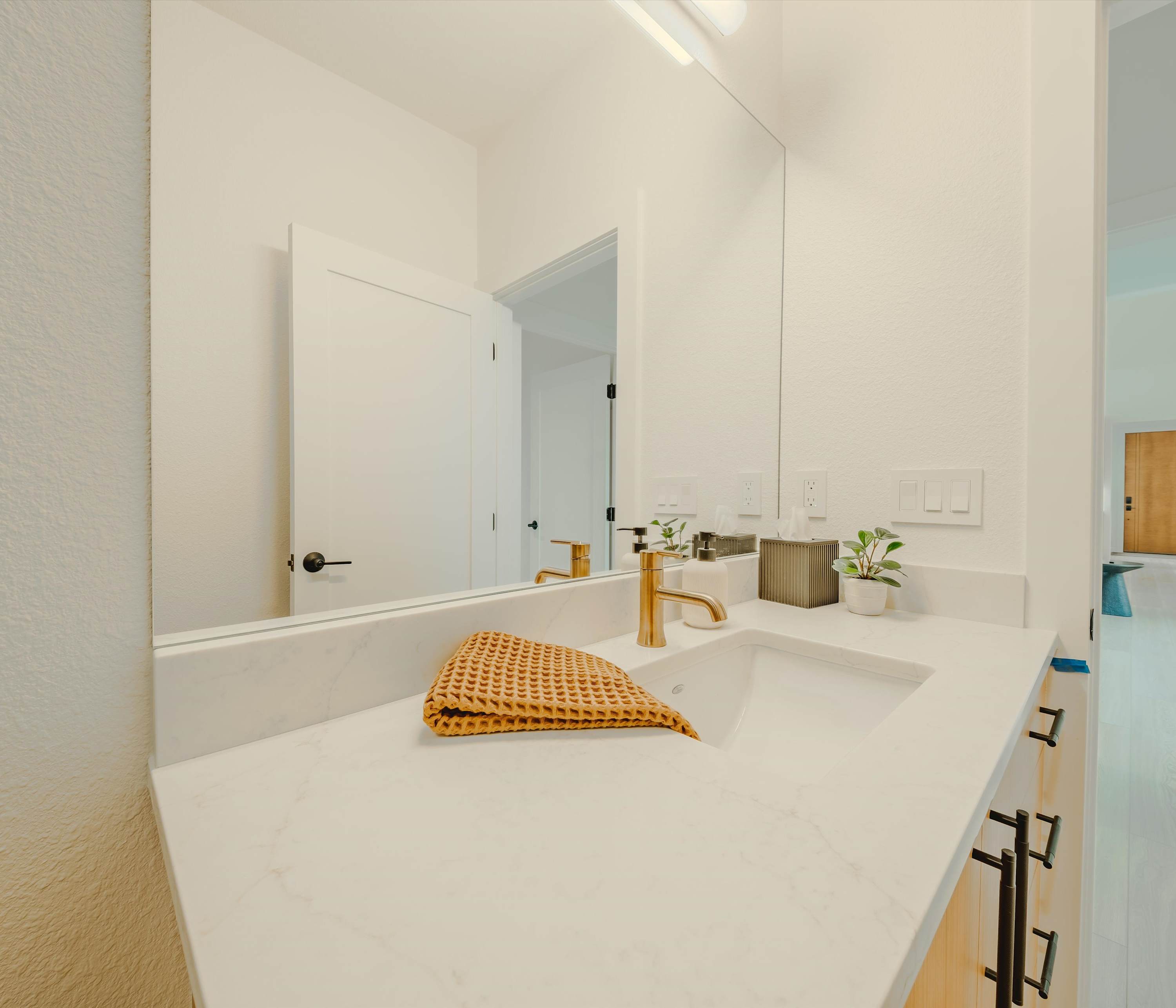 This home includes an additional full guest bathroom with a single vanity and a walk-in shower.