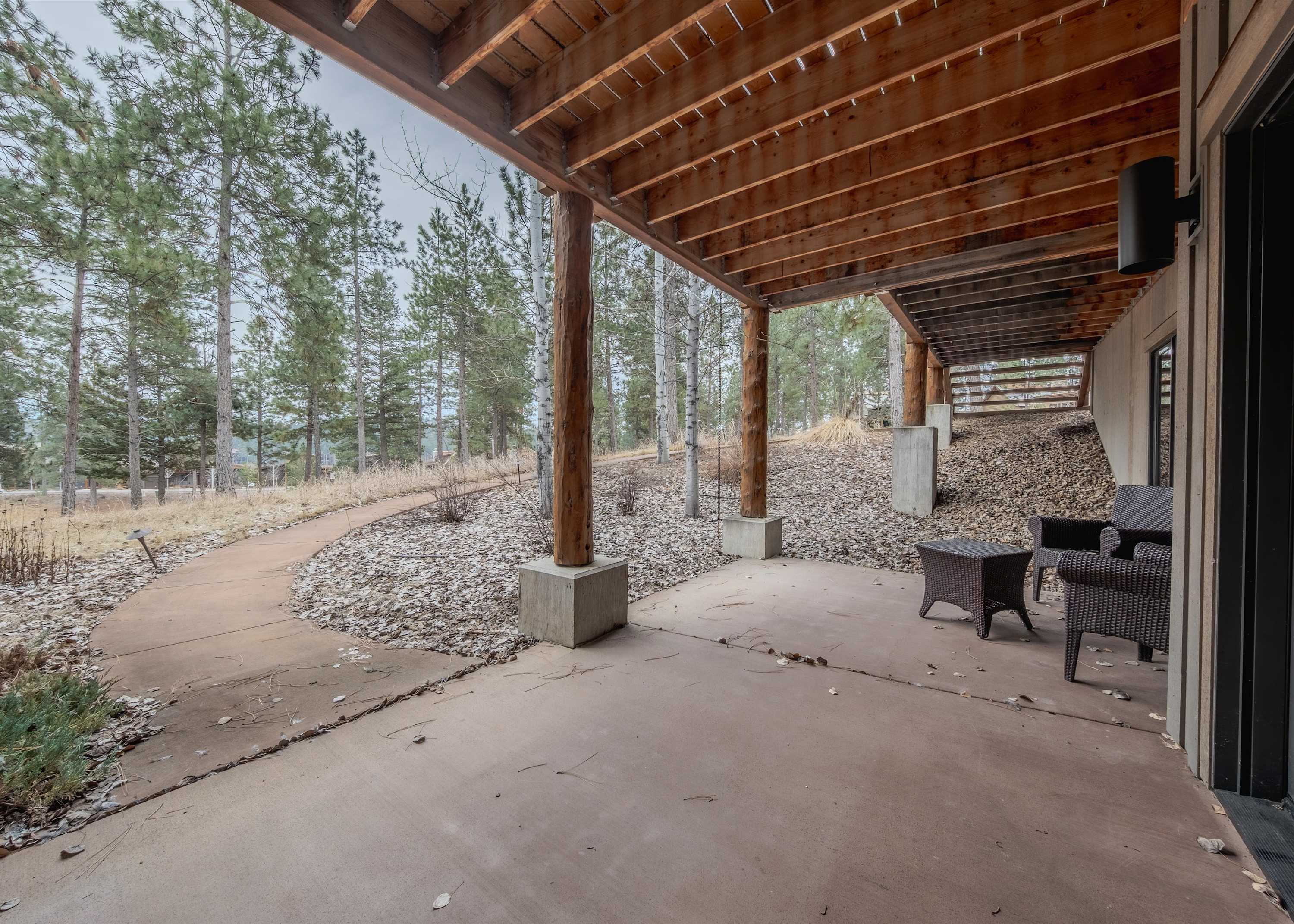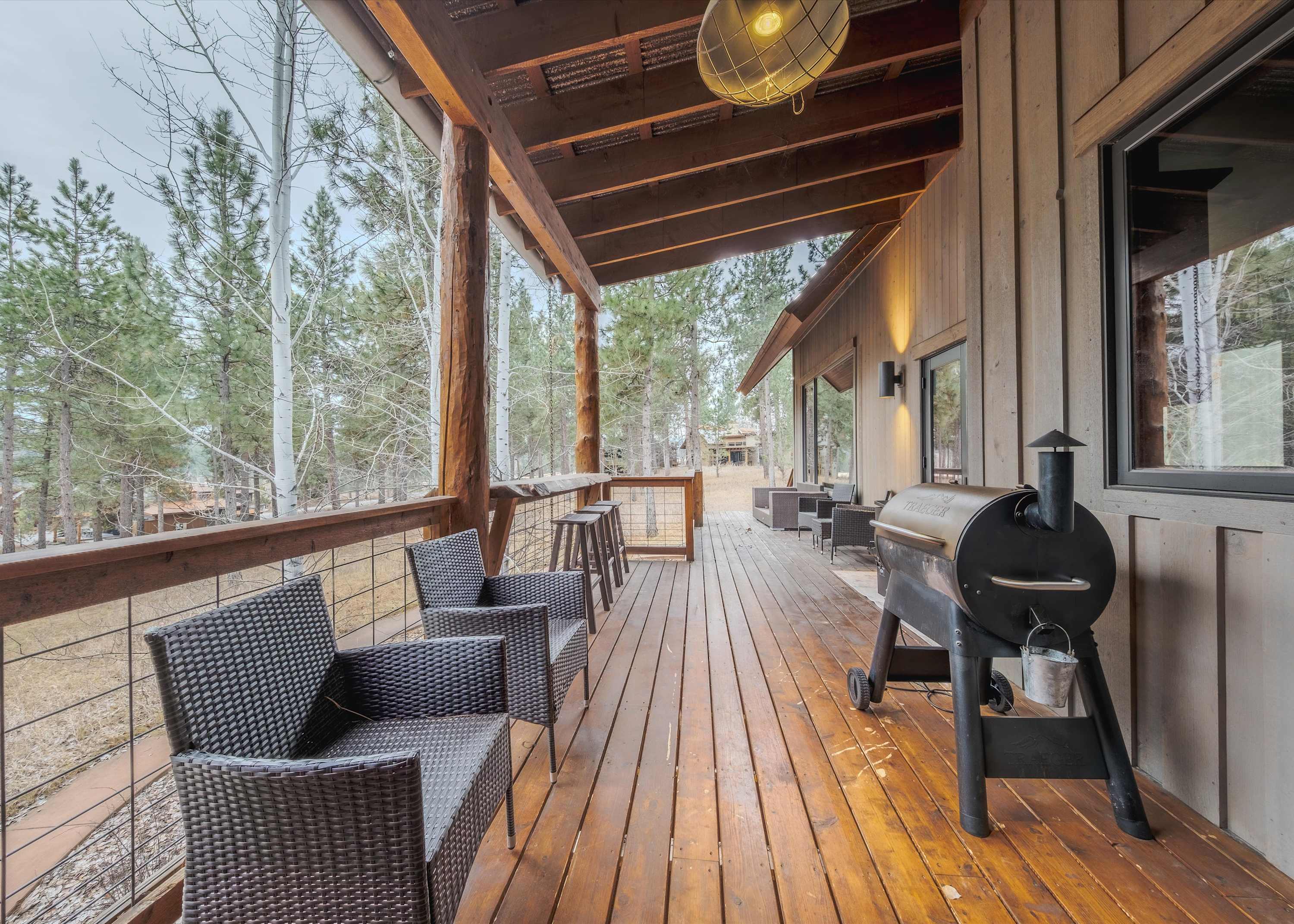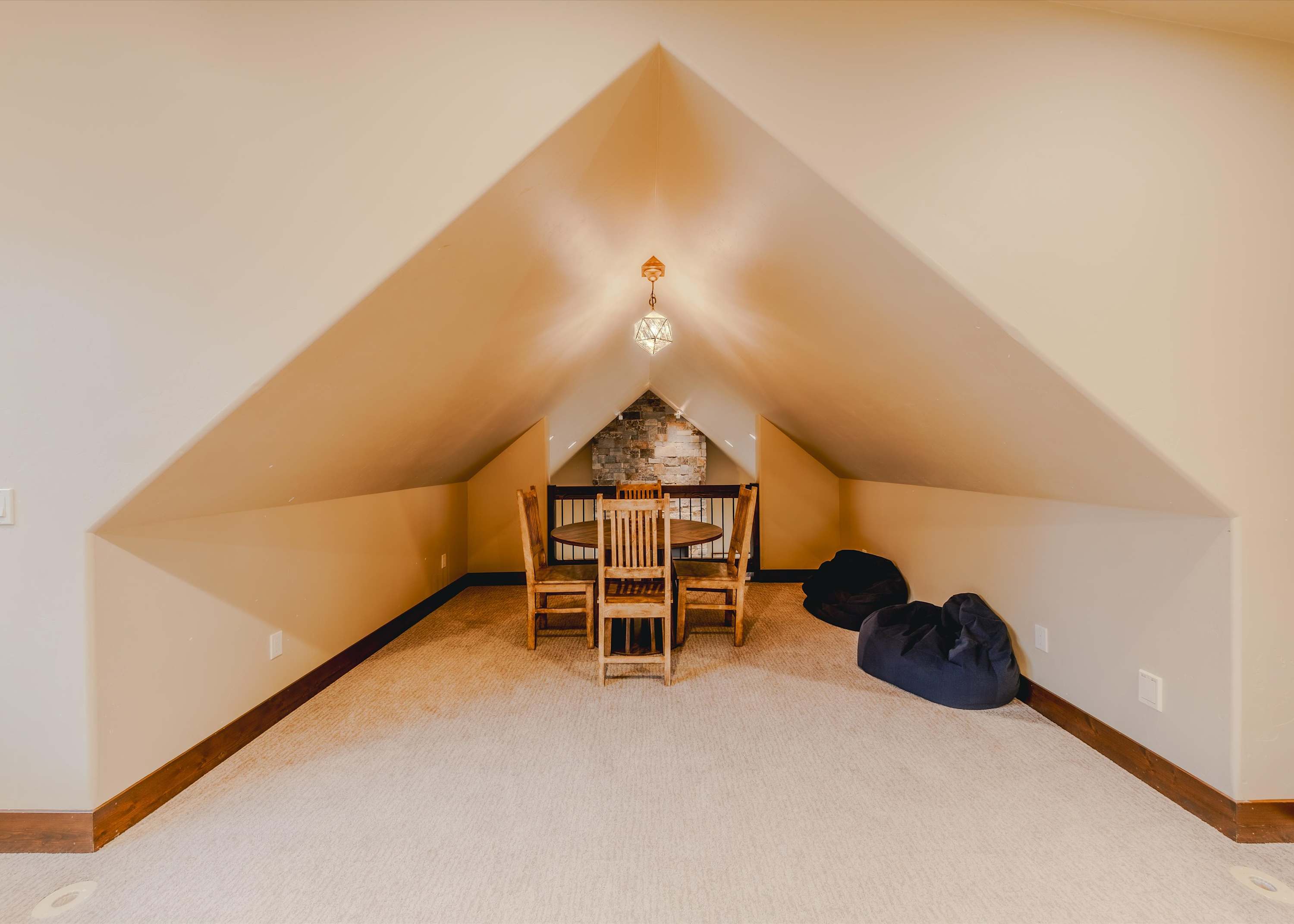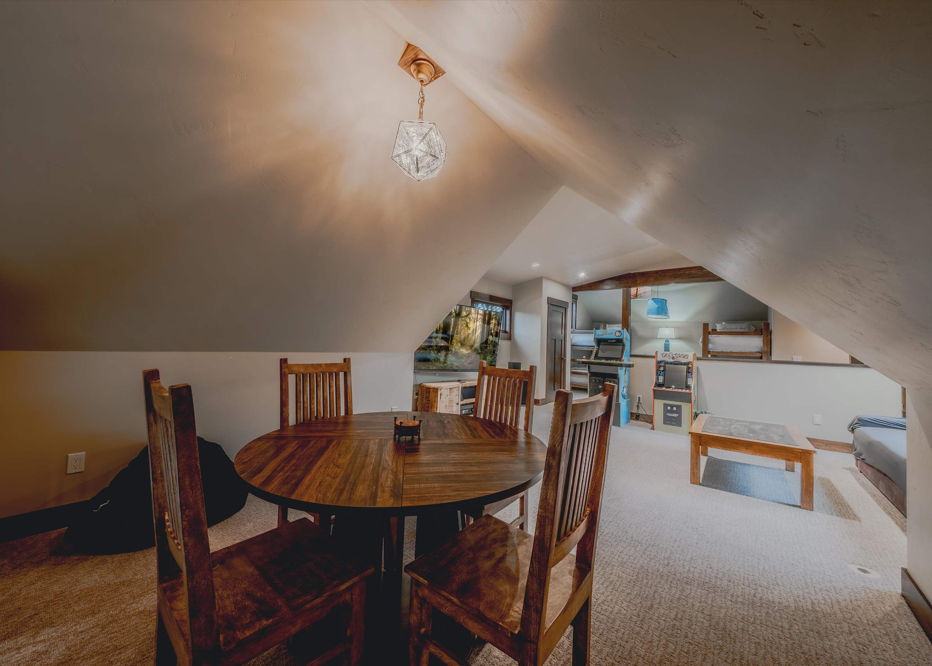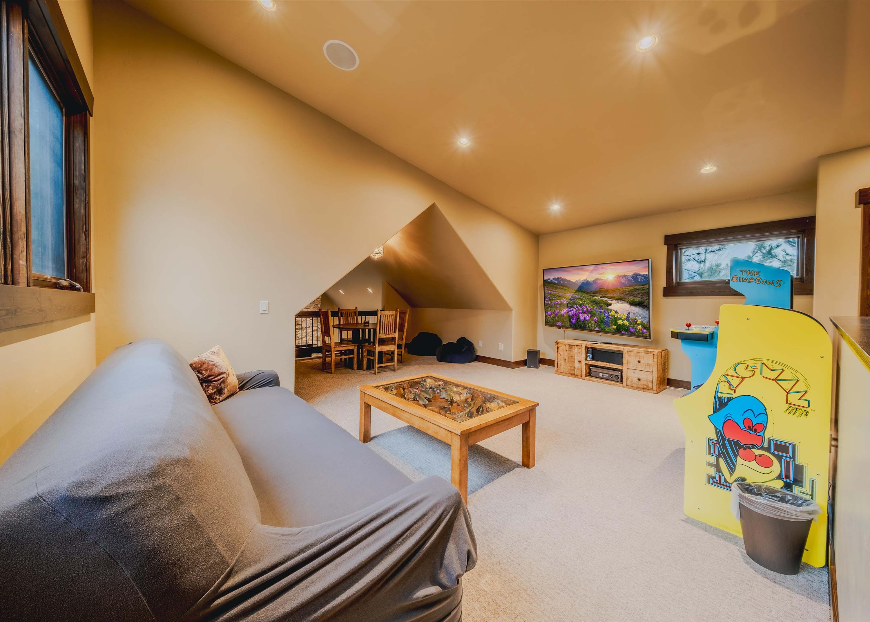 Downstairs, the basement game room offers a relaxed hangout space complete with a wet bar, smart TV, couch, and armchairs—ideal for evening drinks, watching the big game, or letting the kids claim their own entertainment zone. Upstairs in the loft, you’ll find even more fun with an arcade game, a game table for cards or board games, and another smart TV, giving everyone space to unwind their own way. Then, make your way outside where comfortable seating invites you to soak in the fresh mountain air. Fire up the grill for dinner, then ease into the hot tub under Montana’s wide-open sky.