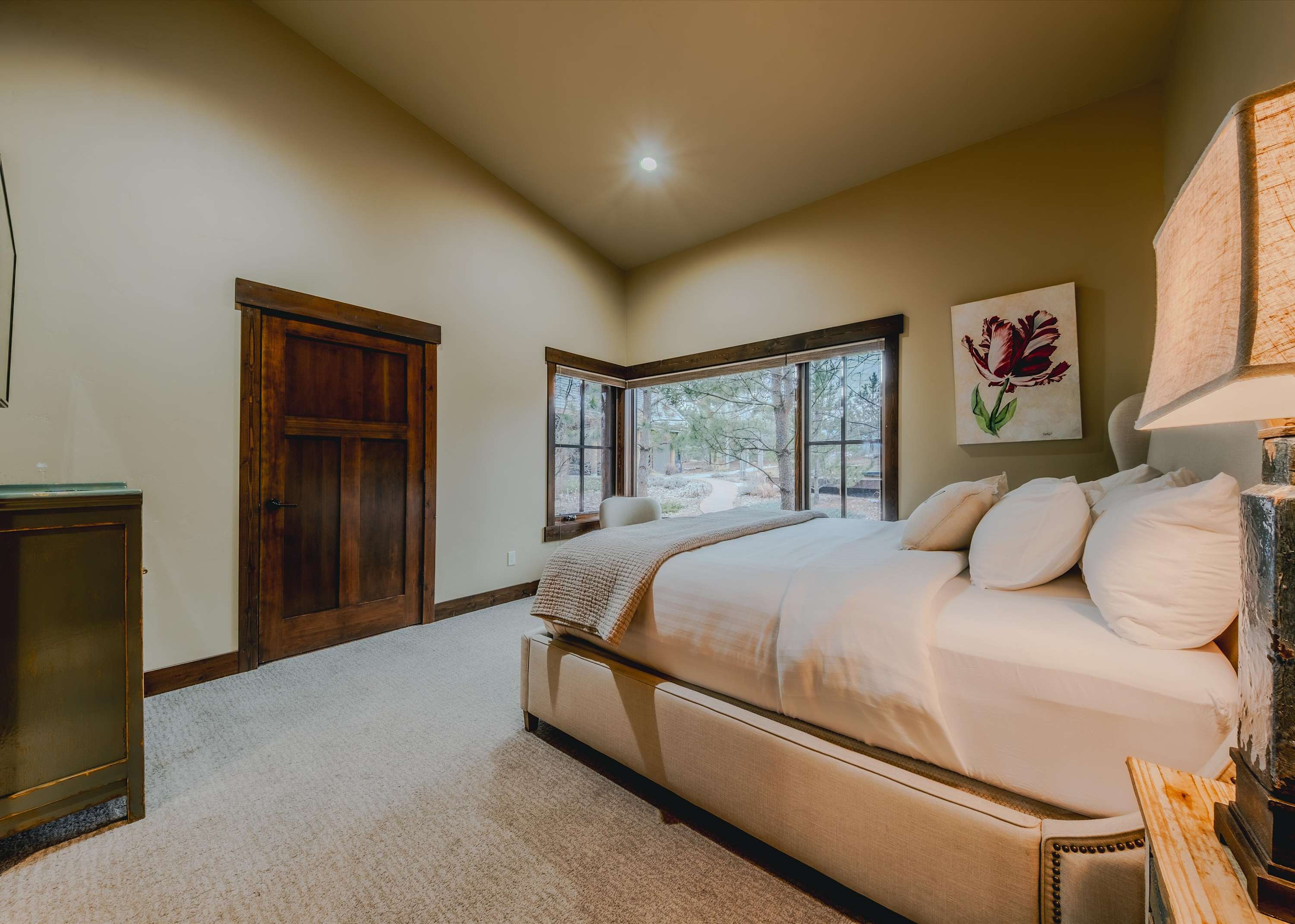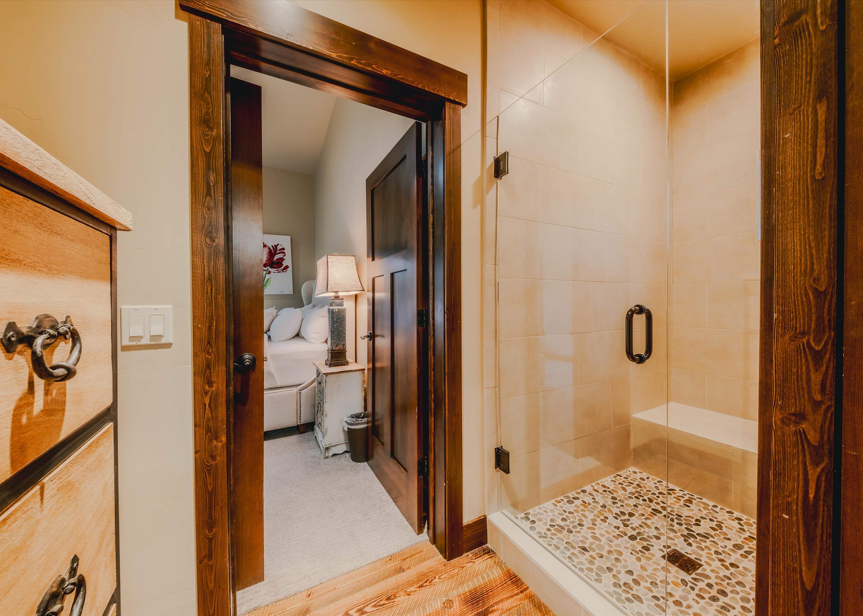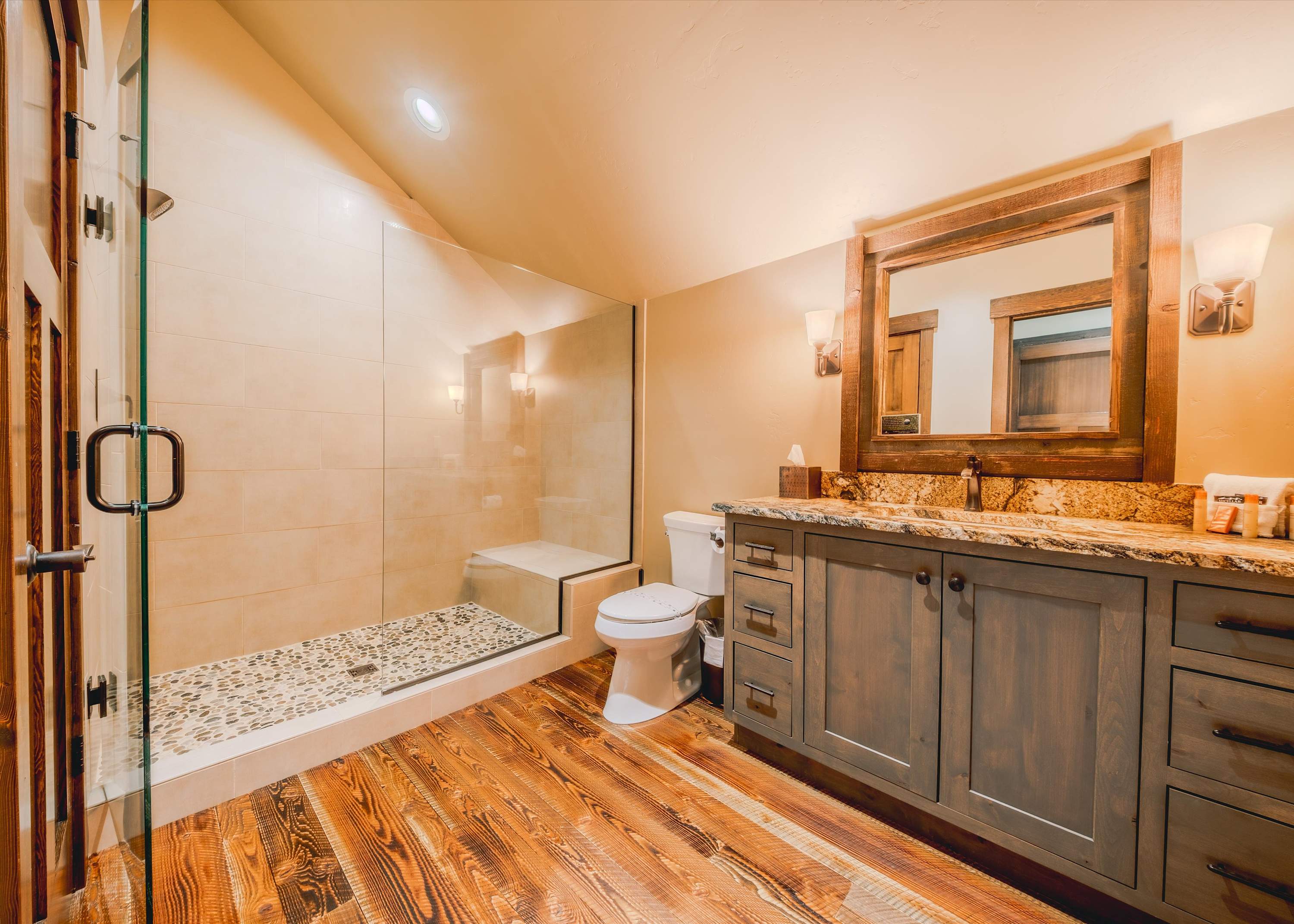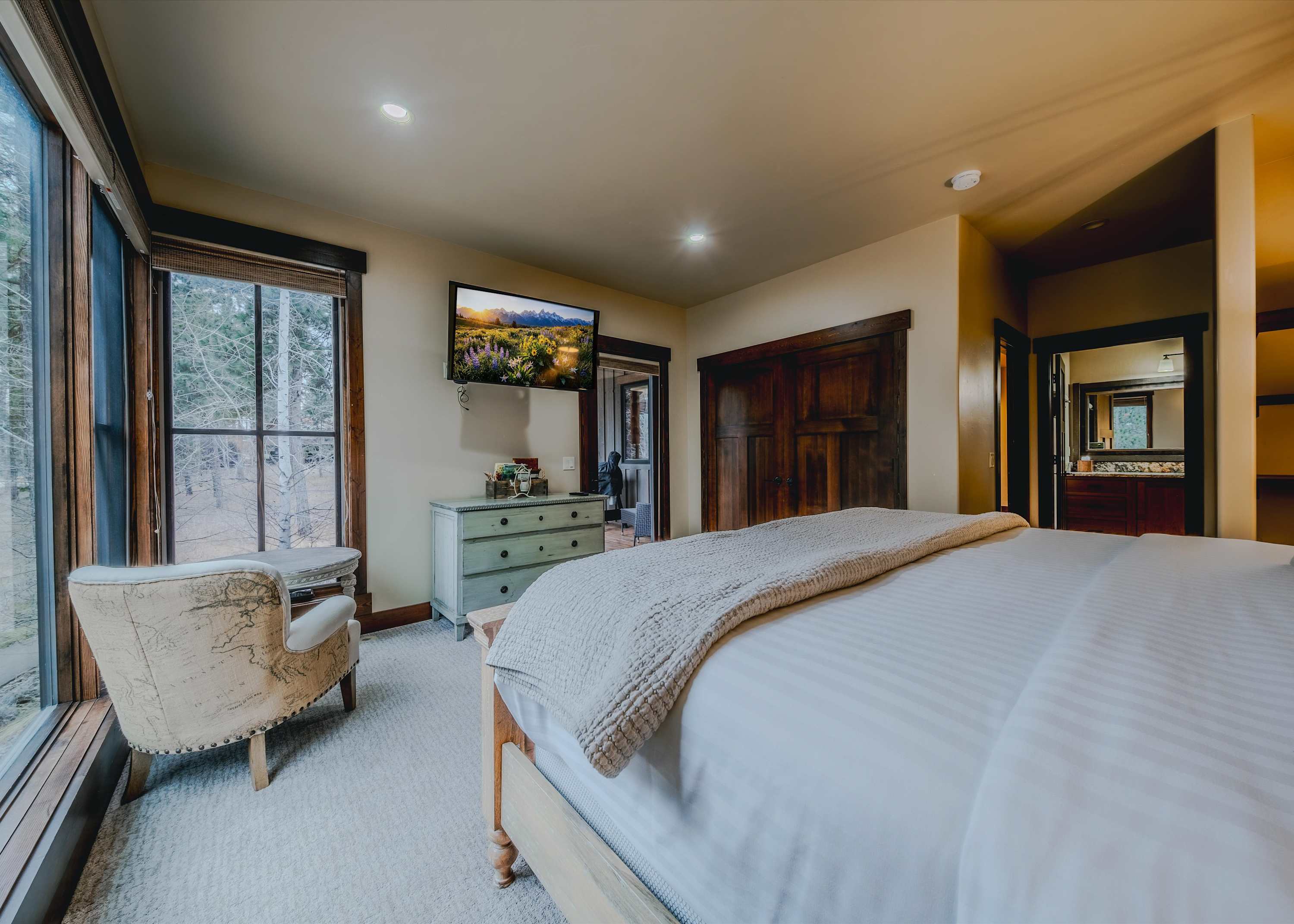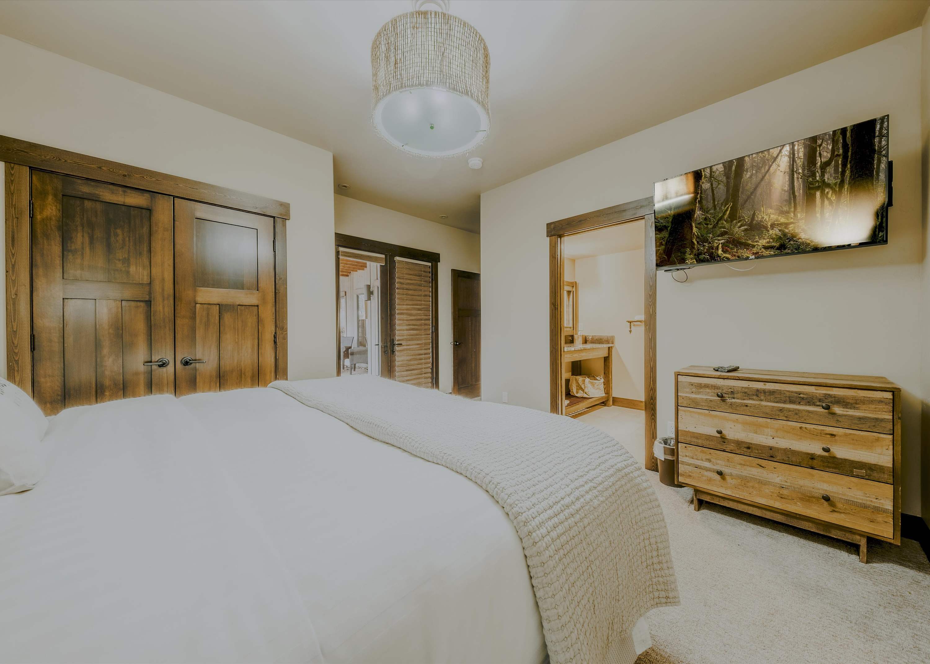 Bedroom #1 includes a king size bed, a smart TV, deck access, and an ensuite bathroom with a single vanity and a walk-in shower.