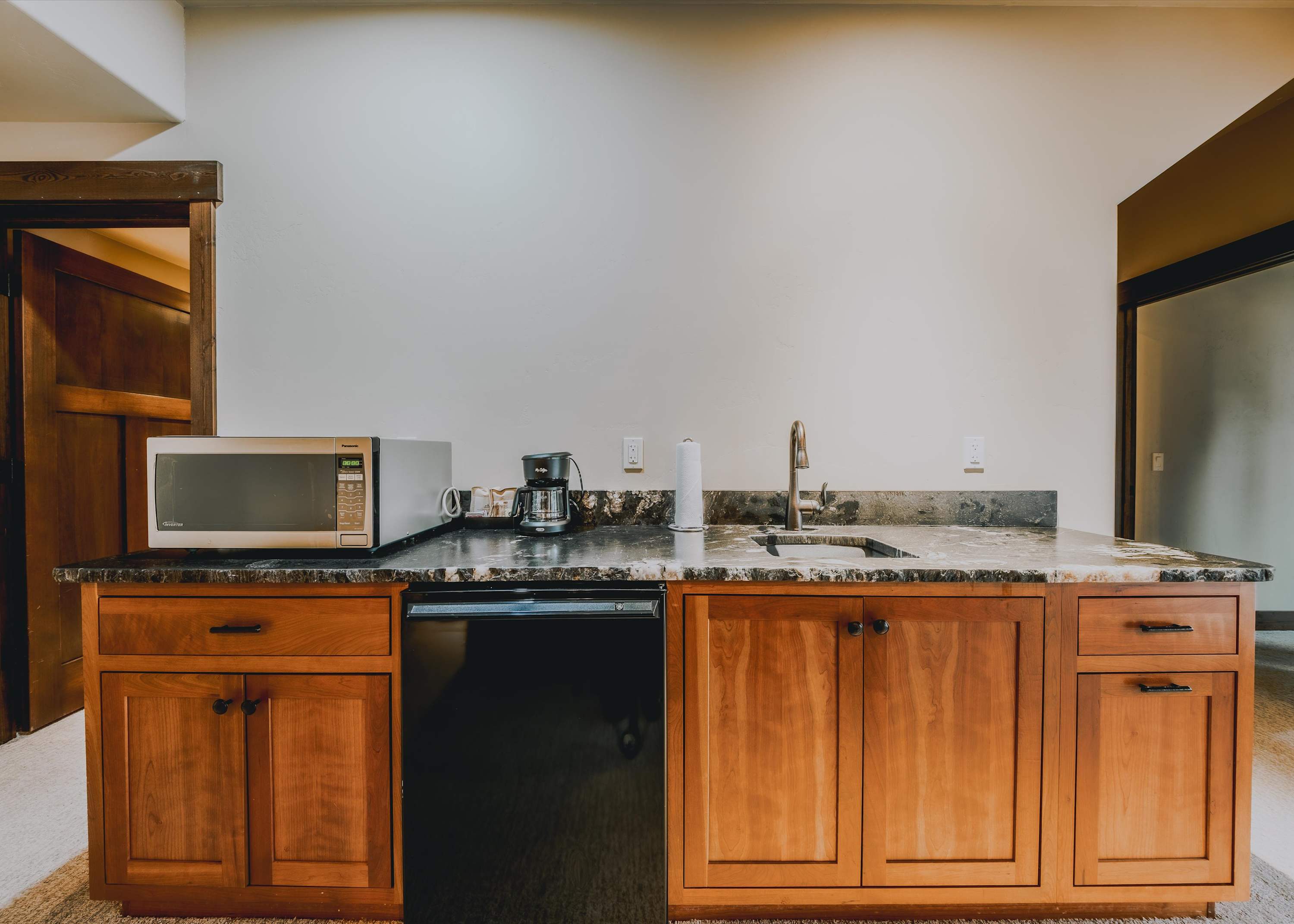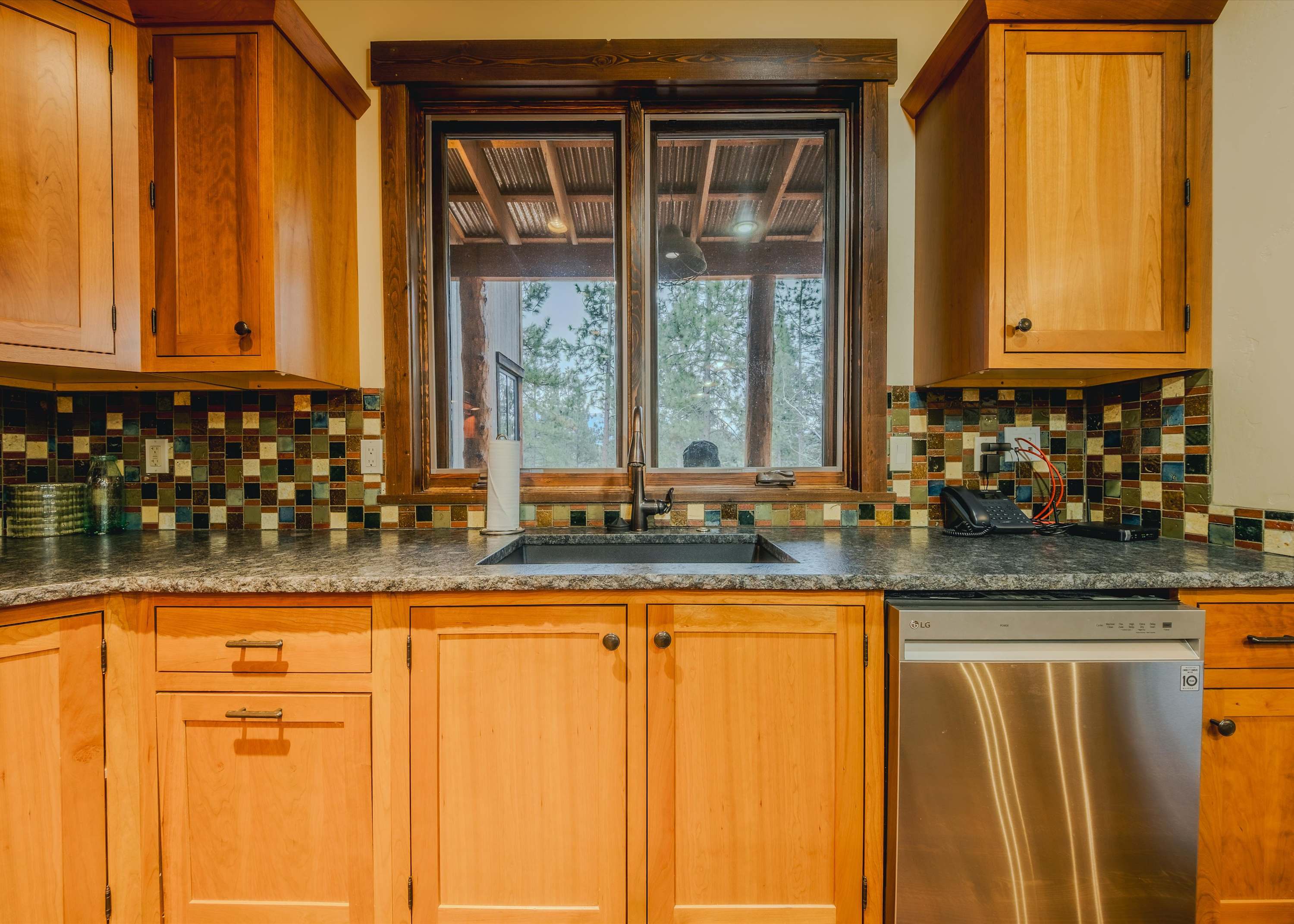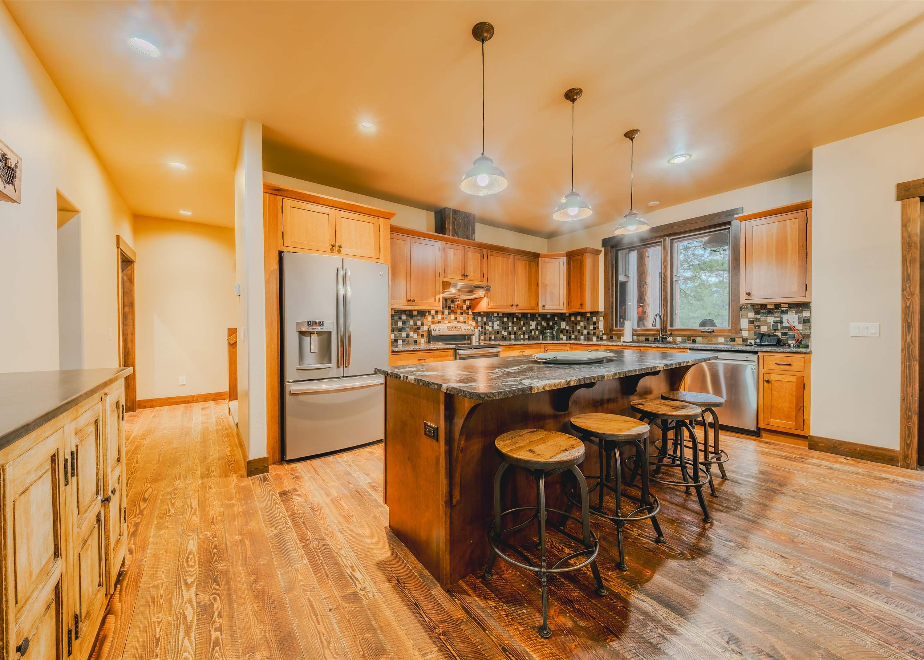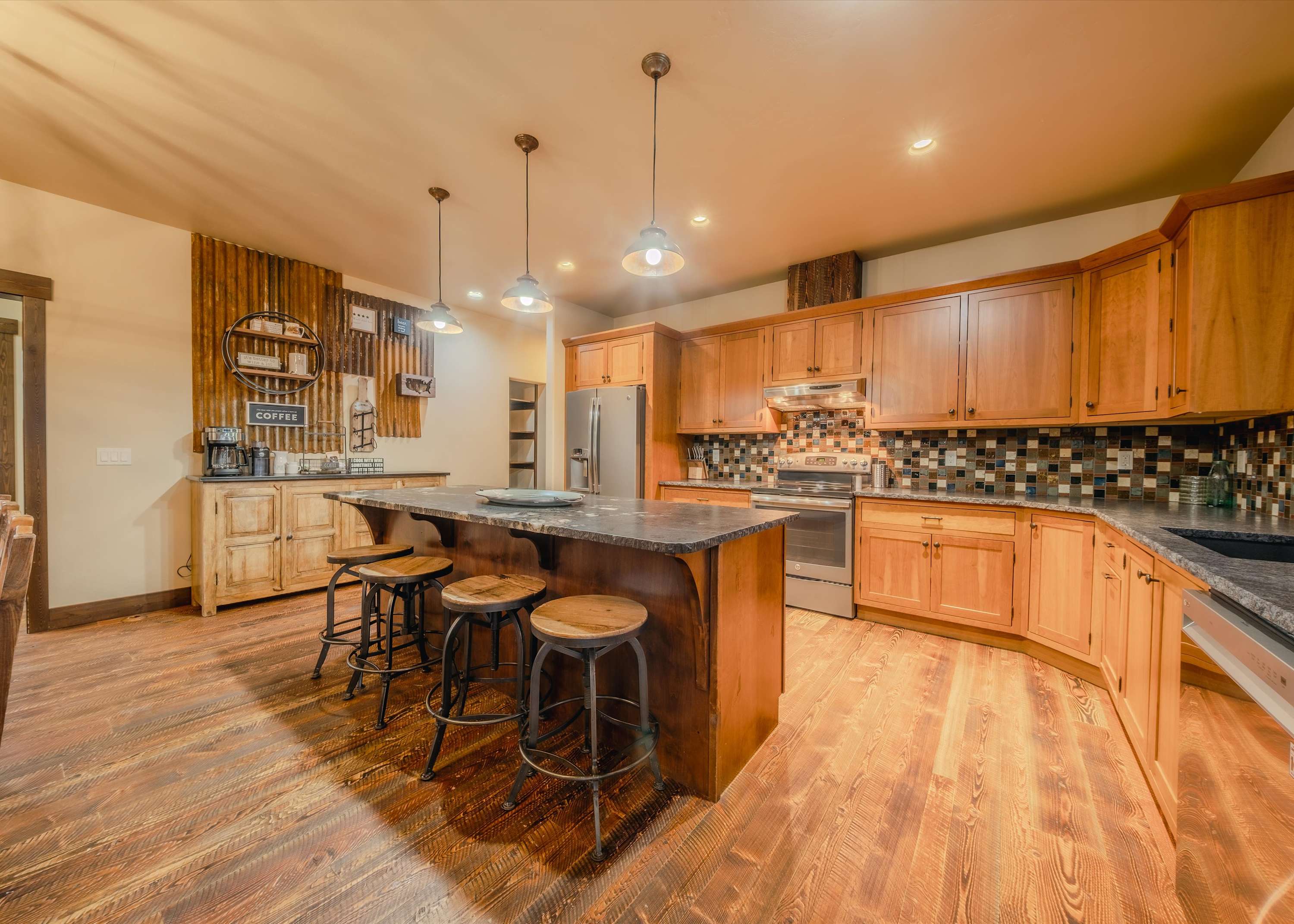 Step inside and you’re welcomed into a spacious open-concept kitchen, dining, and living area designed for gathering. The kitchen is both beautiful and functional, featuring granite countertops, stainless steel appliances, counter seating for four, and a dedicated coffee bar ready to fuel slow mornings or early adventures. Just beyond, the dining table for eight sits perfectly between the kitchen and living space, making it easy to share meals, stories, and laughter together. The living room feels bright and inviting, with tons of windows allowing natural light to pour in and frame the surrounding scenery. Plush couches and armchairs create cozy seating around a wood-burning fireplace, while a smart TV makes movie nights effortless after a day outdoors.