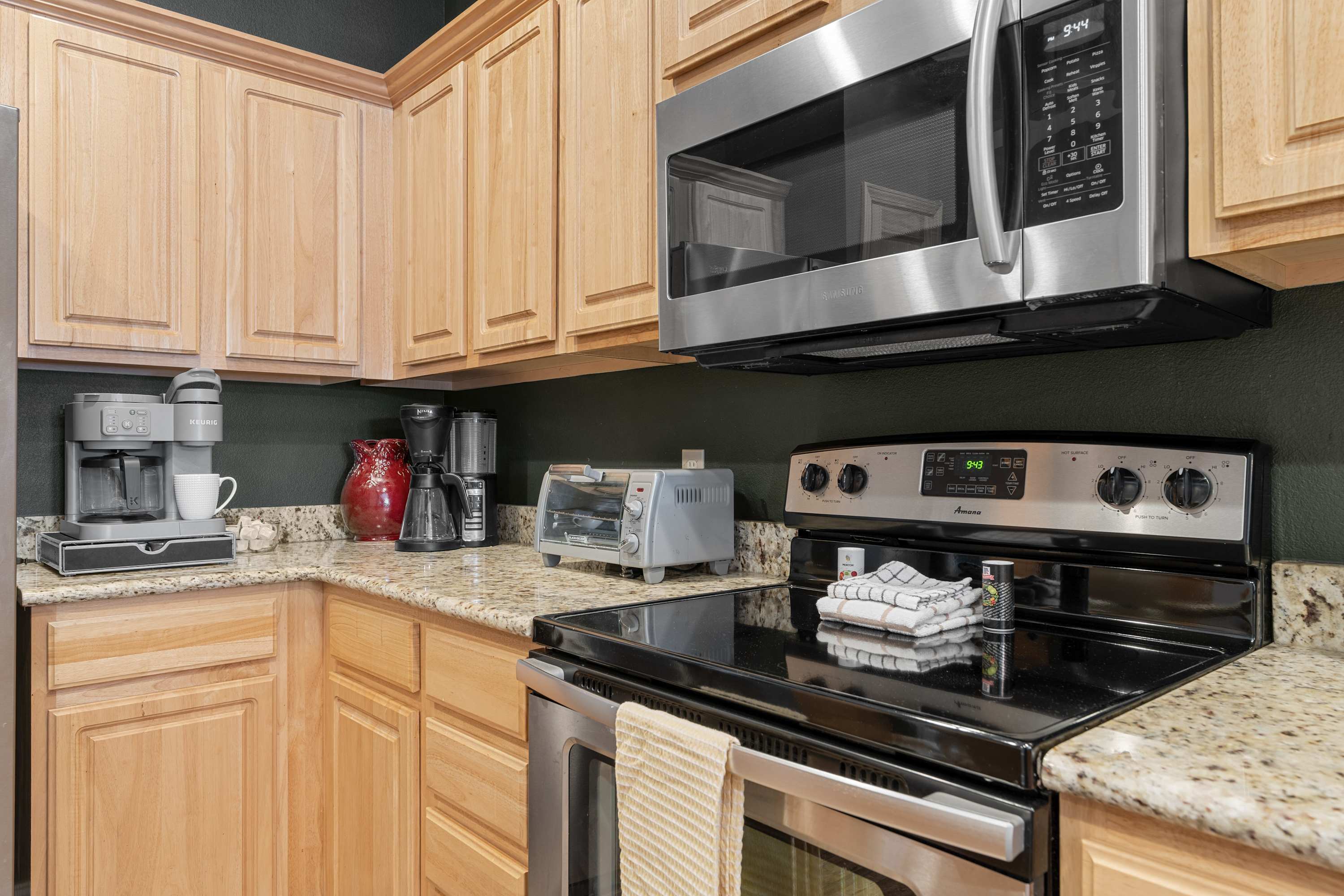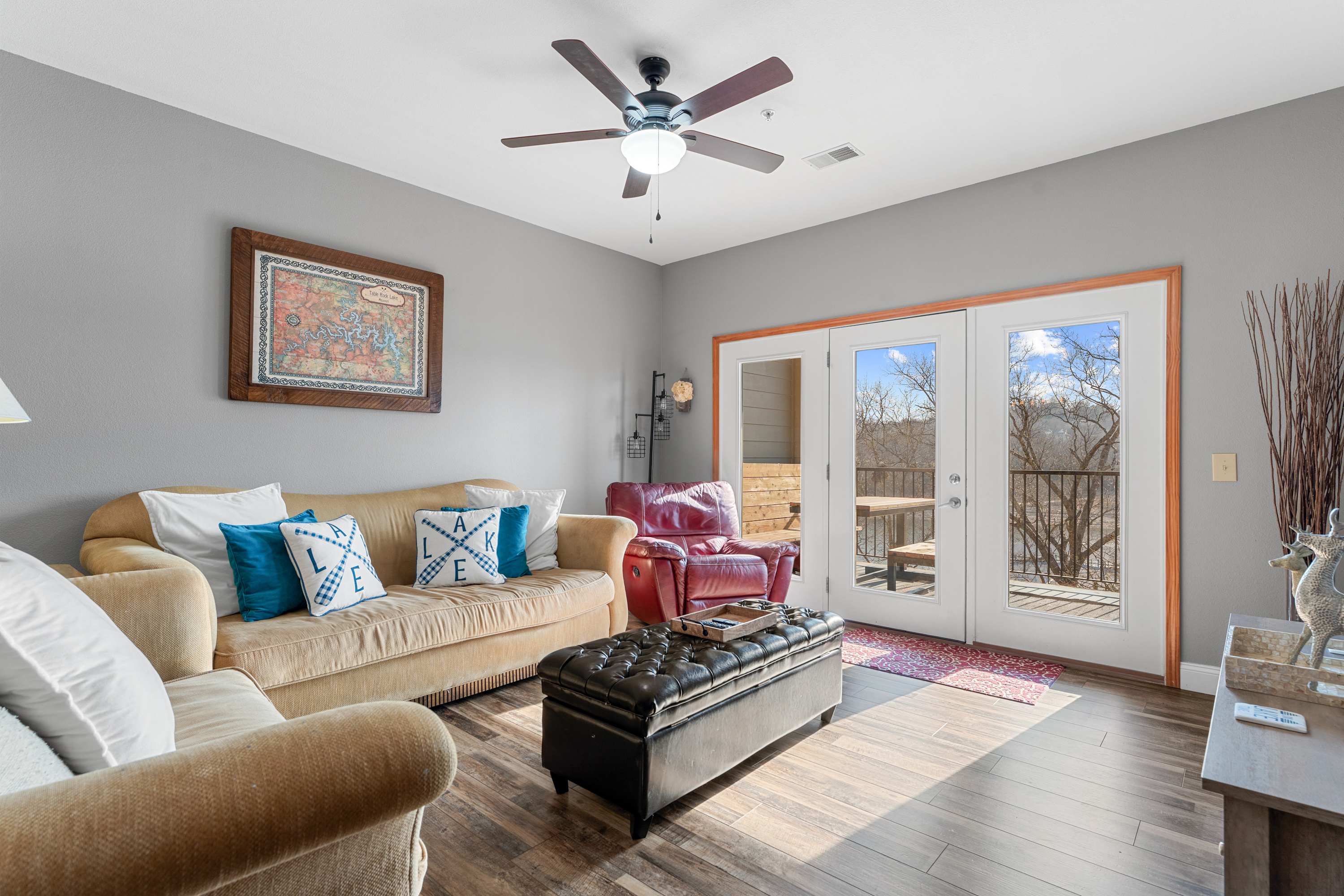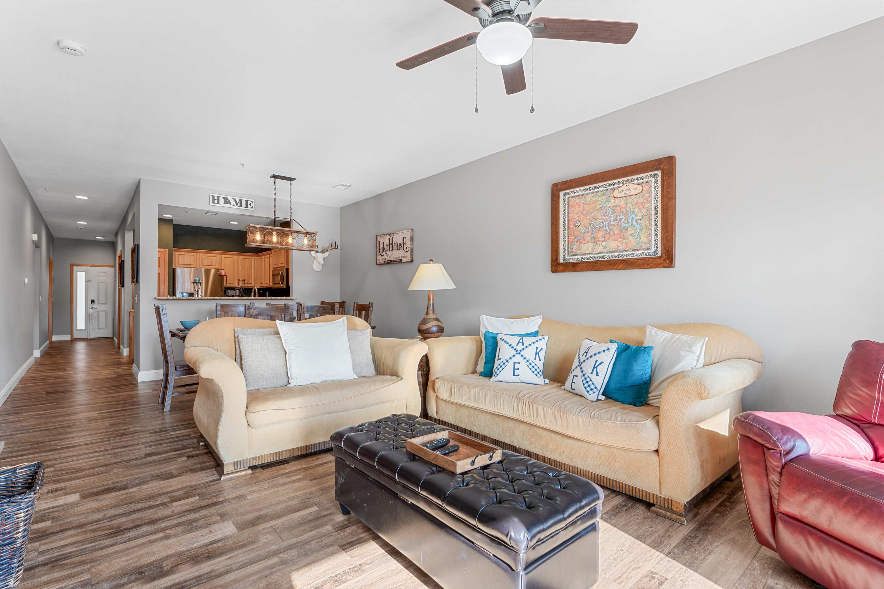 Step inside and you’re welcomed into a bright, inviting living space designed for comfort. The spacious kitchen features warm cabinetry, stainless steel appliances, and a convenient drip/Keurig combo coffee maker—perfect for slow mornings before heading out on the lake. Whether you’re prepping a hearty breakfast or a simple snack, you’ll appreciate the thoughtful layout and ample space. The living room offers a cozy place to unwind, complete with a smart TV, a comfortable couch, loveseat, and recliner—plenty of seating for everyone to relax. Natural light pours in through the large door that leads to the balcony, drawing your eyes toward the water beyond.