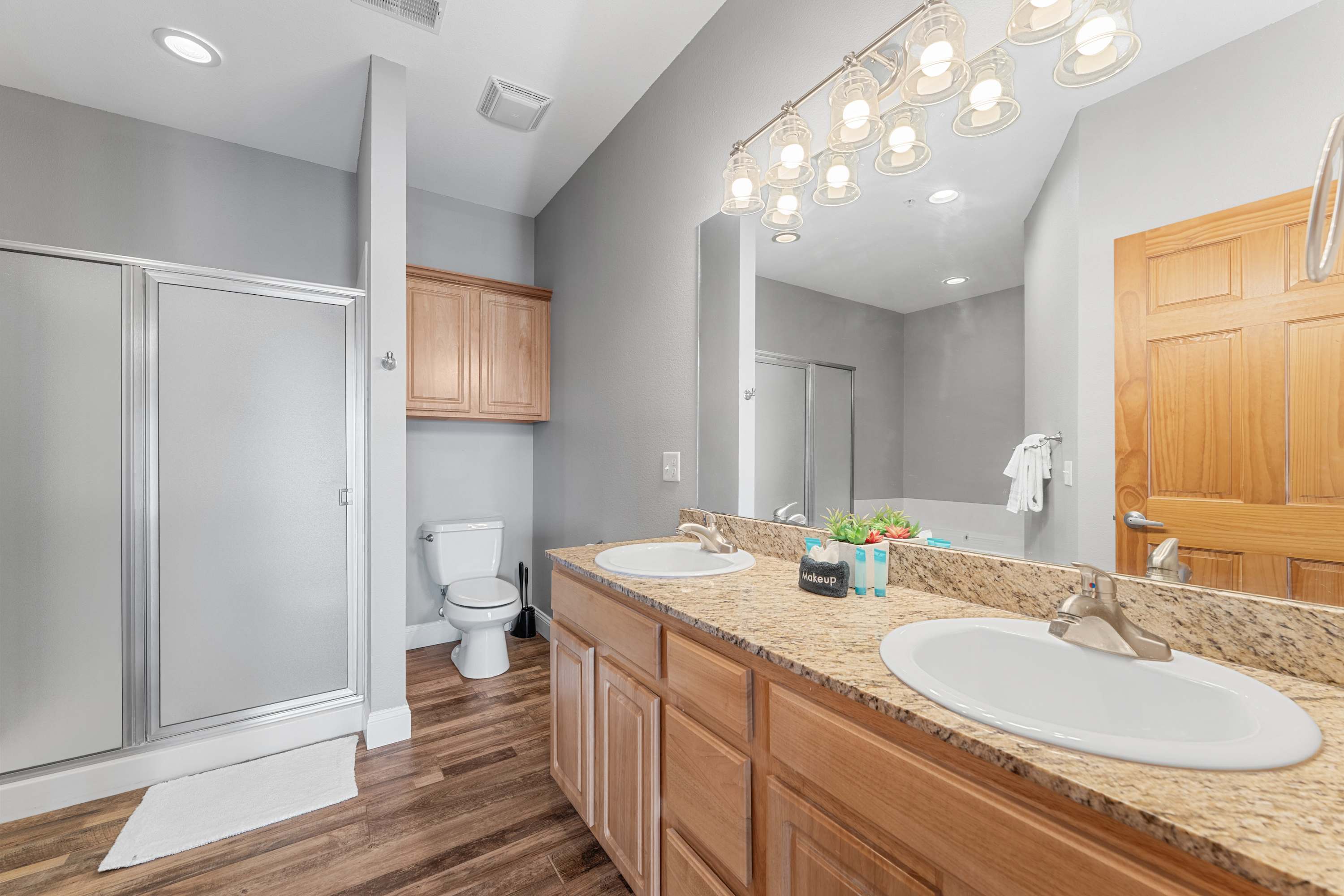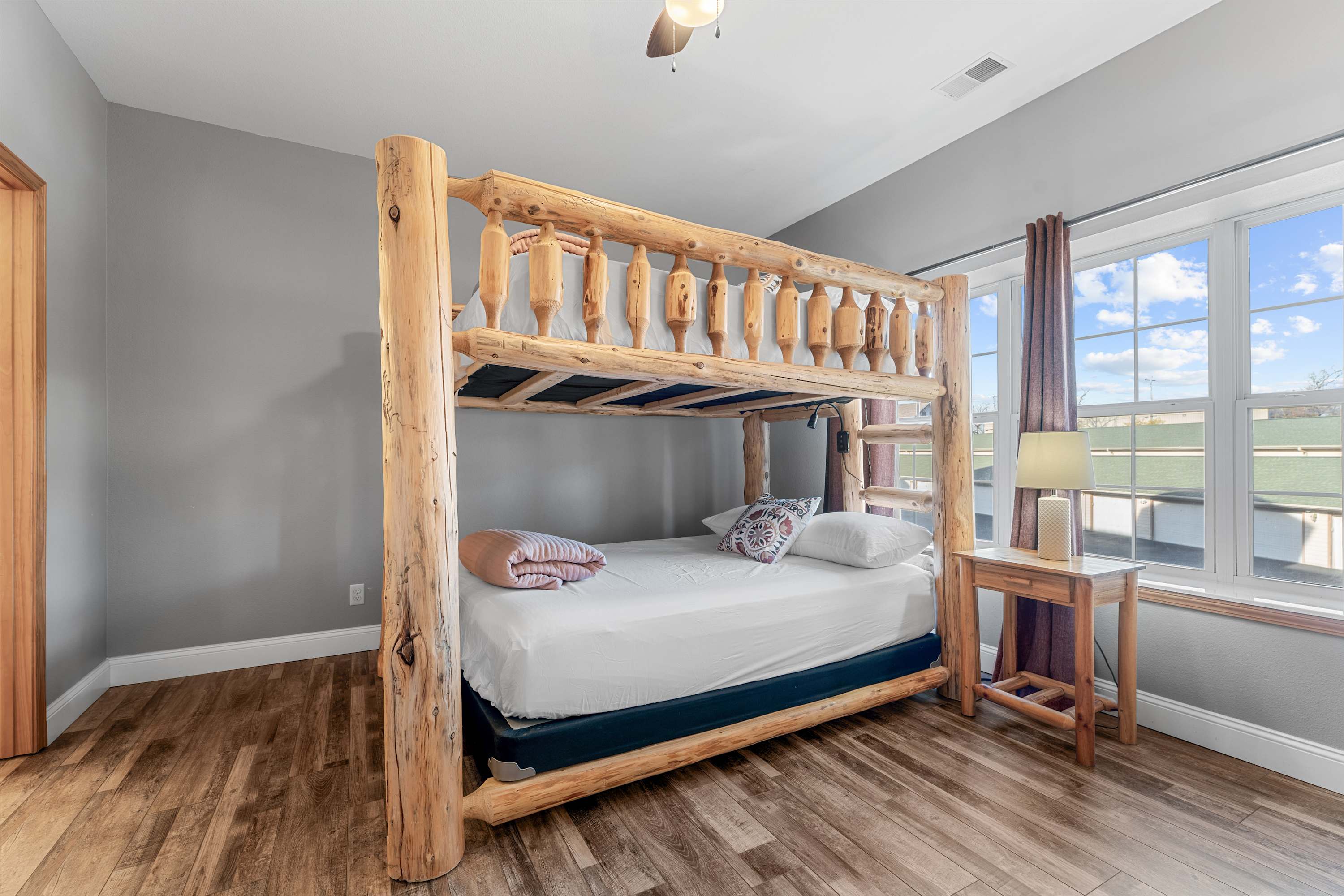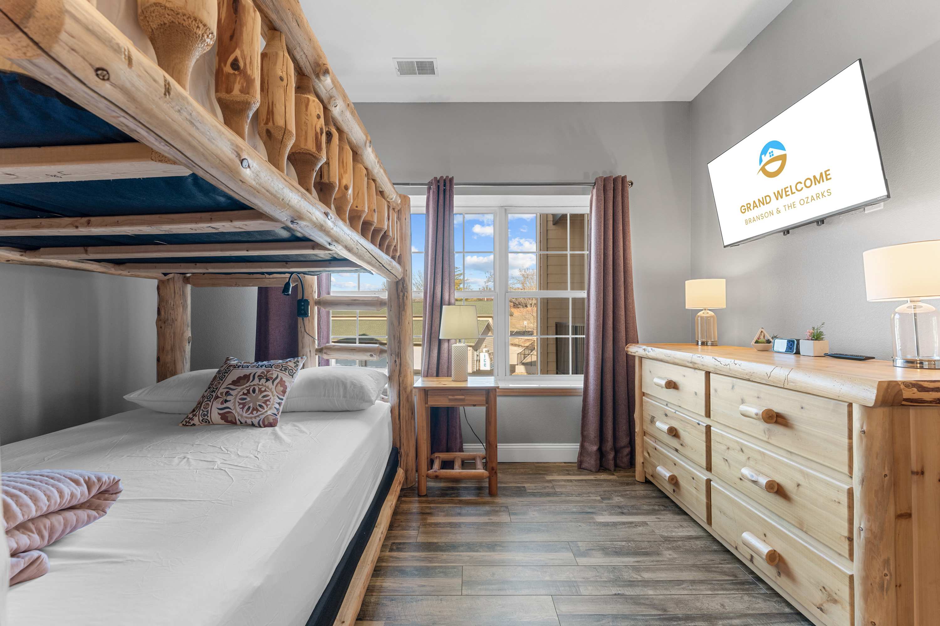 Bedroom #1 includes a set of queen-over-queen bunk beds, a smart TV, and an ensuite bathroom with a dual vanity and a shower/tub combo.