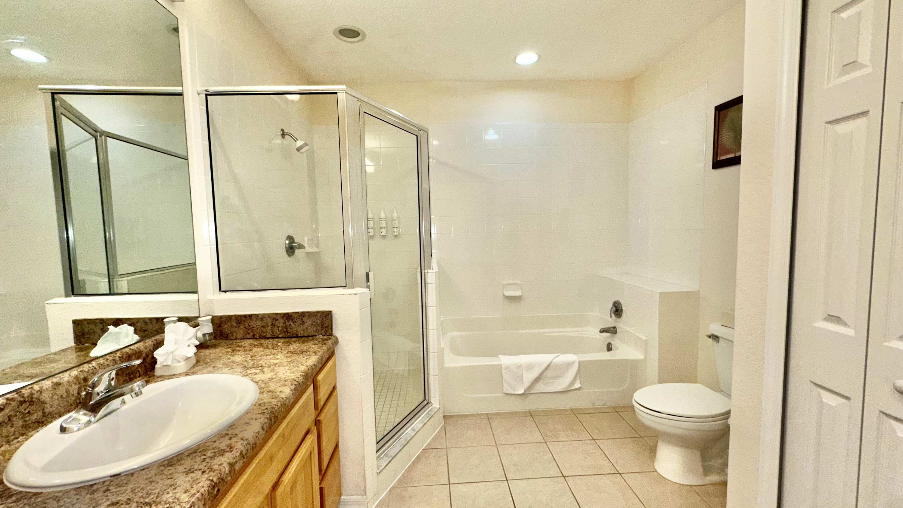 Bedroom #2 includes a queen size bed, access to a private screened-in balcony with a small table, and a Jack-and-Jill bathroom with a single vanity, a soaking tub, and a walk-in shower, also accessible via the hallway.