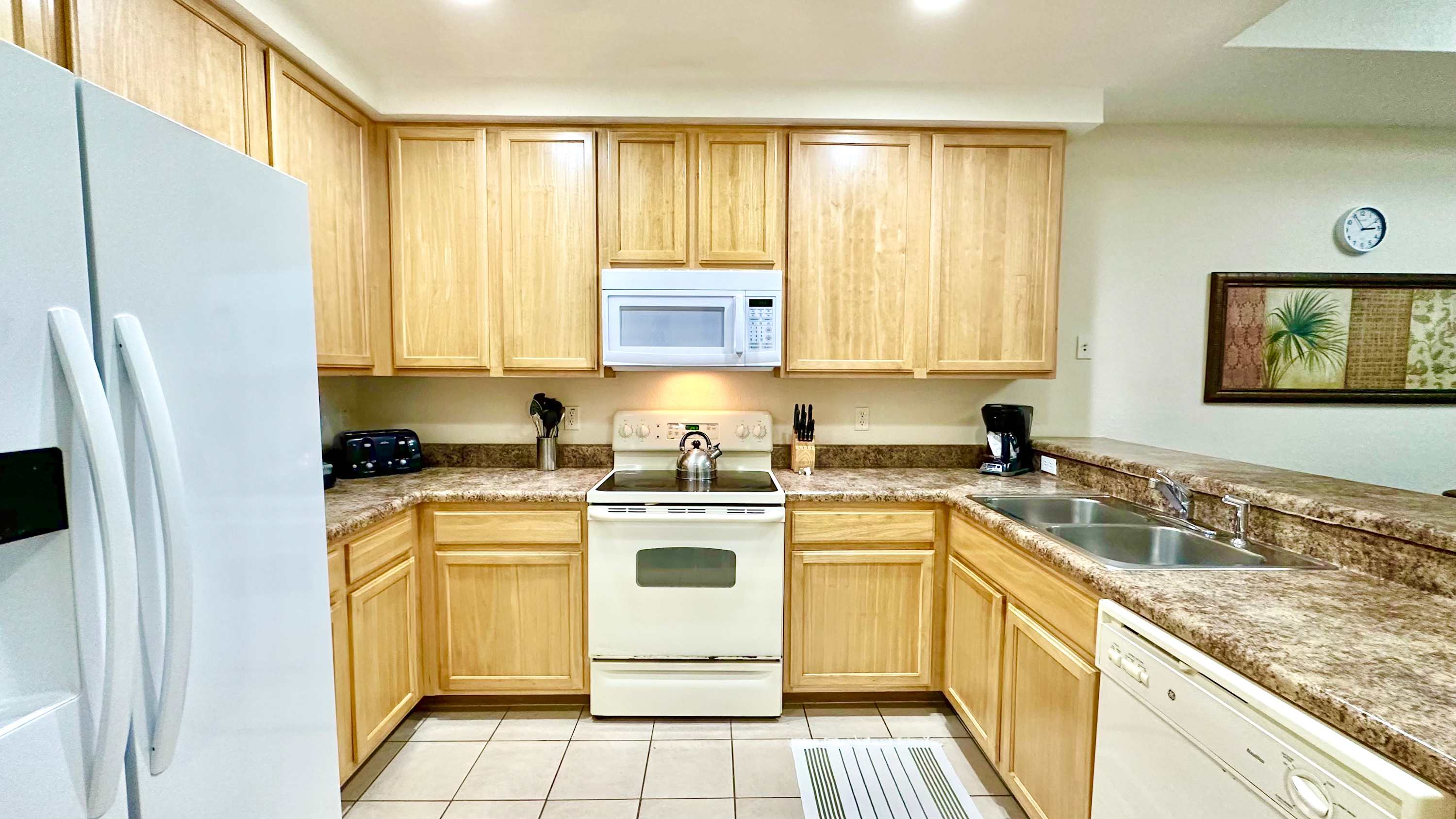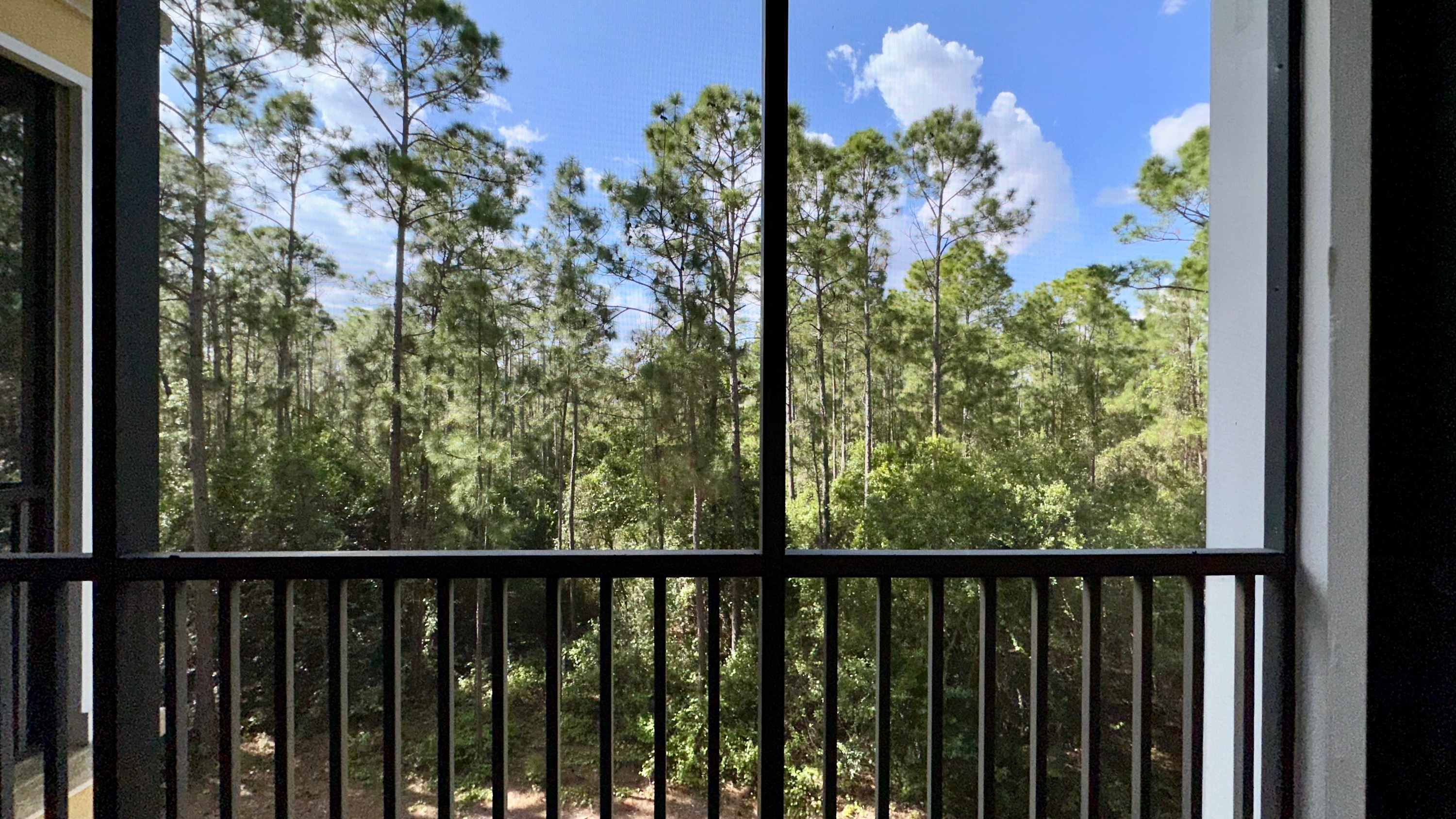Step inside and feel instantly at ease beneath vaulted-style ceilings and classic Florida tropical décor. The kitchen shines with light wood cabinetry, white appliances, drip coffee maker, and counter seating for two, while the dining table for six makes gathering for meals effortless. The open-concept living area invites you to unwind on the comfortable sofa or one of two accent chairs while catching up on your favorite shows on cable TV. Sliding glass doors draw your eye to the wooded views, leading out to a screened-in balcony—ideal for morning coffee or evening relaxation.
