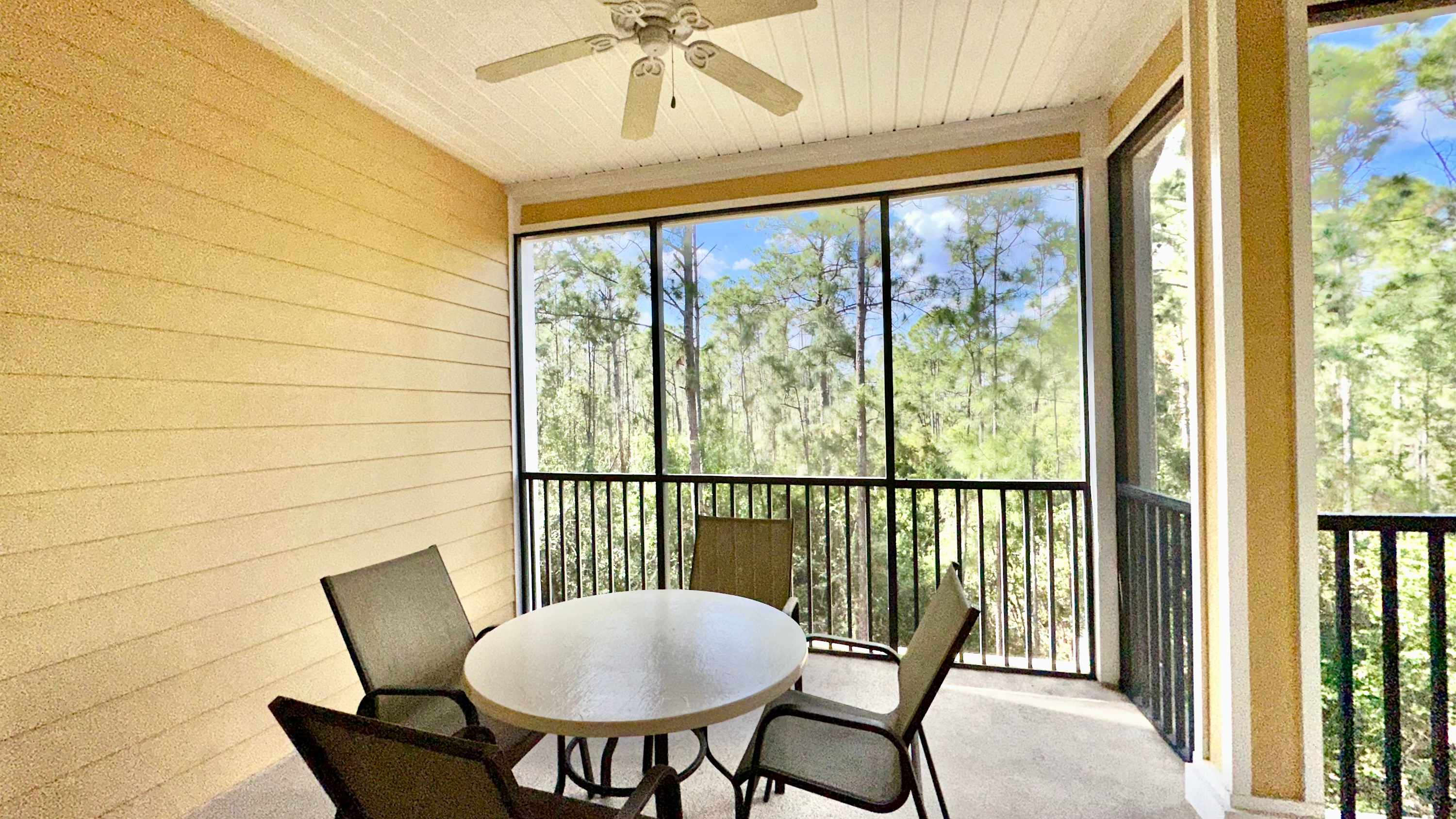 Bedroom #3 includes a king size bed, accent chair, access to an oversized screened-in balcony with sitting area table for four, and an ensuite bathroom with a dual vanity, a soaking tub, and a walk-in shower.