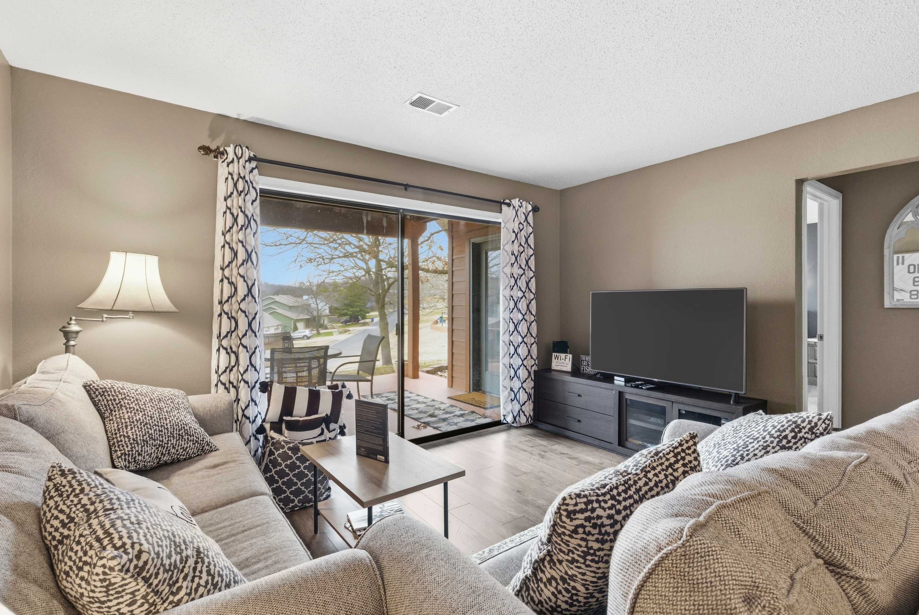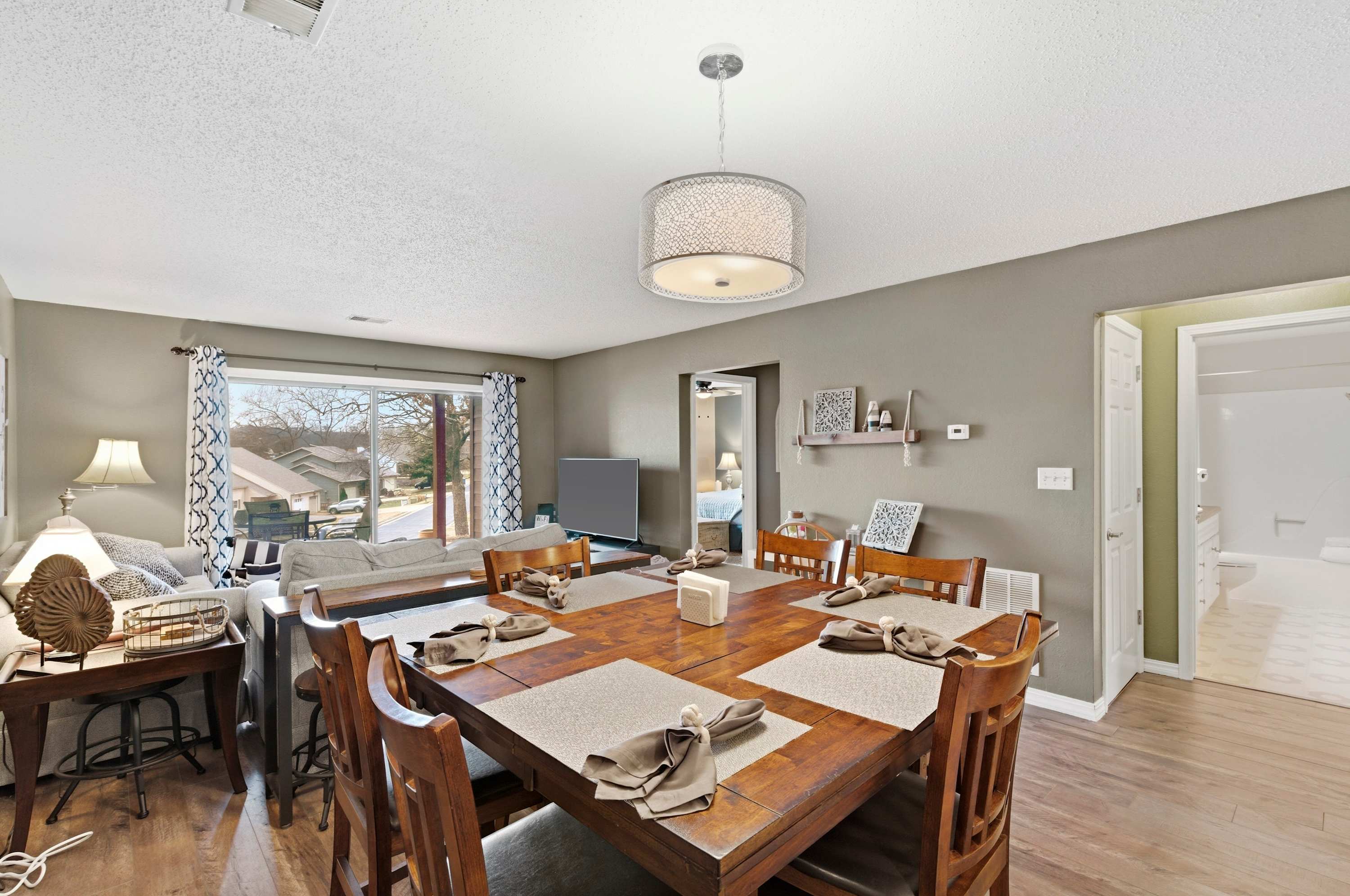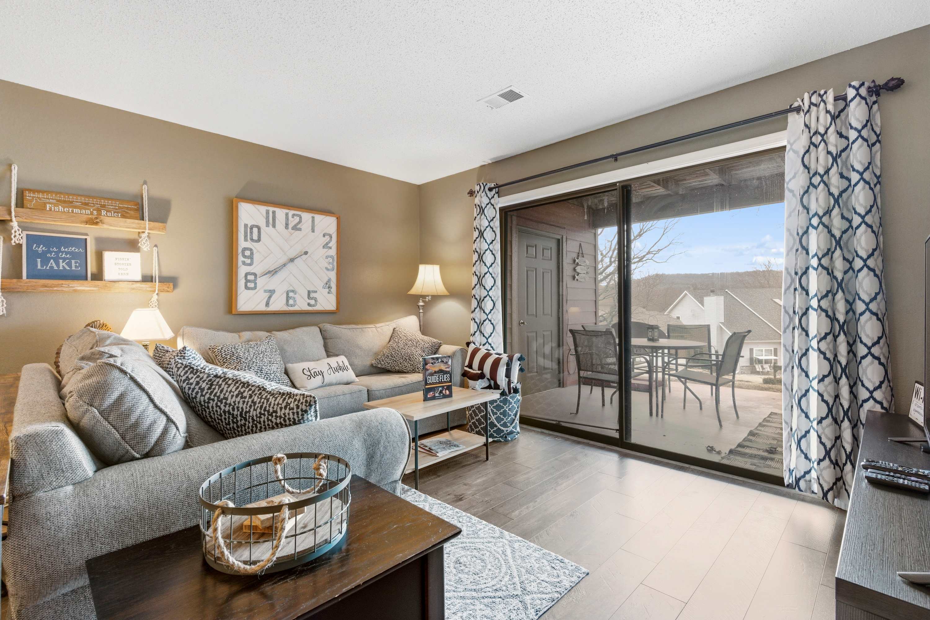 Step inside the condo and you’re welcomed by a bright, open kitchen, dining, and living space designed for easy gathering. The L-shaped peninsula kitchen features dark countertops and counter seating for three, flowing seamlessly to a dining table for six — ideal for everything from pancake breakfasts to game-night dinners. Beyond the dining area, the living room invites you to unwind with a comfortable couch, loveseat, and cable TV for cozy evenings in. Sliding glass doors draw in natural light and lead to your private patio, where a table awaits for al fresco meals or morning coffee in the fresh Ozark air. Twin Lakes Getaway combines comfort, convenience, and resort perks to create the perfect Branson retreat.