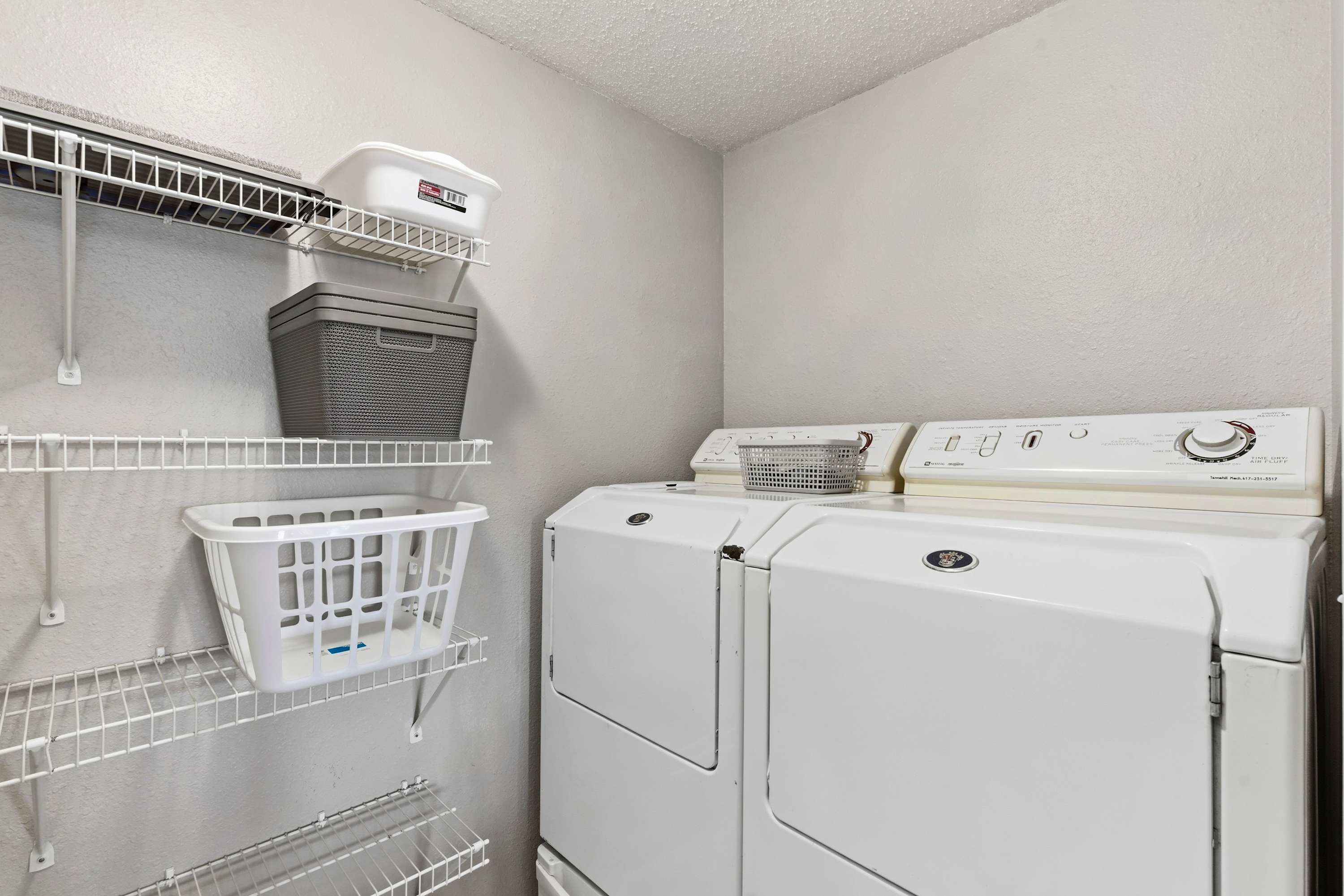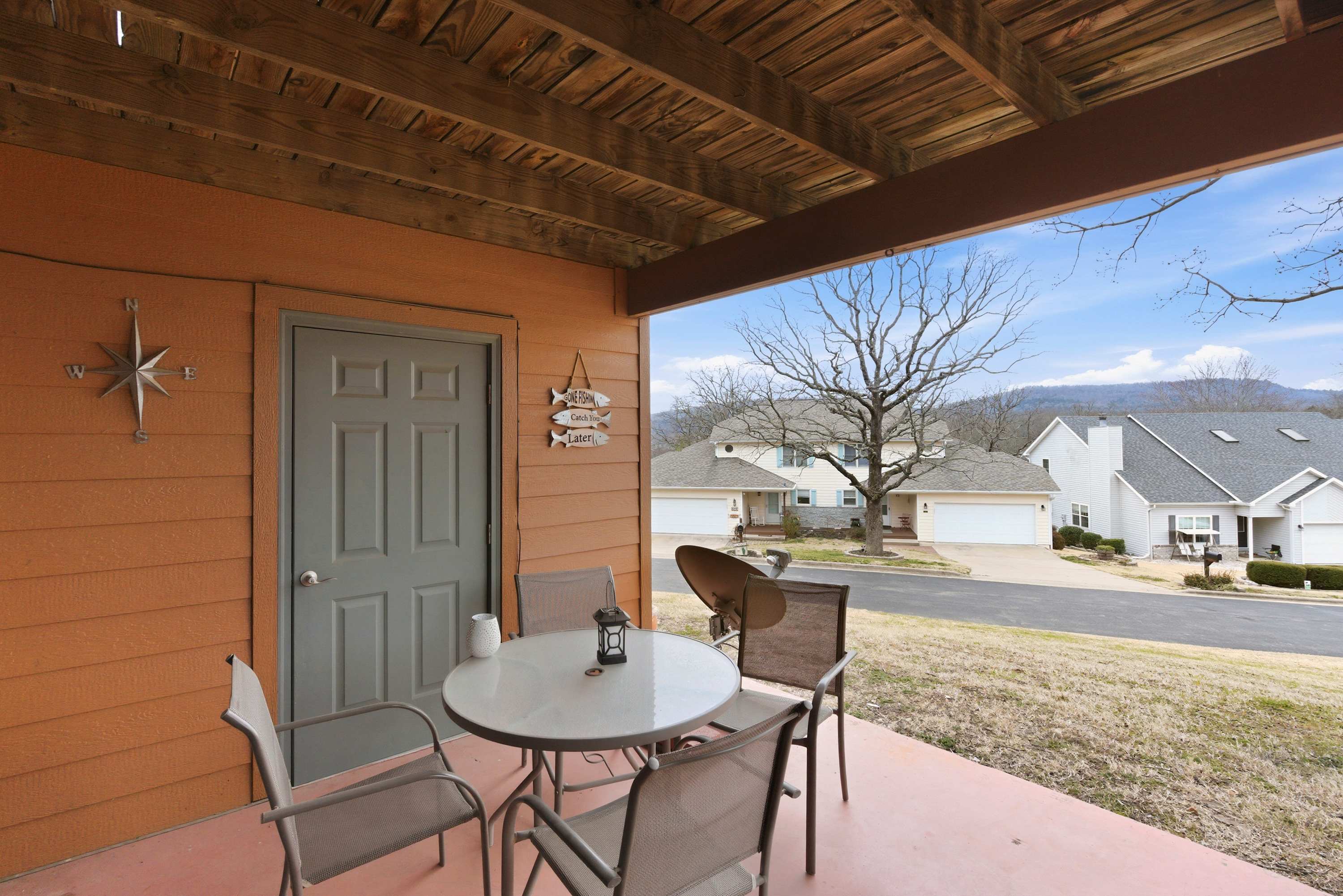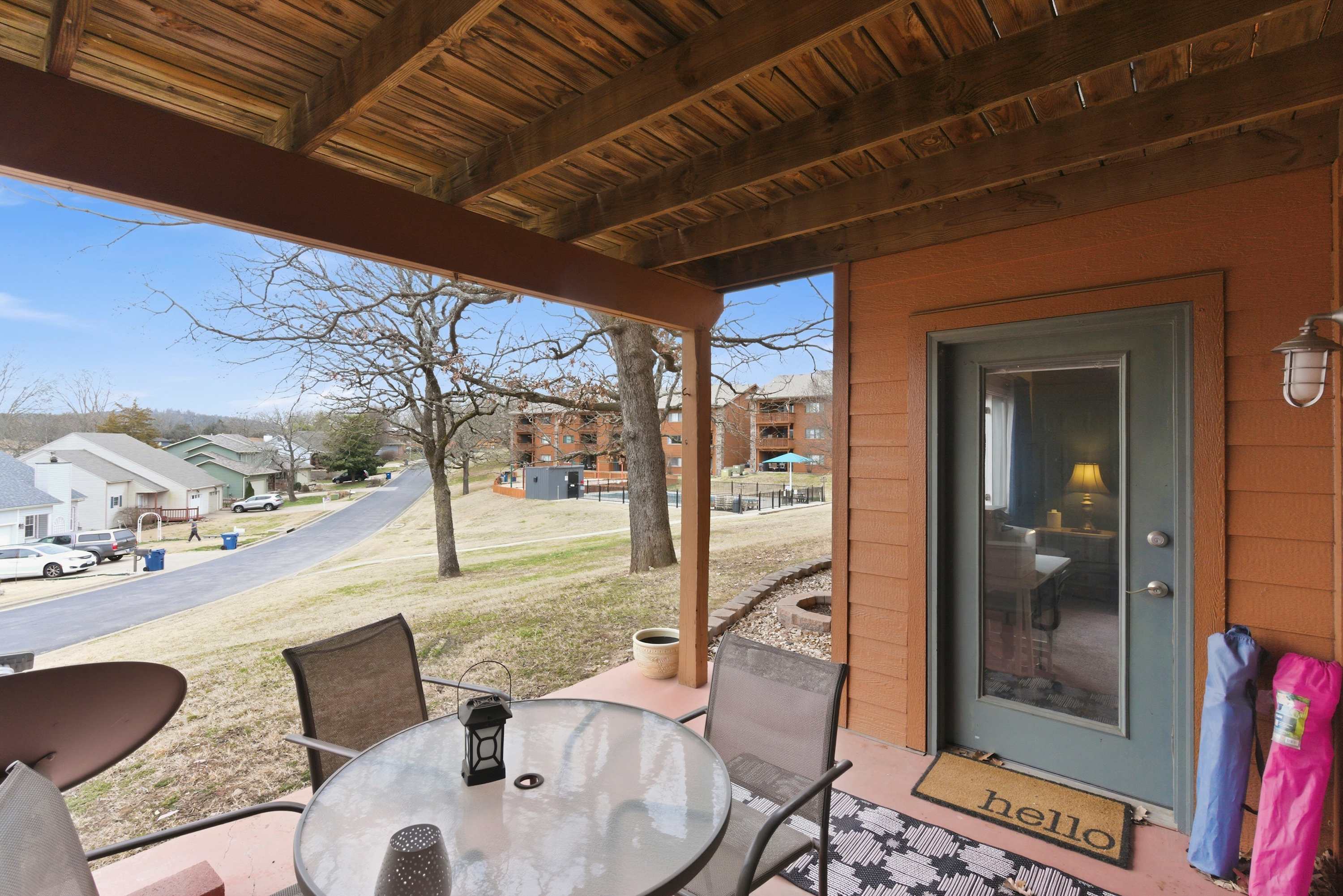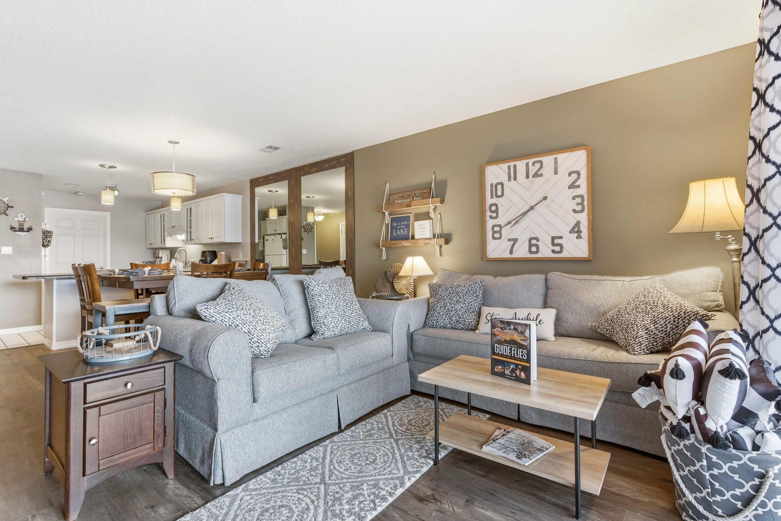 Step inside the condo and you’re welcomed by a bright, open kitchen, dining, and living space designed for easy gathering. The L-shaped peninsula kitchen features dark countertops and counter seating for three, flowing seamlessly to a dining table for six — ideal for everything from pancake breakfasts to game-night dinners. Beyond the dining area, the living room invites you to unwind with a comfortable couch, loveseat, and cable TV for cozy evenings in. Sliding glass doors draw in natural light and lead to your private patio, where a table awaits for al fresco meals or morning coffee in the fresh Ozark air. Twin Lakes Getaway combines comfort, convenience, and resort perks to create the perfect Branson retreat.