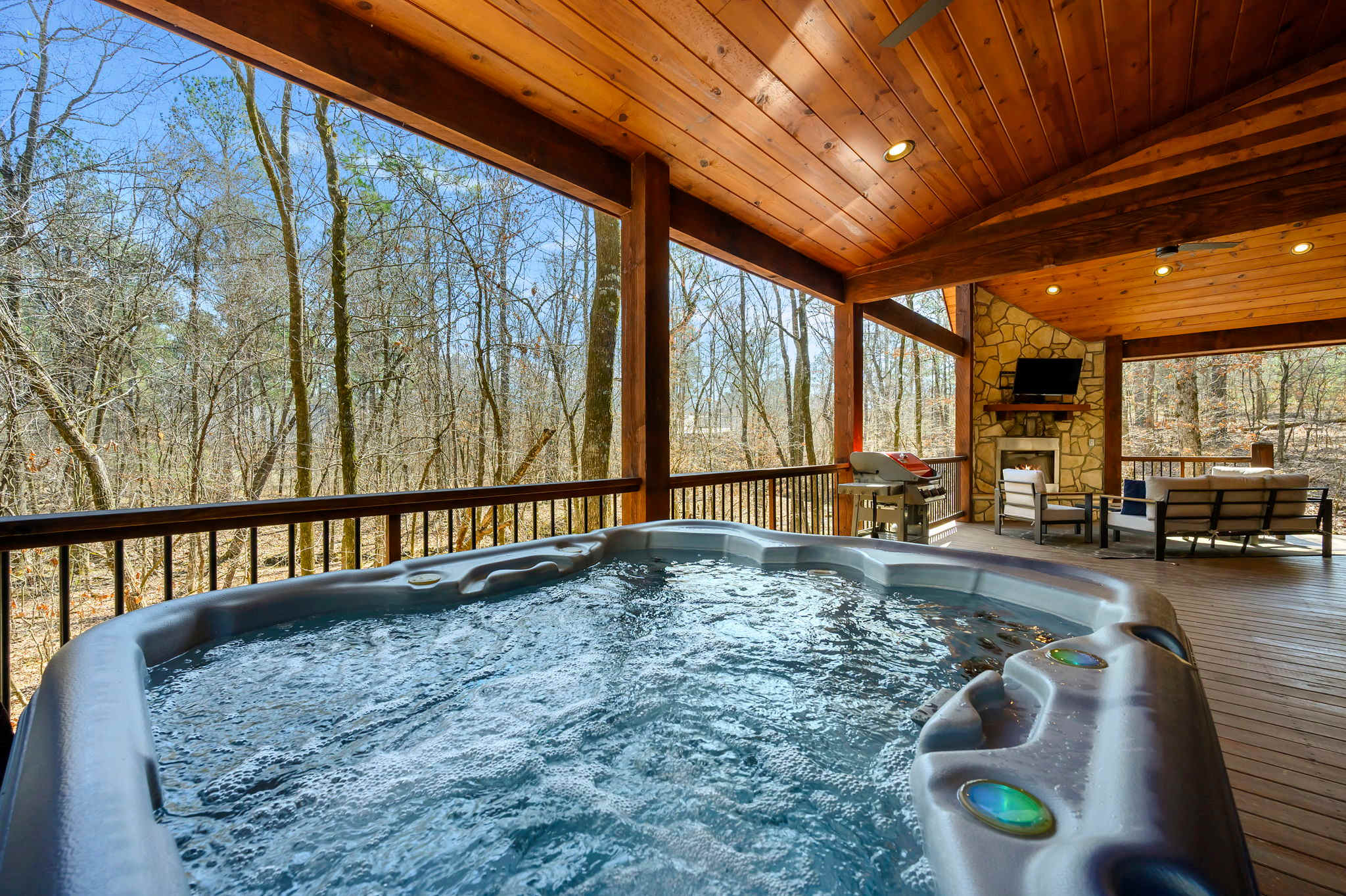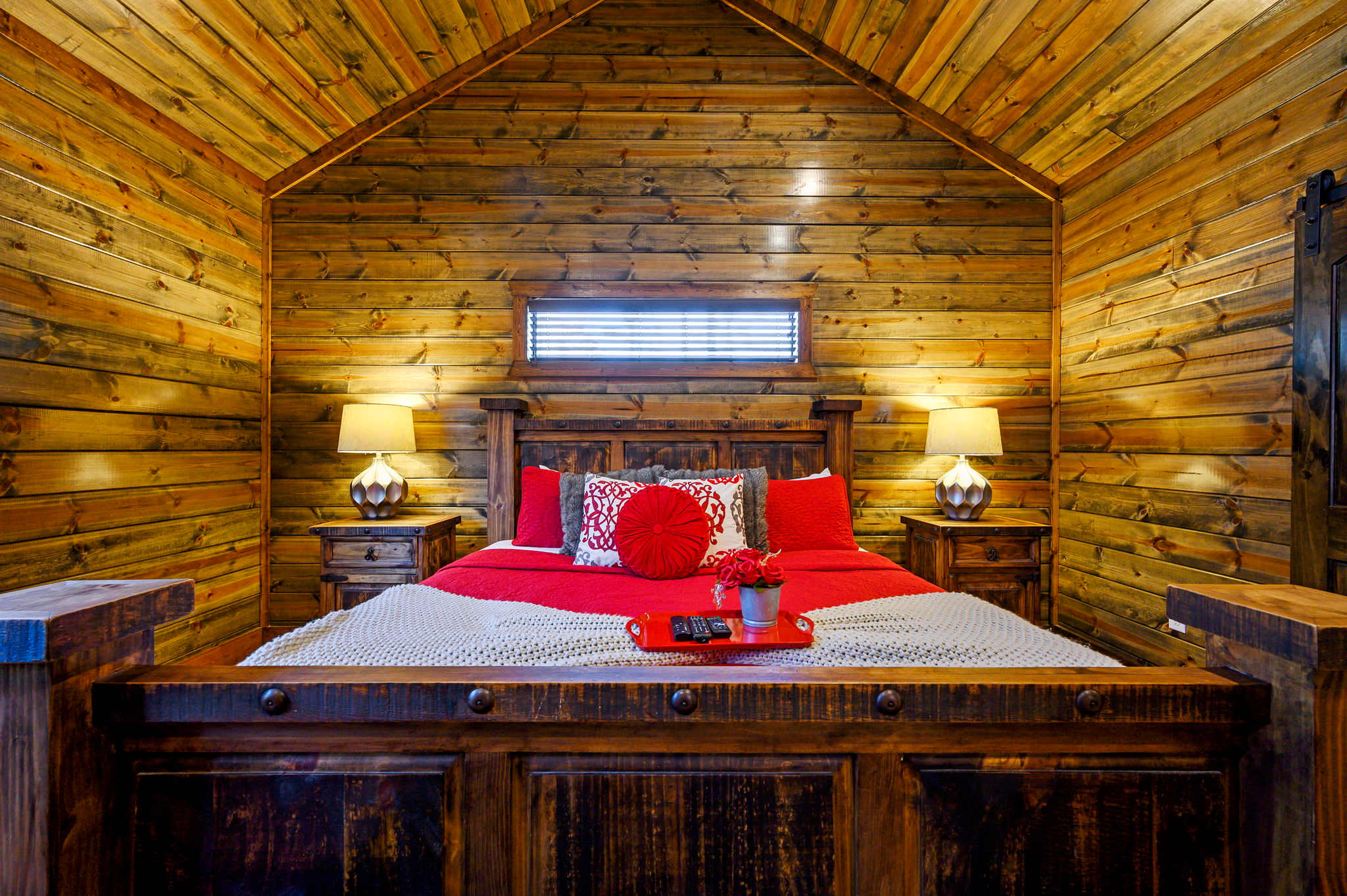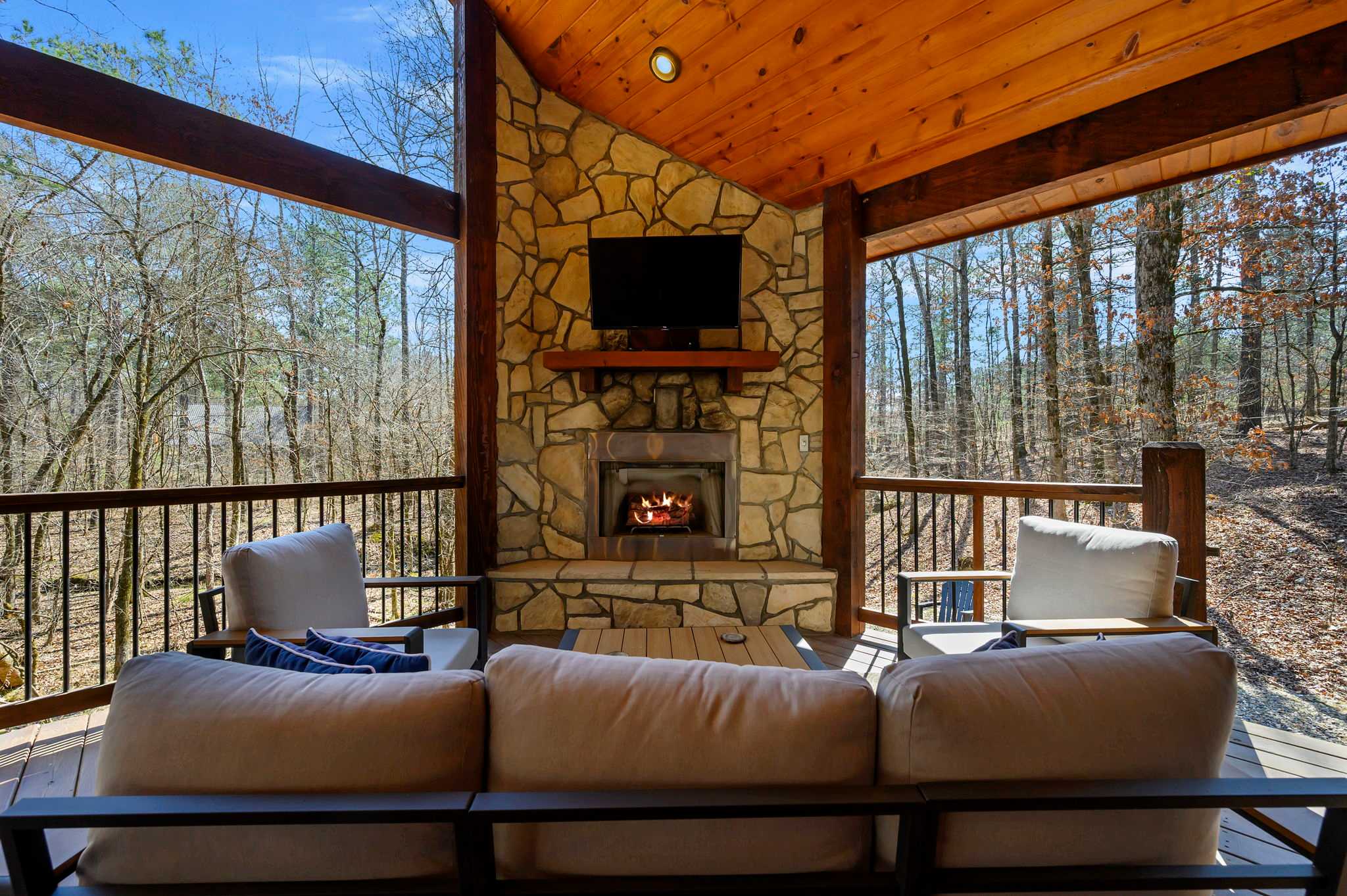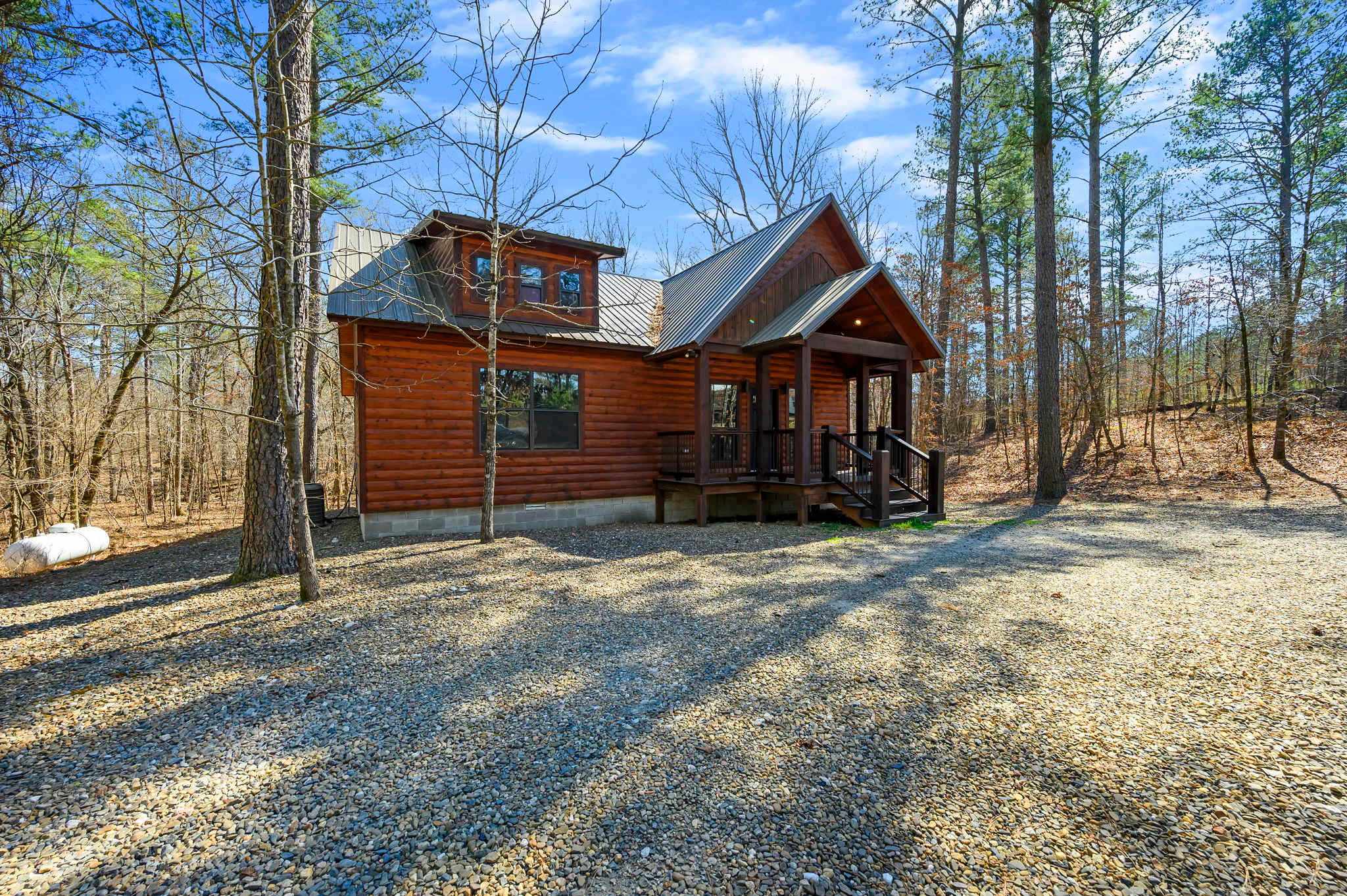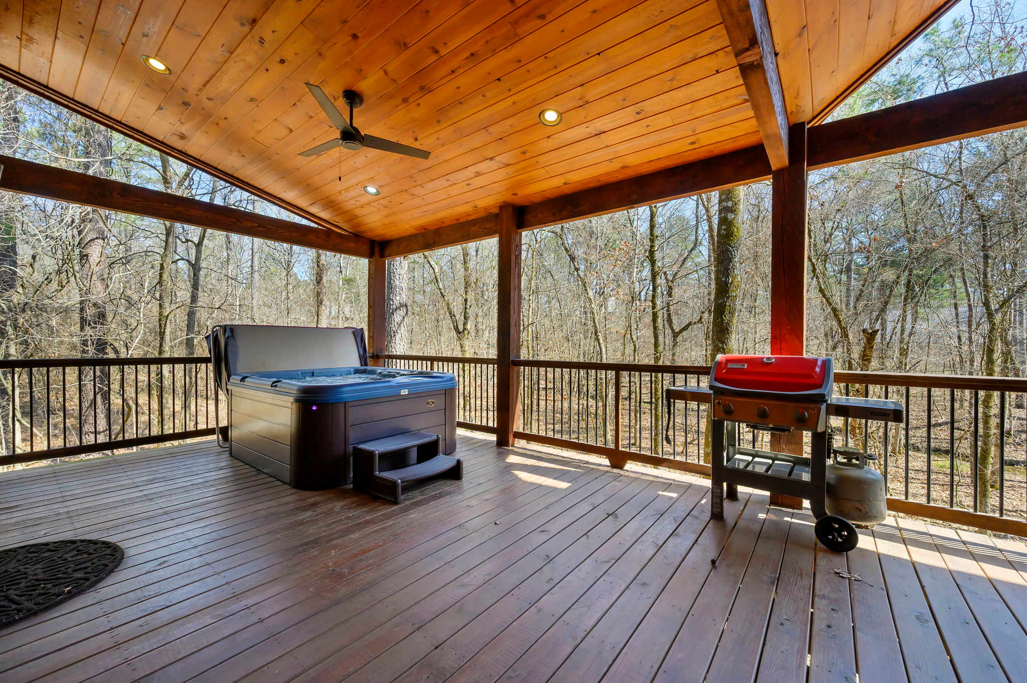 Outside is where this cabin truly steals your heart. A covered deck invites you to unwind in the bubbling hot tub, relax in comfortable seating, or fire up the grill for an easy dinner in the fresh pine-scented air. Down below, a seasonal creek winds through the backyard, creating a peaceful soundtrack for evenings spent around the fire pit. Whether you’re reconnecting, celebrating, or simply escaping the everyday, Pond Lily Creek offers the romance, comfort, and charm you’ve been dreaming of.