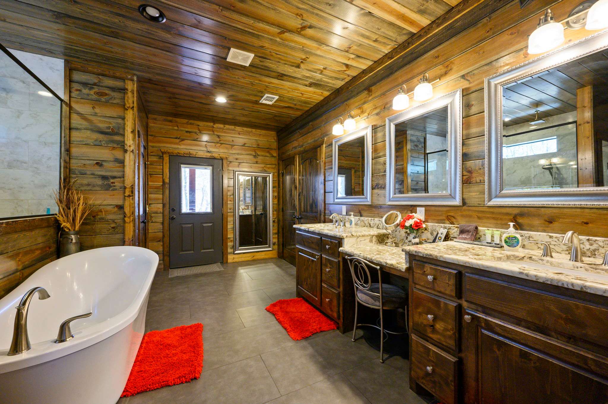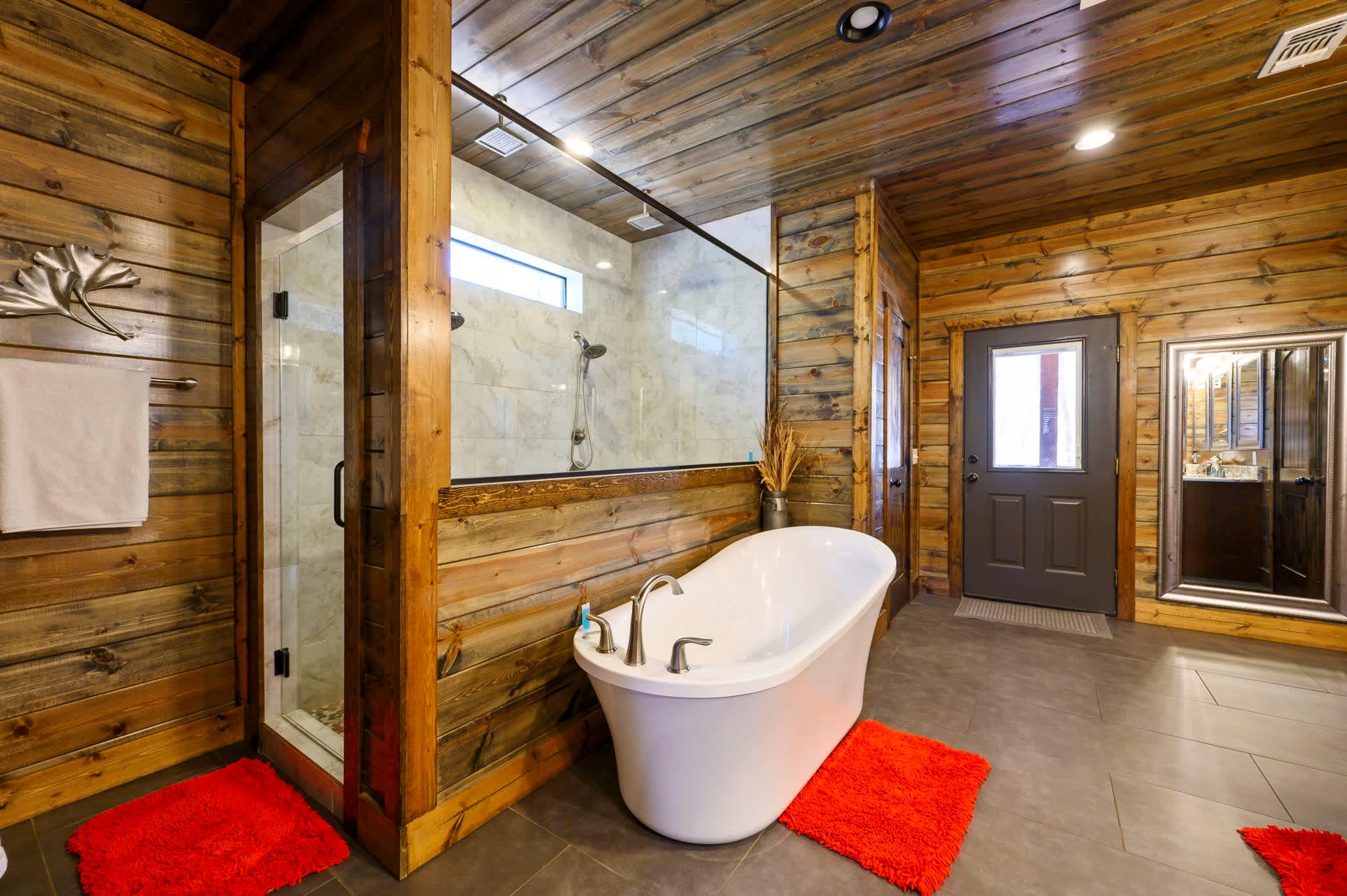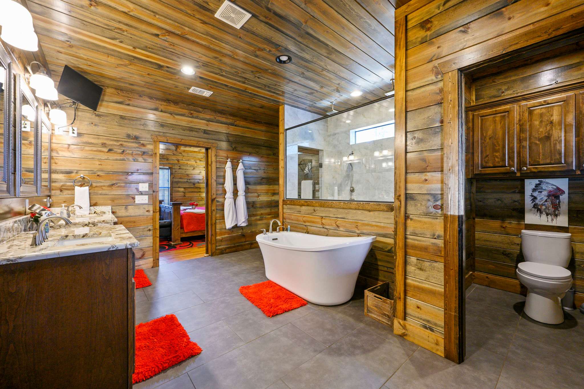 Bedroom #1 includes a king size bed, a smart TV, a fireplace, and an ensuite bathroom with a dual vanity, a soaking tub, and a walk-in shower. The bathroom is also accessible to the deck with a hot tub.