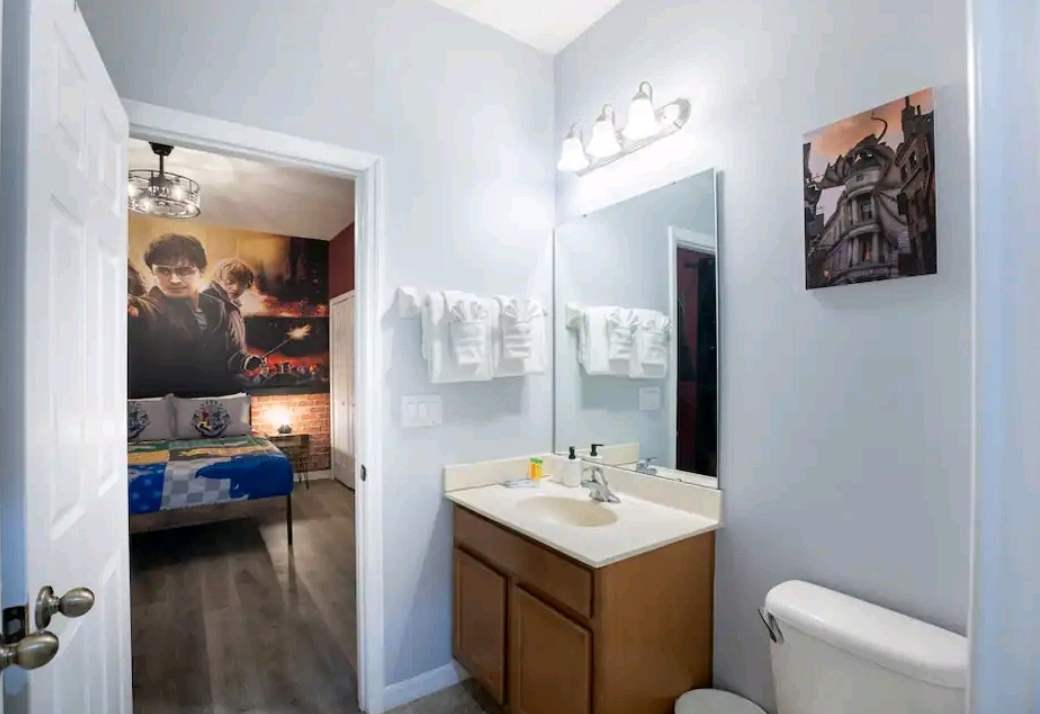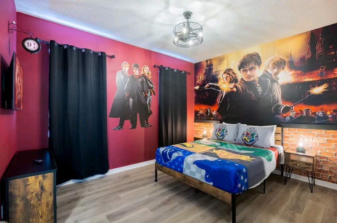 Bedroom #1 is Harry Potter themed and includes a queen size bed, a smart TV, and an ensuite bathroom with a single vanity and a walk-in shower, also accessible via the hallway.