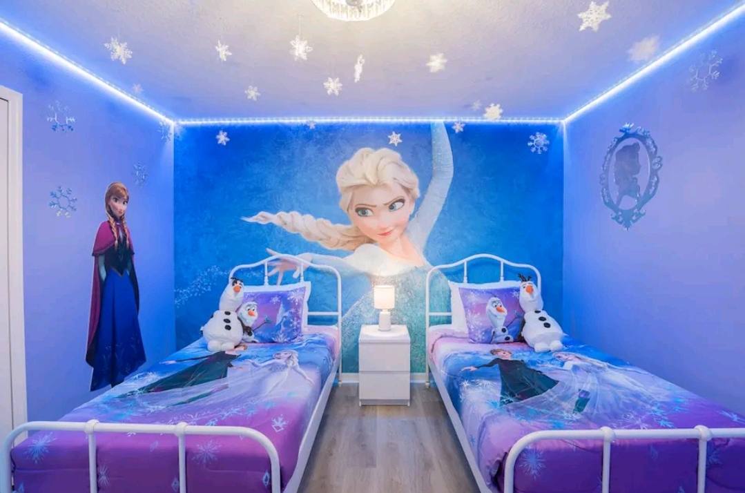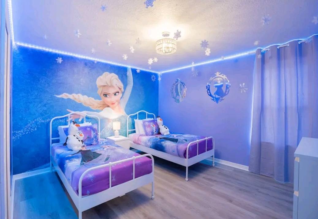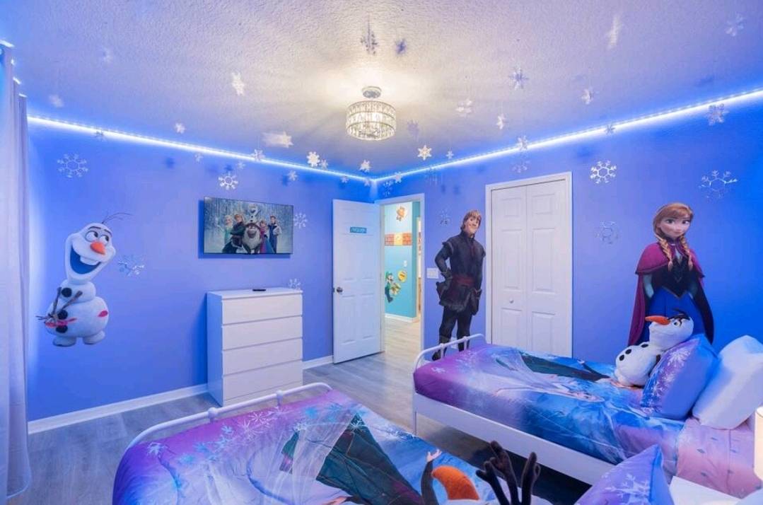 Bedroom #3 is Frozen themed and includes 2 twin size beds, a crib, and a smart TV.