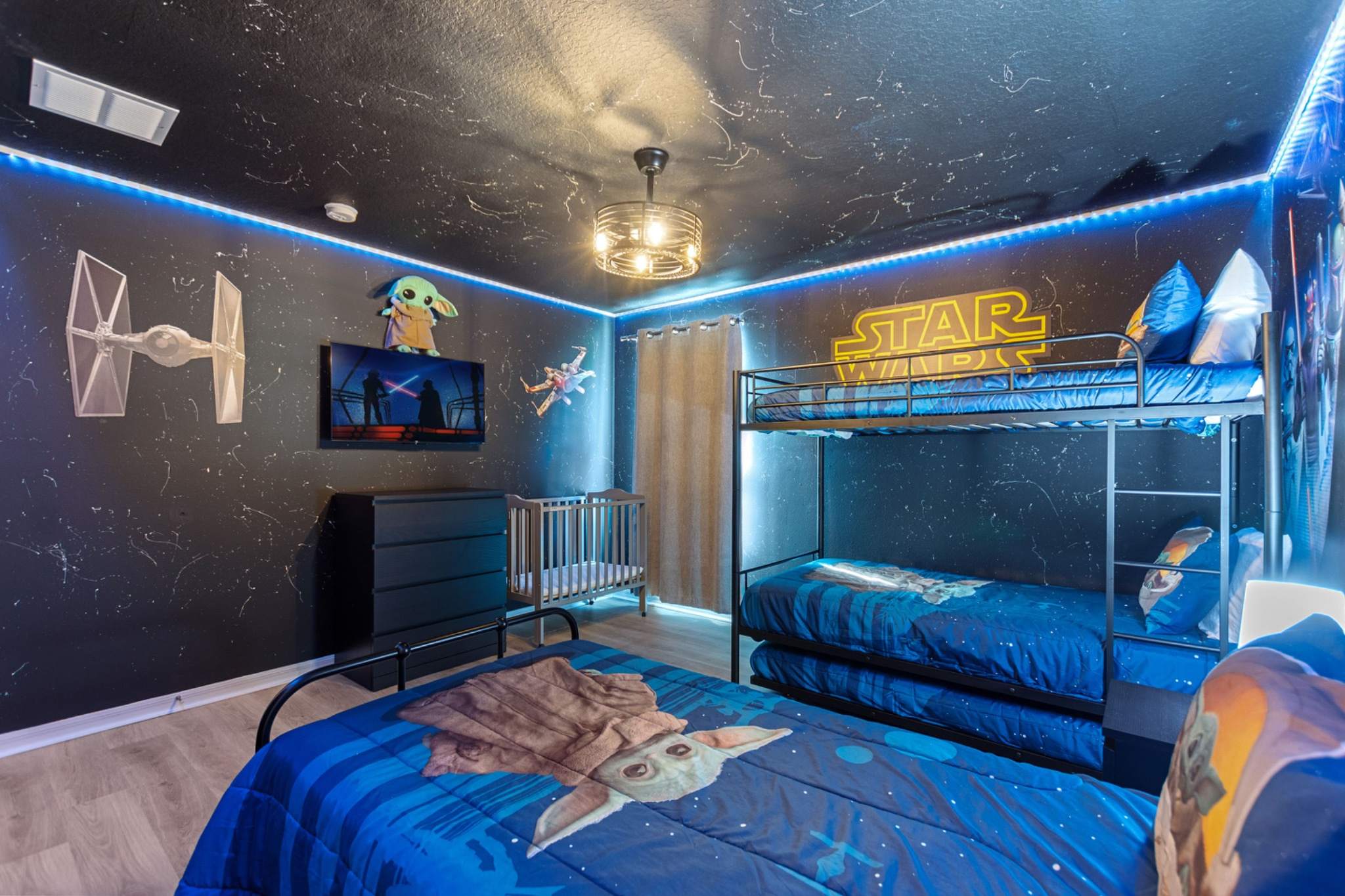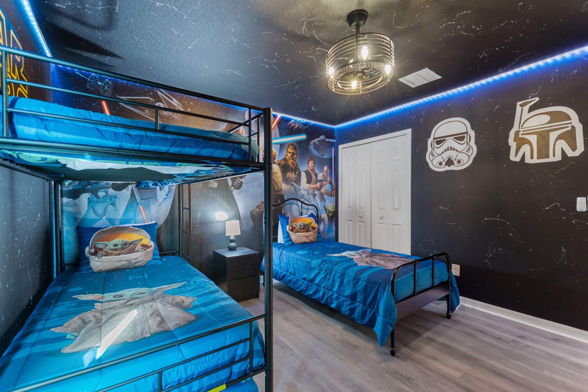 Bedroom #2 is Star Wars themed and includes a set of twin-over-twin size bunk beds, a twin size trundle bed, a twin size bed, and a smart TV.
