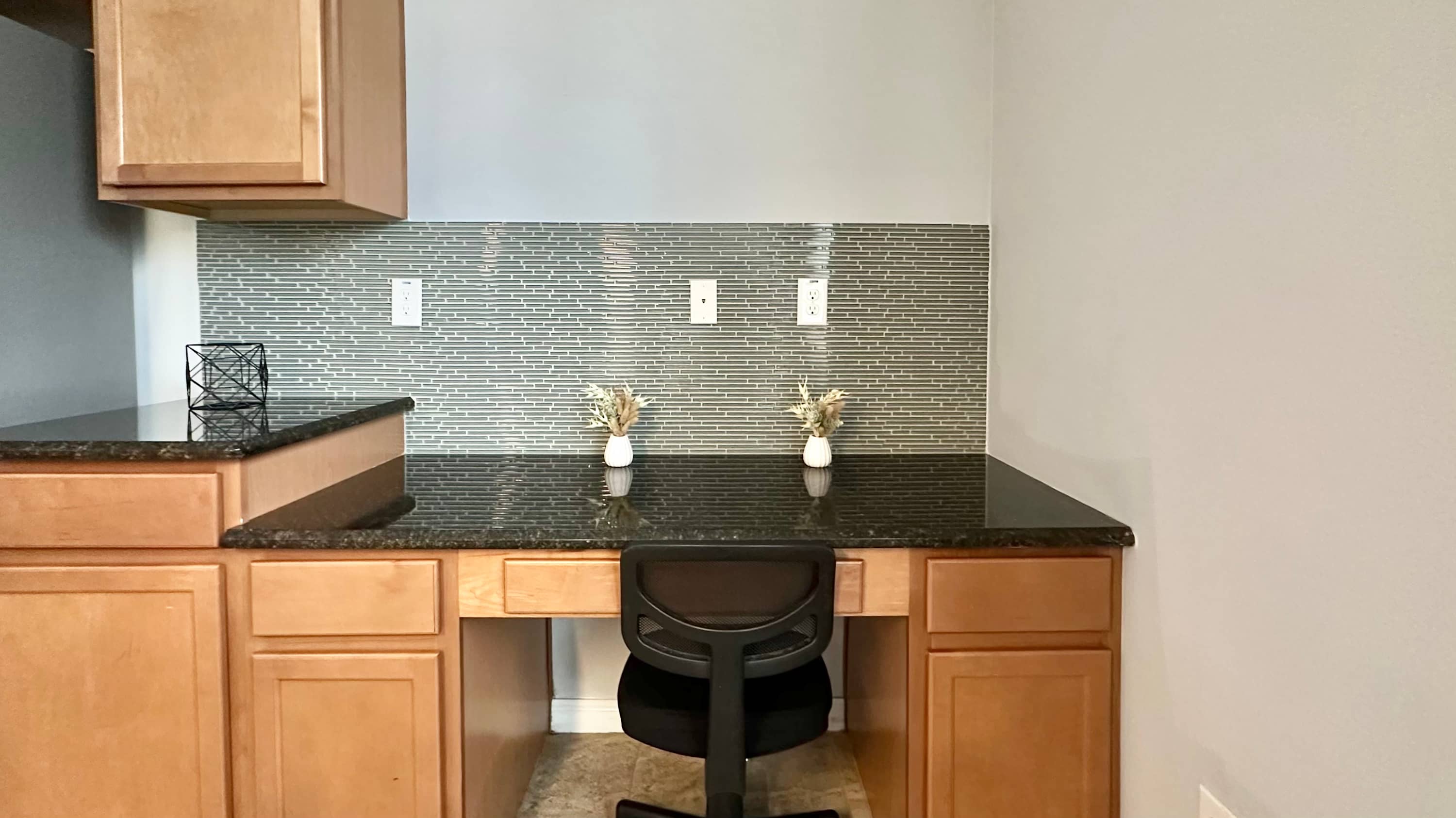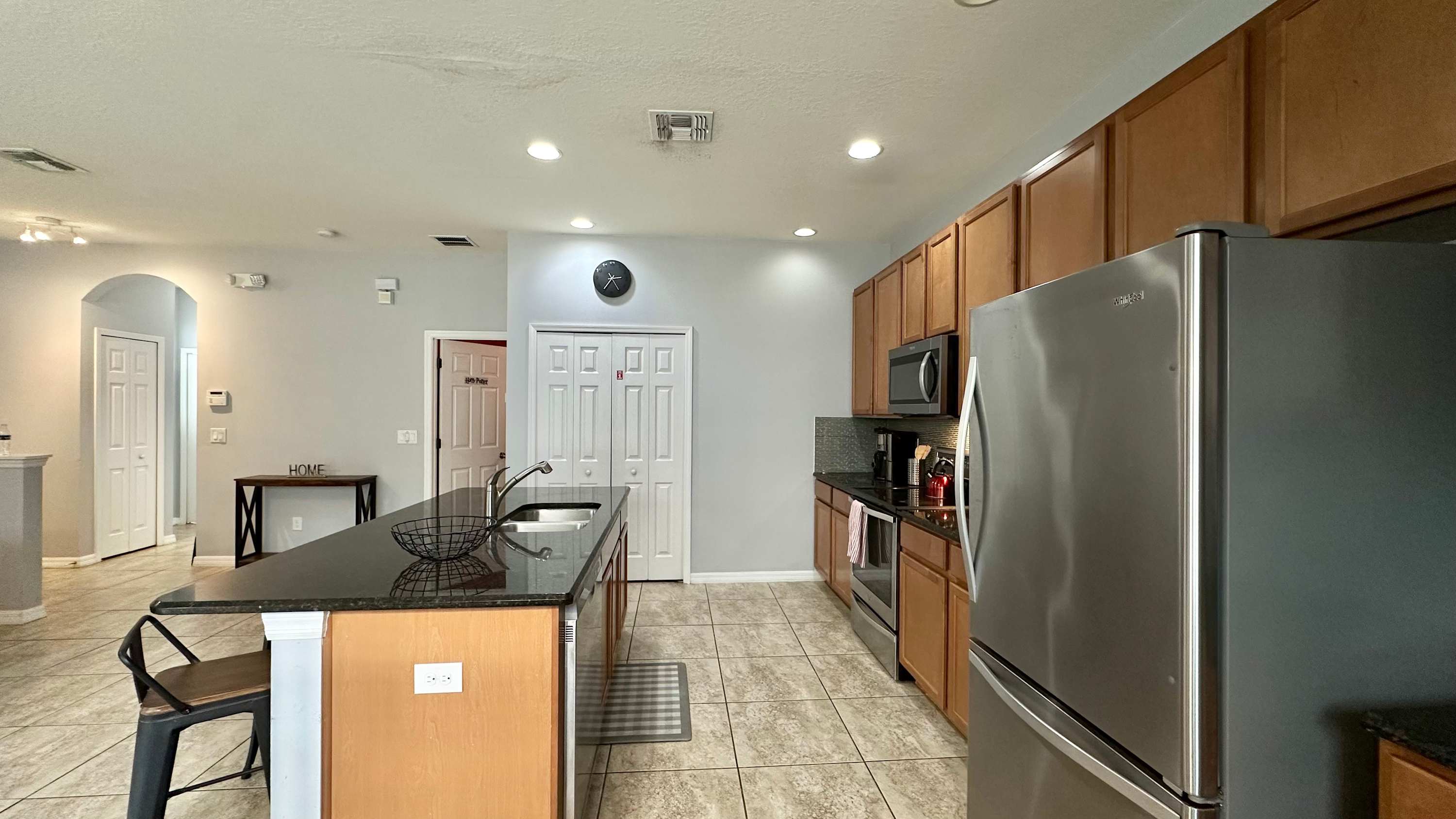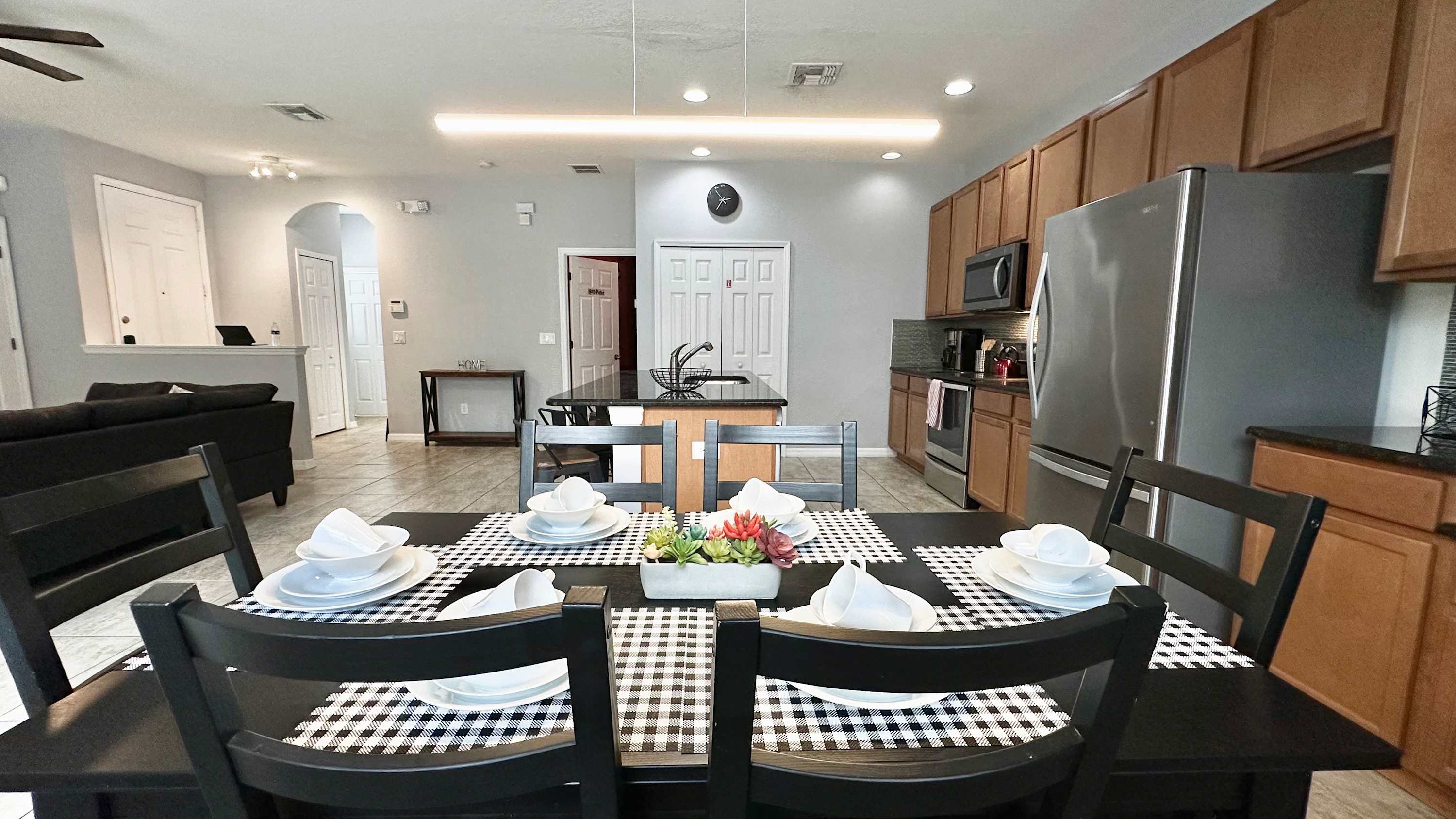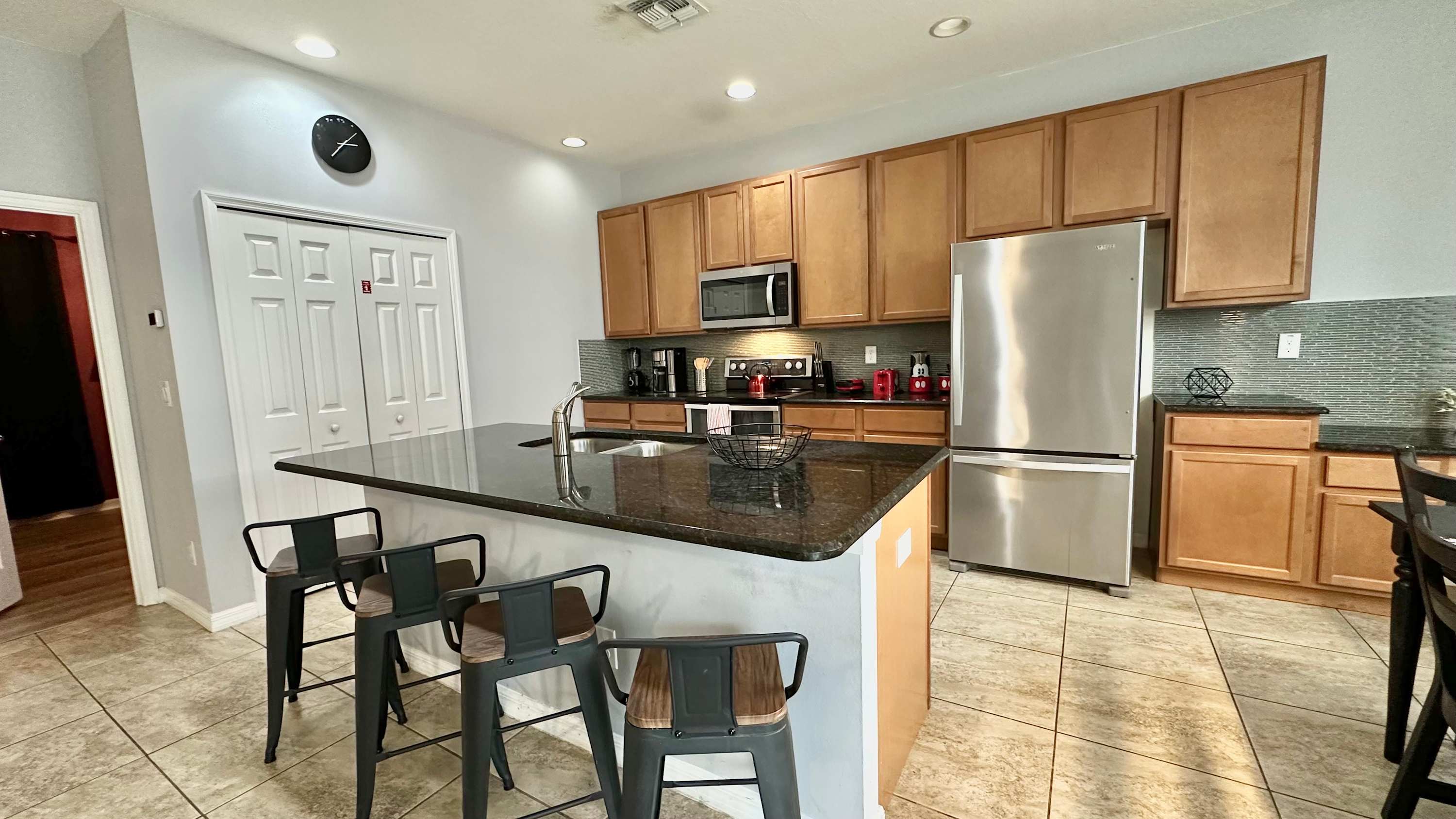 Back inside, the kitchen is both stylish and functional with black granite countertops, medium wood cabinetry, stainless steel appliances, and a convenient single-cup coffee maker. A built-in desk offers a handy spot to check plans for the day, while the island with seating for four invites casual breakfasts and conversation. Nearby, a dining table for six sets the stage for shared meals and memorable evenings together—making Sweet Retreat At Bella Vida a welcoming place to gather, relax, and make the most of your Florida getaway.