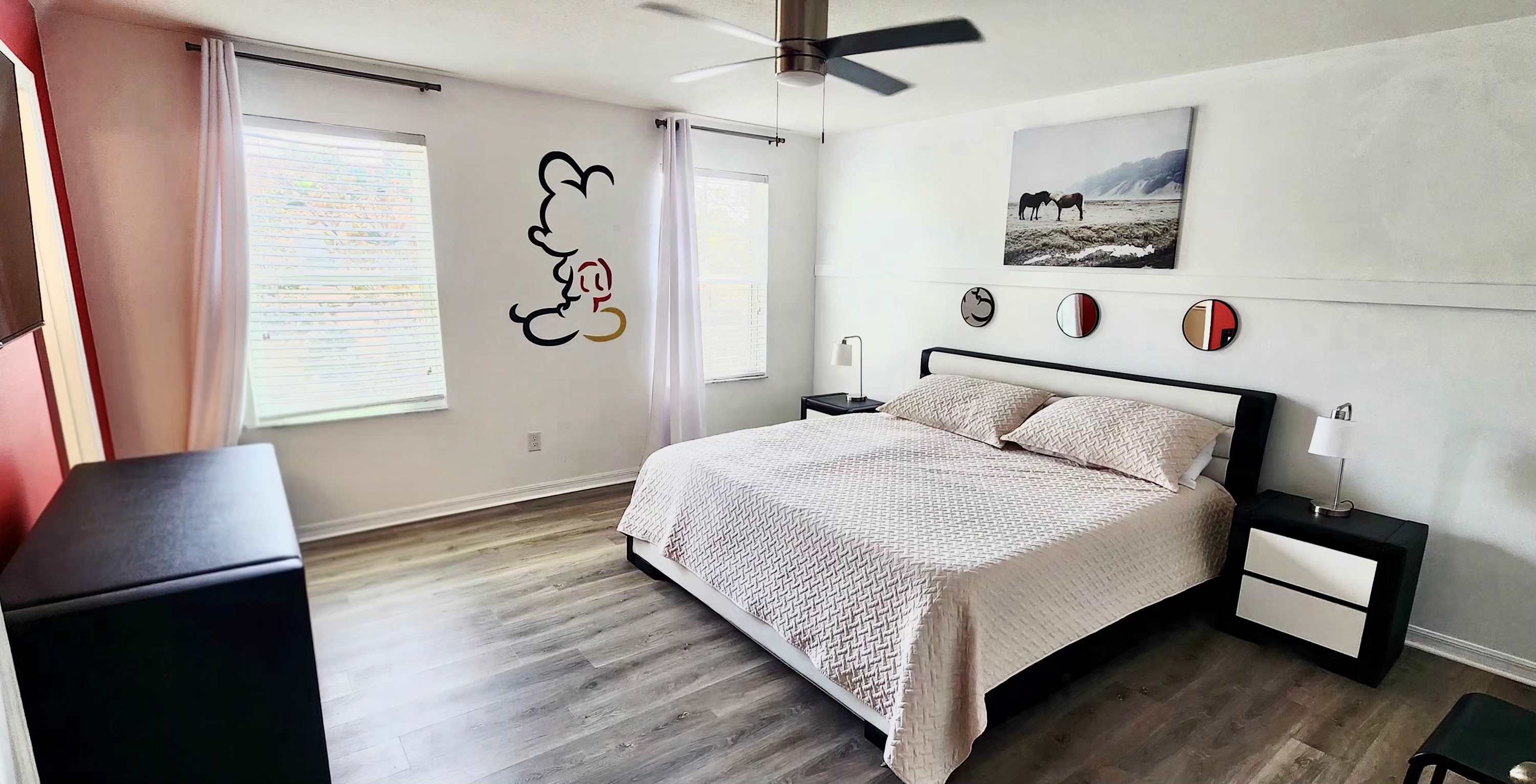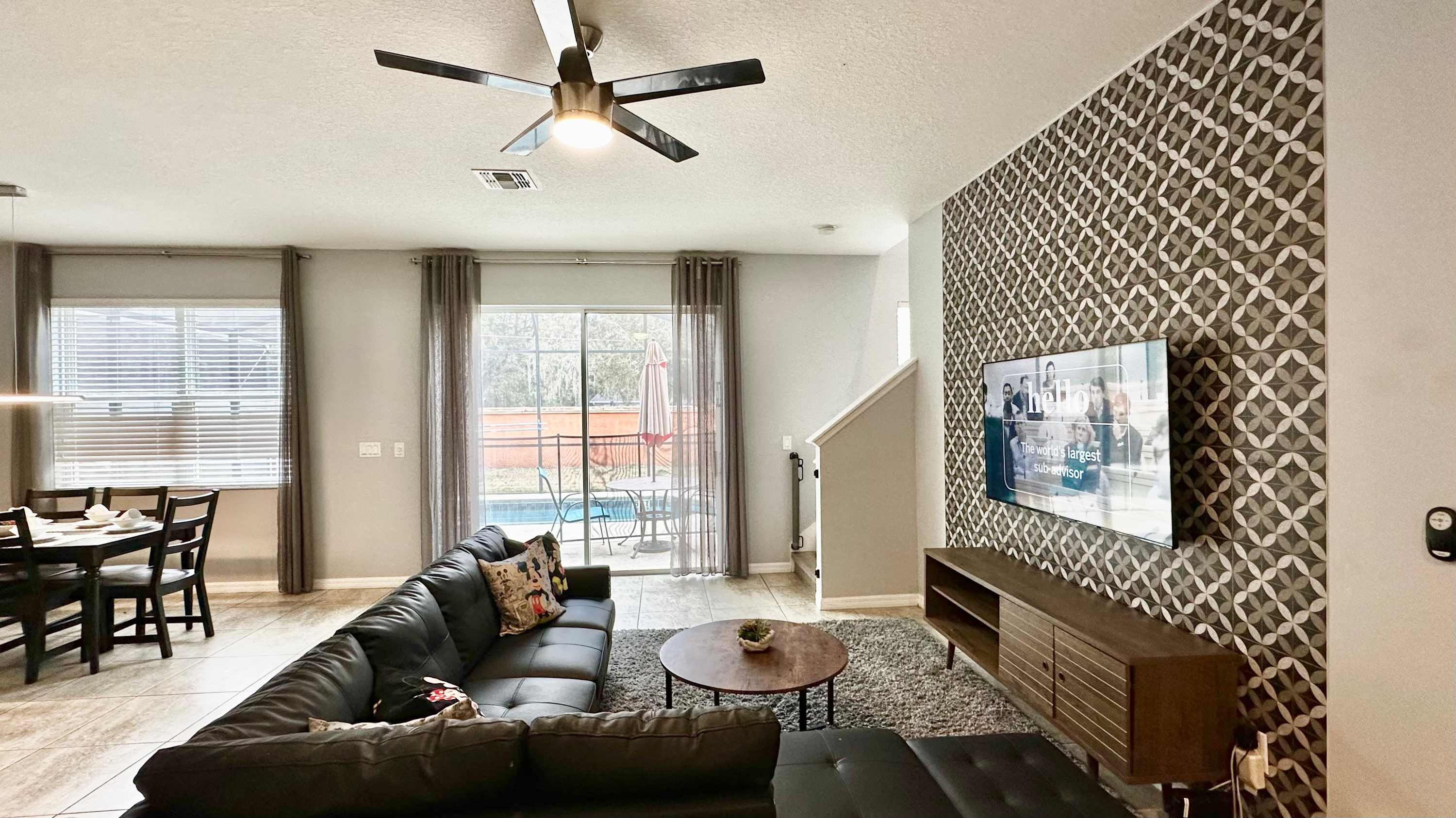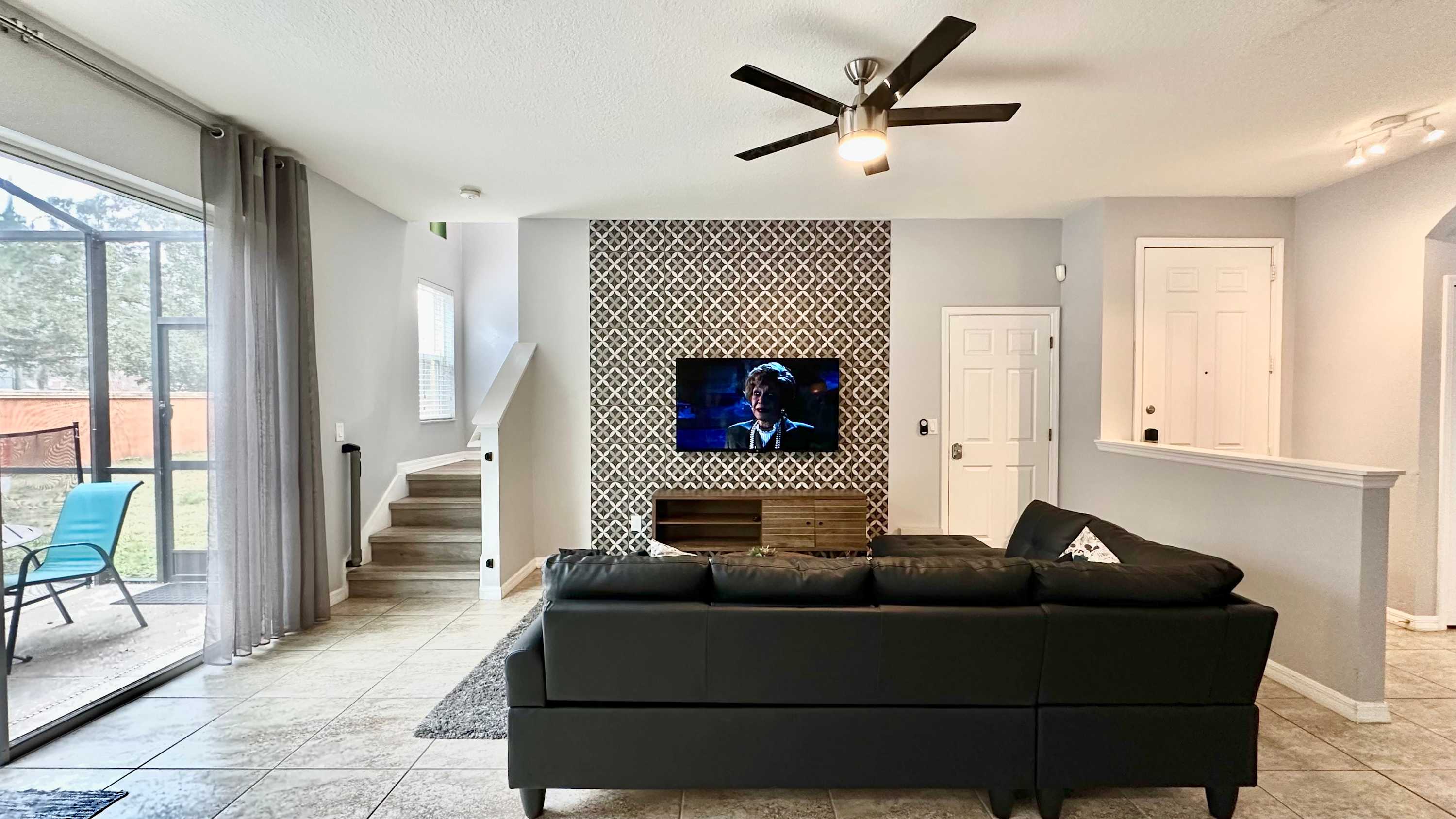 Step inside and you’ll find a modern interior styled with sleek blacks, greys, and whites accented by bold pops of red that give the home a fresh, contemporary feel. The living room welcomes you with a mounted smart TV and a comfortable L-shaped sofa with chaise—ideal for movie nights or relaxing after a day of adventure. Sliding glass doors open to the screened-in pool area, creating an easy indoor-outdoor flow. Outside, your private oasis features a refreshing plunge pool surrounded by greenery, a table for two with an umbrella for shaded morning coffee, and additional chairs for lounging. A privacy wall along the side and rear borders a grassy area, making the space feel peaceful and secluded.