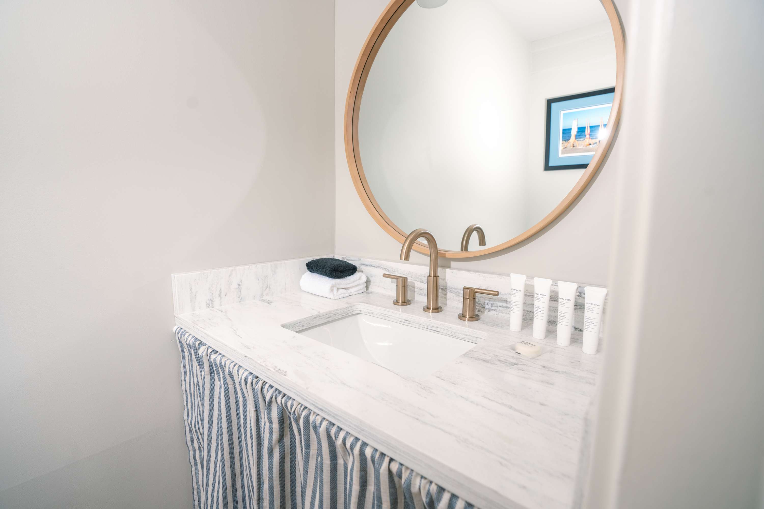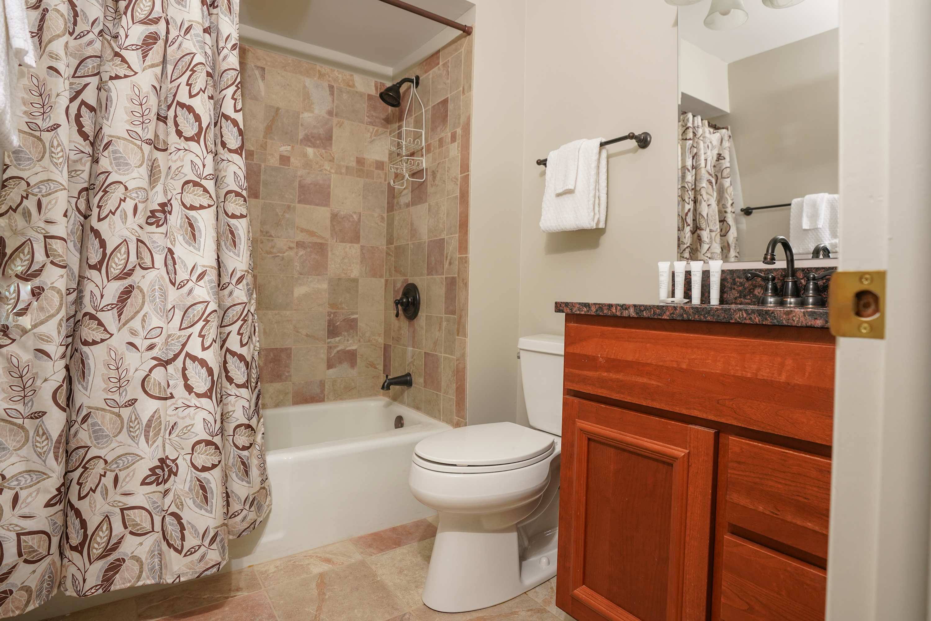 This home also includes a half bathroom and a full guest bathroom with a single vanity and a shower/tub combo.