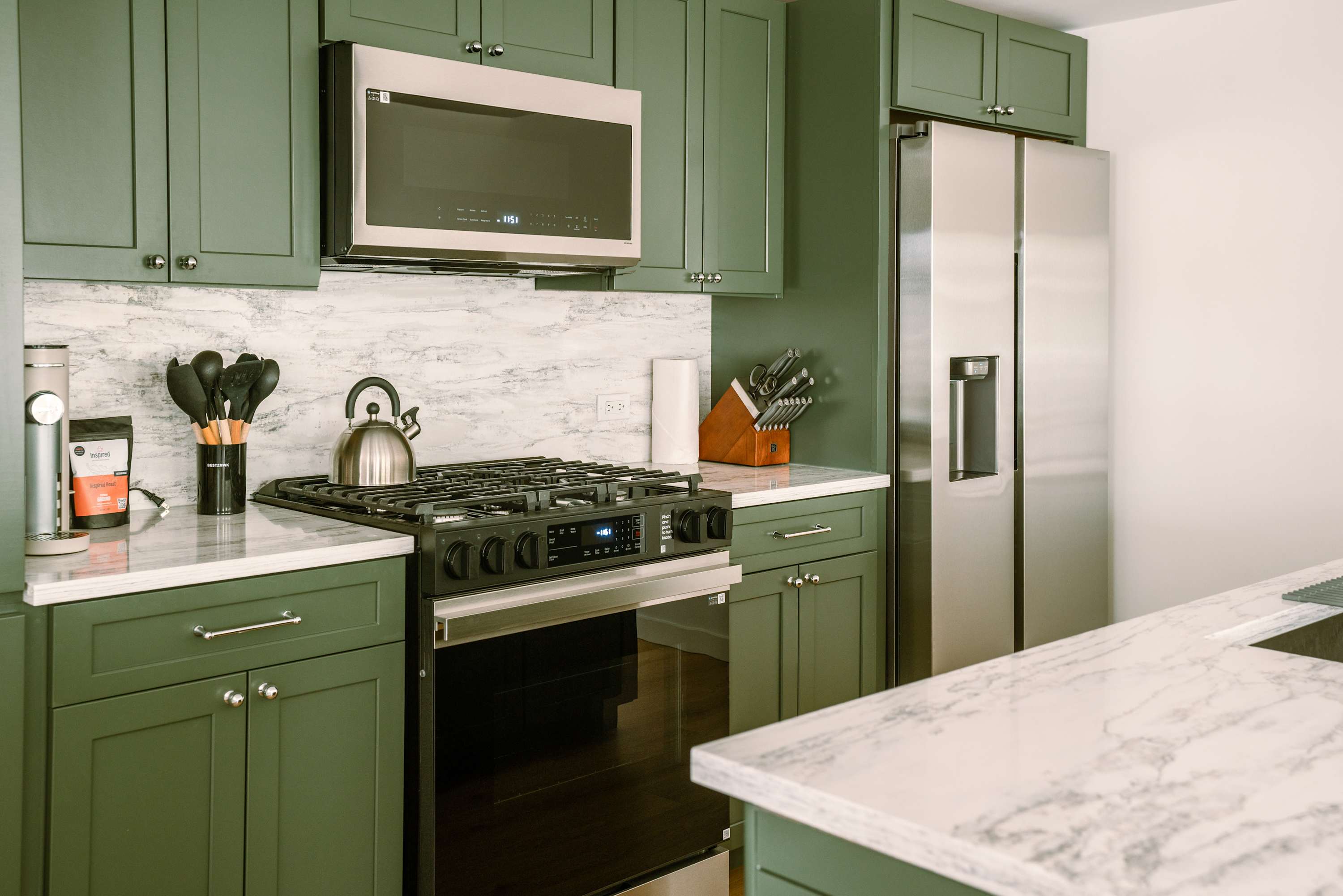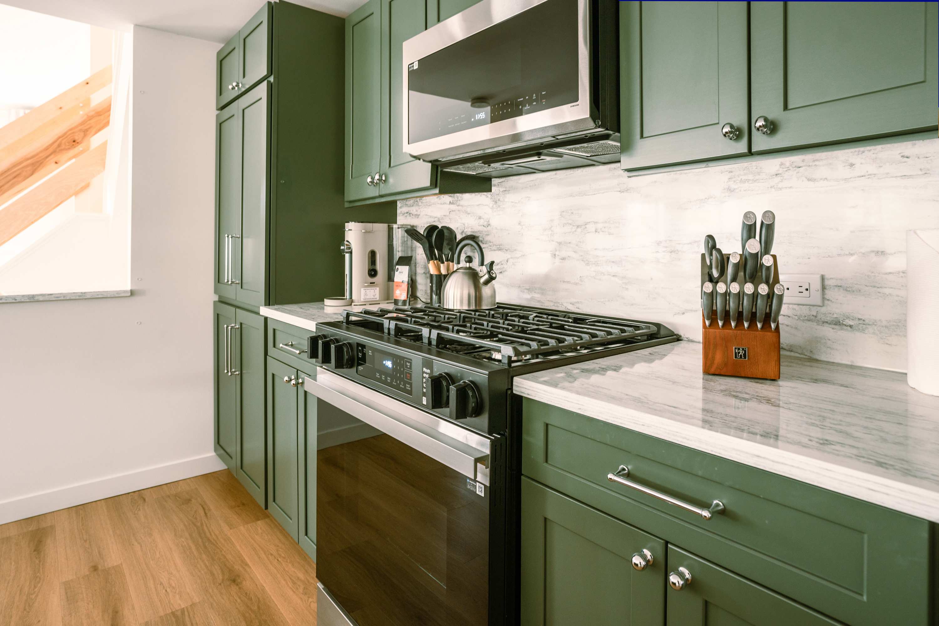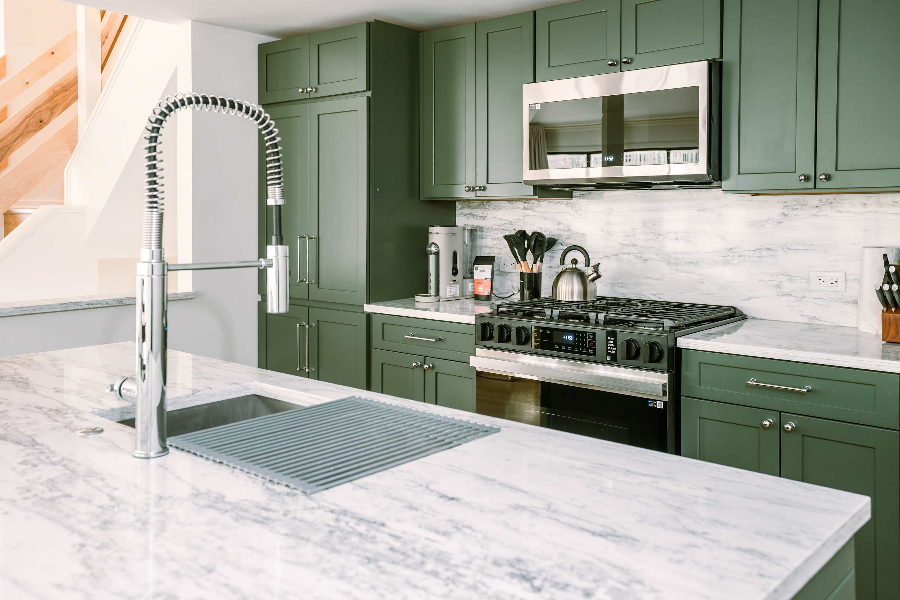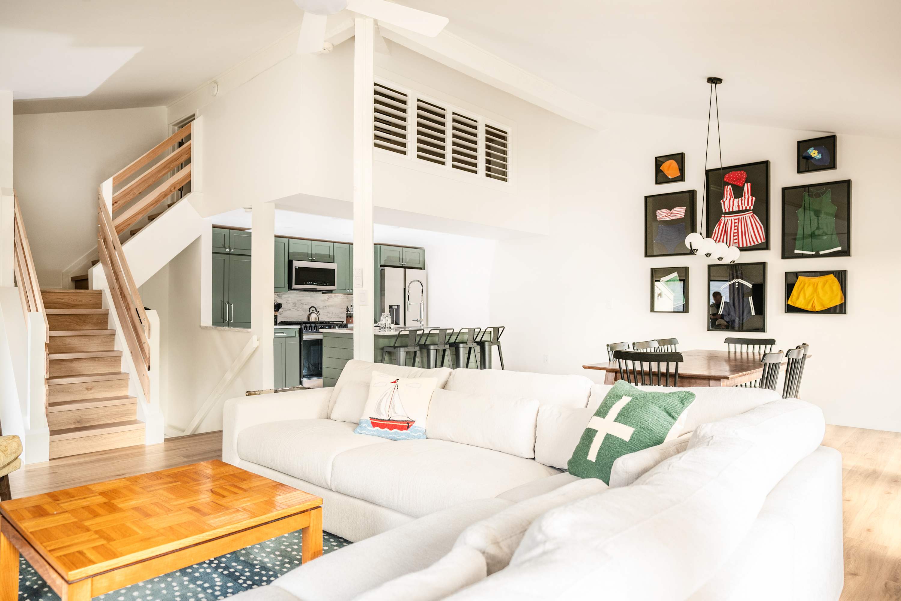 Step inside The Family Clubhouse and you’re welcomed by a bright, comfortable living space designed for gathering together. Sliding glass doors flood the living room with natural light, highlighting the inviting wraparound couch that’s perfect for movie nights on the smart TV or simply relaxing after a day at the lake. Just steps away, the dining table for eight creates the ideal setting for family dinners and lively conversations. The kitchen blends style and function with rich green cabinetry, stone countertops, stainless steel appliances, and counter seating for four, while the on-demand single-cup coffee maker makes mornings effortless.