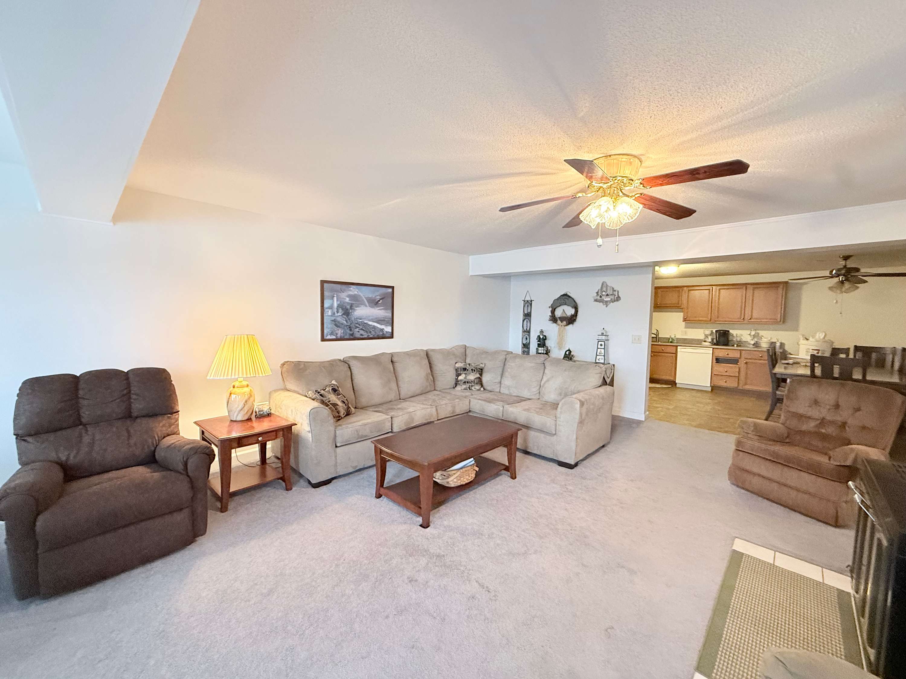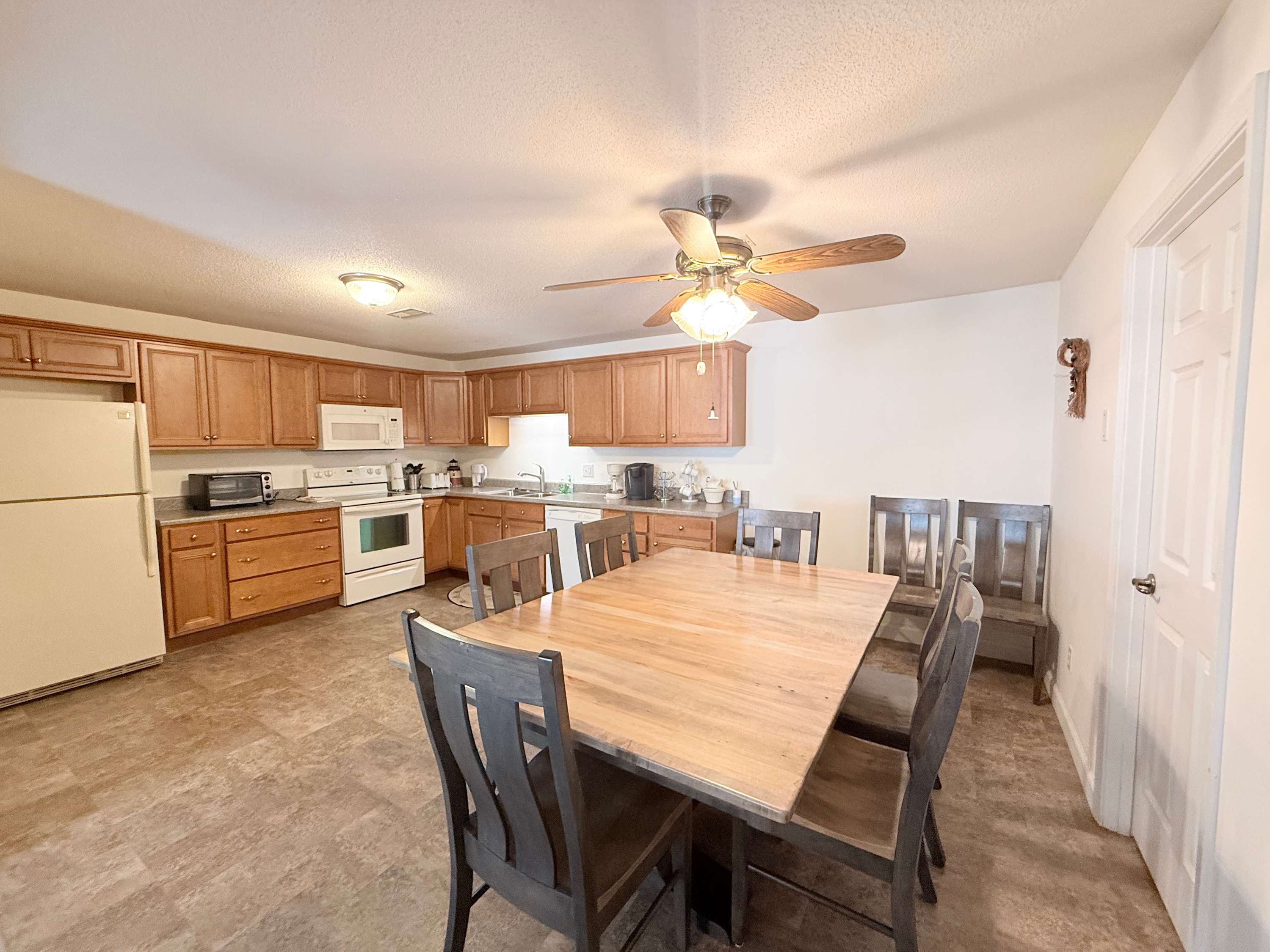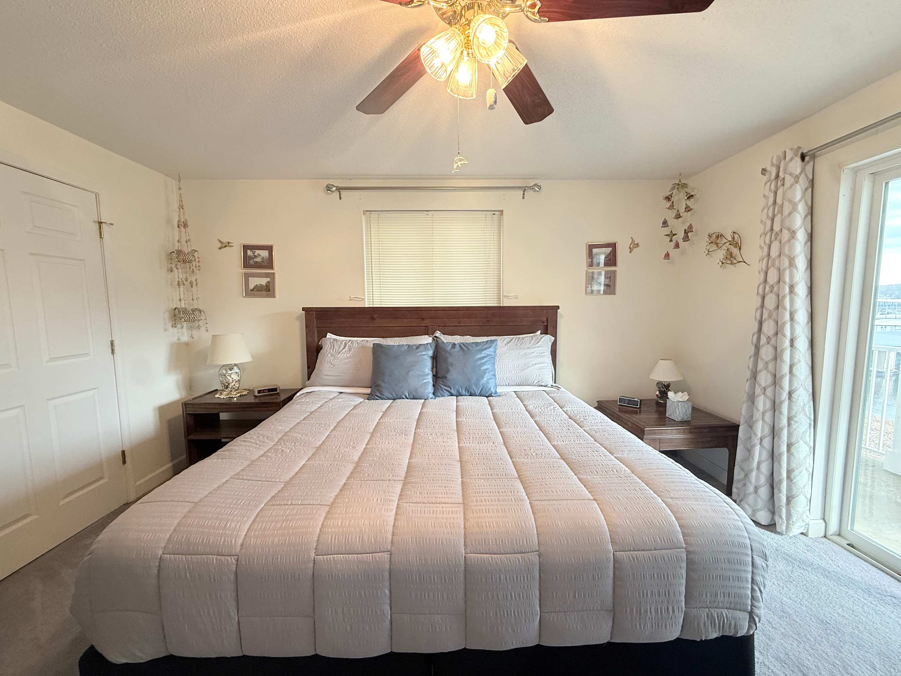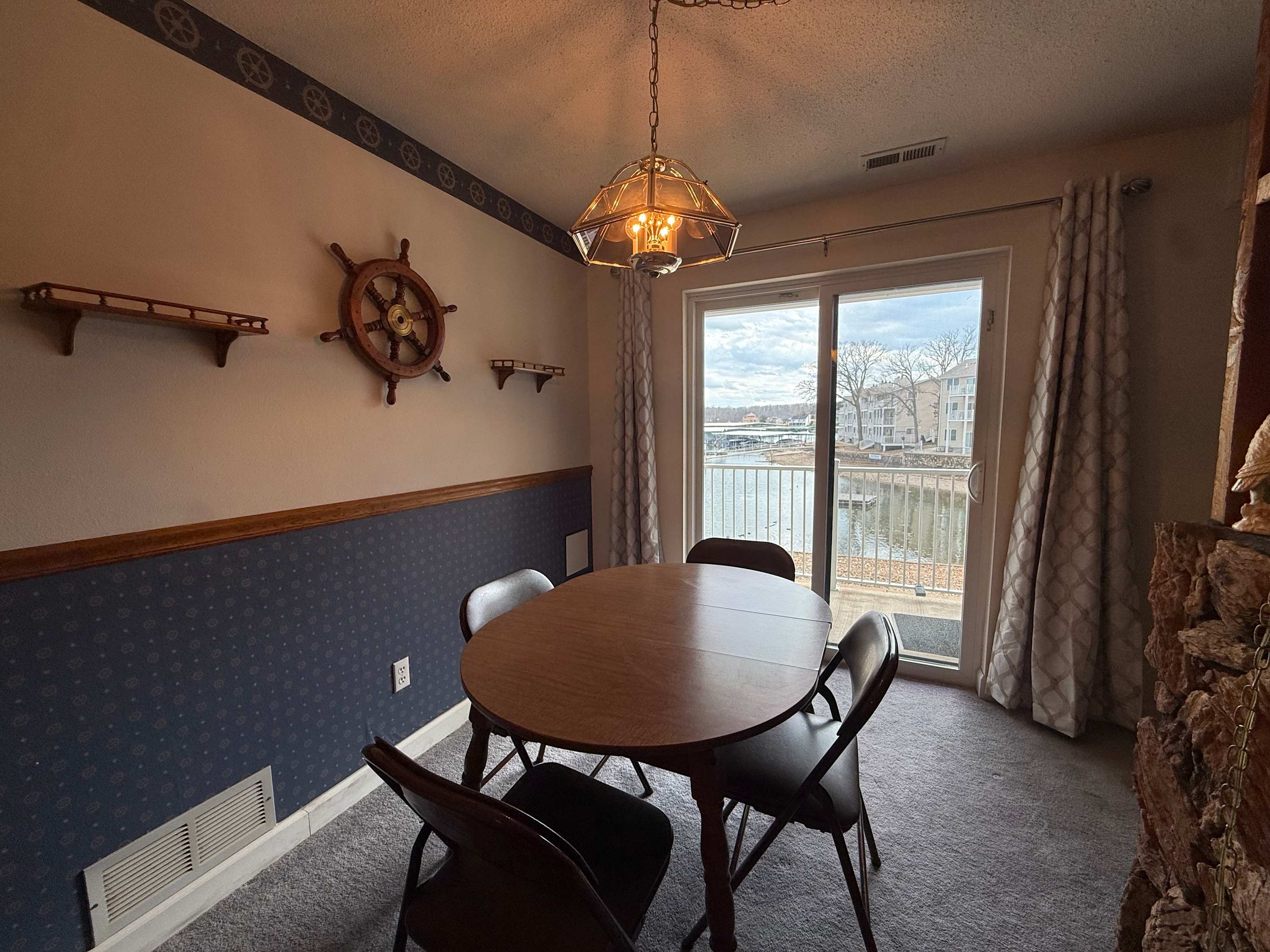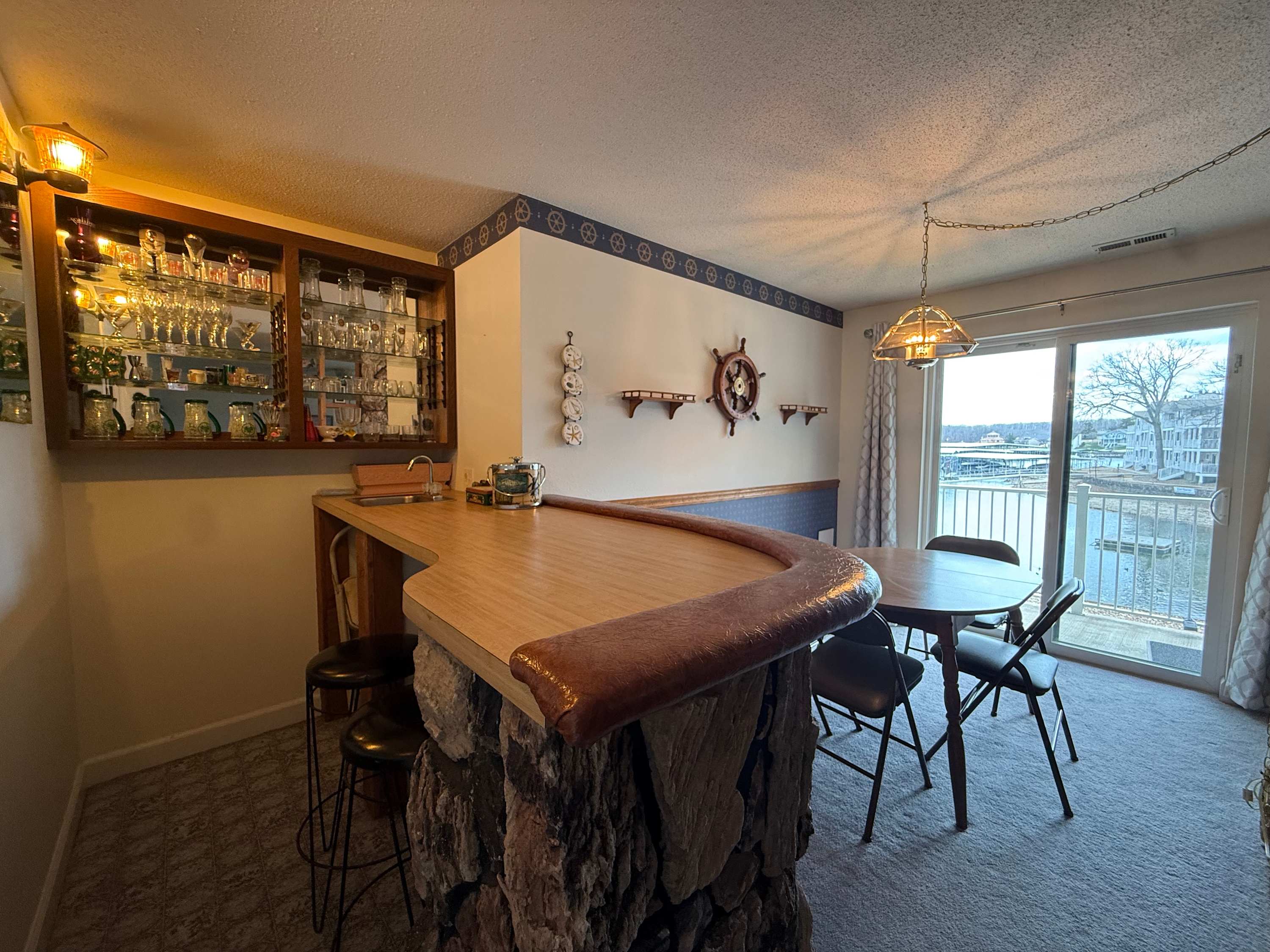 Step inside and the open living space immediately draws your eyes to the sparkling lake beyond. The comfortable living room is designed for gathering, with an L-shaped couch, cozy armchairs, a smart TV, and even a convenient bar area for evening drinks after a day on the water. Just beside it, the spacious kitchen flows effortlessly into the living area, making it easy to stay connected while preparing meals. A Keurig and drip combo coffee maker keeps mornings simple, and the dining table can expand to welcome up to eight guests for shared meals and game nights. Outside, the private lakefront patio invites you to relax, soak in the views, and enjoy the peaceful Ozark atmosphere from the comfort of your own outdoor space.