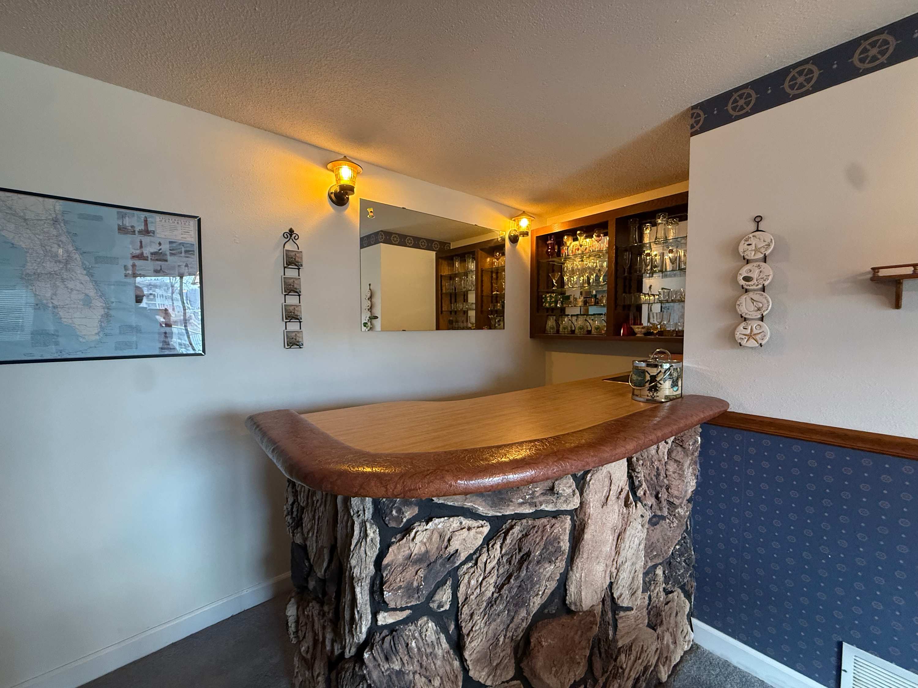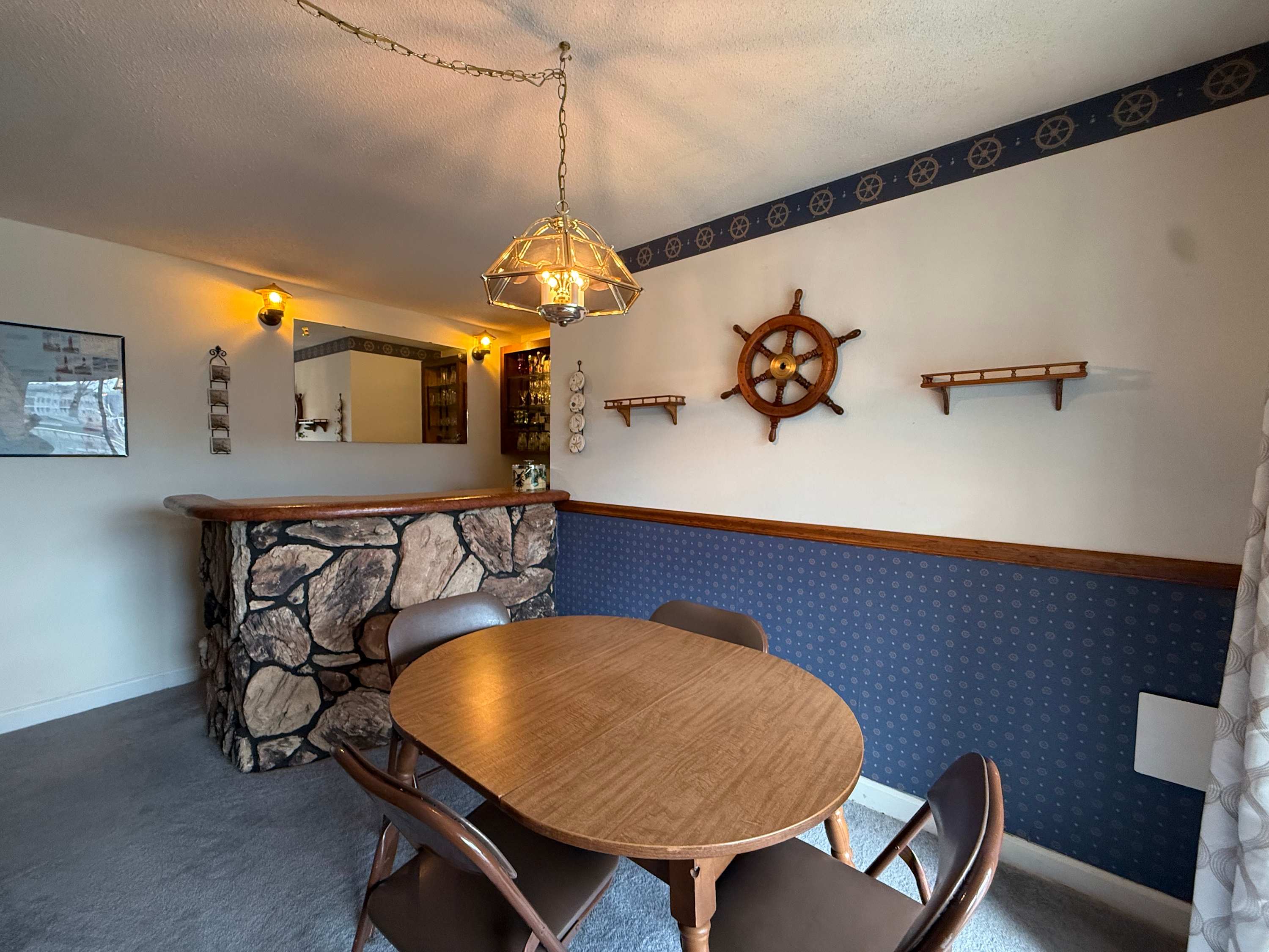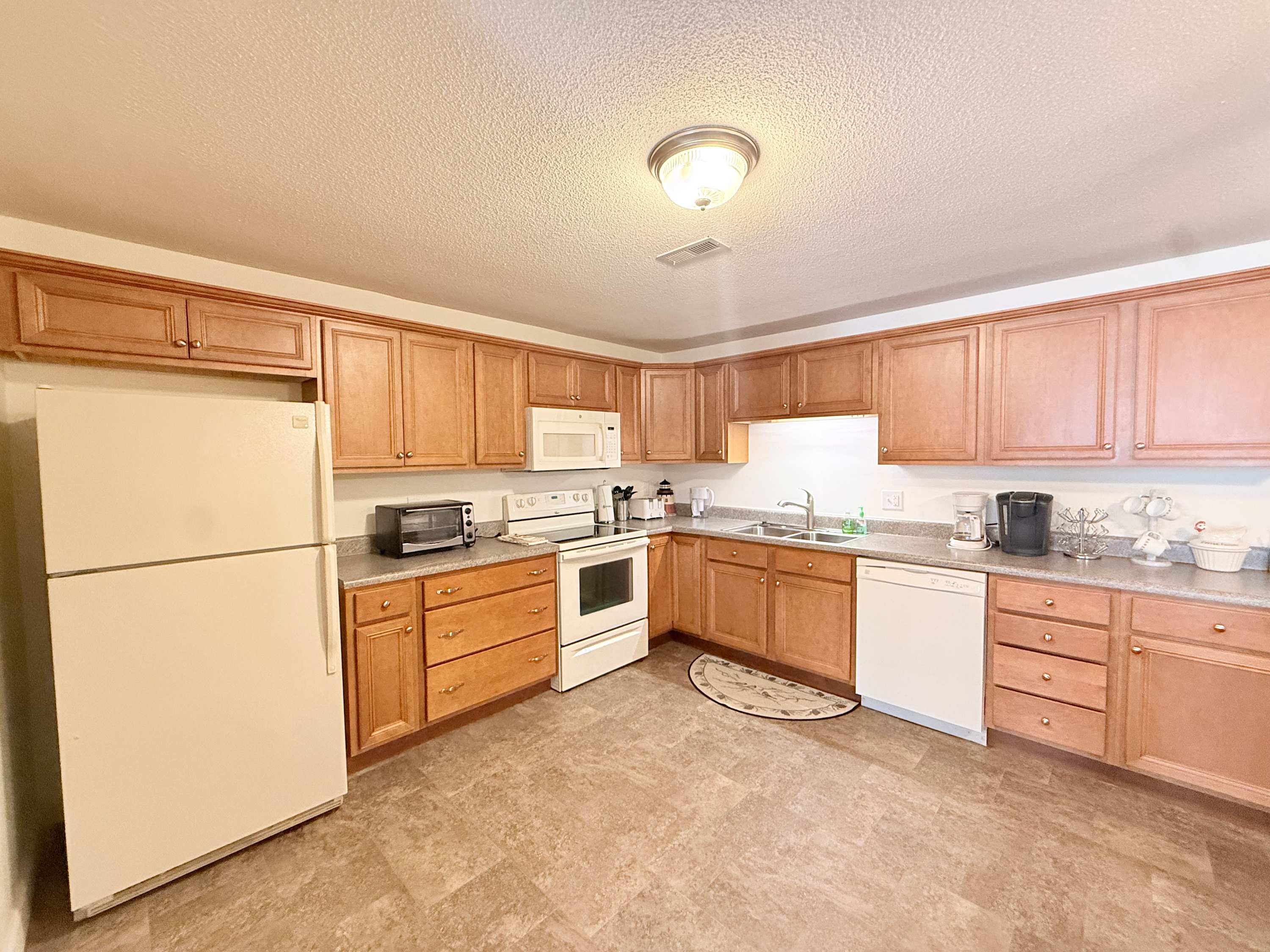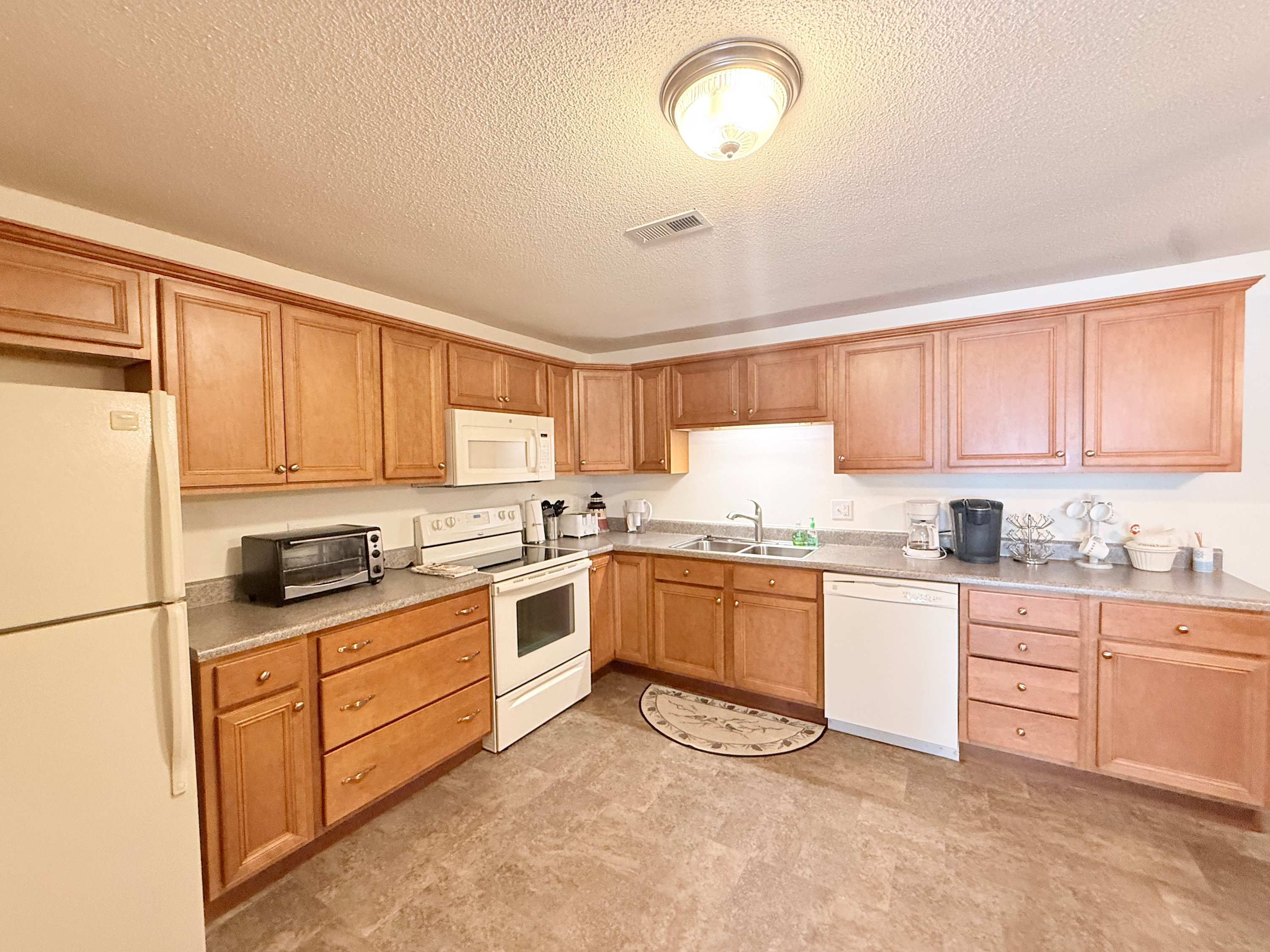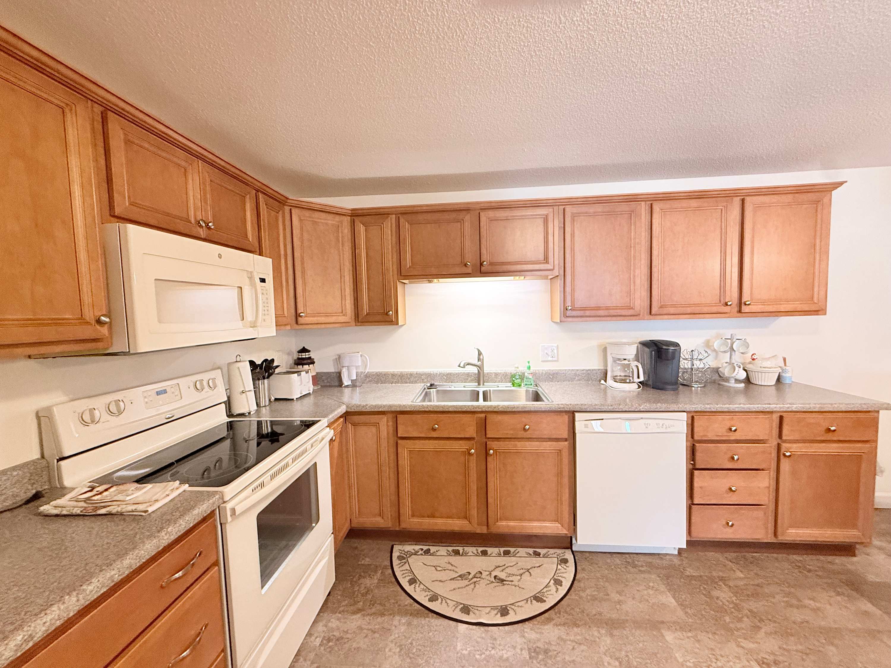 Step inside and the open living space immediately draws your eyes to the sparkling lake beyond. The comfortable living room is designed for gathering, with an L-shaped couch, cozy armchairs, a smart TV, and even a convenient bar area for evening drinks after a day on the water. Just beside it, the spacious kitchen flows effortlessly into the living area, making it easy to stay connected while preparing meals. A Keurig and drip combo coffee maker keeps mornings simple, and the dining table can expand to welcome up to eight guests for shared meals and game nights. Outside, the private lakefront patio invites you to relax, soak in the views, and enjoy the peaceful Ozark atmosphere from the comfort of your own outdoor space.