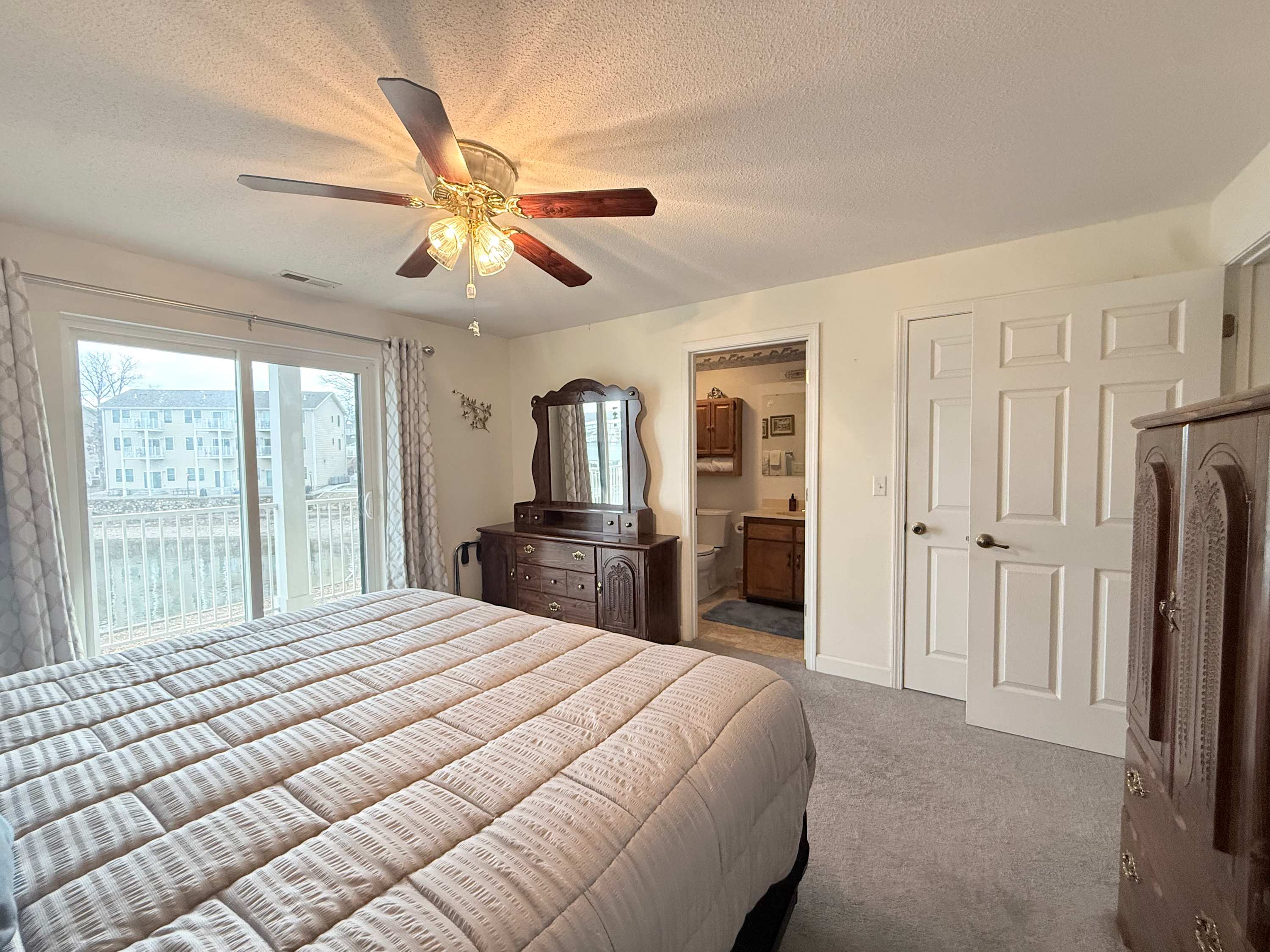 Bedroom #1 includes a king size bed, patio access, and an ensuite bathroom with a single vanity and a shower/tub combo.