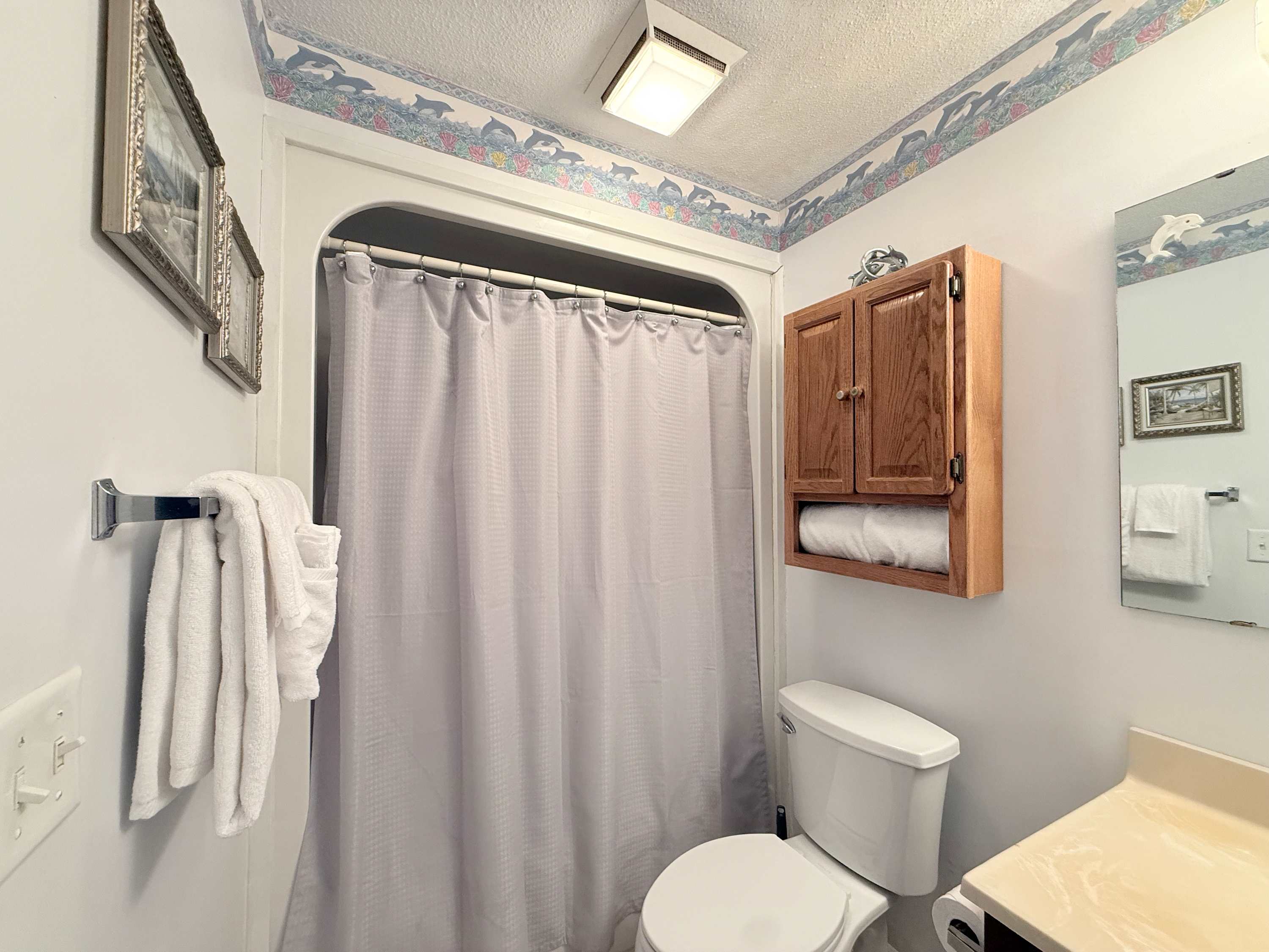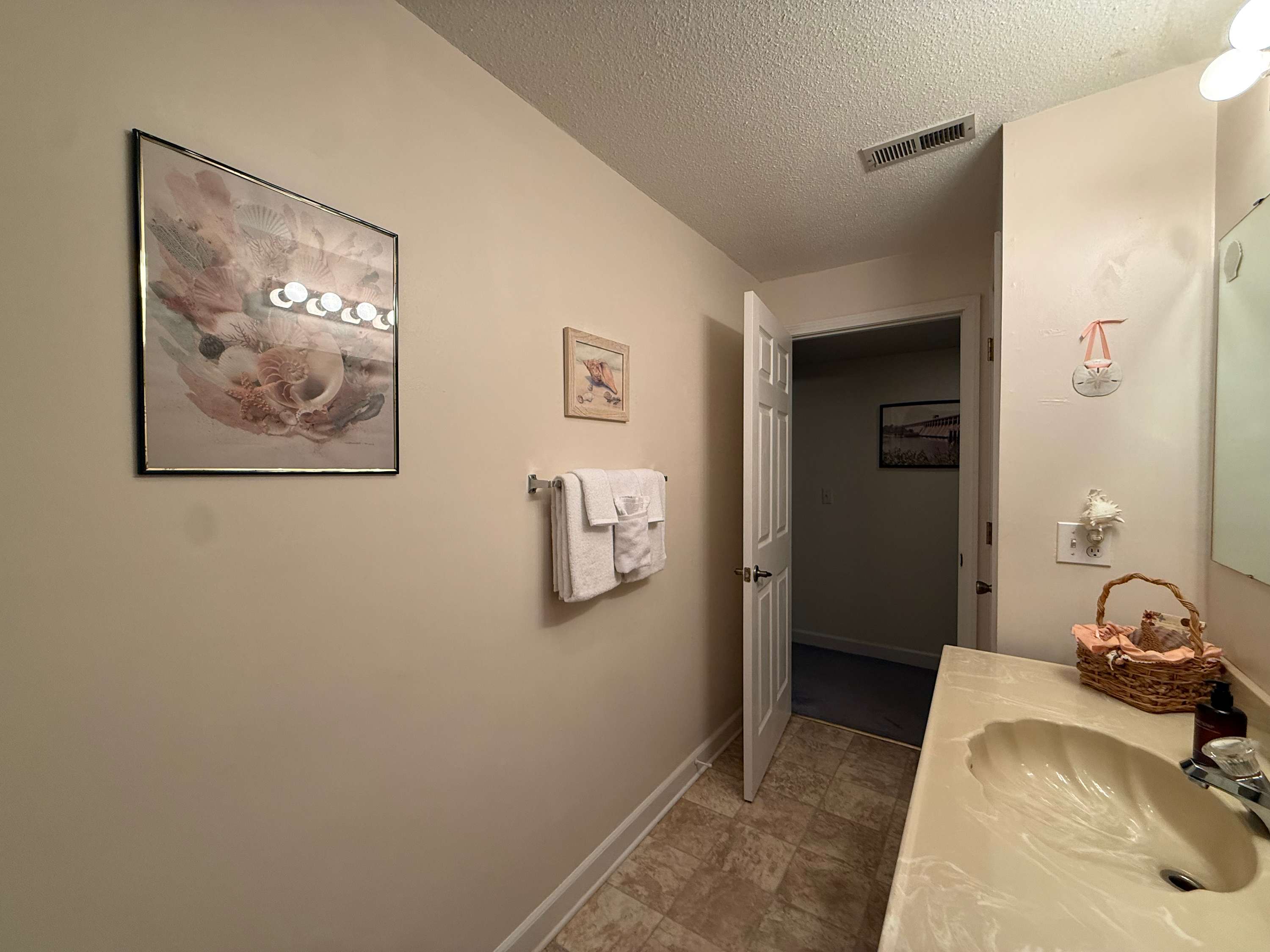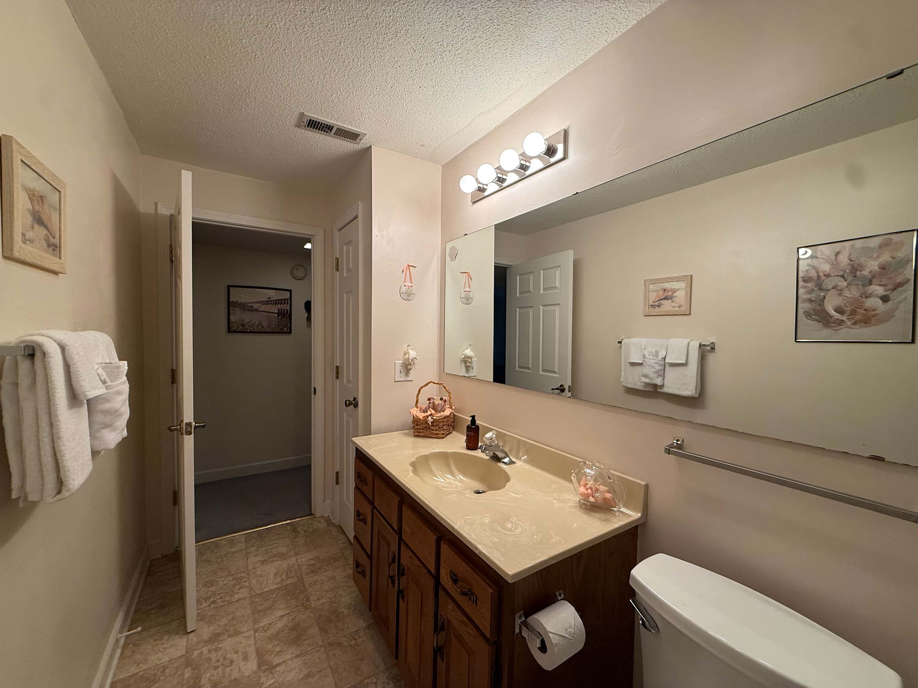 This home includes and additional full guest bathroom with a single vanity and a shower/tub combo.