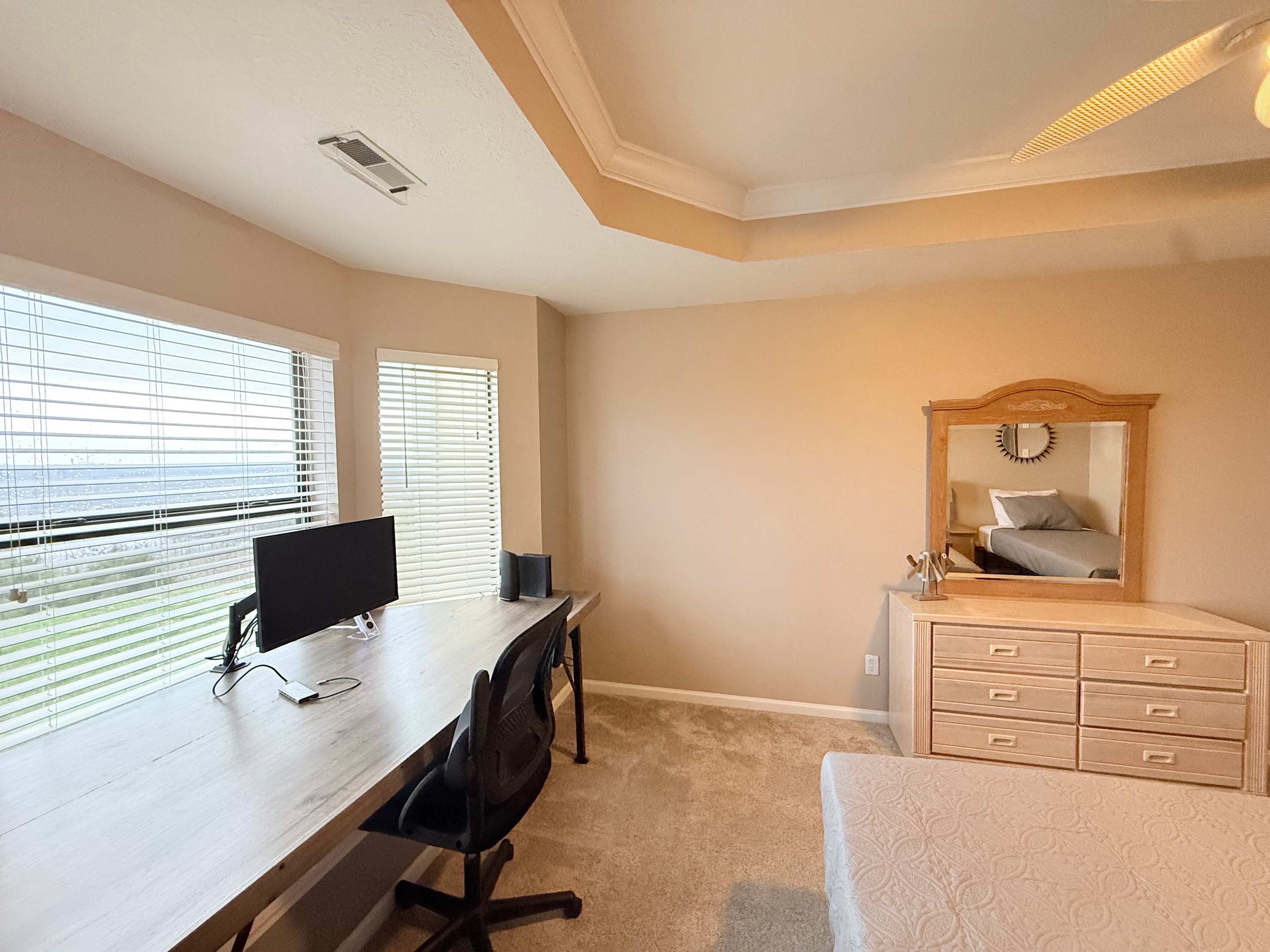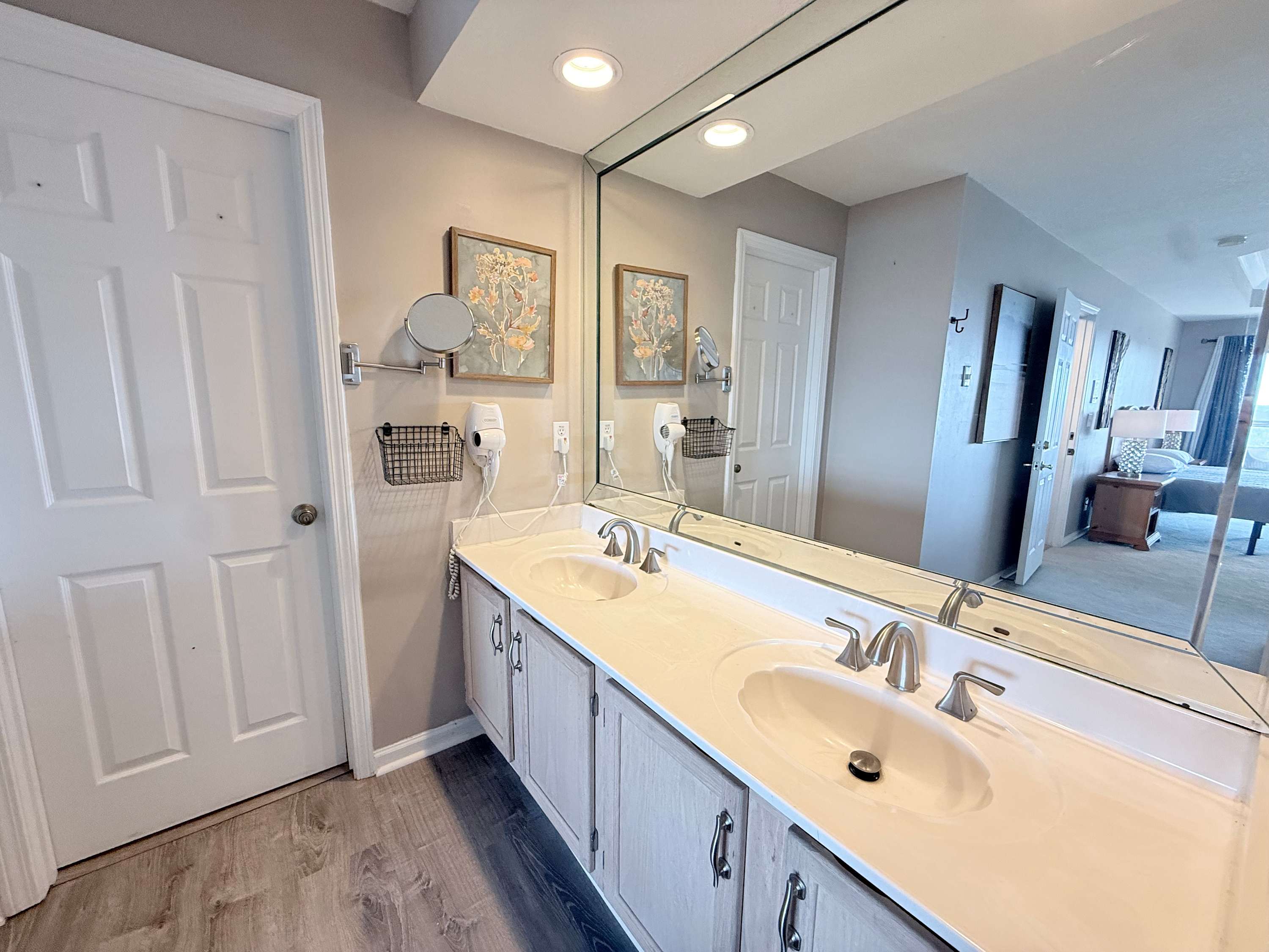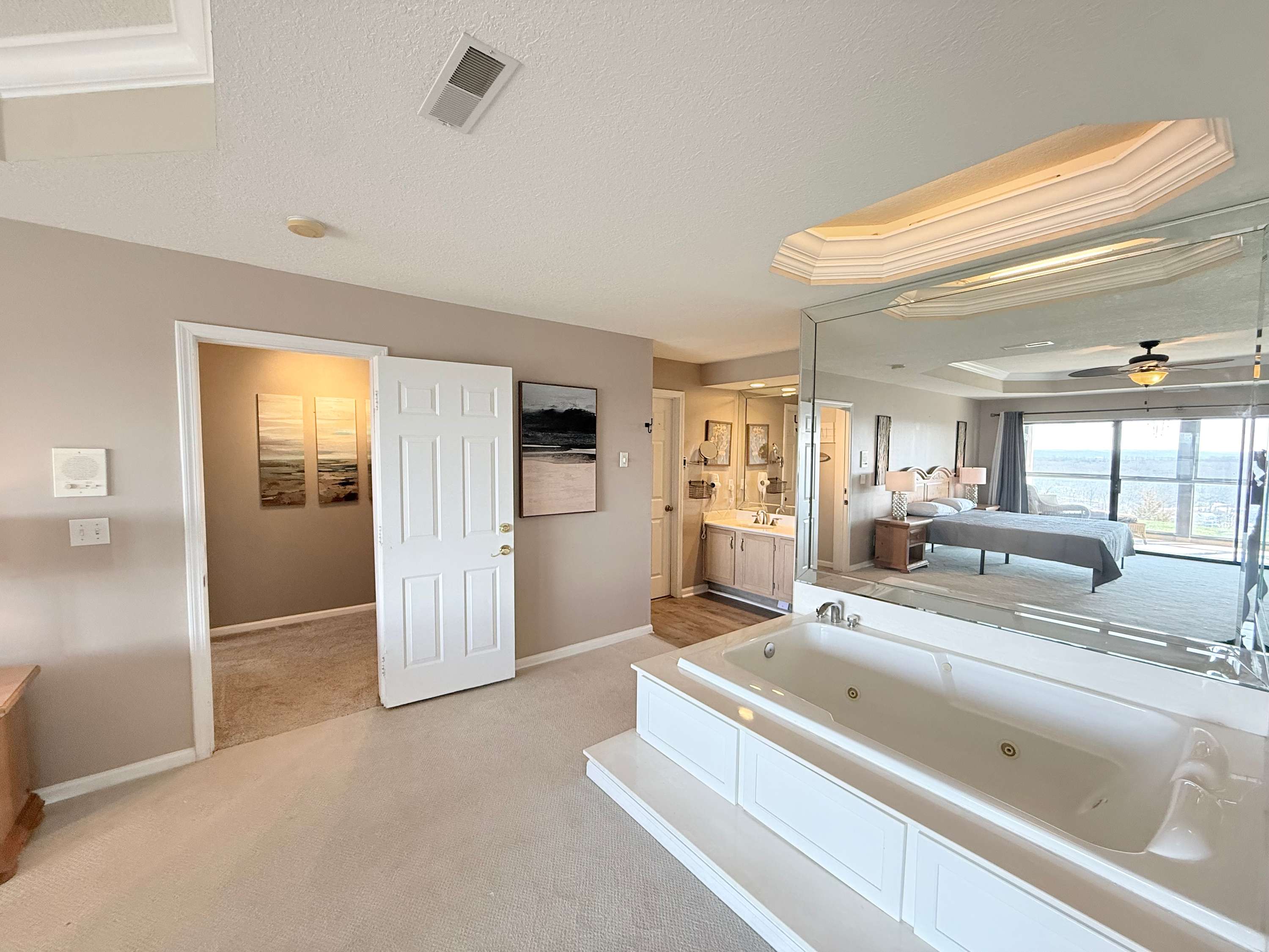 Bedroom #1 includes a king size bed, access to a private screened-in patio, and an ensuite bathroom with a dual vanity, a jetted tub, and a walk-in shower.