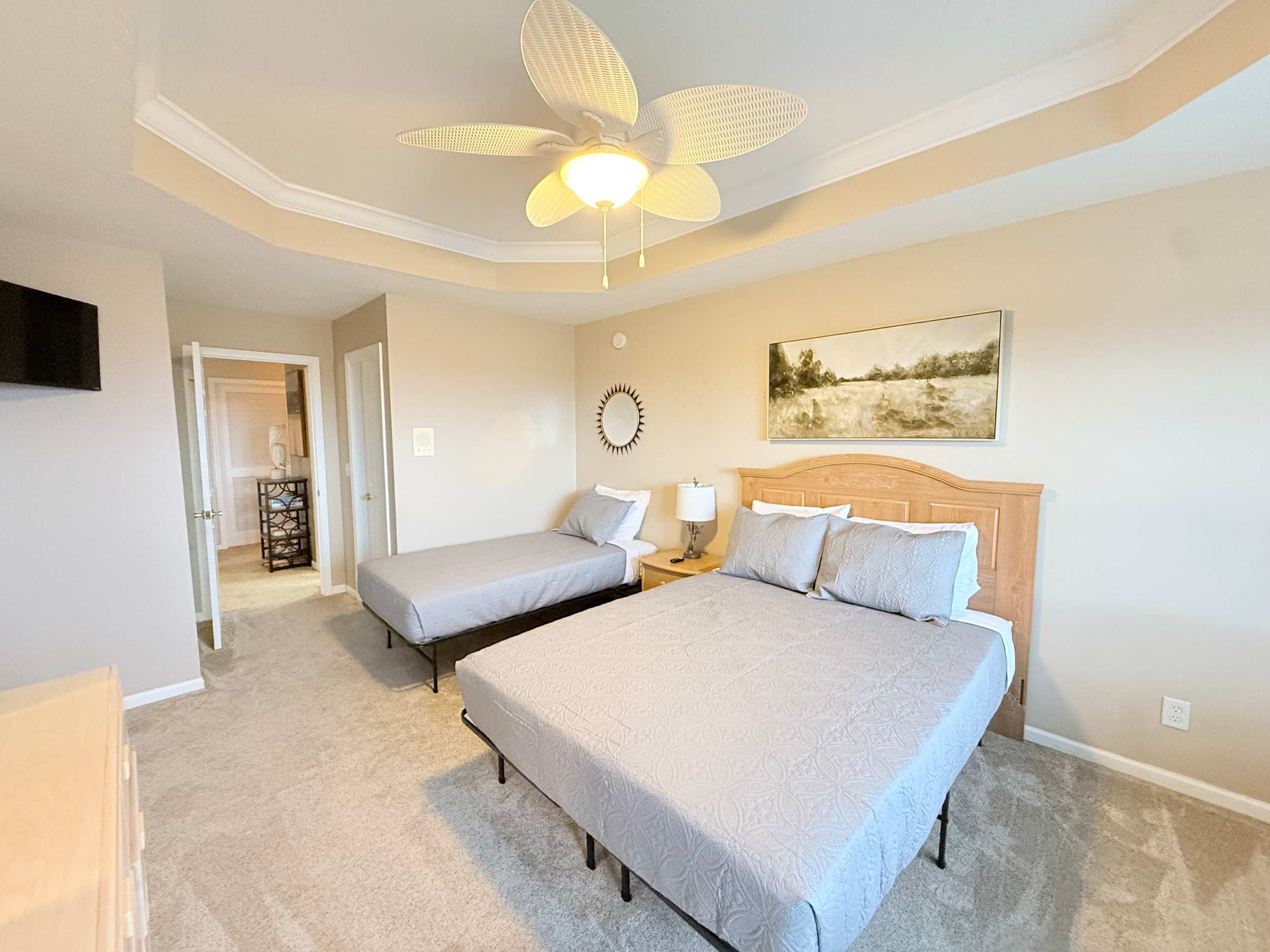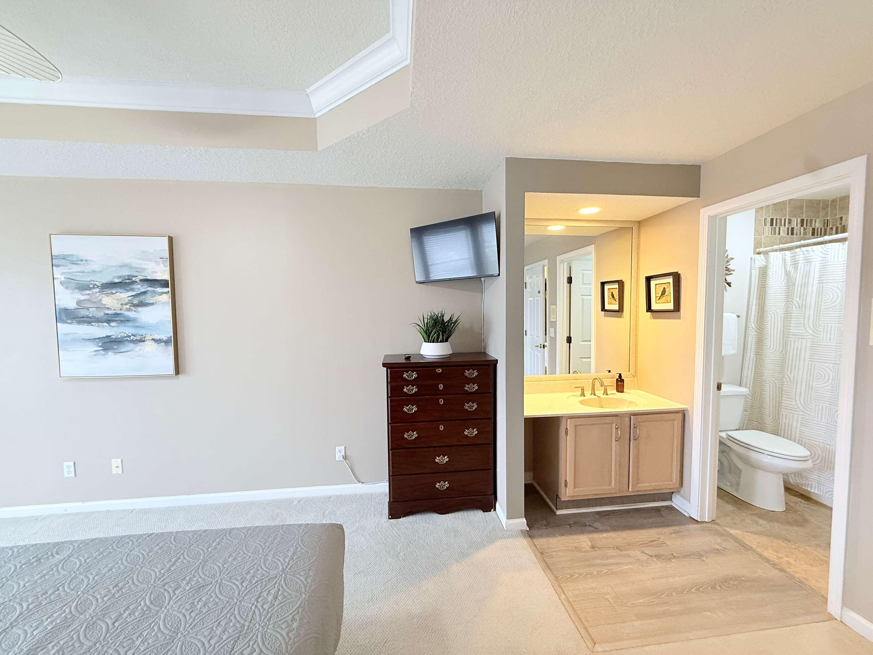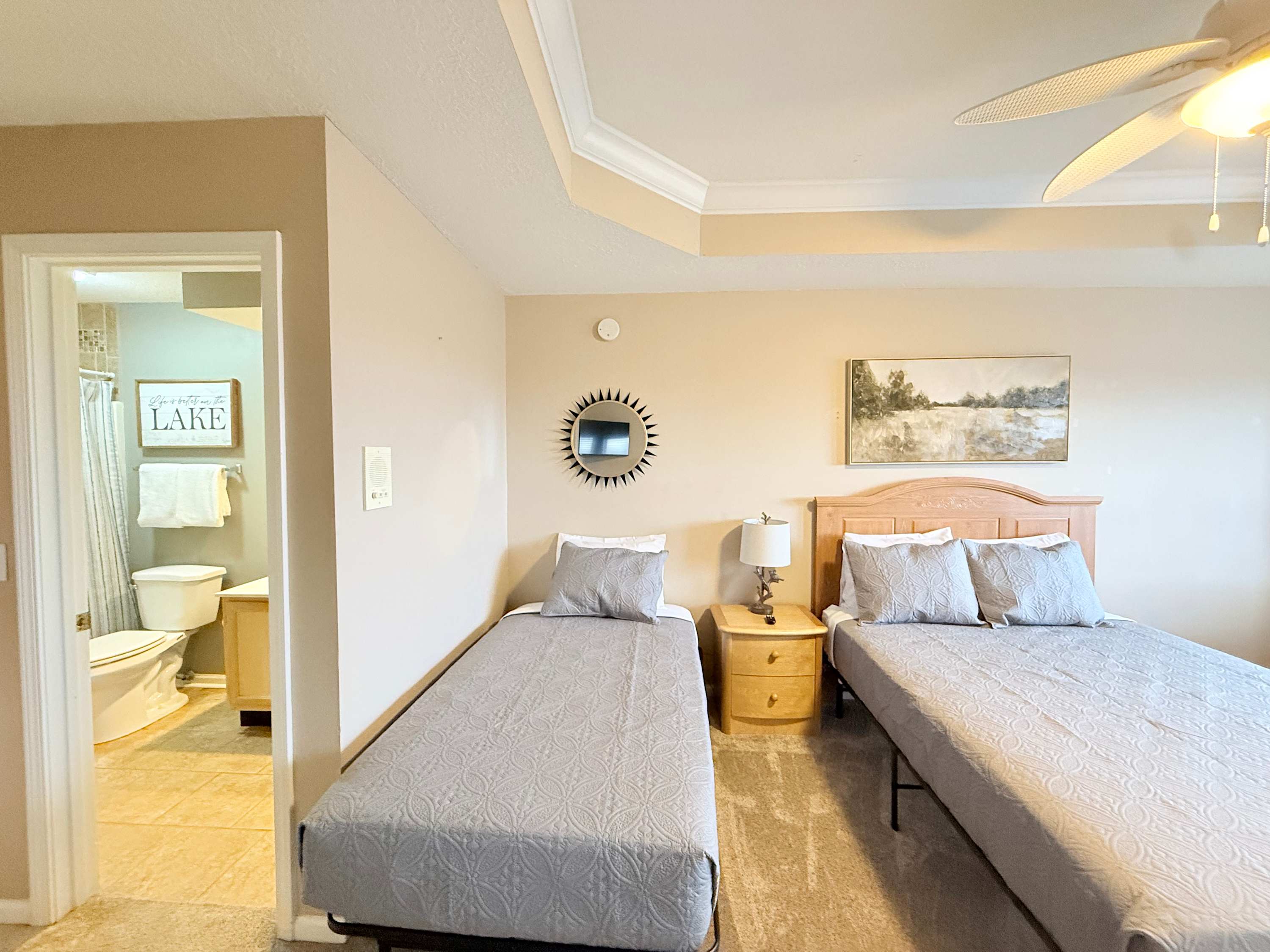 Bedroom #2 includes a queen size bed, a twin size bed, a smart TV, and an ensuite bathroom with single vanity and a shower/tub combo.