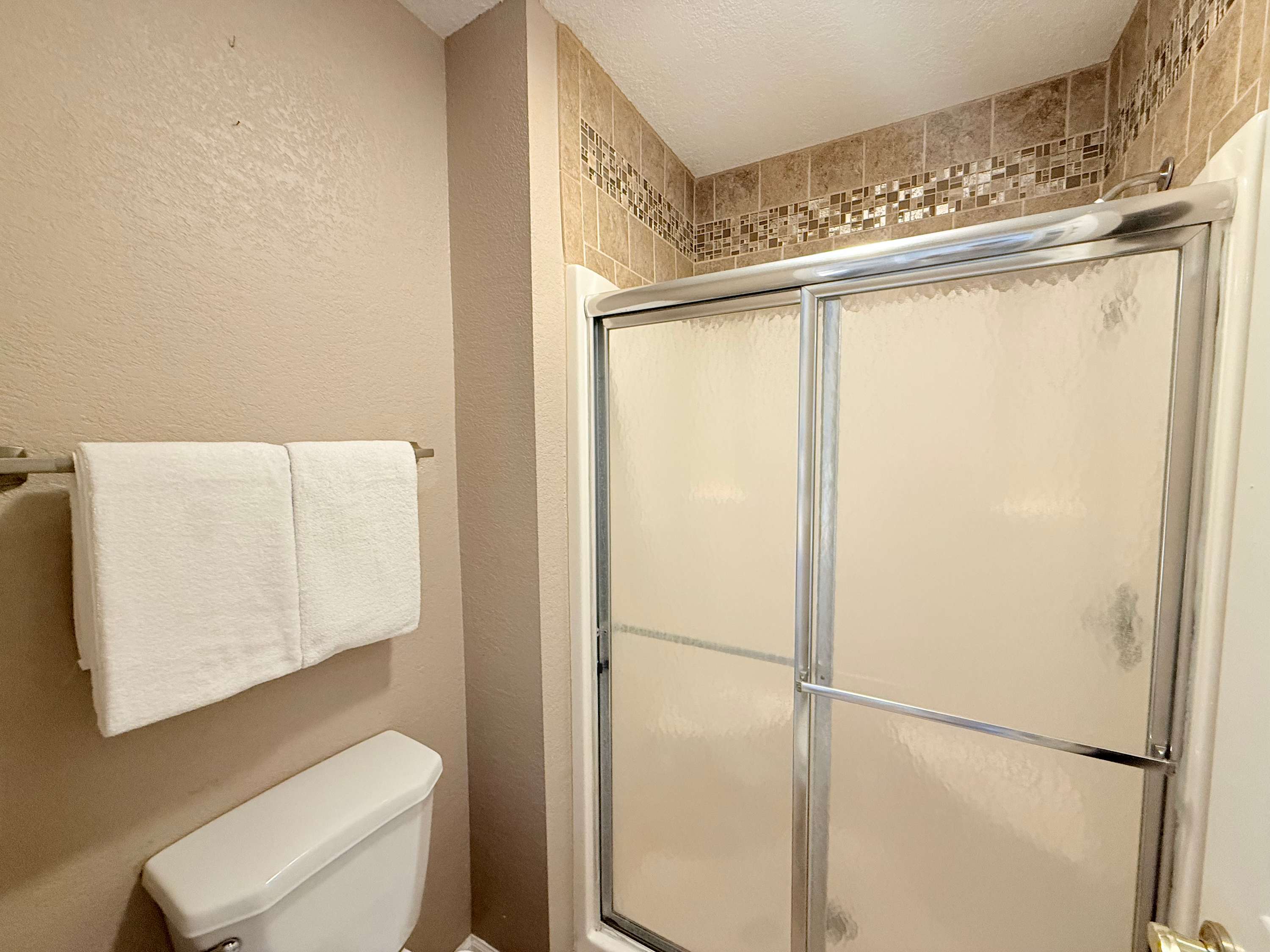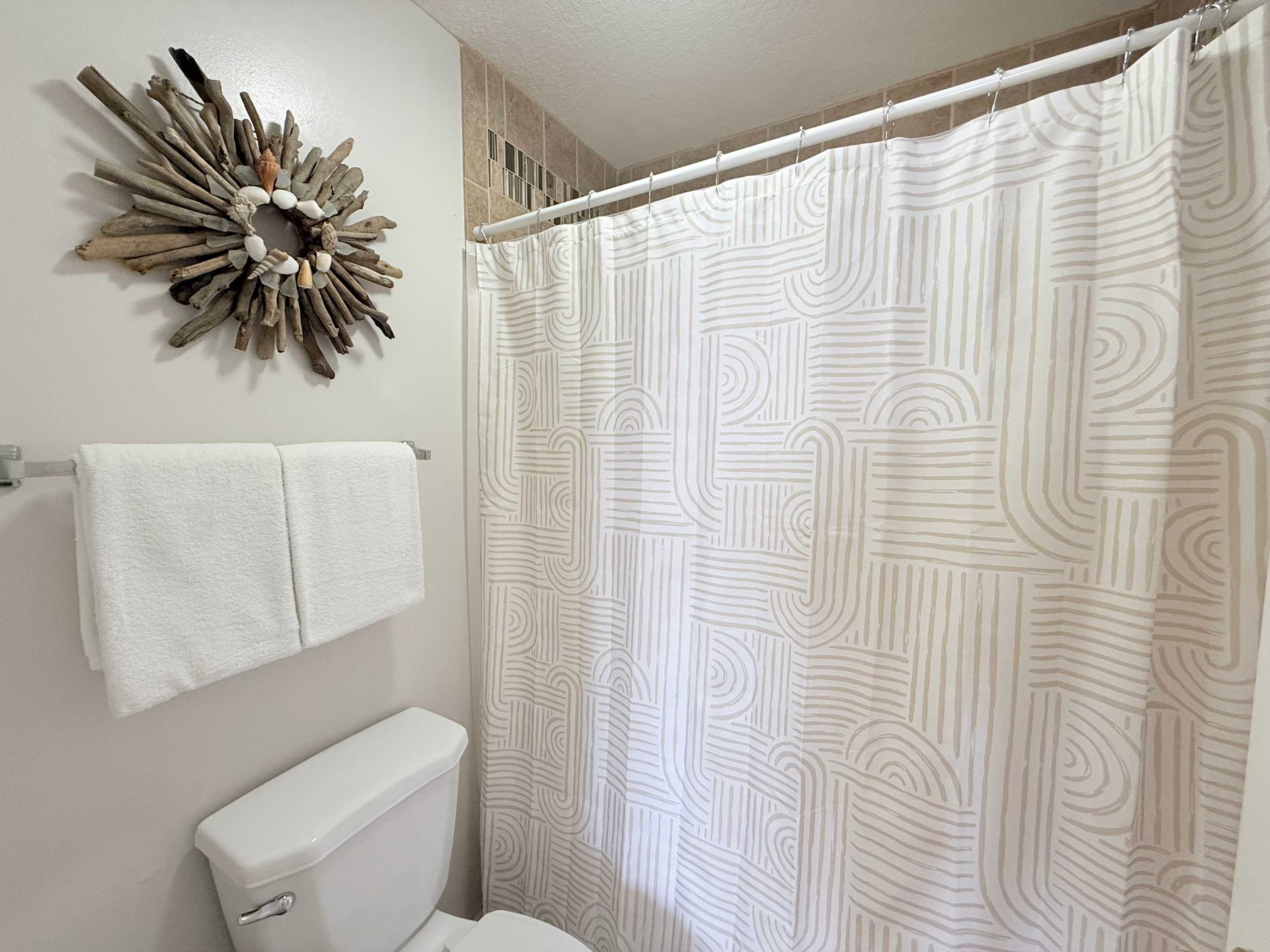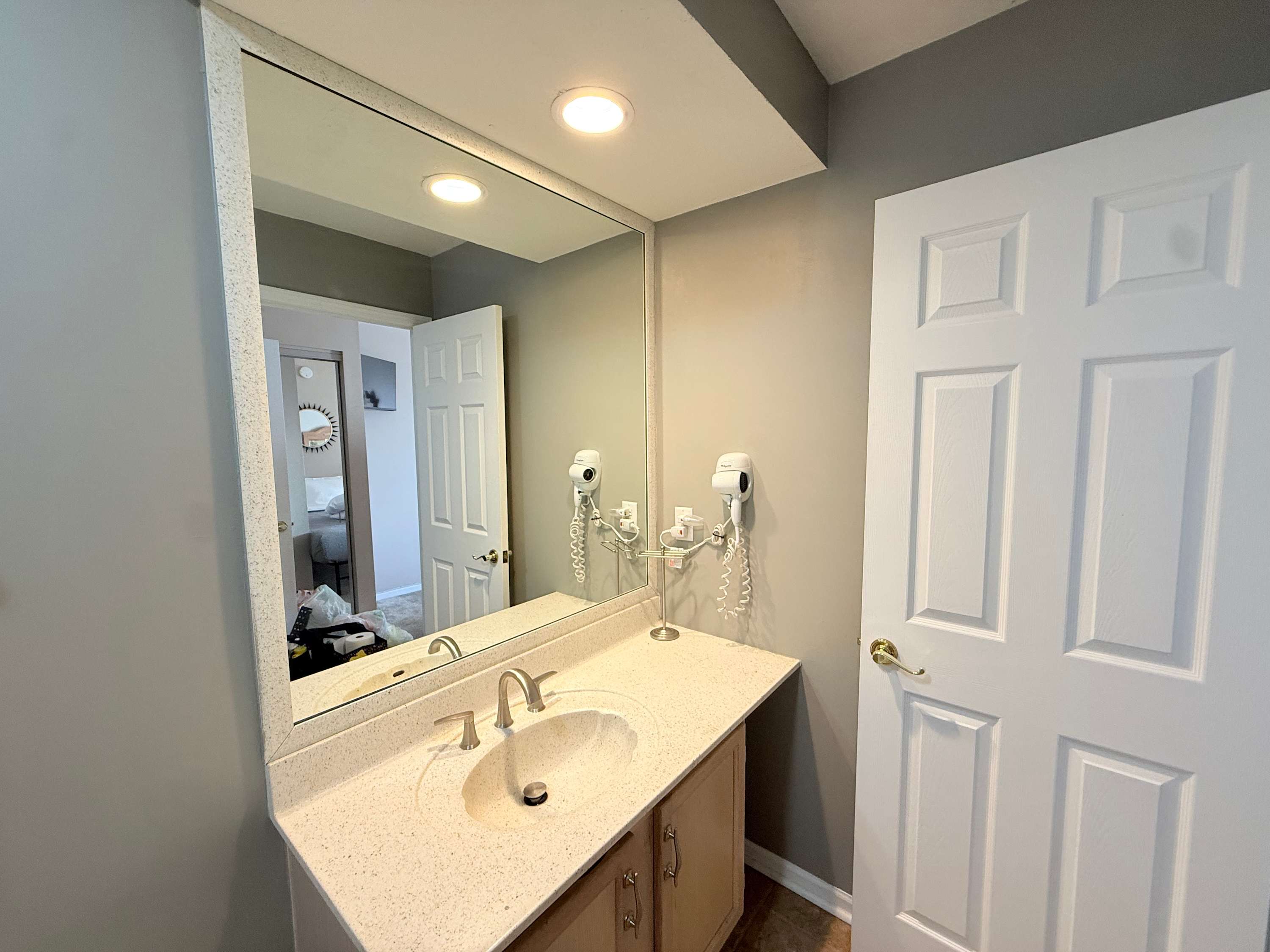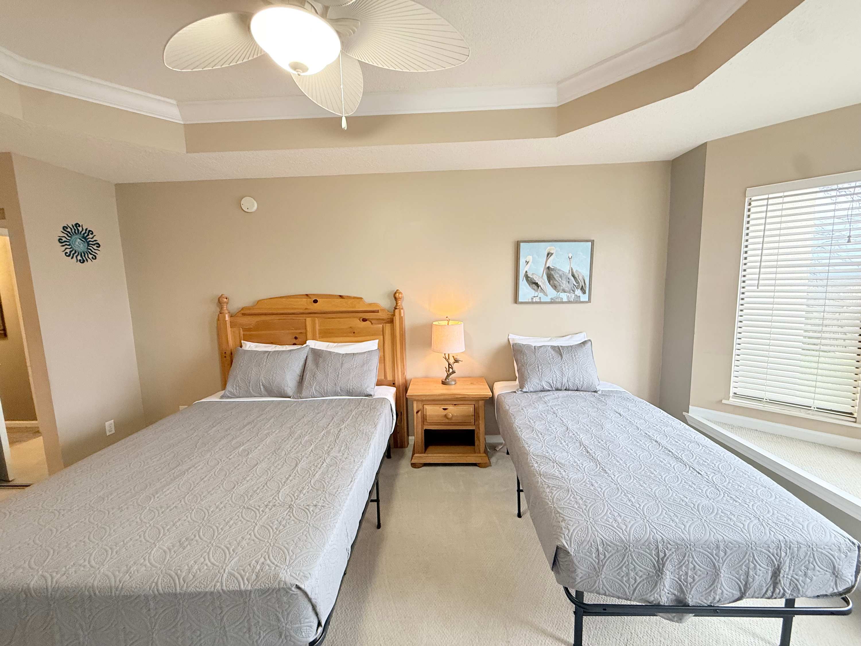 Bedroom #2 includes a queen size bed, a twin size bed, a smart TV, and an ensuite bathroom with single vanity and a shower/tub combo.