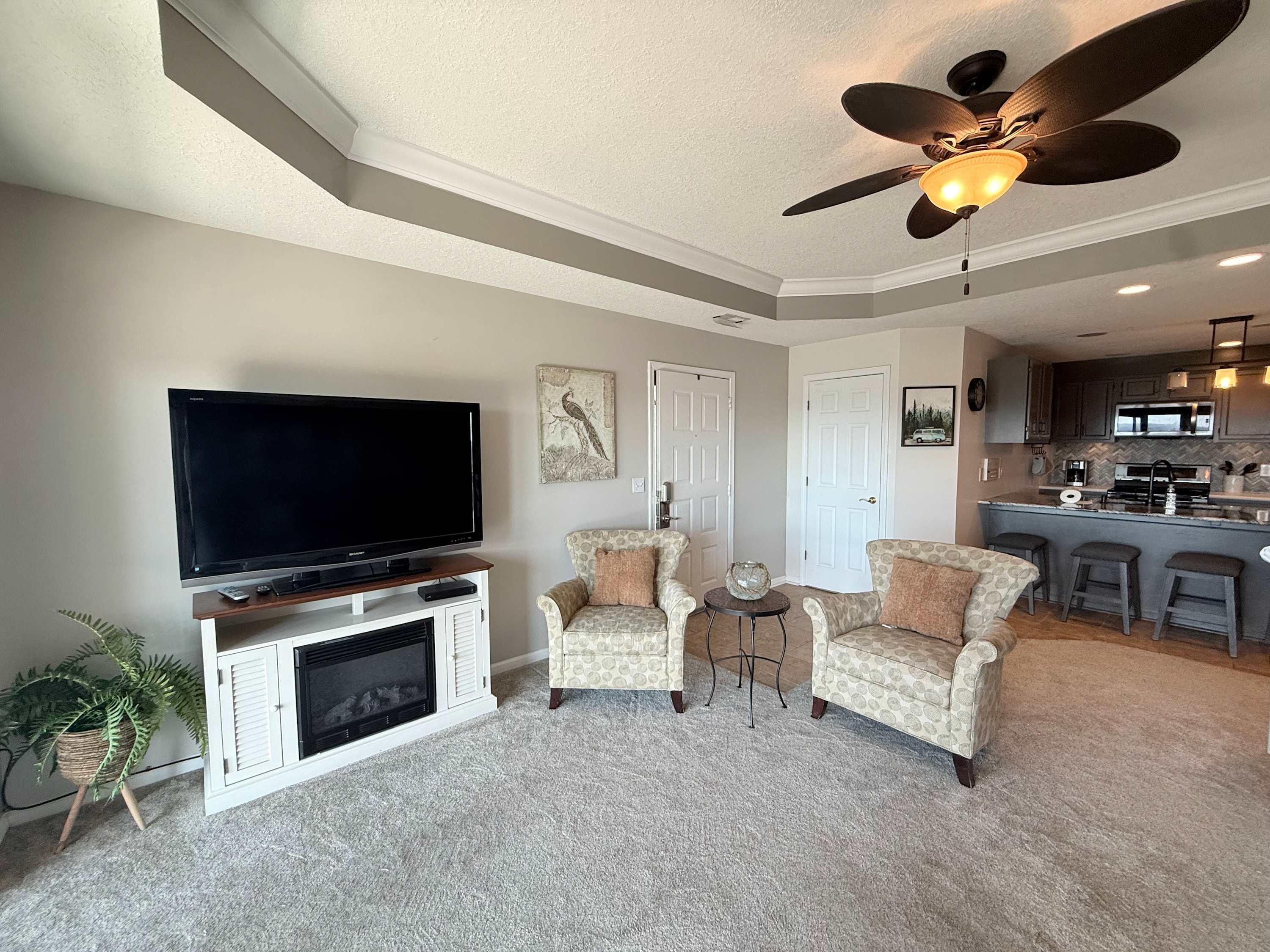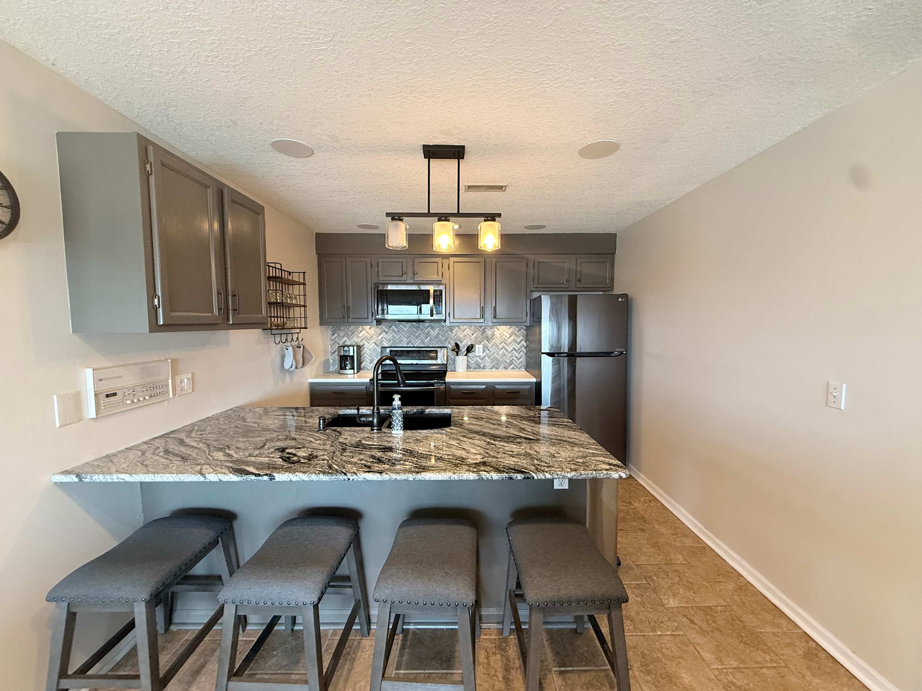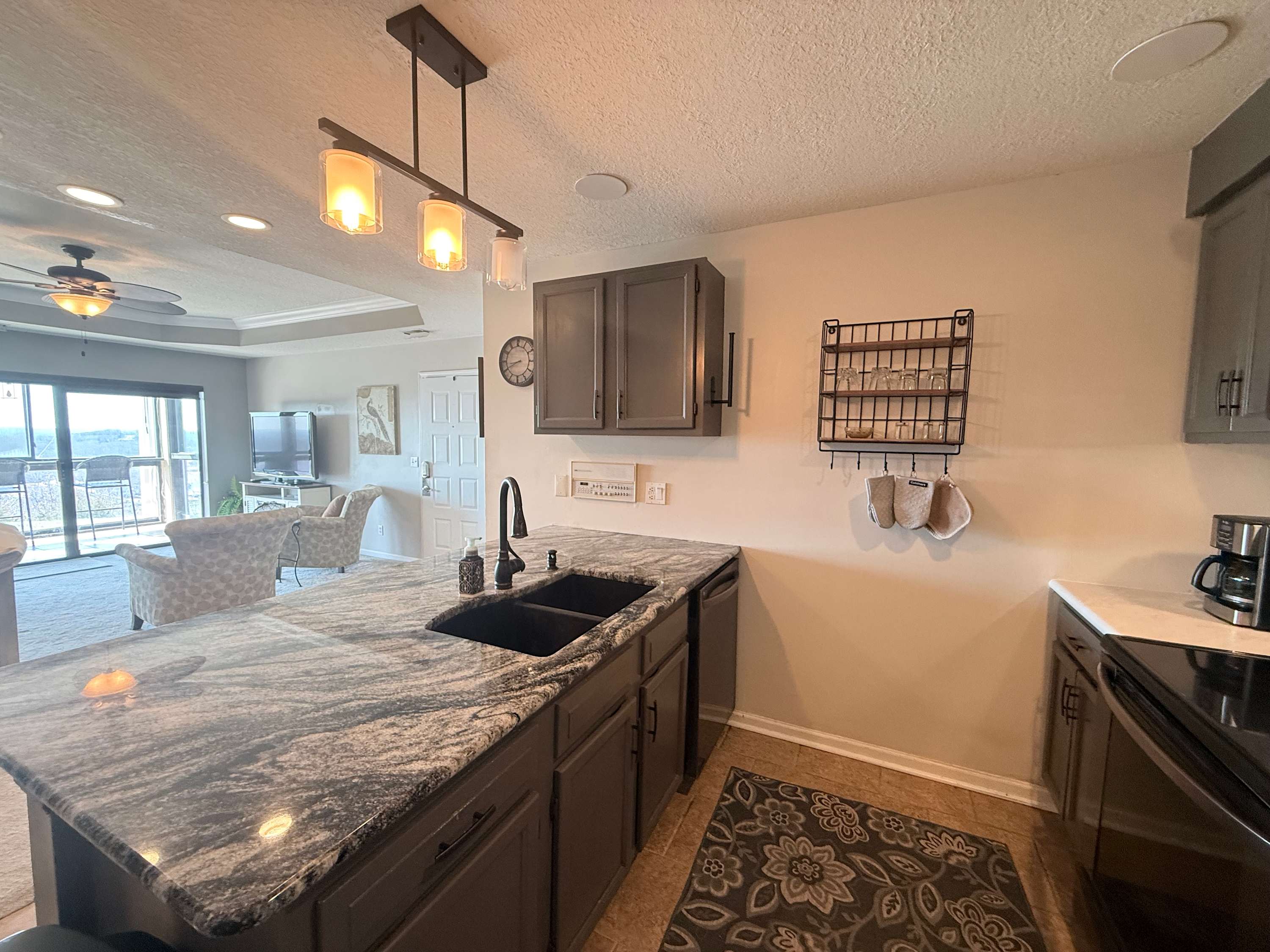Inside Sunset Ridge, the welcoming open layout makes it easy to settle right into vacation mode. The kitchen features beautiful stone counters, stainless steel appliances, and a breakfast bar with seating for four that opens effortlessly into the living area, creating a space where everyone can gather while meals are prepared. A dining table for four sits conveniently between the kitchen and living room, perfect for shared meals or planning the next day’s adventures. The cozy living room invites you to unwind with a couch, two armchairs, a warm fireplace, and cable TV for relaxing evenings indoors. Just beyond, the screened-in patio becomes a highlight of the home—an inviting spot to dine al fresco while taking in serene, tree-lined water views that make every sunset feel like a private lakeside show.