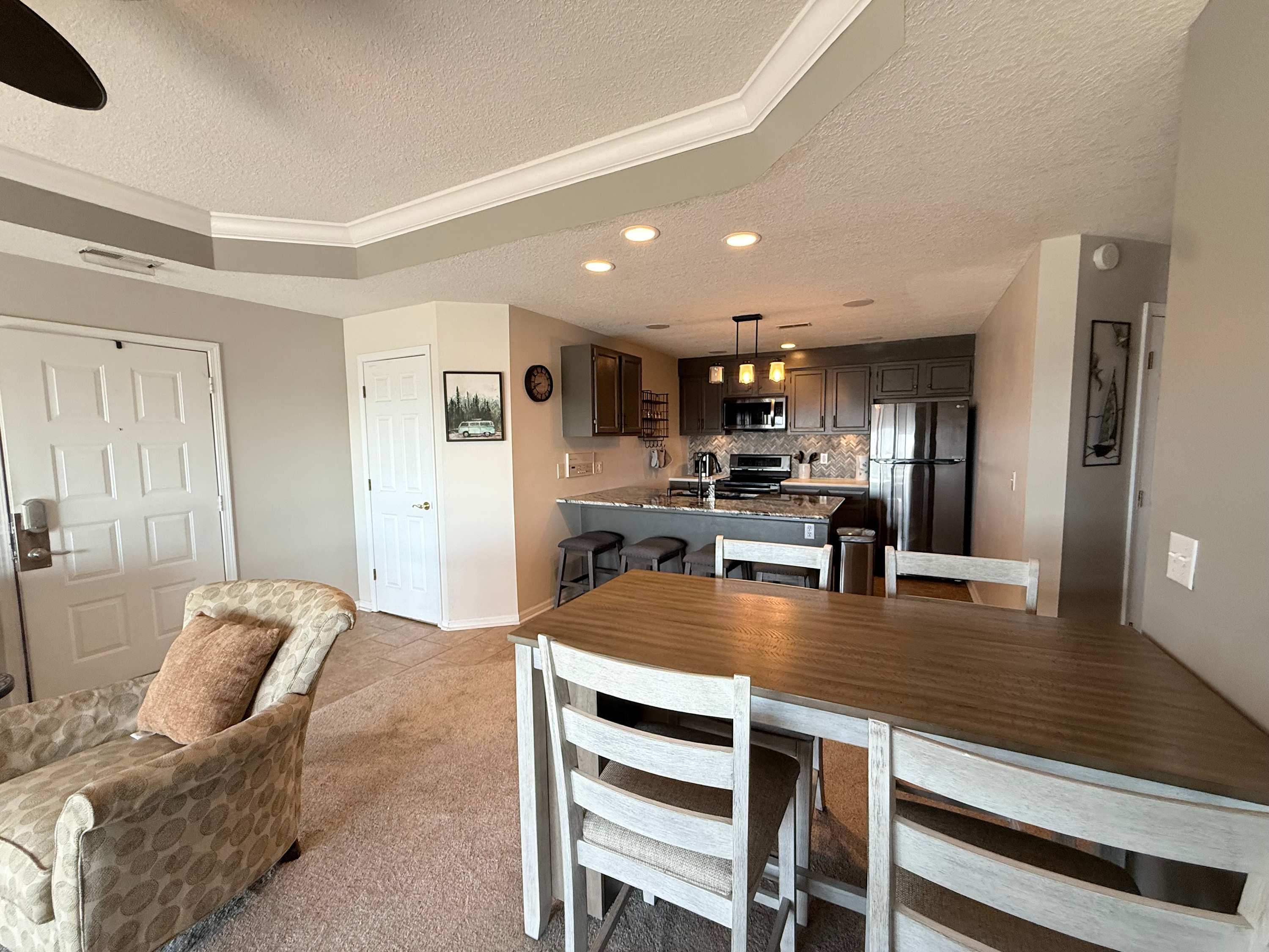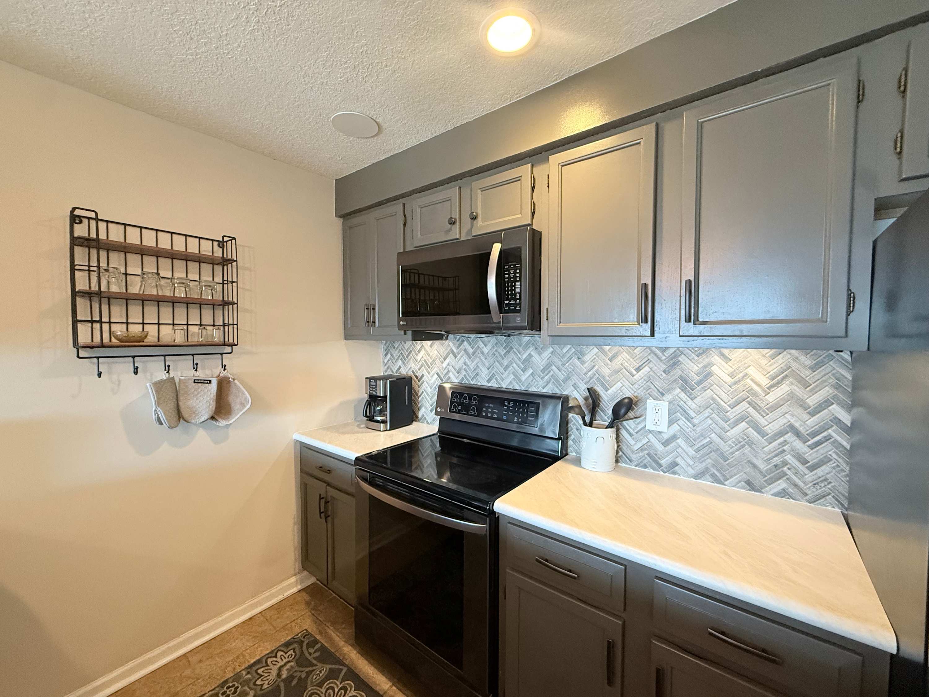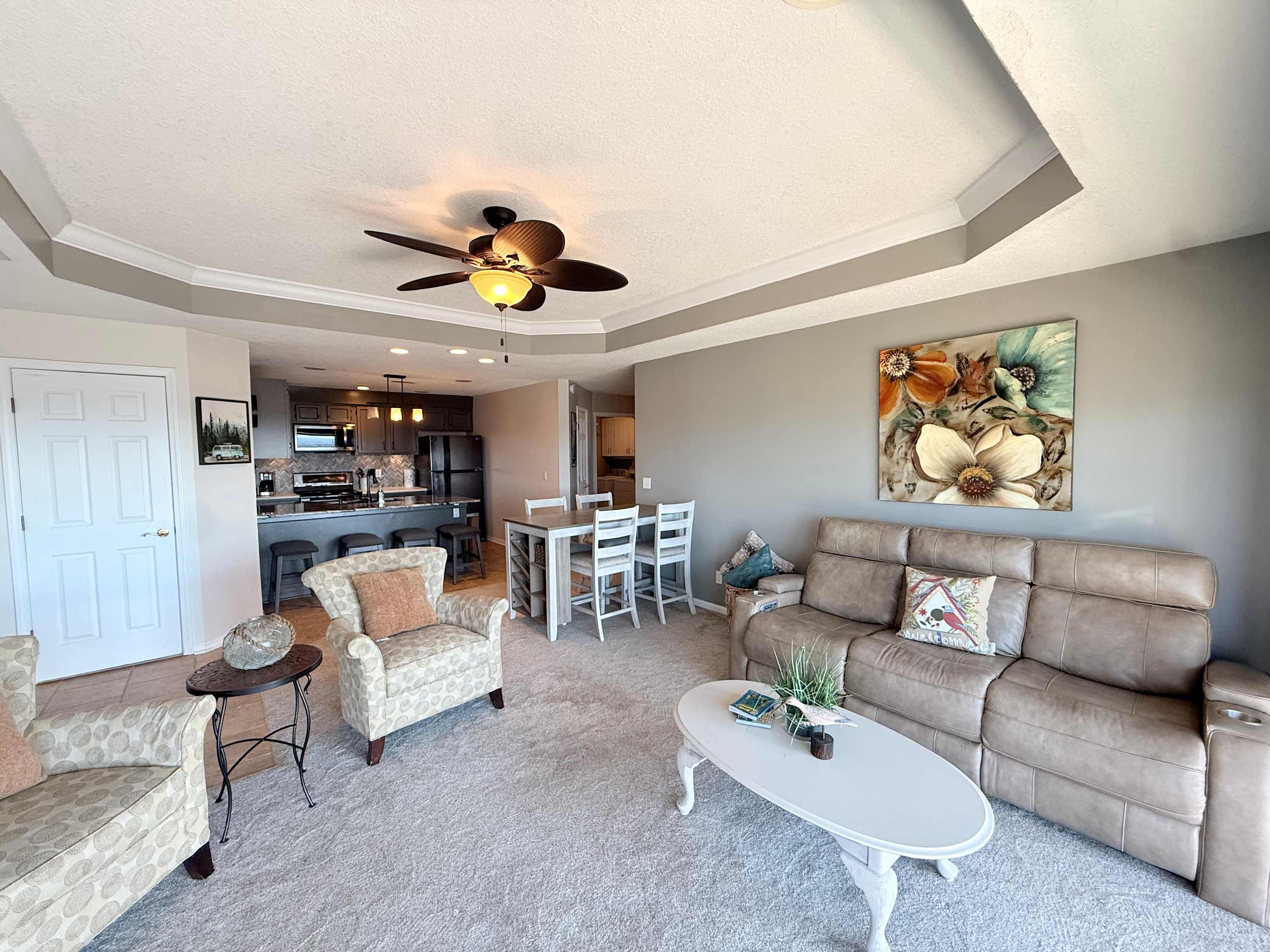 Inside Sunset Ridge, the welcoming open layout makes it easy to settle right into vacation mode. The kitchen features beautiful stone counters, stainless steel appliances, and a breakfast bar with seating for four that opens effortlessly into the living area, creating a space where everyone can gather while meals are prepared. A dining table for four sits conveniently between the kitchen and living room, perfect for shared meals or planning the next day’s adventures. The cozy living room invites you to unwind with a couch, two armchairs, a warm fireplace, and cable TV for relaxing evenings indoors. Just beyond, the screened-in patio becomes a highlight of the home—an inviting spot to dine al fresco while taking in serene, tree-lined water views that make every sunset feel like a private lakeside show.