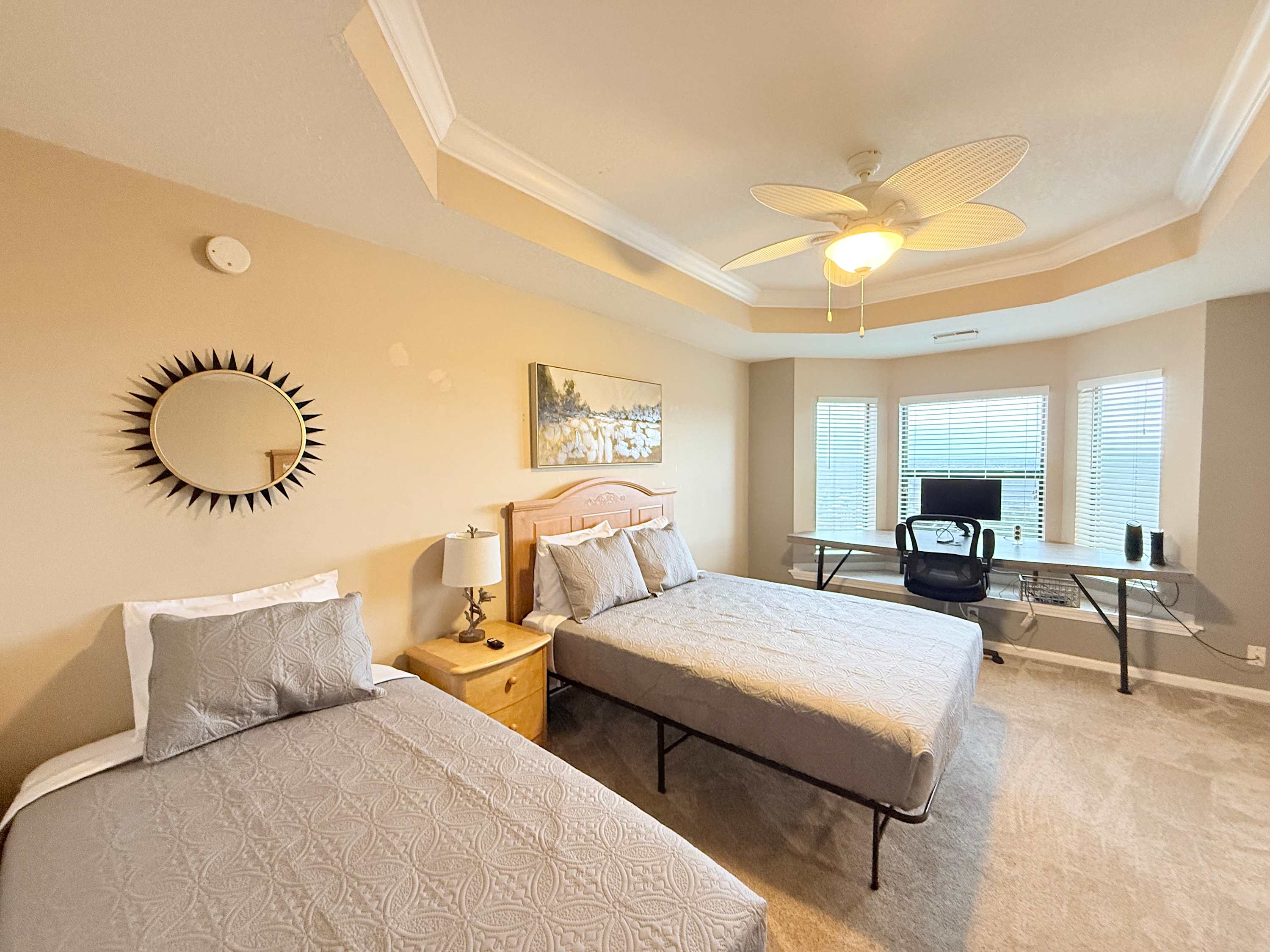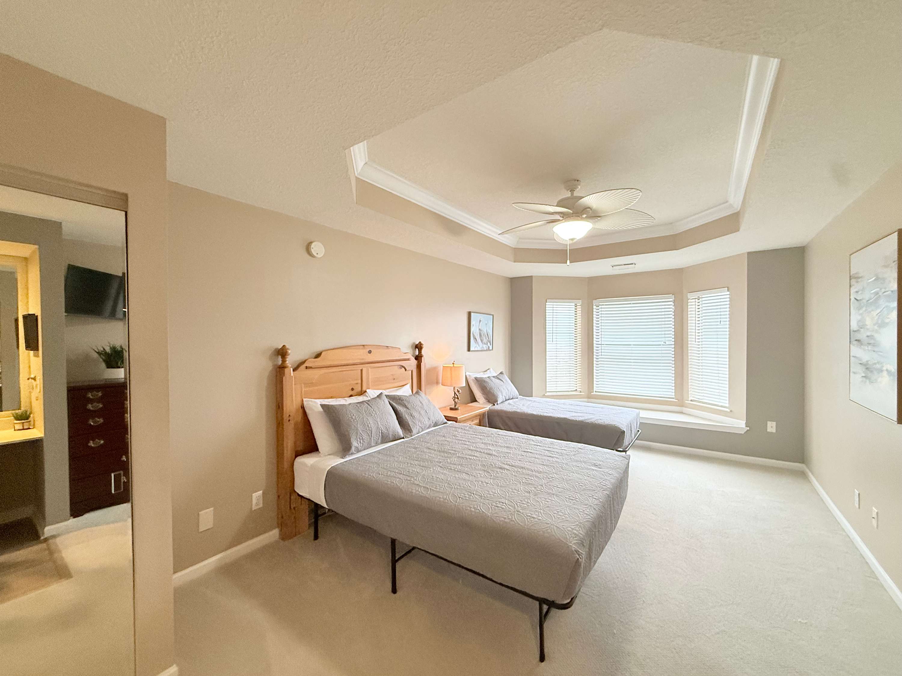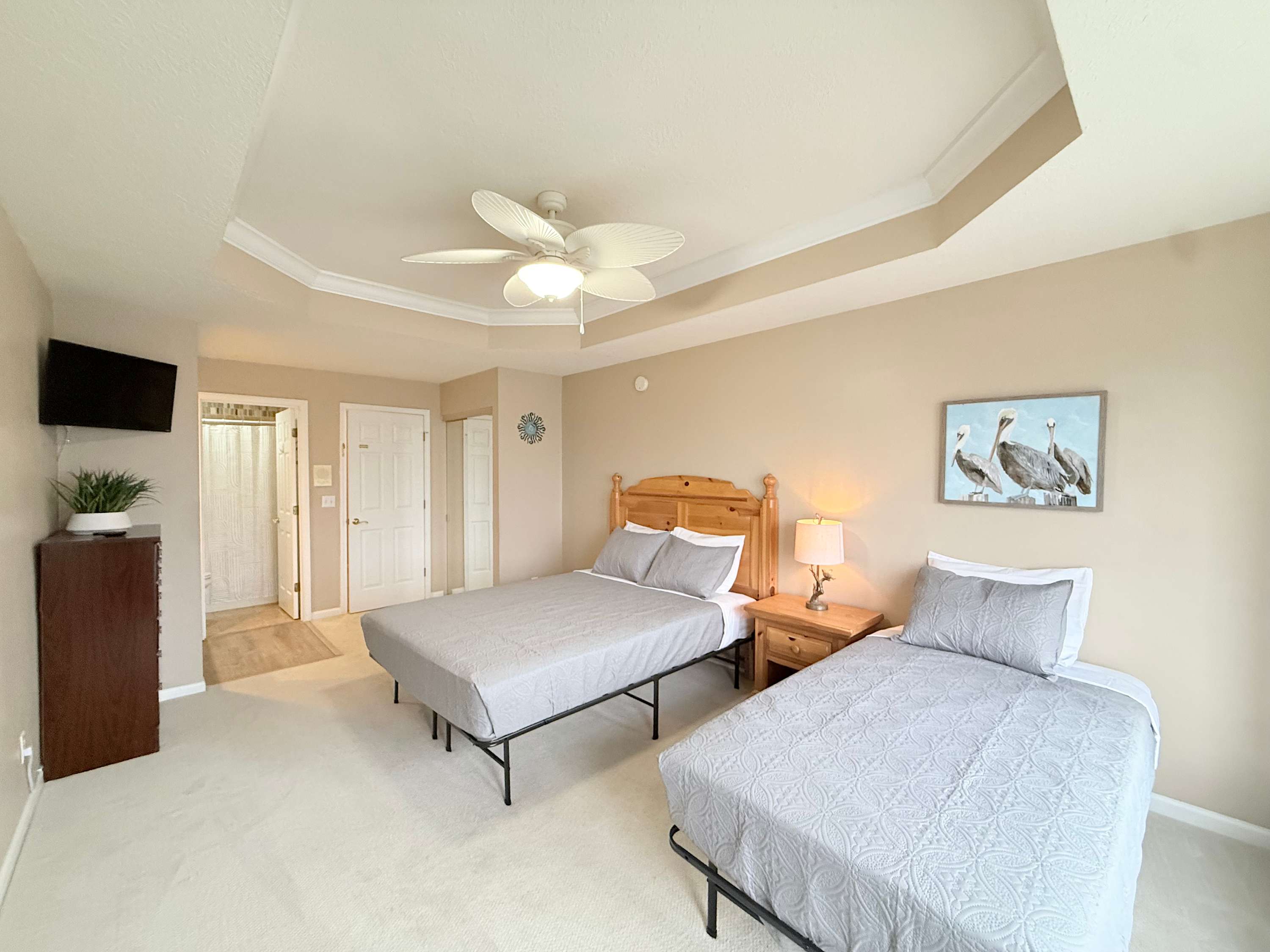 Bedroom #3 includes a queen size bed, a twin size bed, a smart TV, and an ensuite bathroom with a single vanity and a shower/tub combo, also accessible via the hallway.