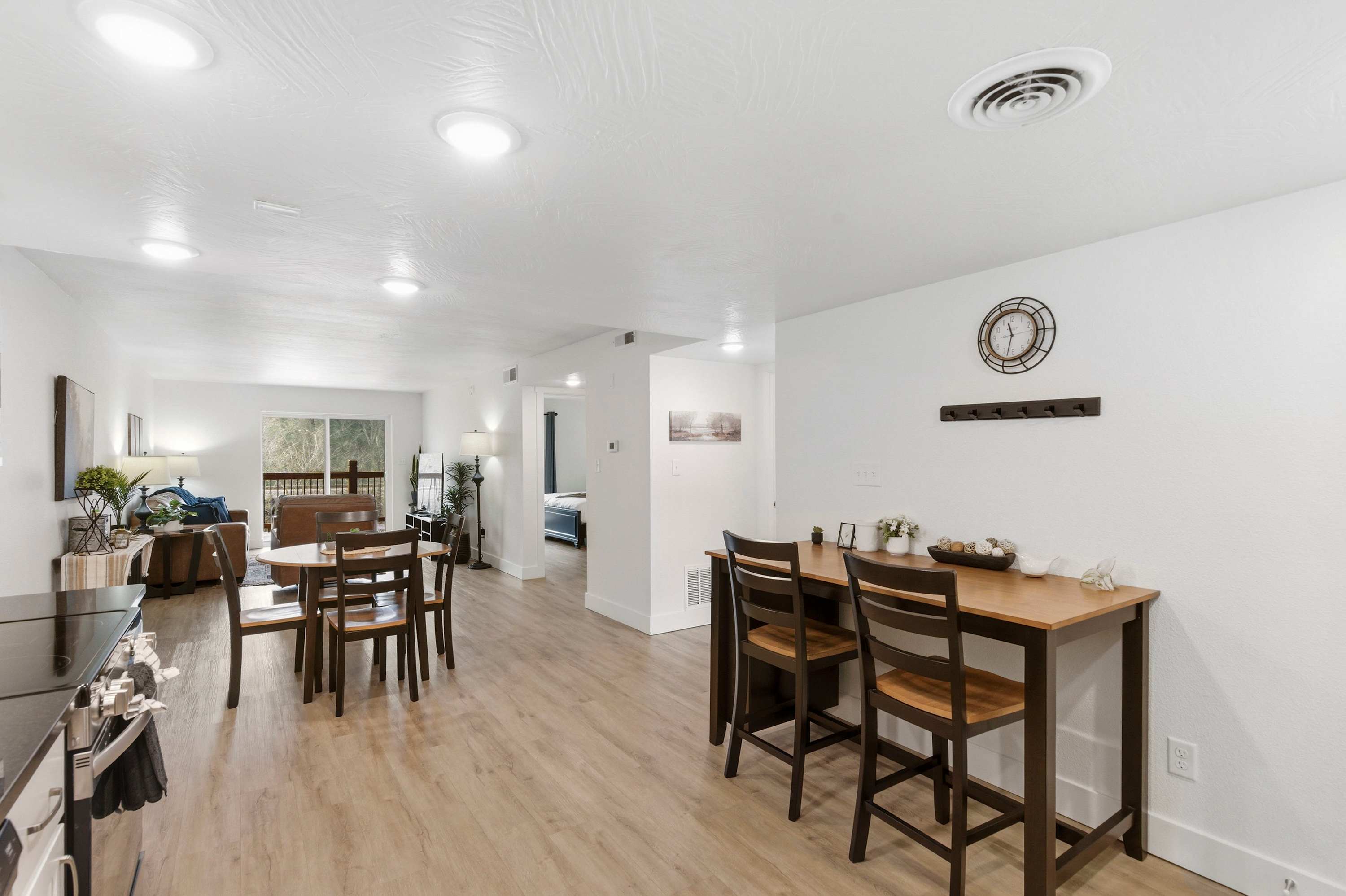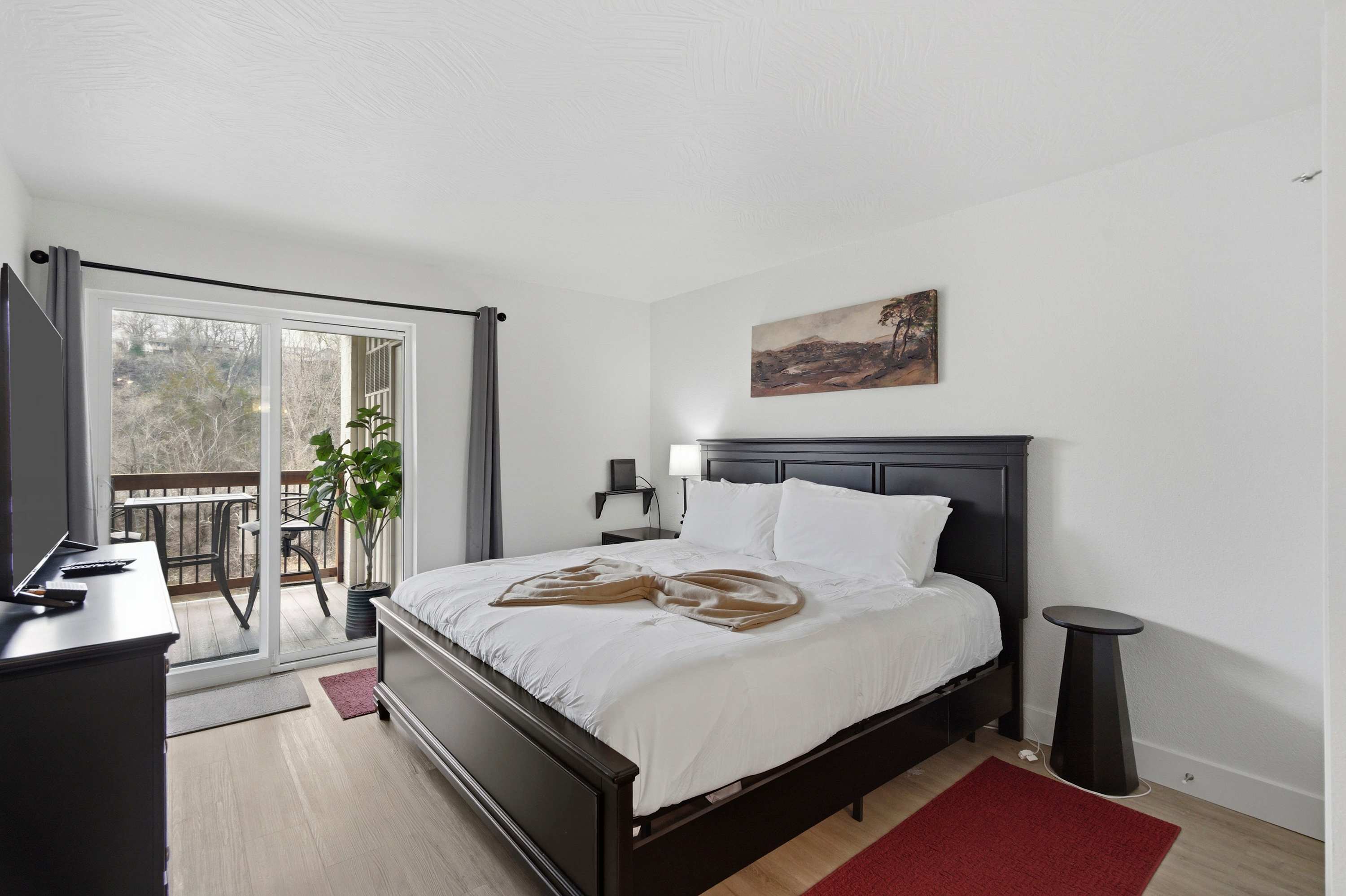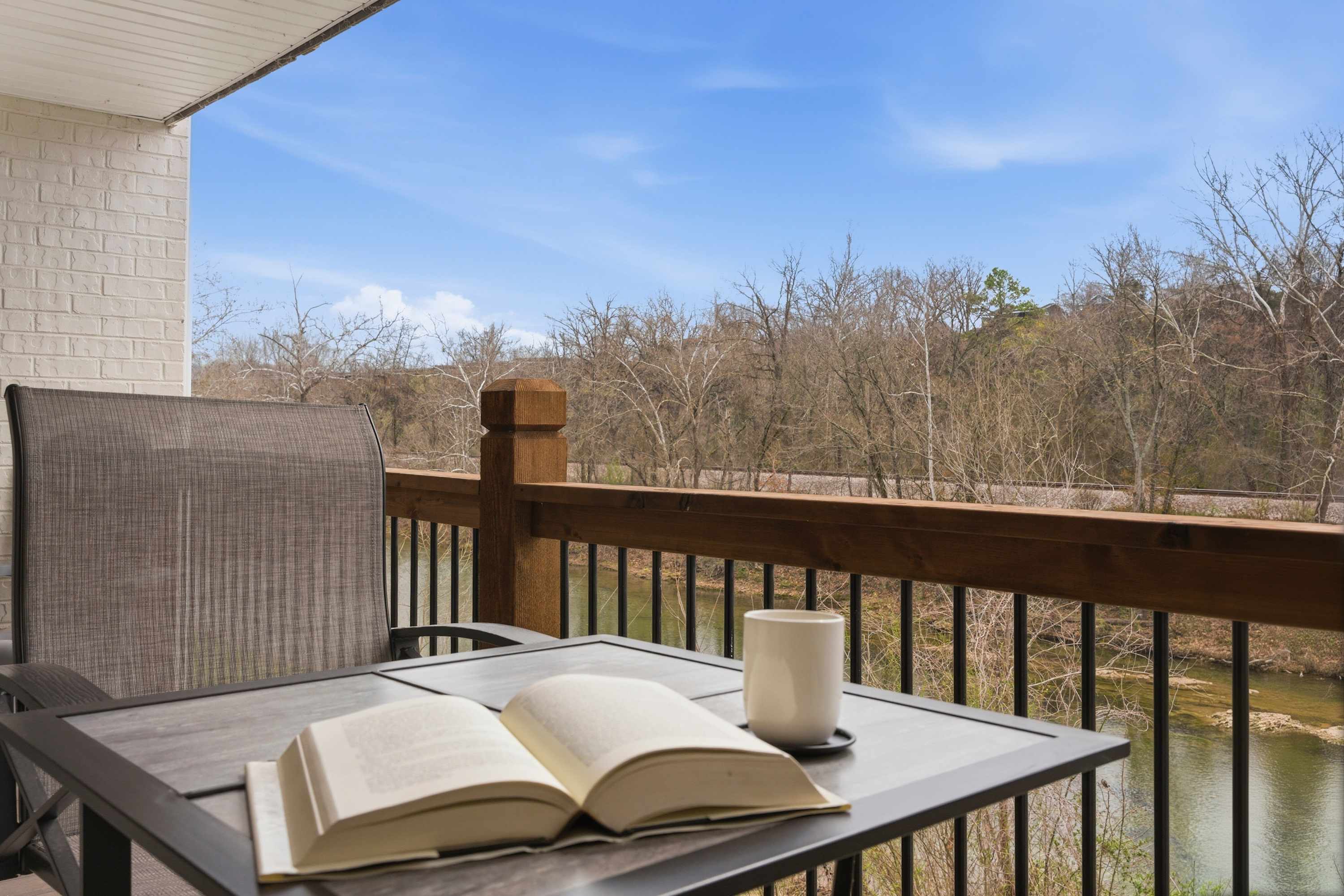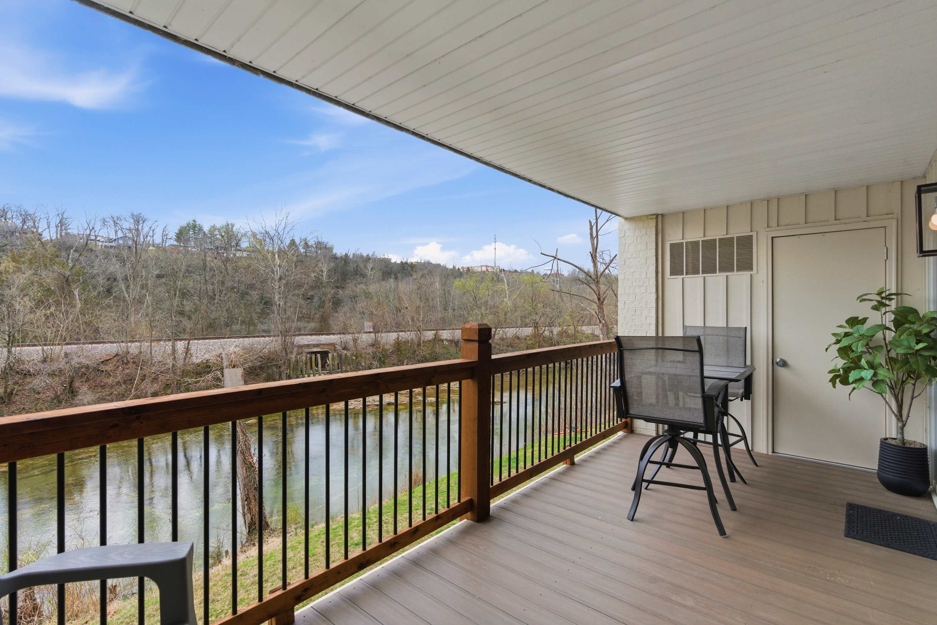 Inside Serene Creek Condo, a welcoming open layout invites you to settle right into vacation mode. The kitchen features sleek black stone countertops, stainless steel appliances, and a cozy bar table with seating for two—perfect for morning coffee or a quick bite before heading out for the day. A dining table for four sits nearby for shared meals or a relaxed game night. The living room offers a comfortable place to gather with a smart TV, a plush couch, and two chairs arranged for easy conversation or movie nights. Step outside onto the private deck and you’ll find one of the condo’s most charming features—a table for two set beside the gently flowing creek, creating the perfect spot for quiet morning coffee or a peaceful evening drink surrounded by nature.