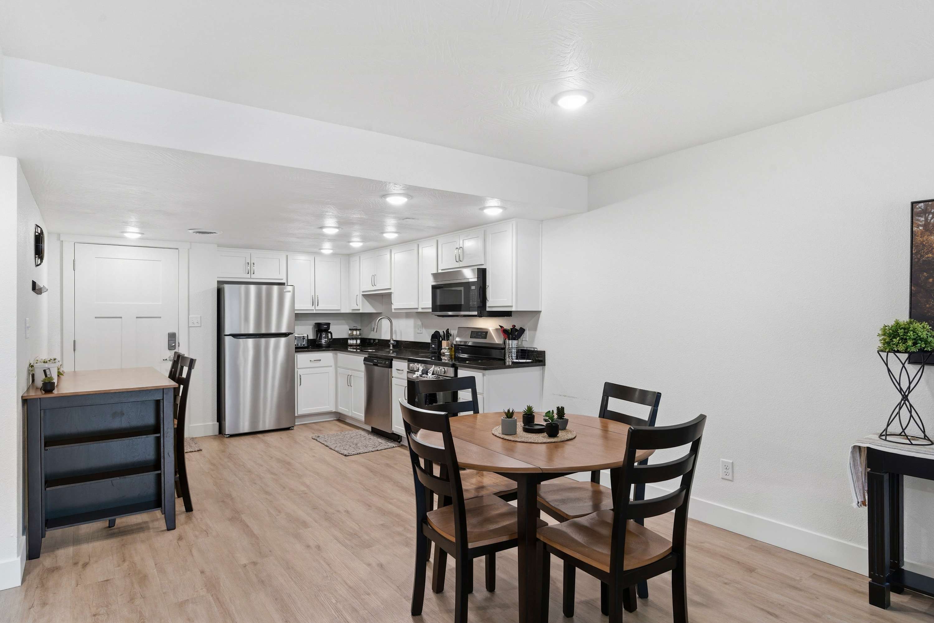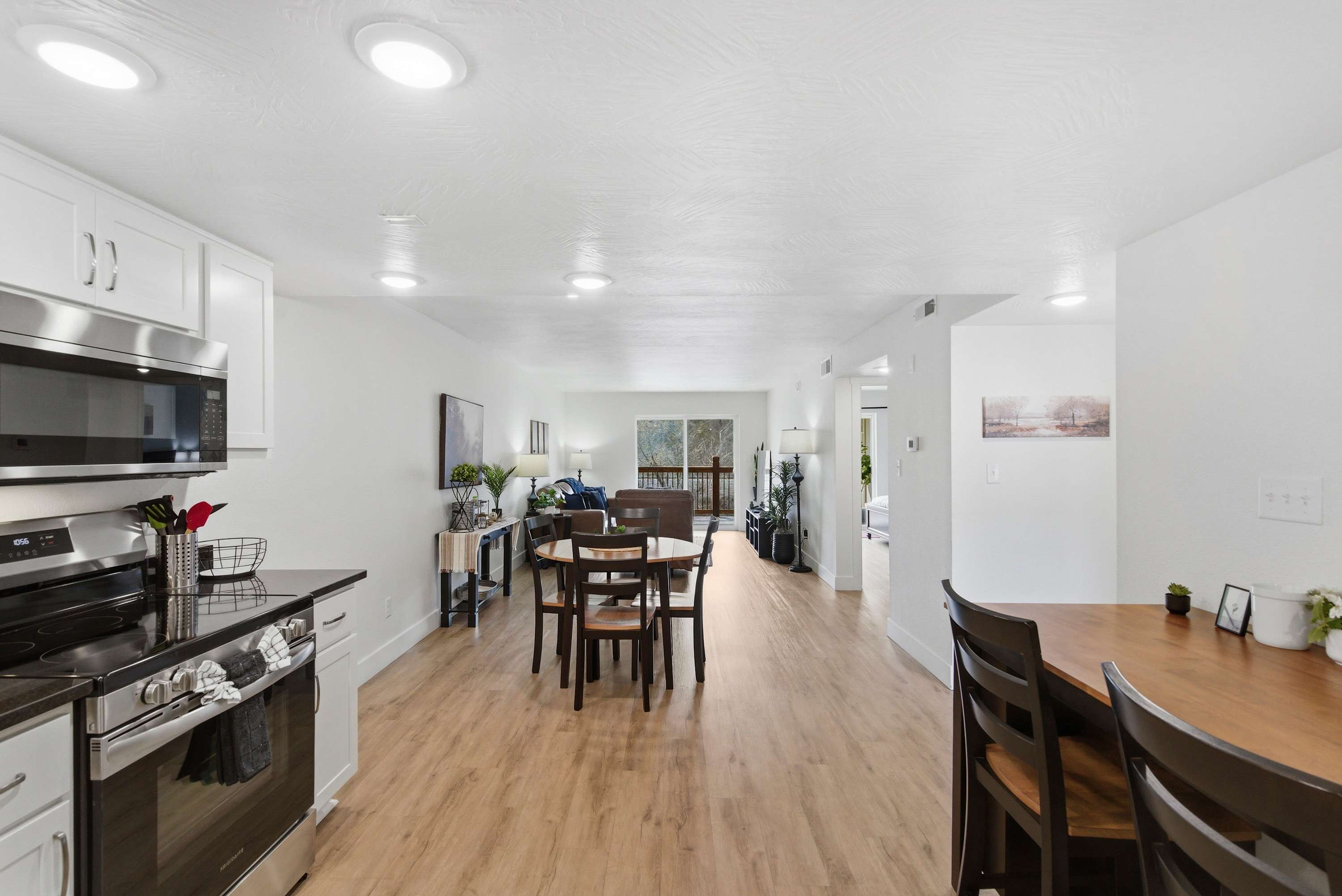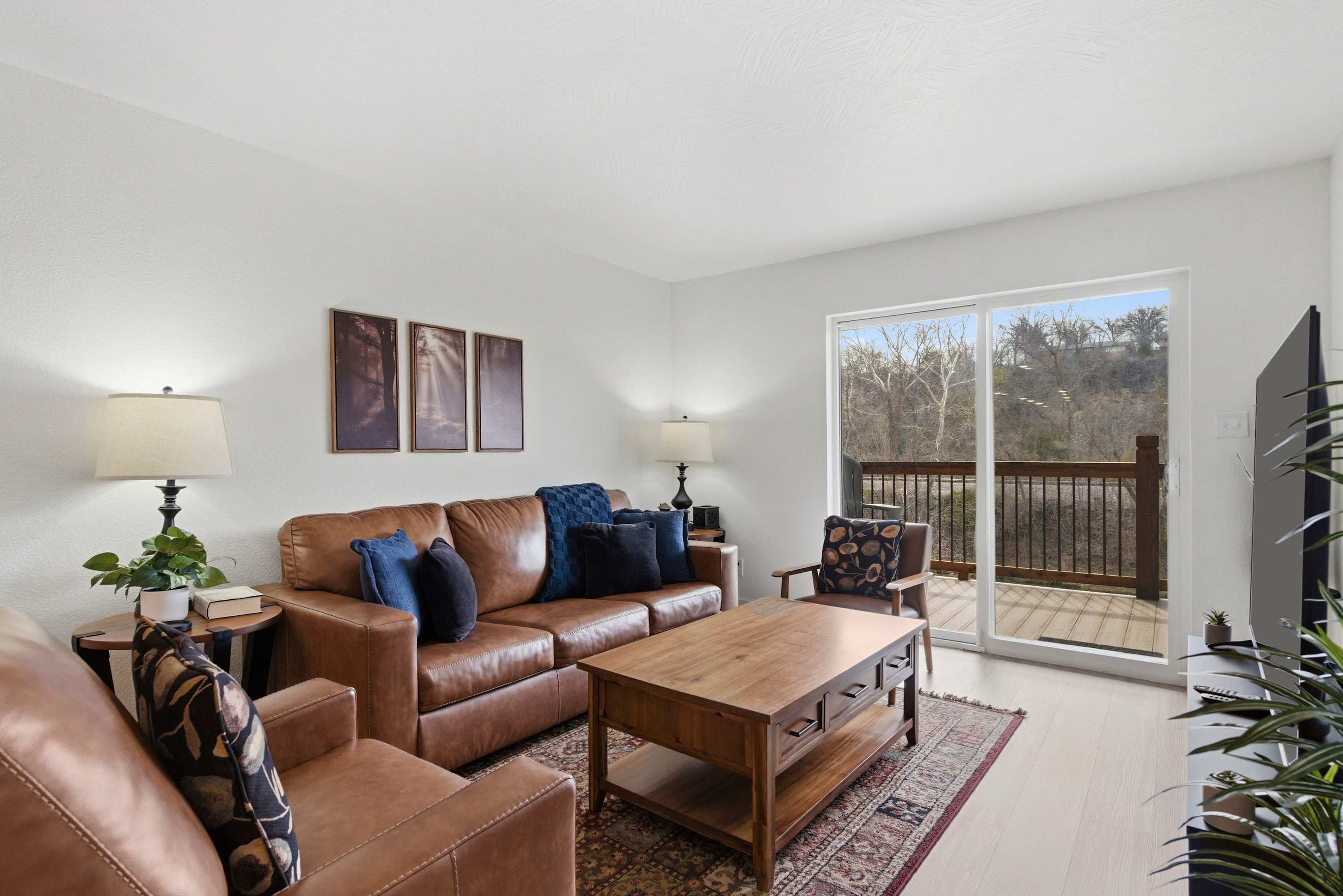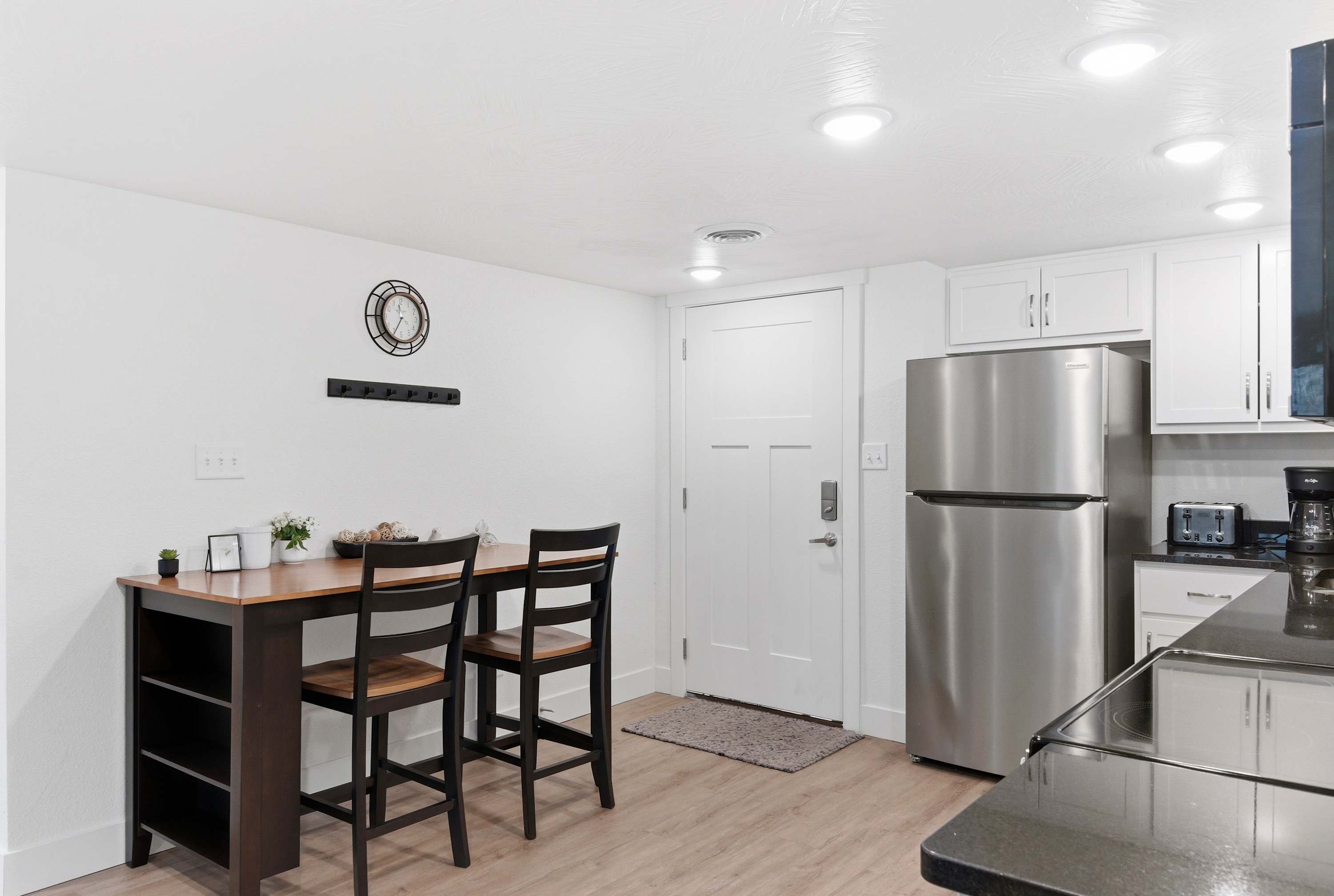 Inside Serene Creek Condo, a welcoming open layout invites you to settle right into vacation mode. The kitchen features sleek black stone countertops, stainless steel appliances, and a cozy bar table with seating for two—perfect for morning coffee or a quick bite before heading out for the day. A dining table for four sits nearby for shared meals or a relaxed game night. The living room offers a comfortable place to gather with a smart TV, a plush couch, and two chairs arranged for easy conversation or movie nights. Step outside onto the private deck and you’ll find one of the condo’s most charming features—a table for two set beside the gently flowing creek, creating the perfect spot for quiet morning coffee or a peaceful evening drink surrounded by nature.