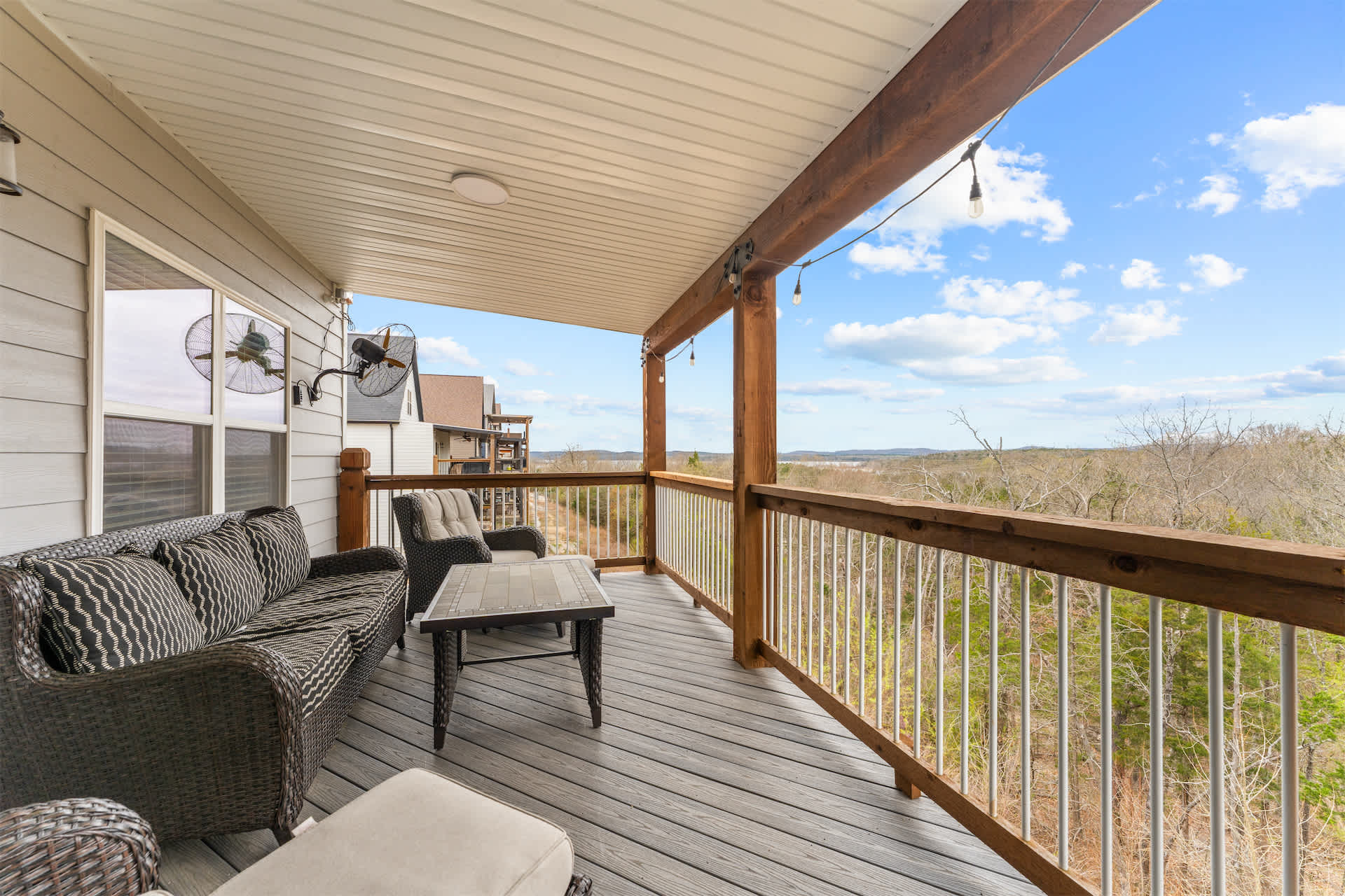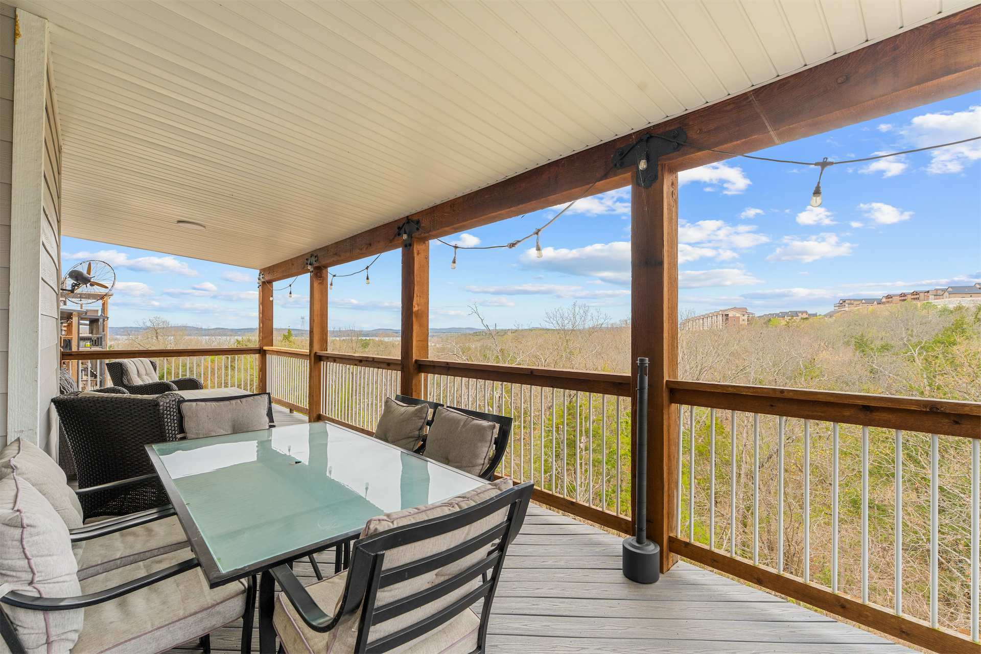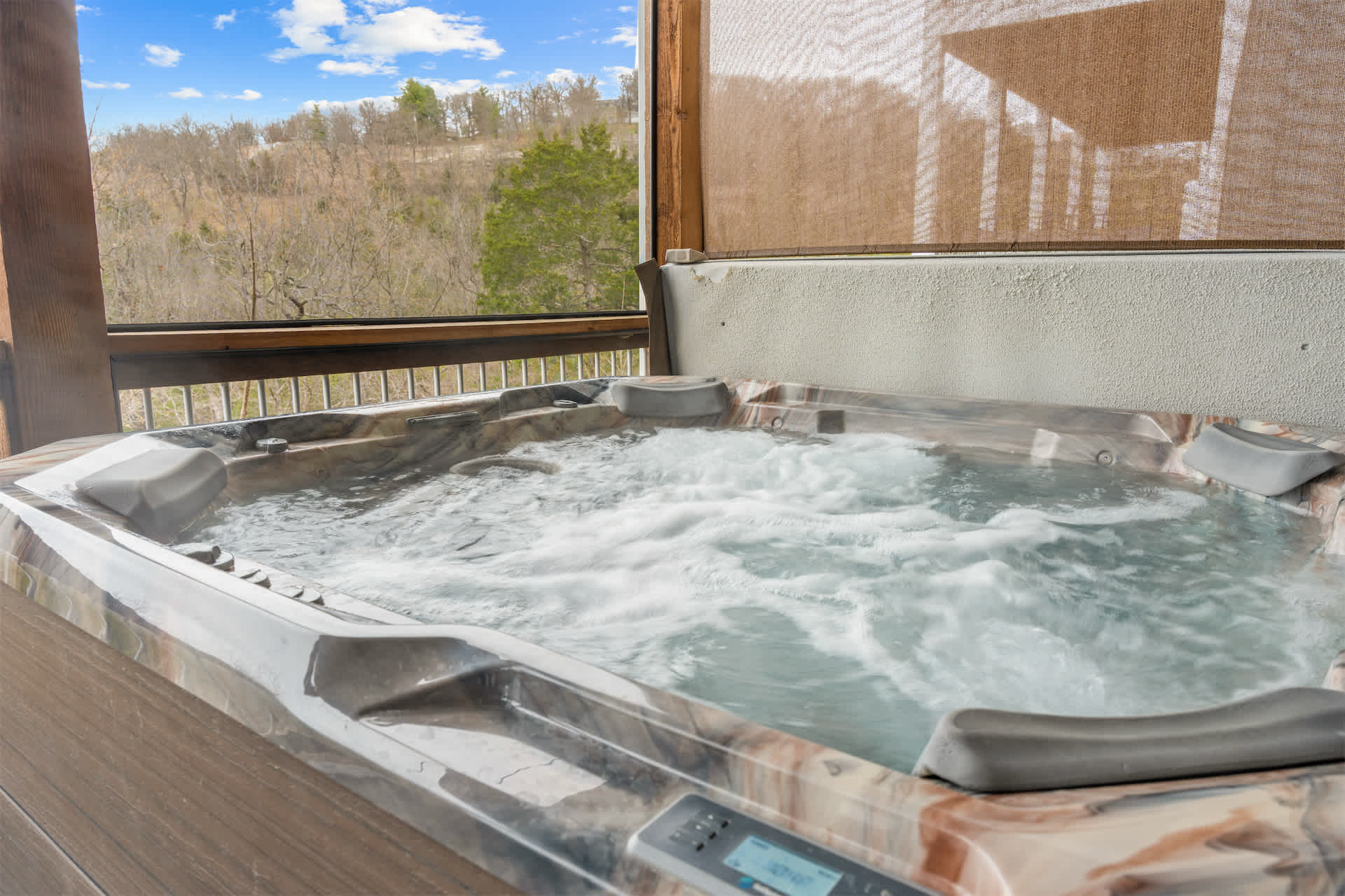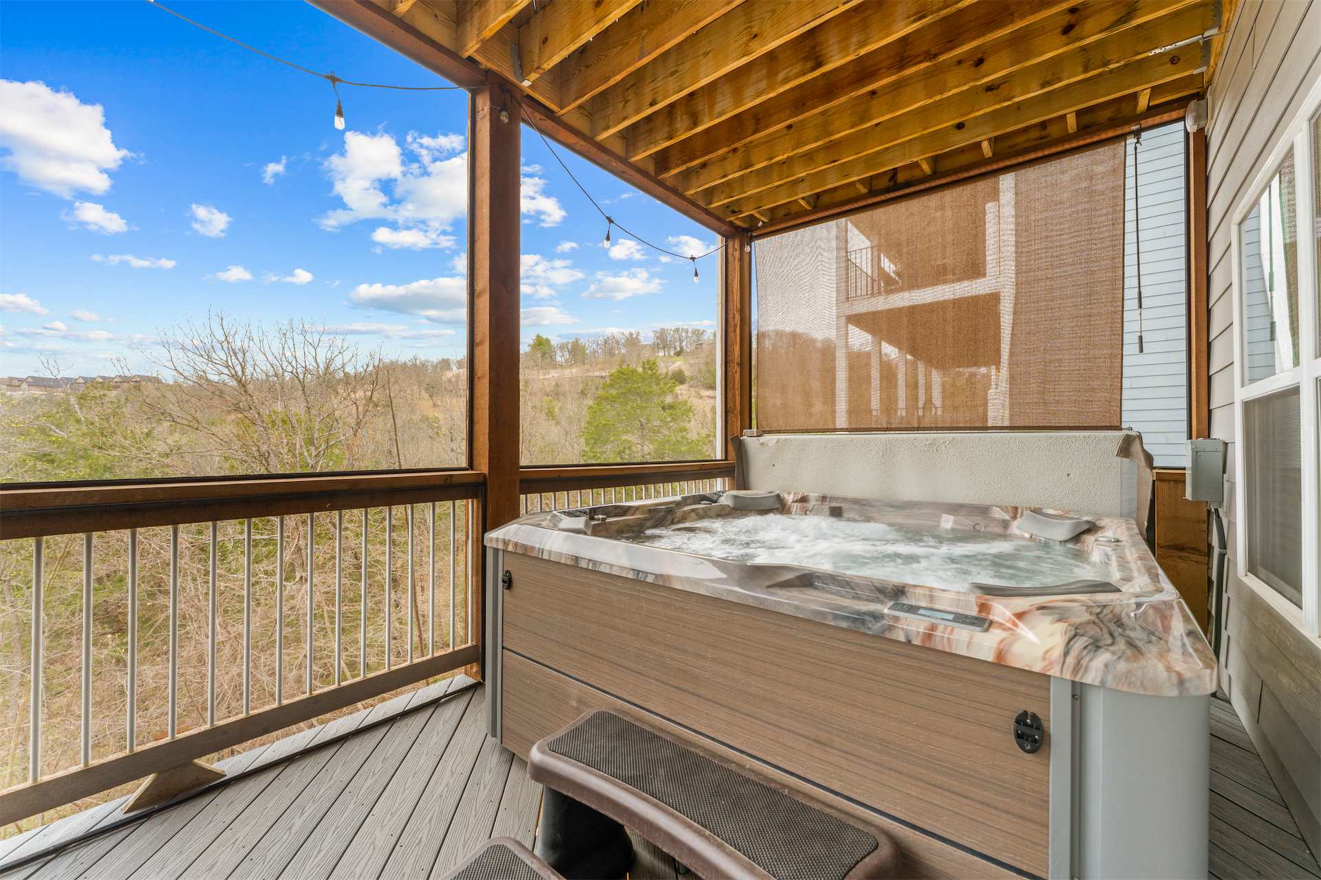Outside is where this home truly shines. The upper deck offers incredible views and plenty of comfortable seating to soak in the fresh Ozark air, while the screened-in lower deck feels like a private retreat surrounded by trees. Here, you’ll find your own hot tub, ready for quiet mornings or star-filled evenings of relaxation. Whether you’re sipping coffee above the treetops or unwinding in the hot tub after a day exploring Branson, Kokomo Kove delivers a stay that feels both elevated and effortlessly comfortable.