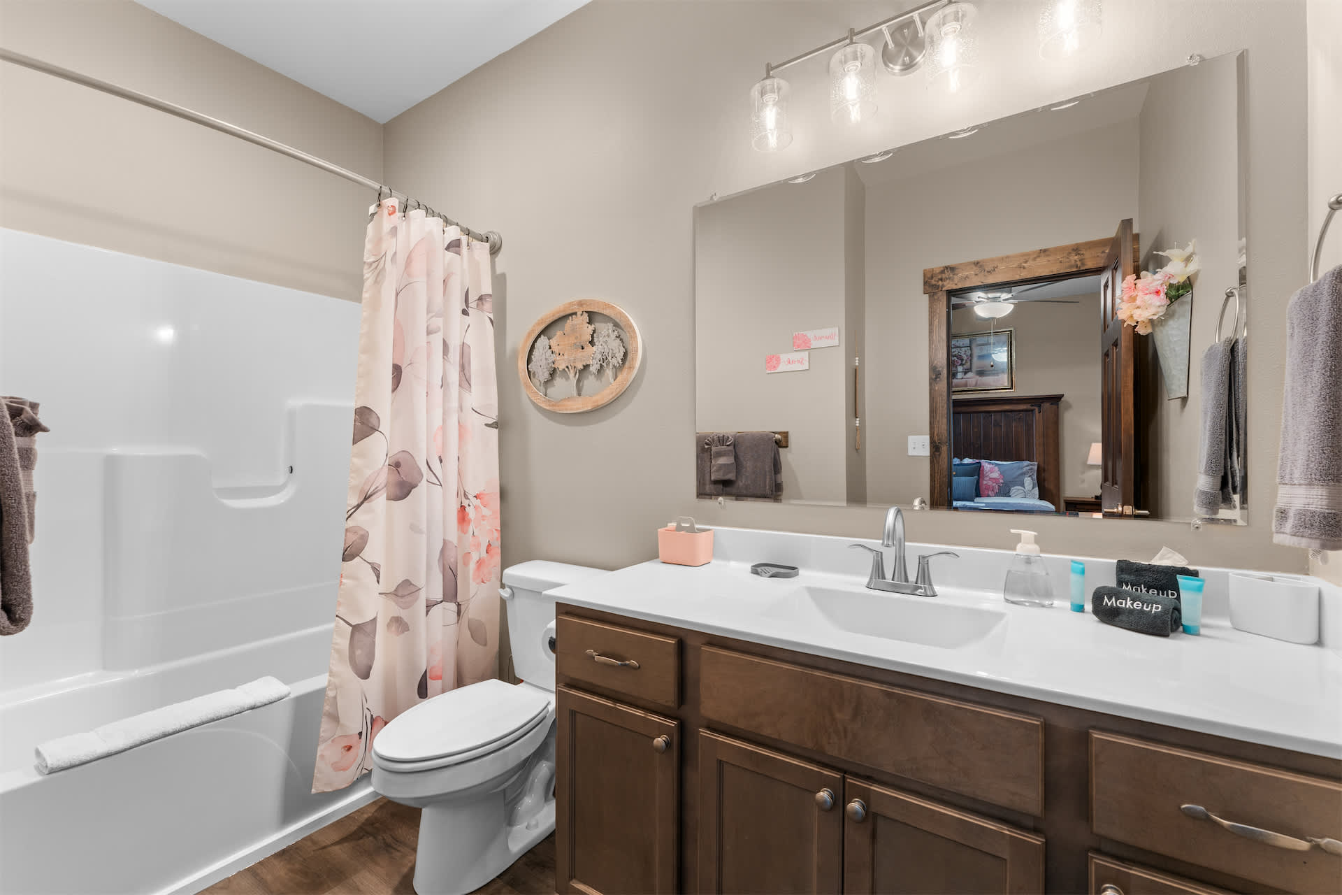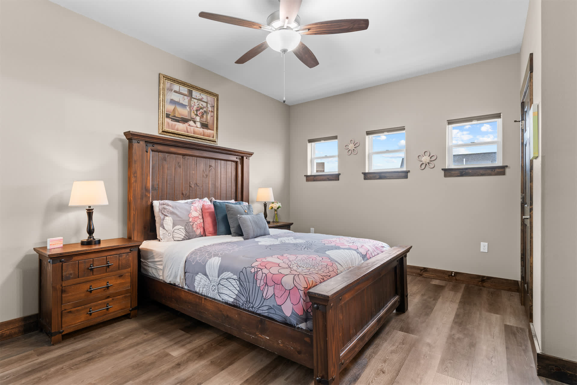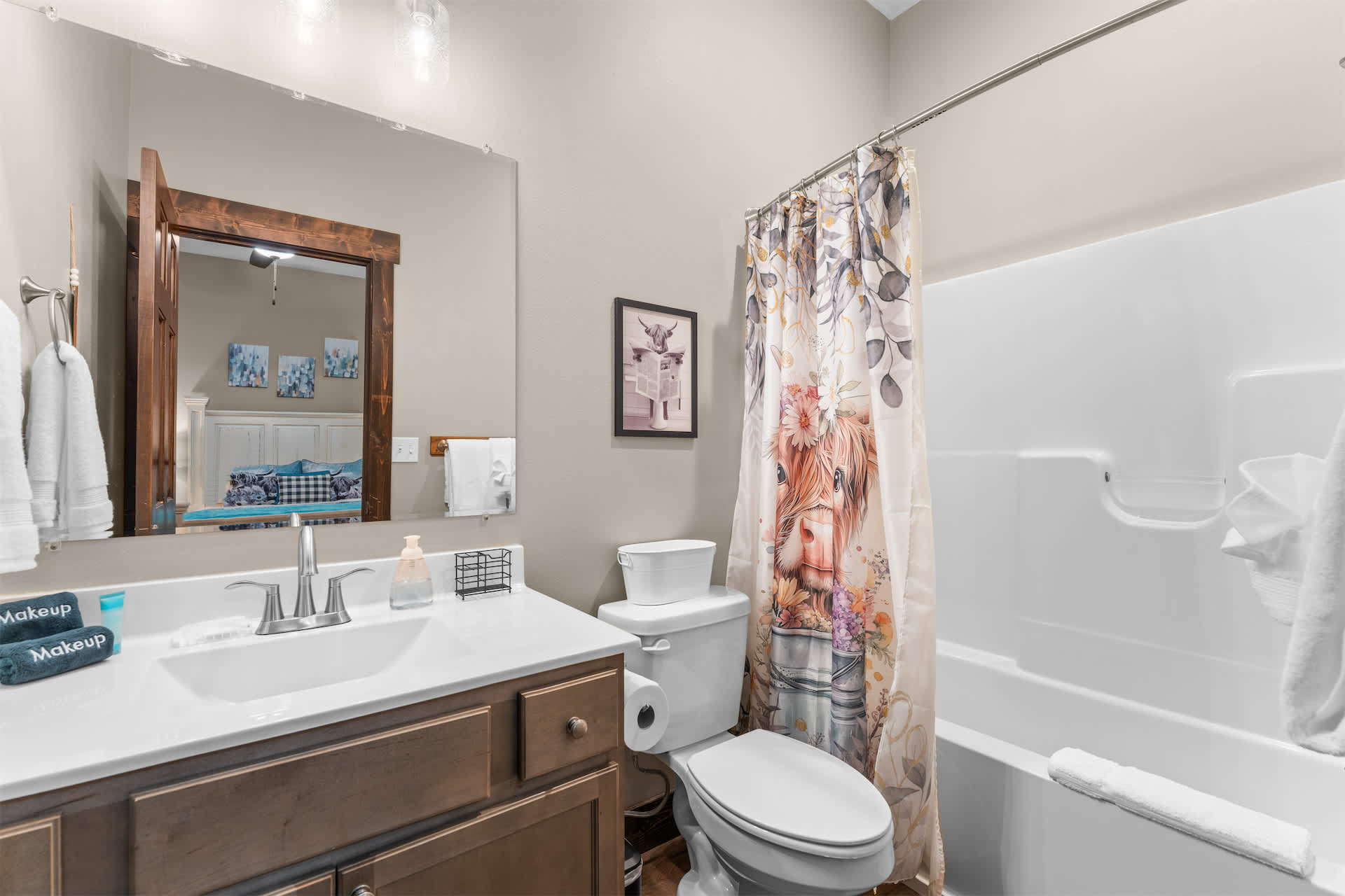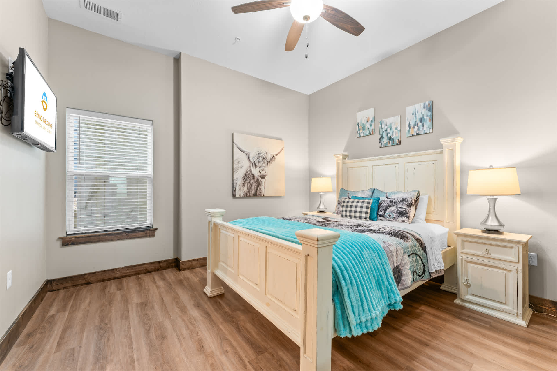 Bedroom #3 includes a queen size bed, a cable TV, and an ensuite bathroom with a single vanity and a shower/tub combo.