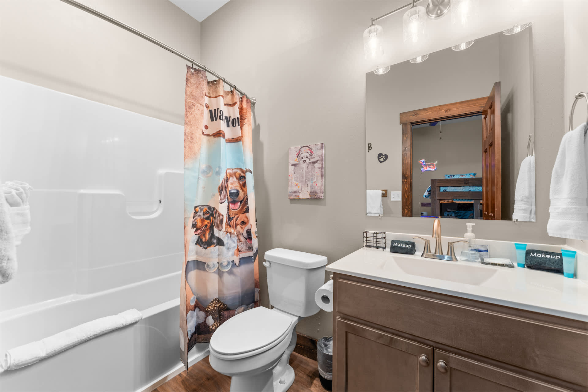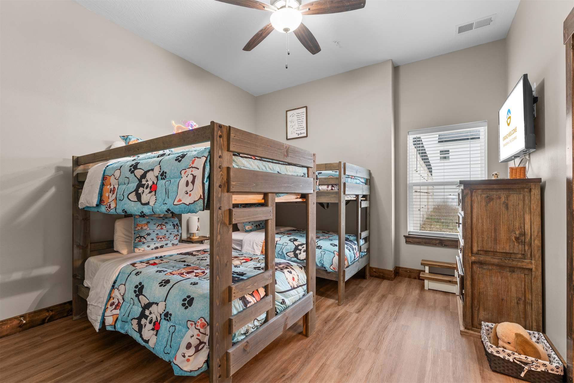 Bedroom #4 includes 2 sets of twin-over-twin size beds, a cable TV, and an ensuite bathroom with a single vanity and a shower/tub combo.