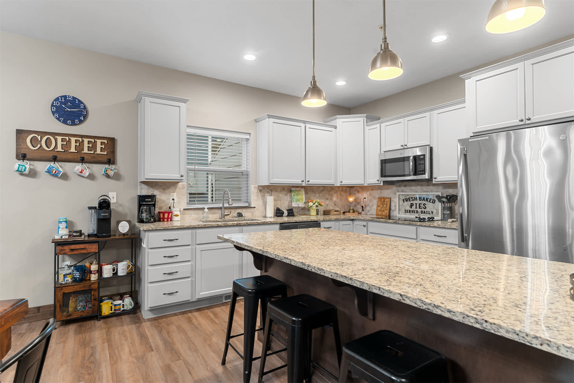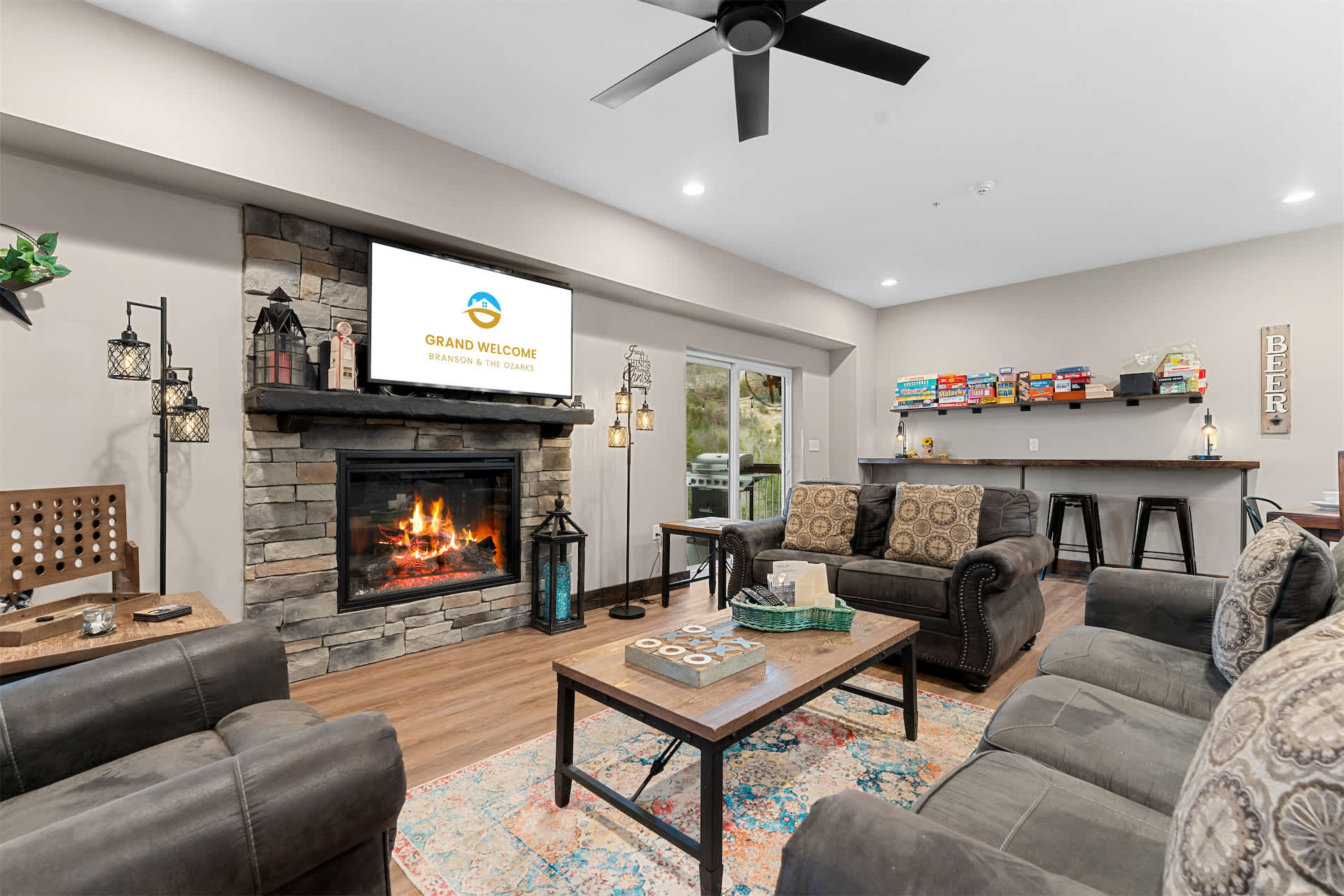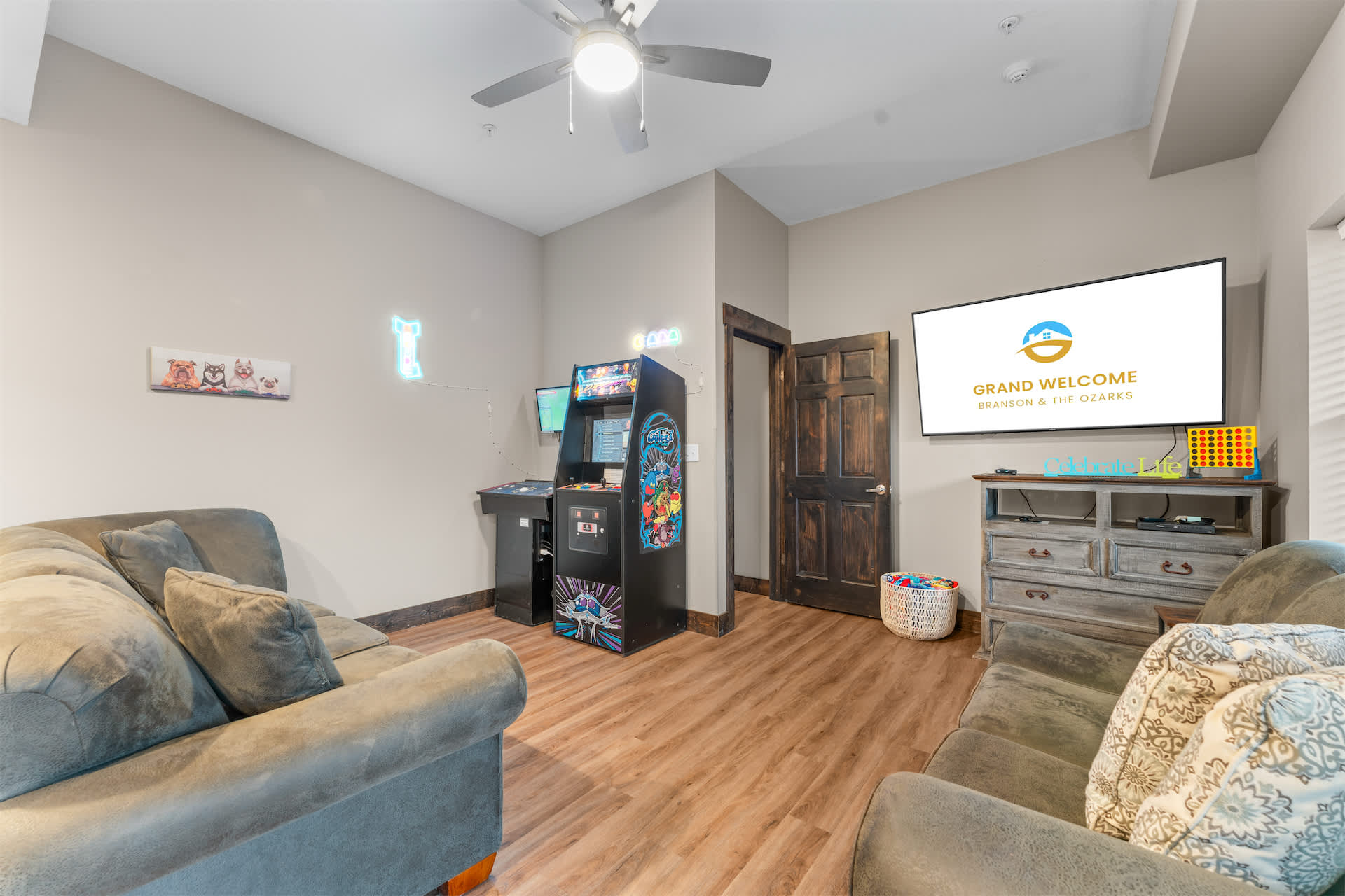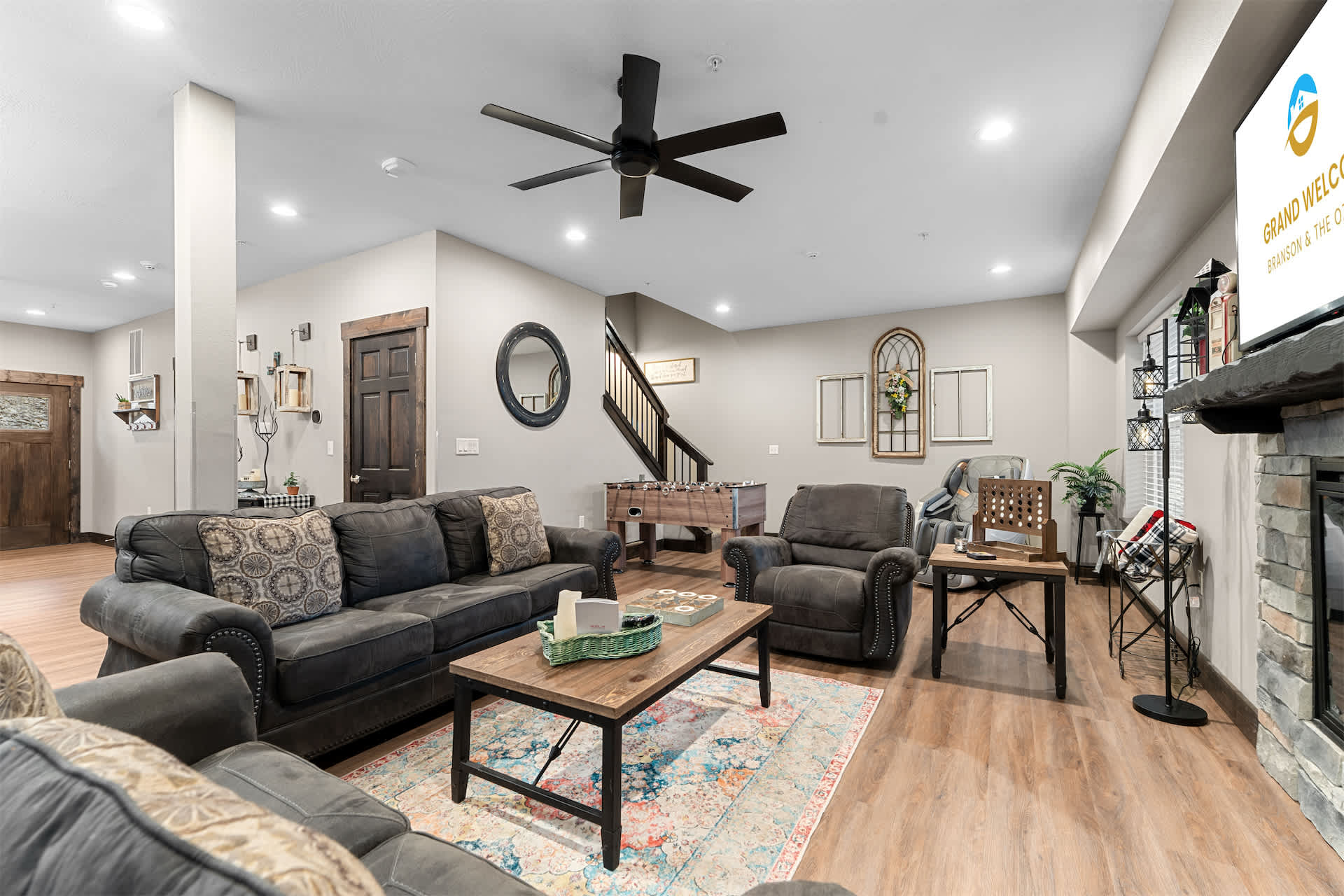Step inside and you’re welcomed by a spacious, open-concept kitchen designed for gathering, featuring stone countertops, stainless steel appliances, both drip and Keurig coffee makers, and generous seating with a counter for four and additional bar-style seating for four. The large dining table for twelve makes hosting effortless, flowing seamlessly into the living room where a cozy couch, love seat, cable TV, and even a massage chair invite you to relax, while a foosball table adds a fun, social touch. Downstairs, the basement becomes its own entertainment hub with arcade games, two couches, cable TV, and a convenient wet bar complete with a fridge, toaster oven, and microwave—perfect for movie nights or late-night snacks.