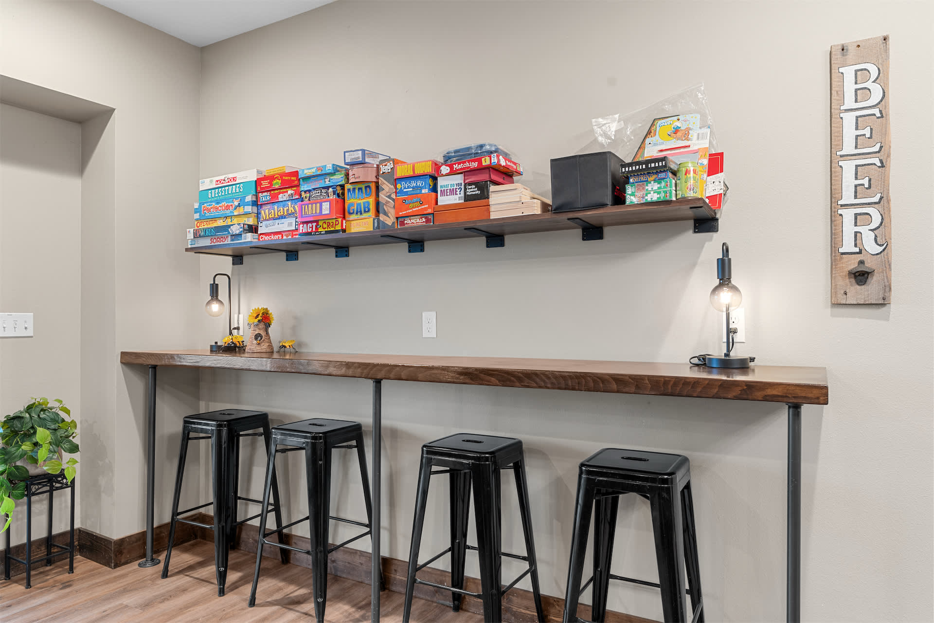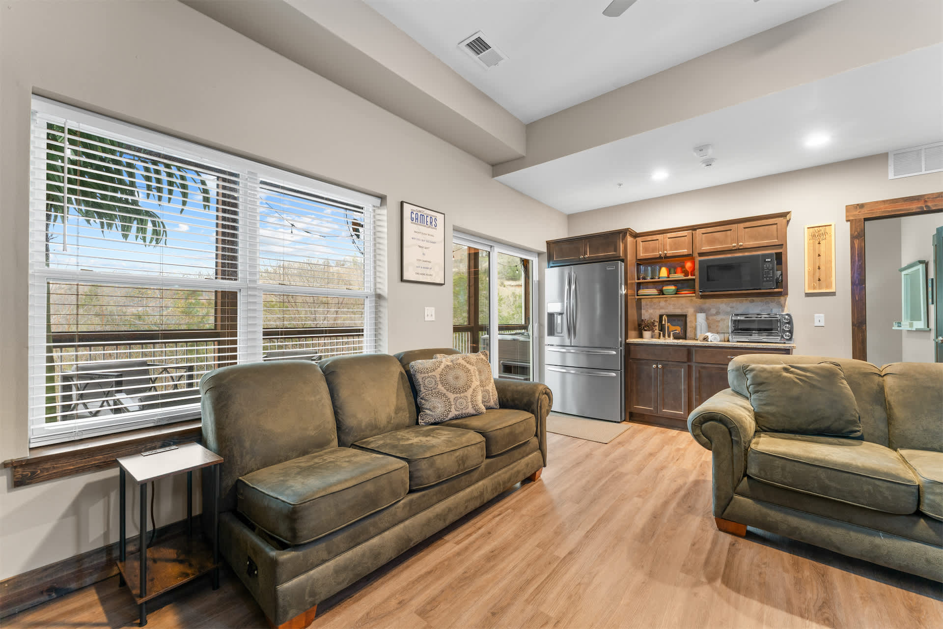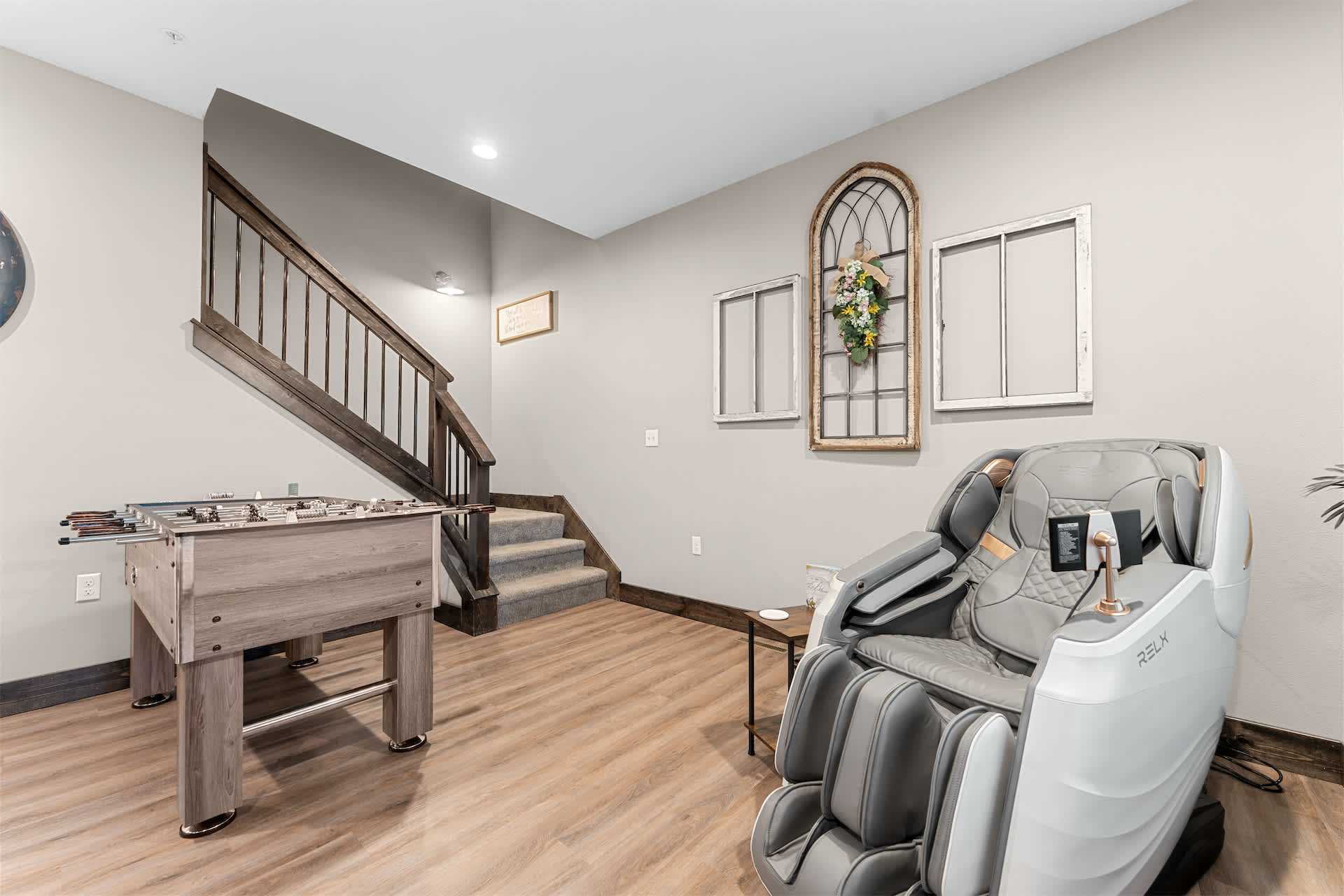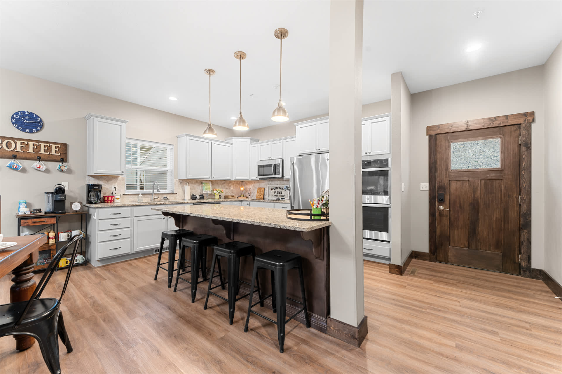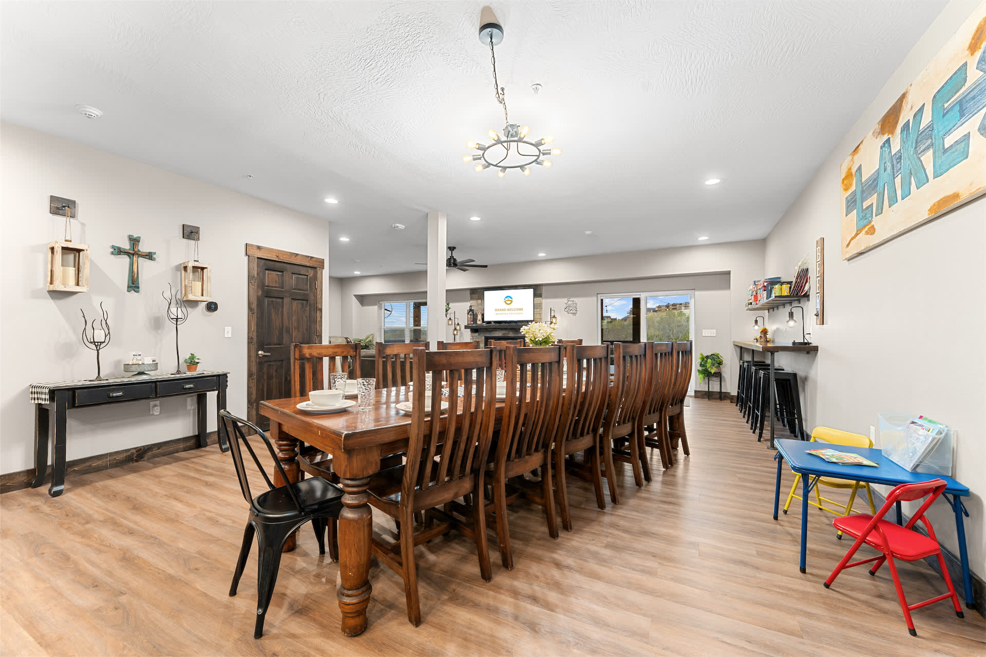 Step inside and you’re welcomed by a spacious, open-concept kitchen designed for gathering, featuring stone countertops, stainless steel appliances, both drip and Keurig coffee makers, and generous seating with a counter for four and additional bar-style seating for four. The large dining table for twelve makes hosting effortless, flowing seamlessly into the living room where a cozy couch, love seat, cable TV, and even a massage chair invite you to relax, while a foosball table adds a fun, social touch. Downstairs, the basement becomes its own entertainment hub with arcade games, two couches, cable TV, and a convenient wet bar complete with a fridge, toaster oven, and microwave—perfect for movie nights or late-night snacks.