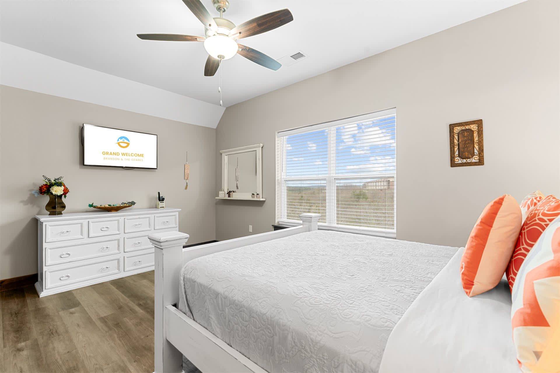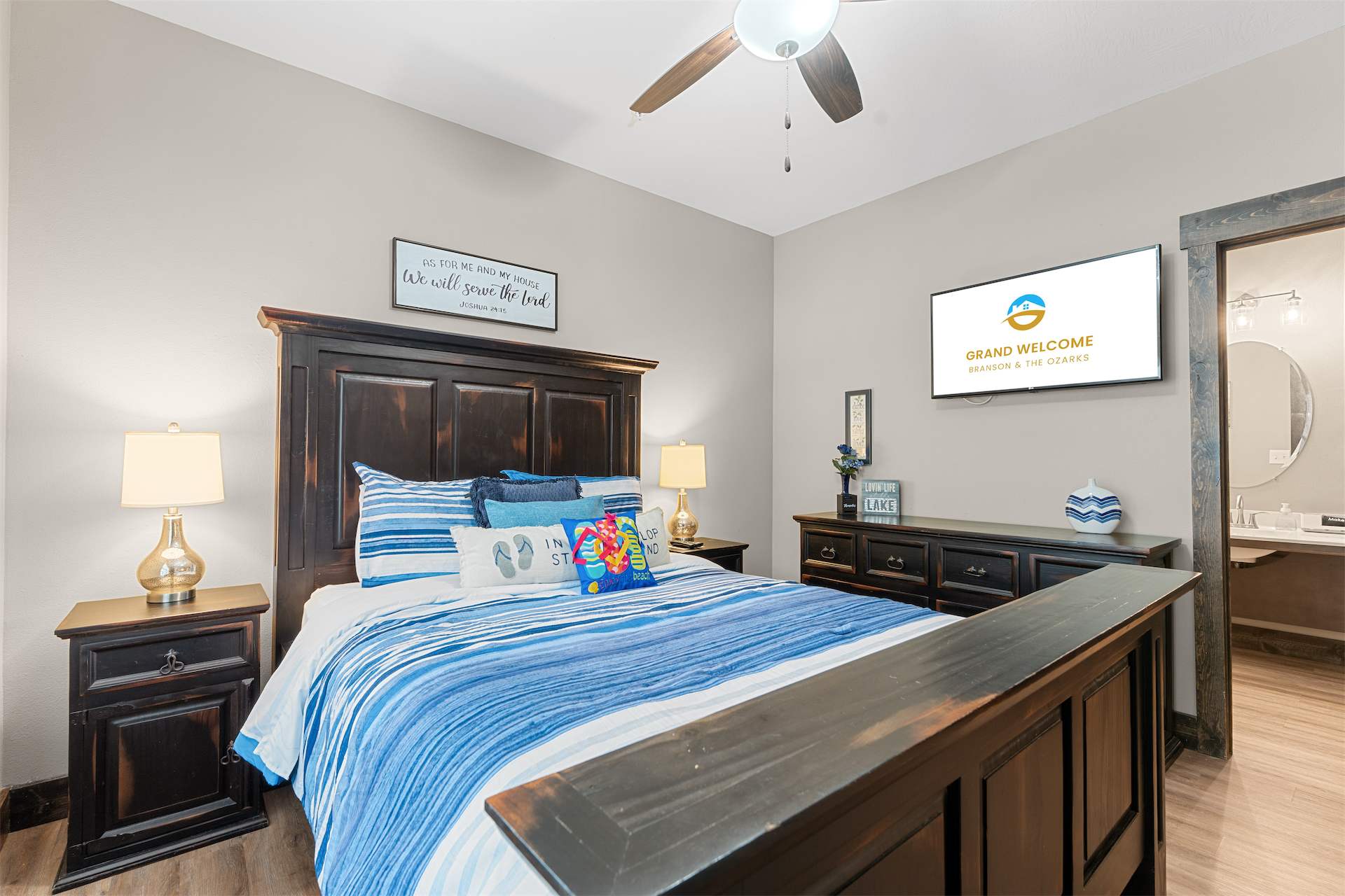 Bedroom #5 includes a queen size bed, a cable TV, and an ensuite bathroom with a single vanity and a shower/tub combo.