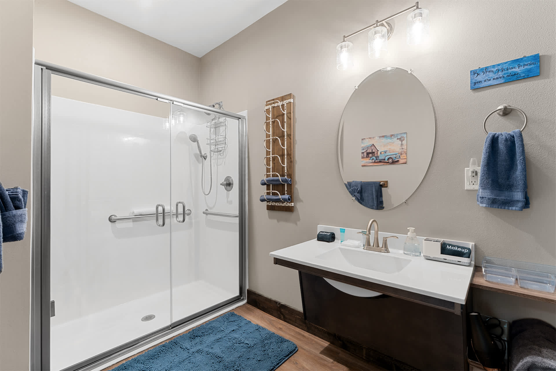 Bedroom #1 includes a queen size bed, a cable TV, and an ensuite bathroom with a single vanity and a walk-in shower.