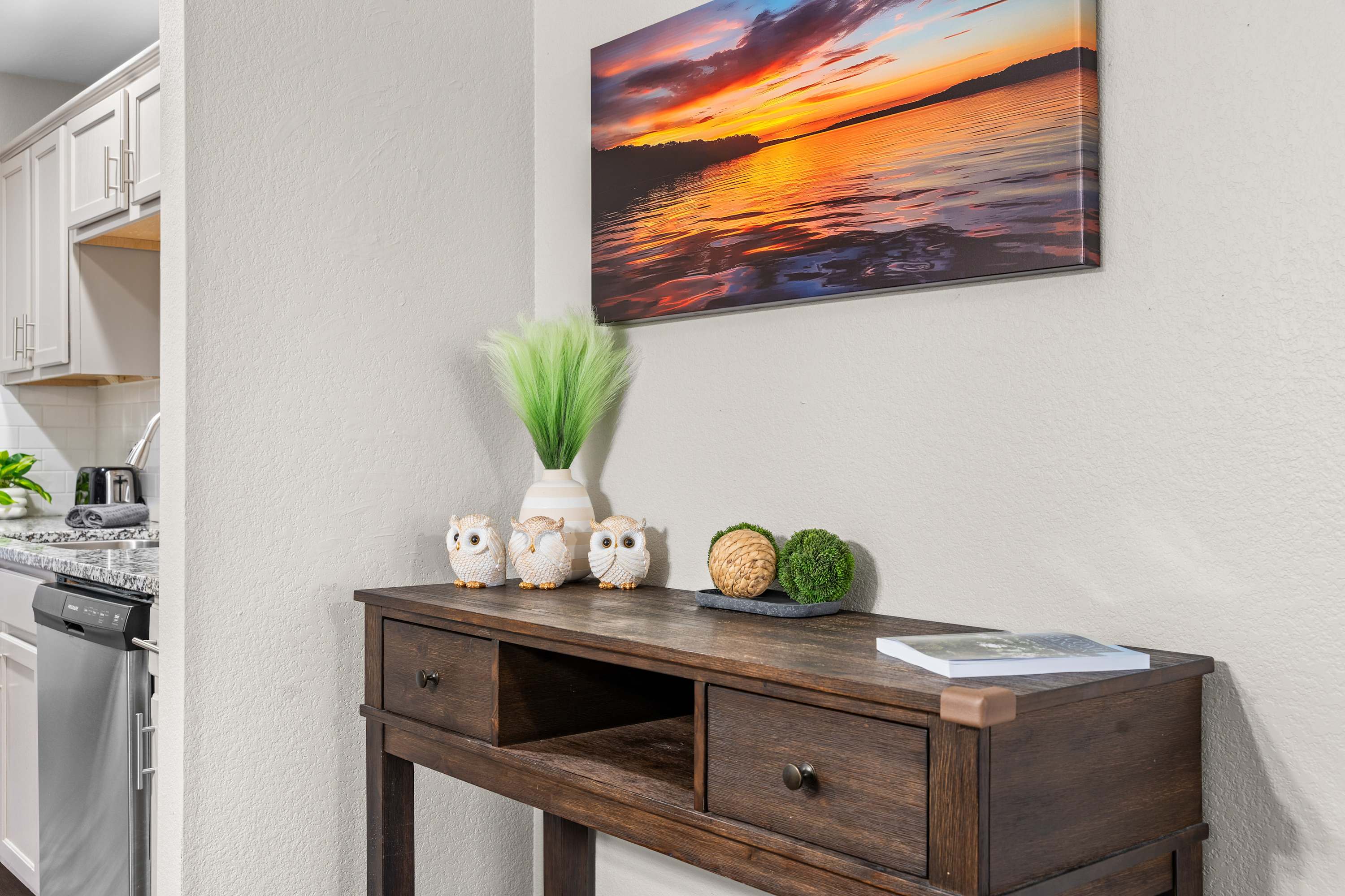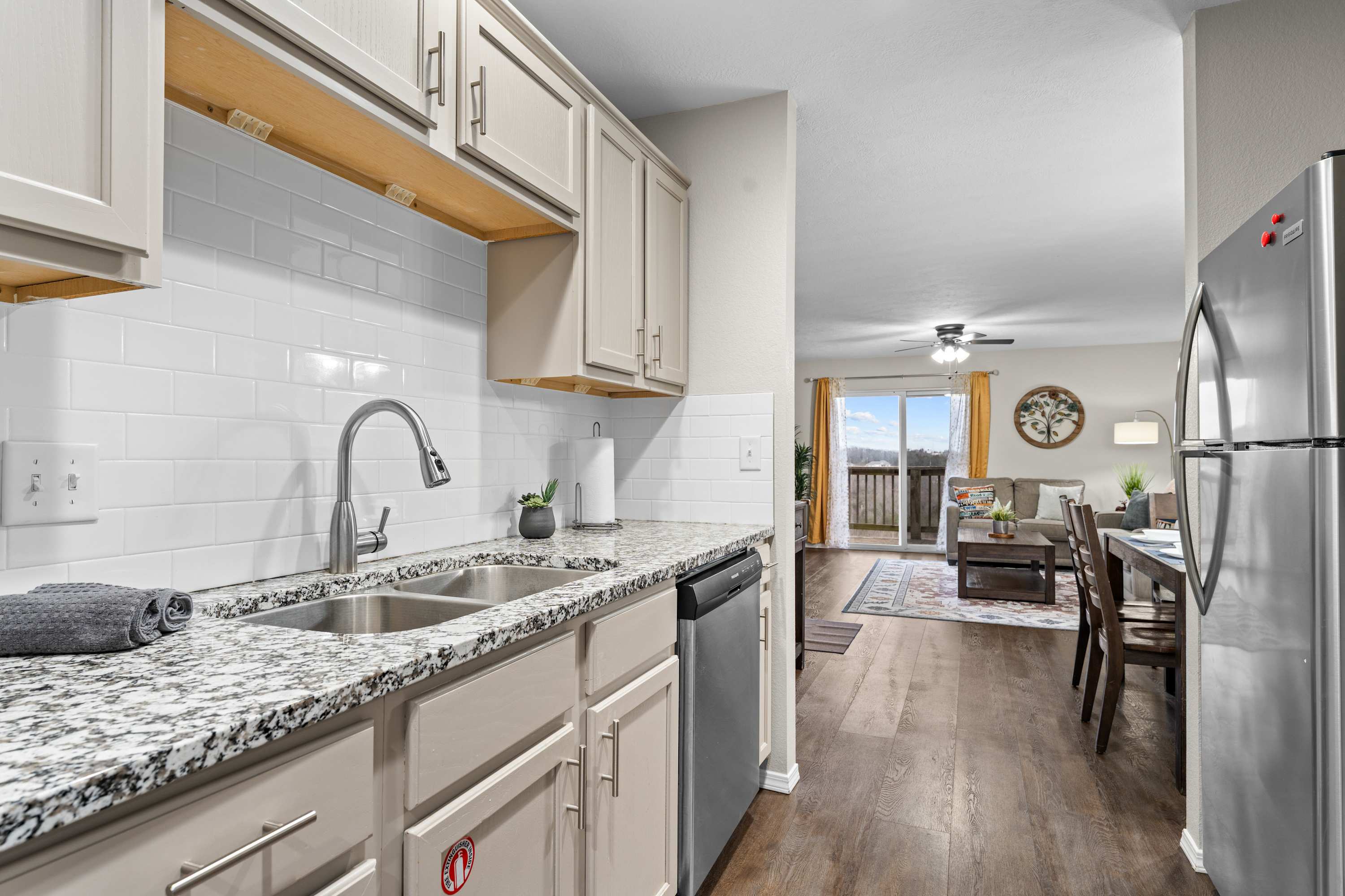 Step inside and you’re welcomed by a spacious layout designed for gathering and unwinding. The kitchen is both stylish and functional, featuring stone countertops, stainless steel appliances, and plenty of prep space, along with both drip and Keurig coffee options to start your mornings right. Just beyond, a dining table for six connects the kitchen and living area, creating the perfect flow for meals and conversation. The living room invites you to relax with a plush couch, loveseat, and armchair centered around a smart TV, while sliding glass doors draw your attention outward to the private balcony—where breathtaking views above the trees set the scene for peaceful mornings and unforgettable sunset evenings.