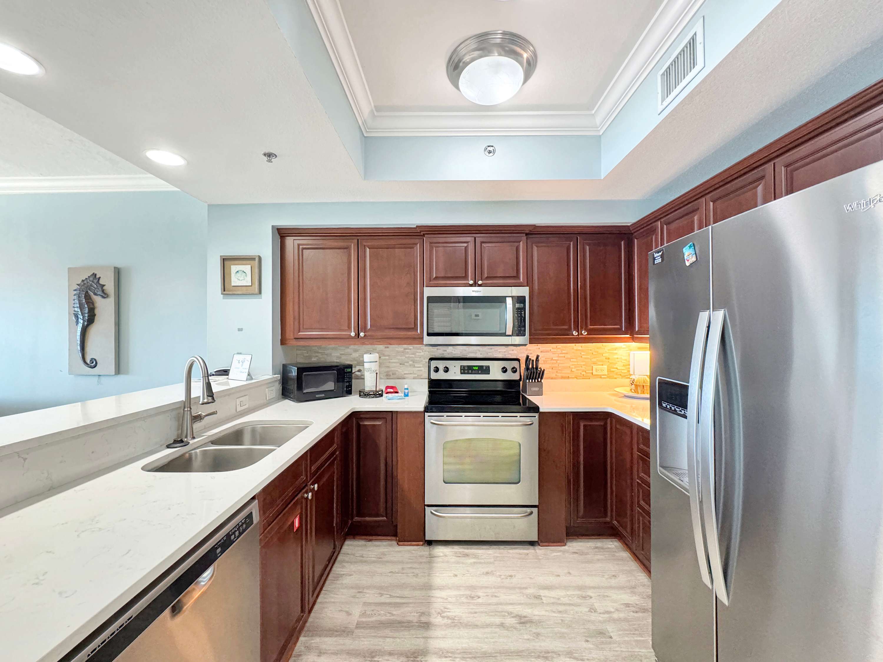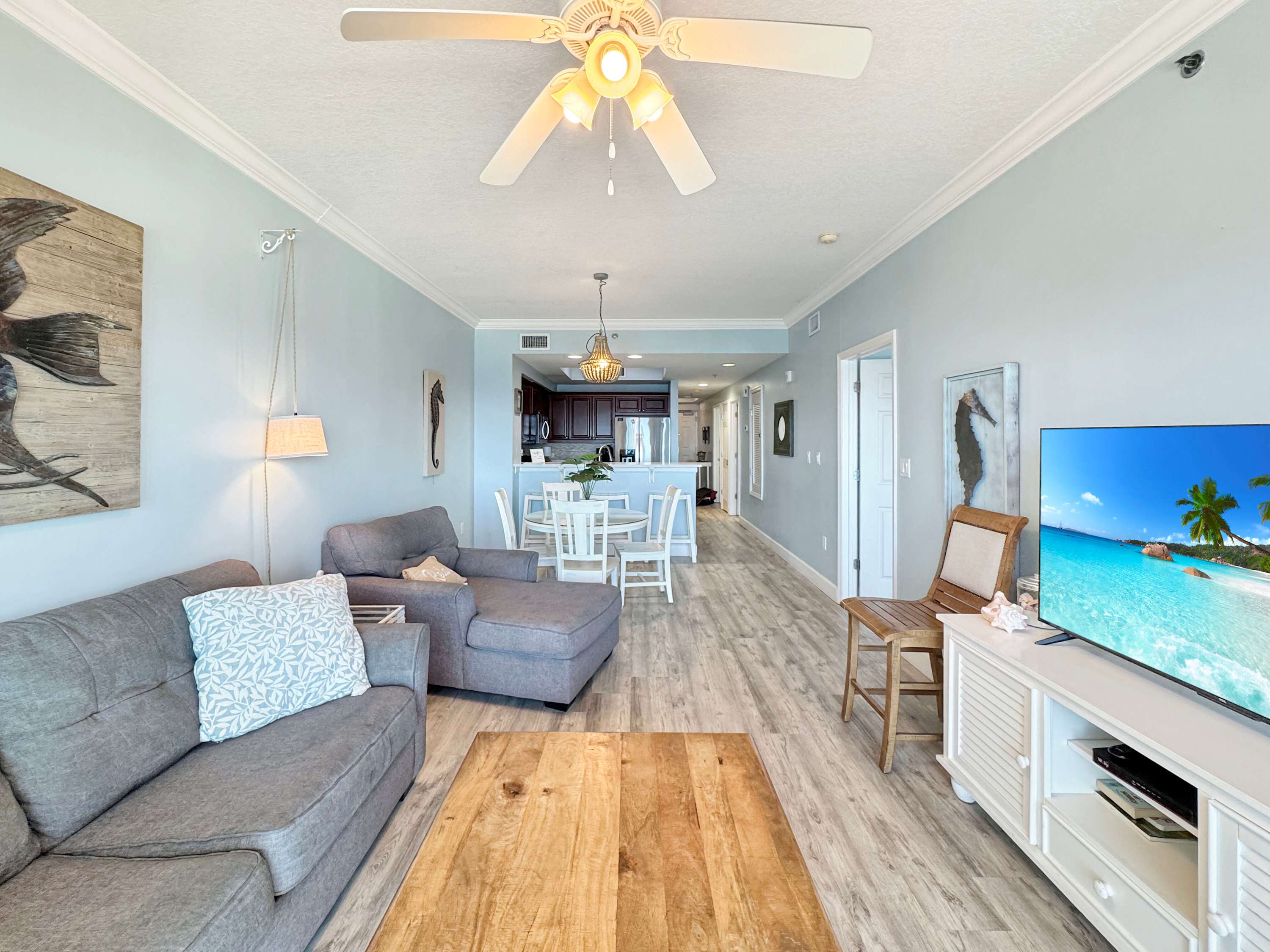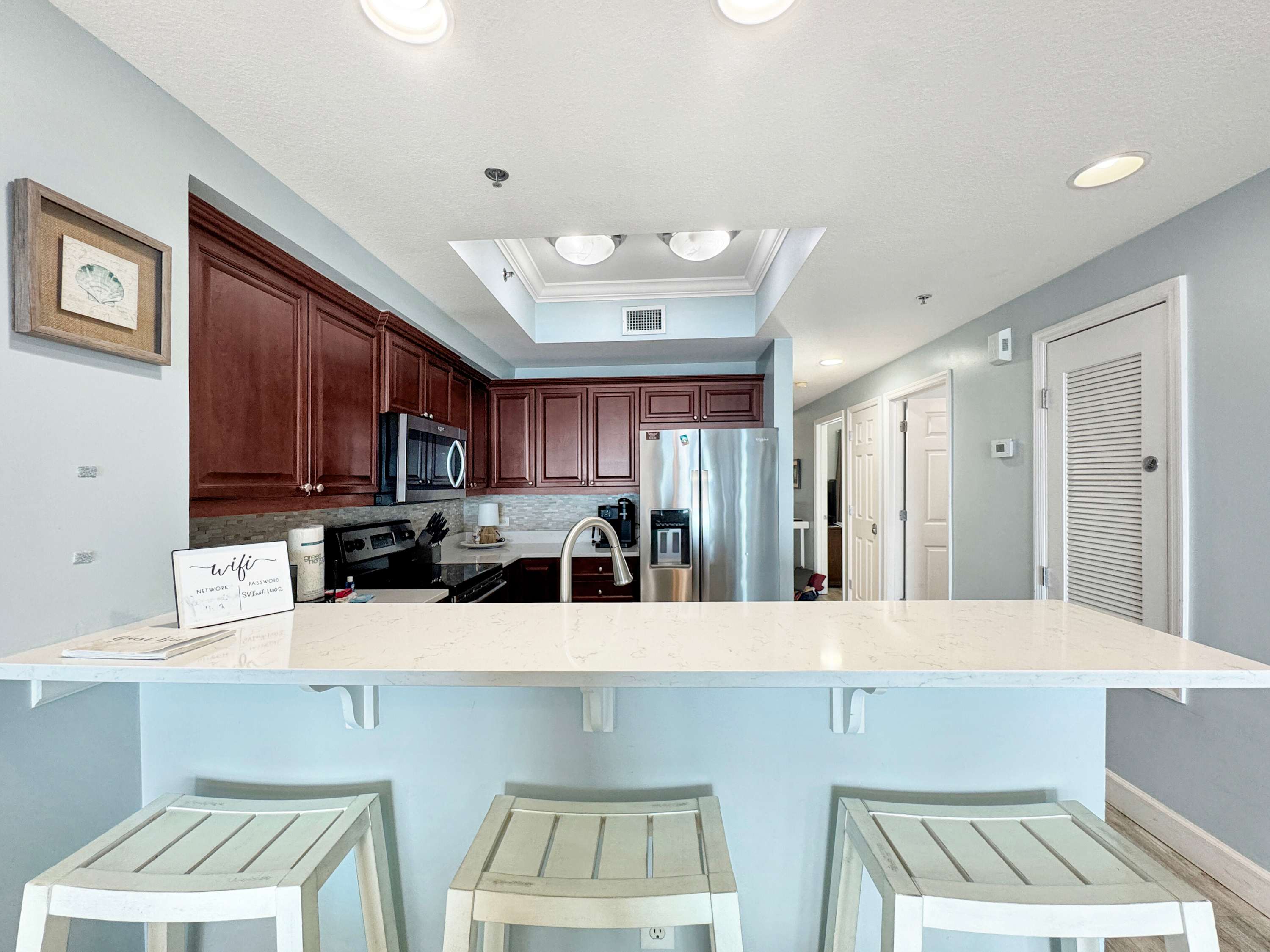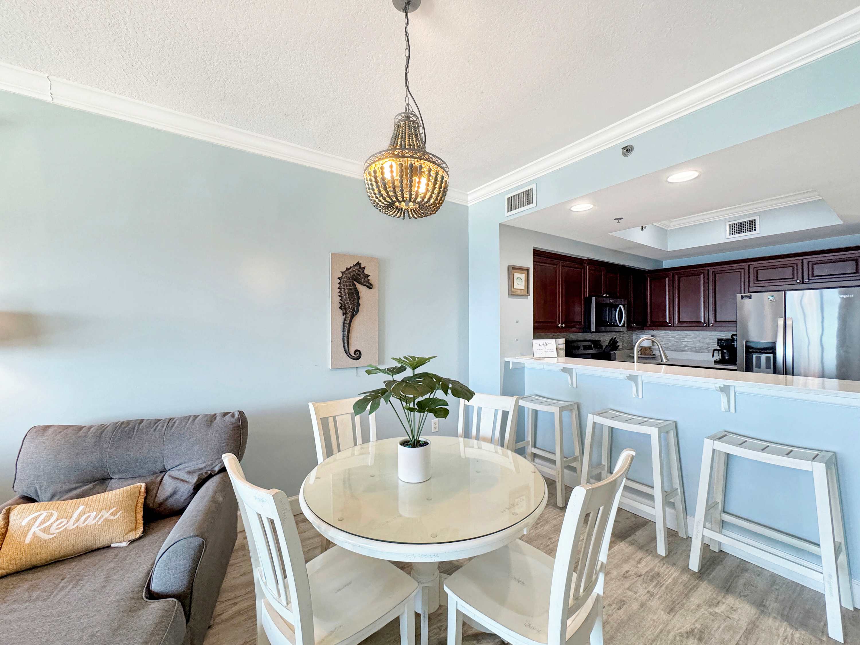 Step inside Seawind 1602 and you’re immediately greeted by a warm, inviting space designed for effortless beach living. The kitchen features rich dark cabinetry, sleek stone countertops, and both regular and Keurig coffee options to suit your morning routine, with counter seating for four that keeps everyone connected. Just beyond, a cozy dining table for four flows into the living area, where a plush couch and armchair are perfectly positioned around a smart TV—ideal for unwinding after a sun-filled day.