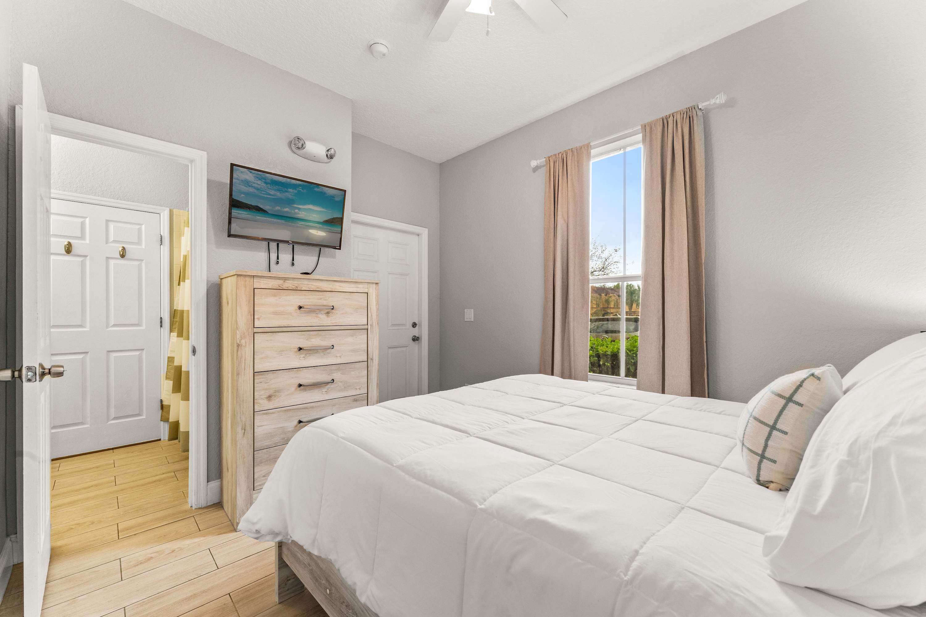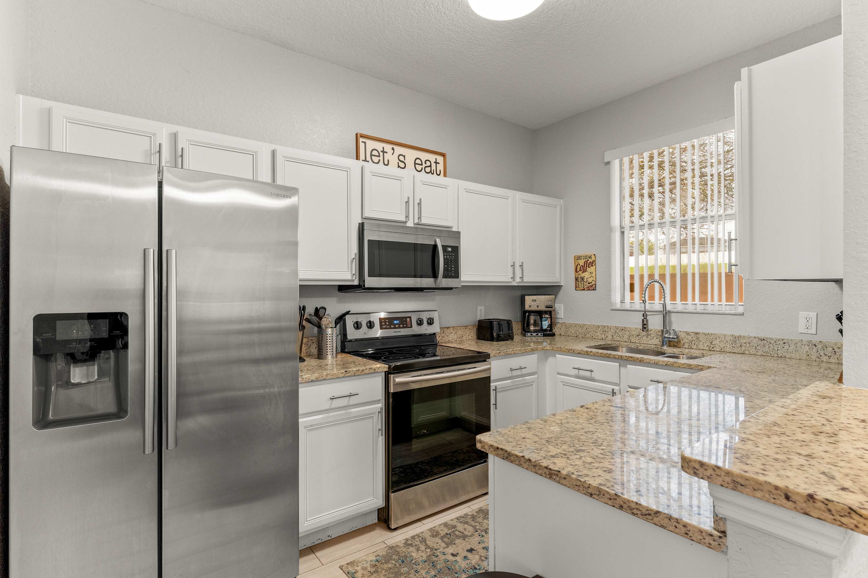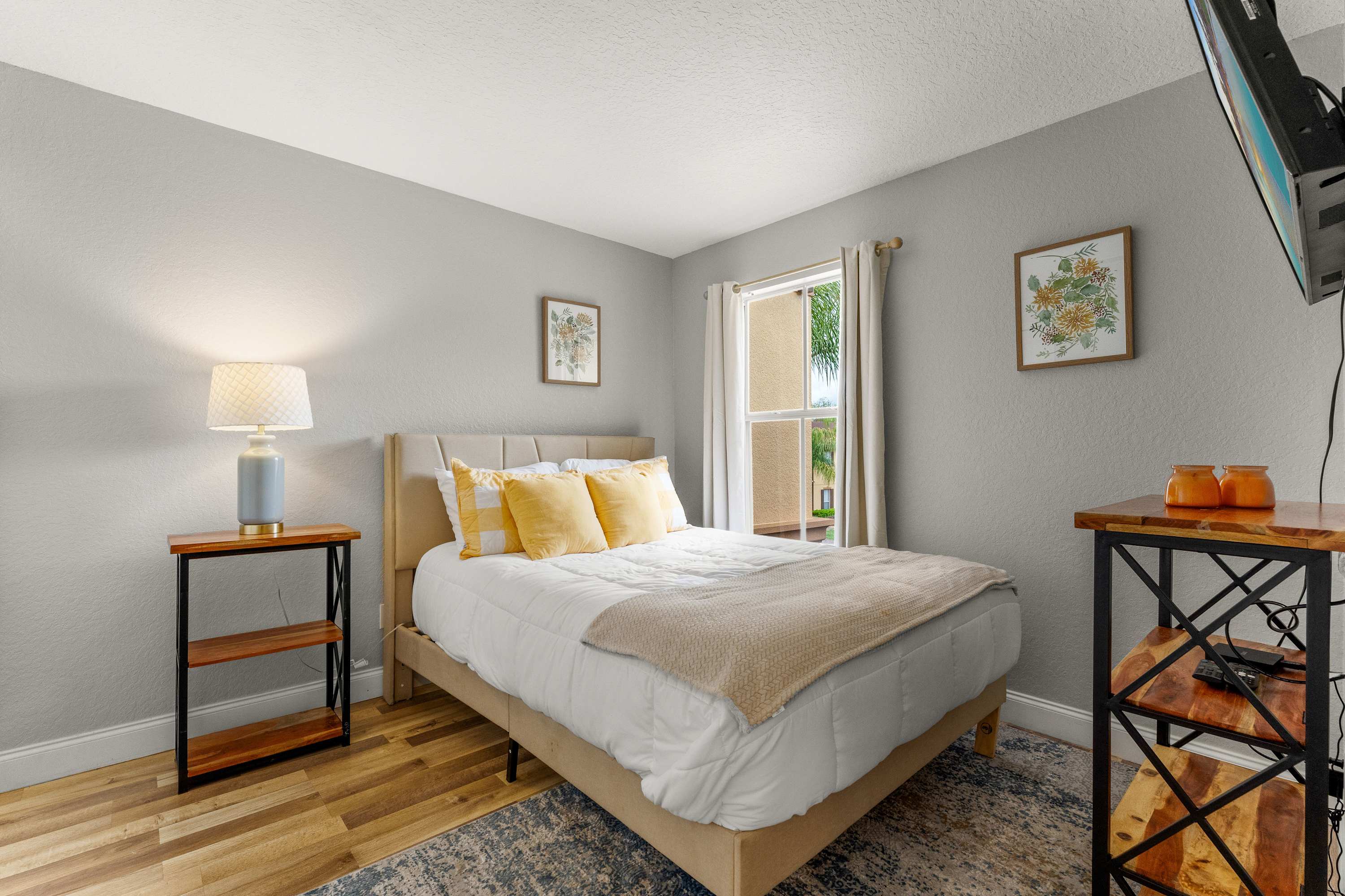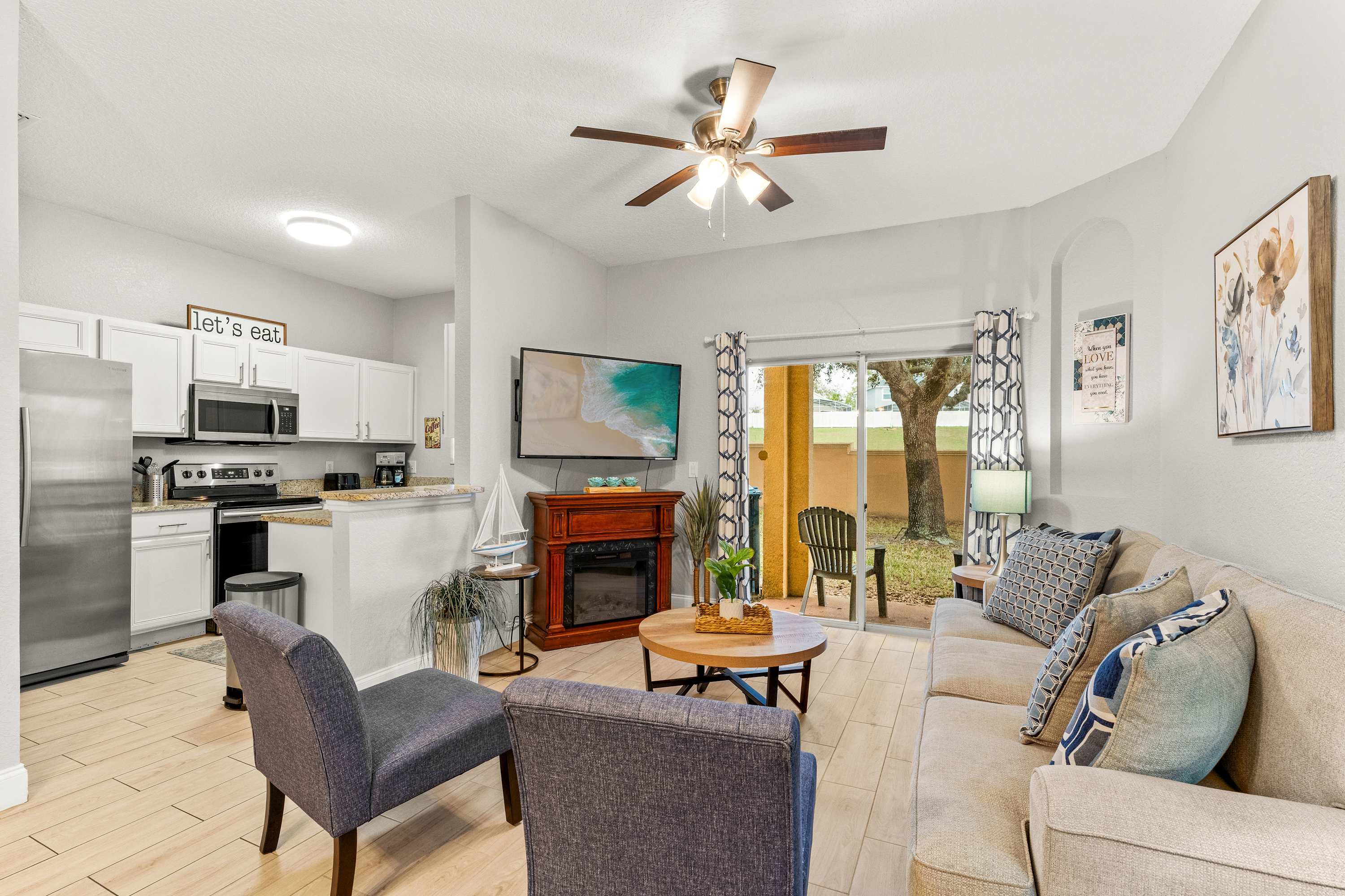 Sliding glass doors lead you out to your private rear patio, where a shaded overhang and grassy area set the scene for laid-back afternoons. Sip your morning coffee in one of the chairs, enjoy the warm Florida breeze, or wind down in the evening after a full day at the resort. With its unbeatable location, walkable amenities, and welcoming atmosphere, Palm Garden at Regal Palms is the kind of place where vacation memories come naturally.