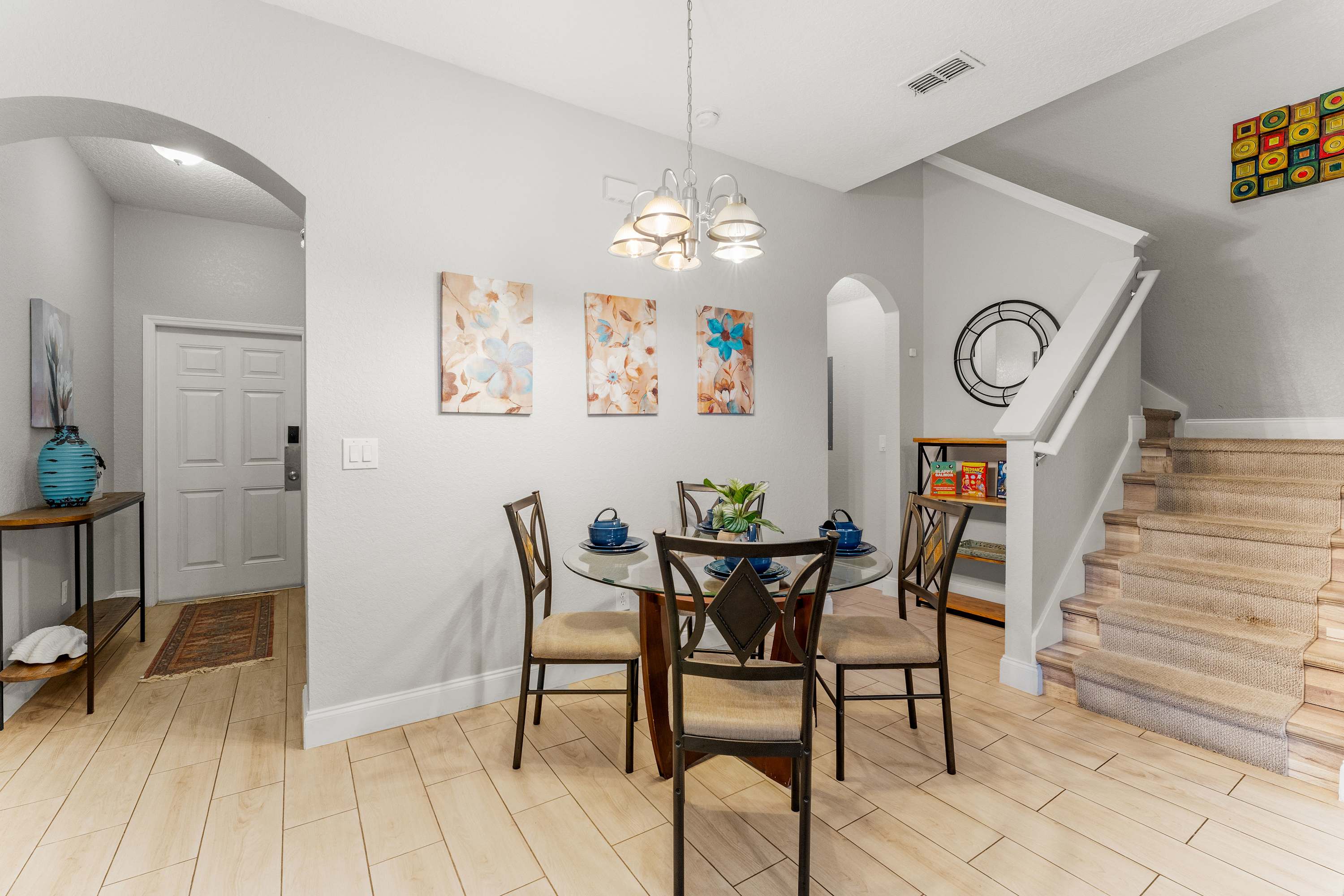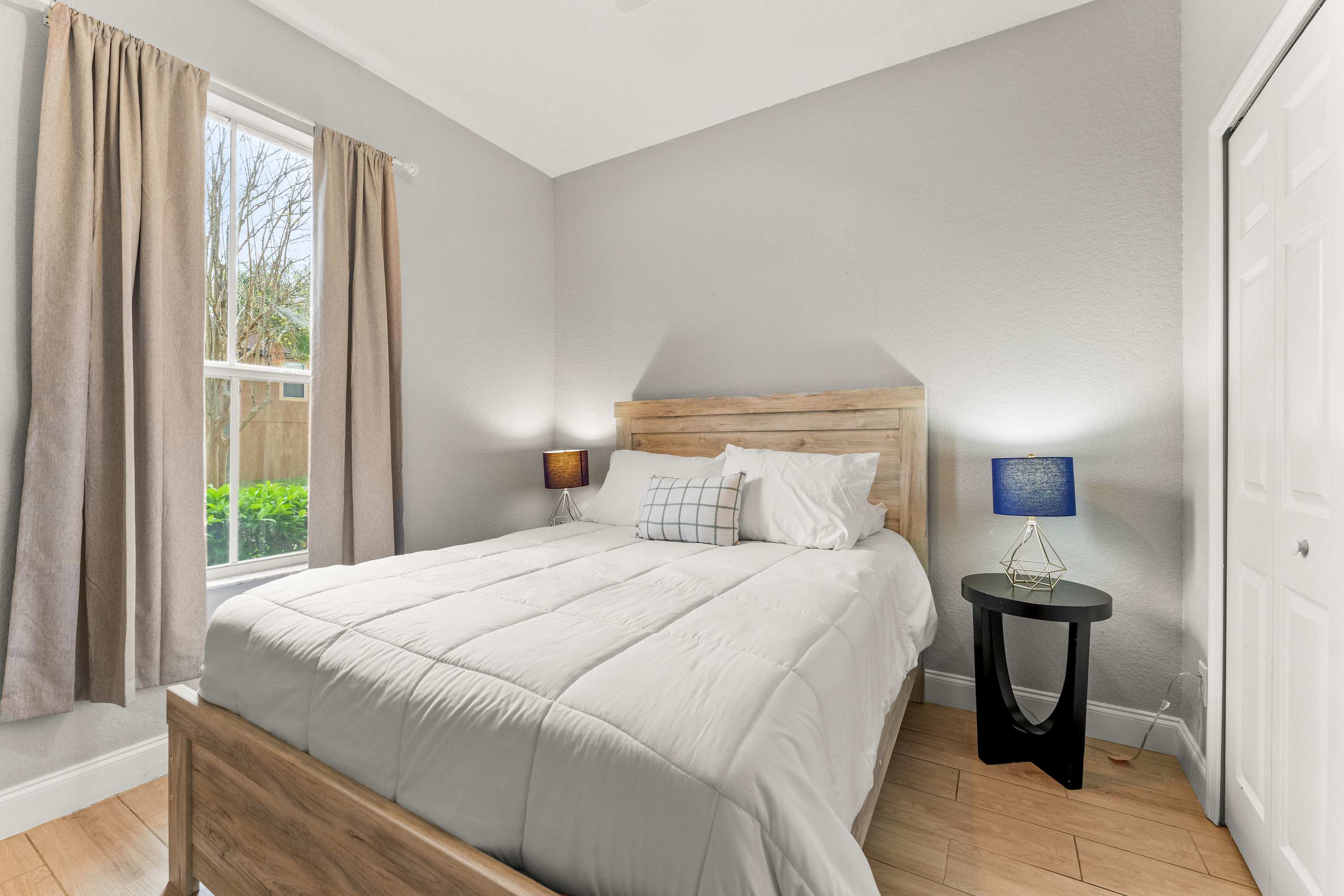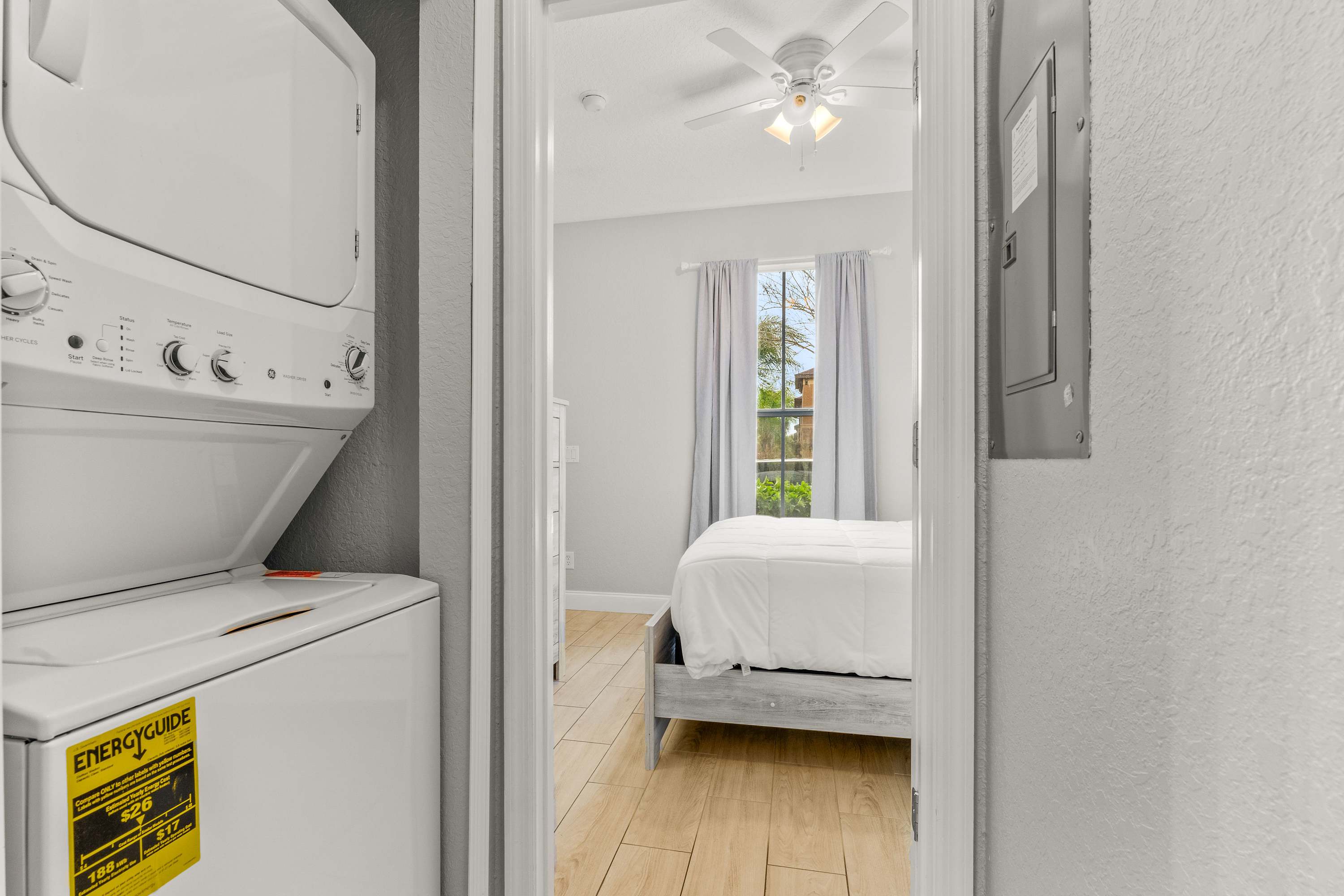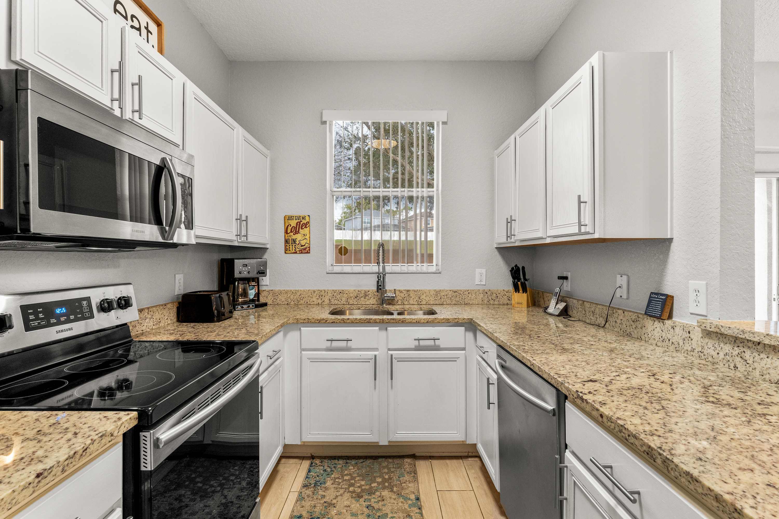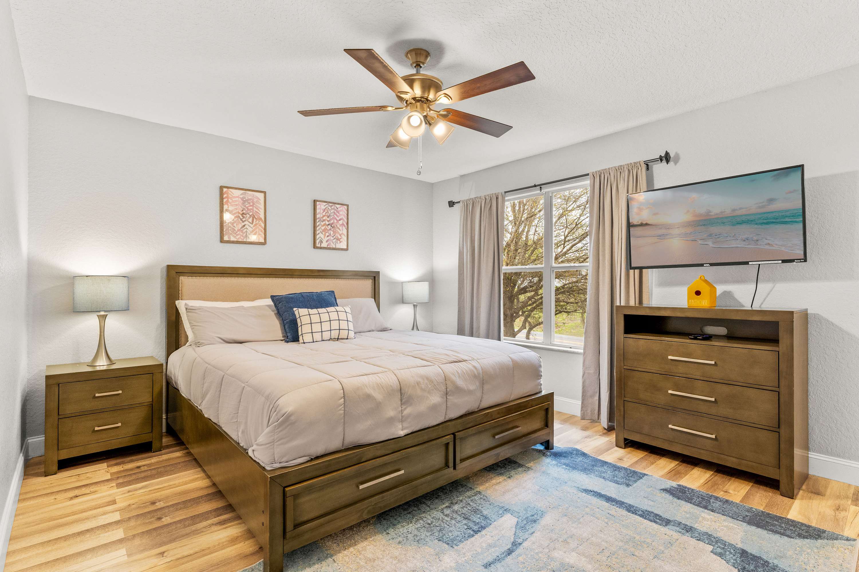 Sliding glass doors lead you out to your private rear patio, where a shaded overhang and grassy area set the scene for laid-back afternoons. Sip your morning coffee in one of the chairs, enjoy the warm Florida breeze, or wind down in the evening after a full day at the resort. With its unbeatable location, walkable amenities, and welcoming atmosphere, Palm Garden at Regal Palms is the kind of place where vacation memories come naturally.
