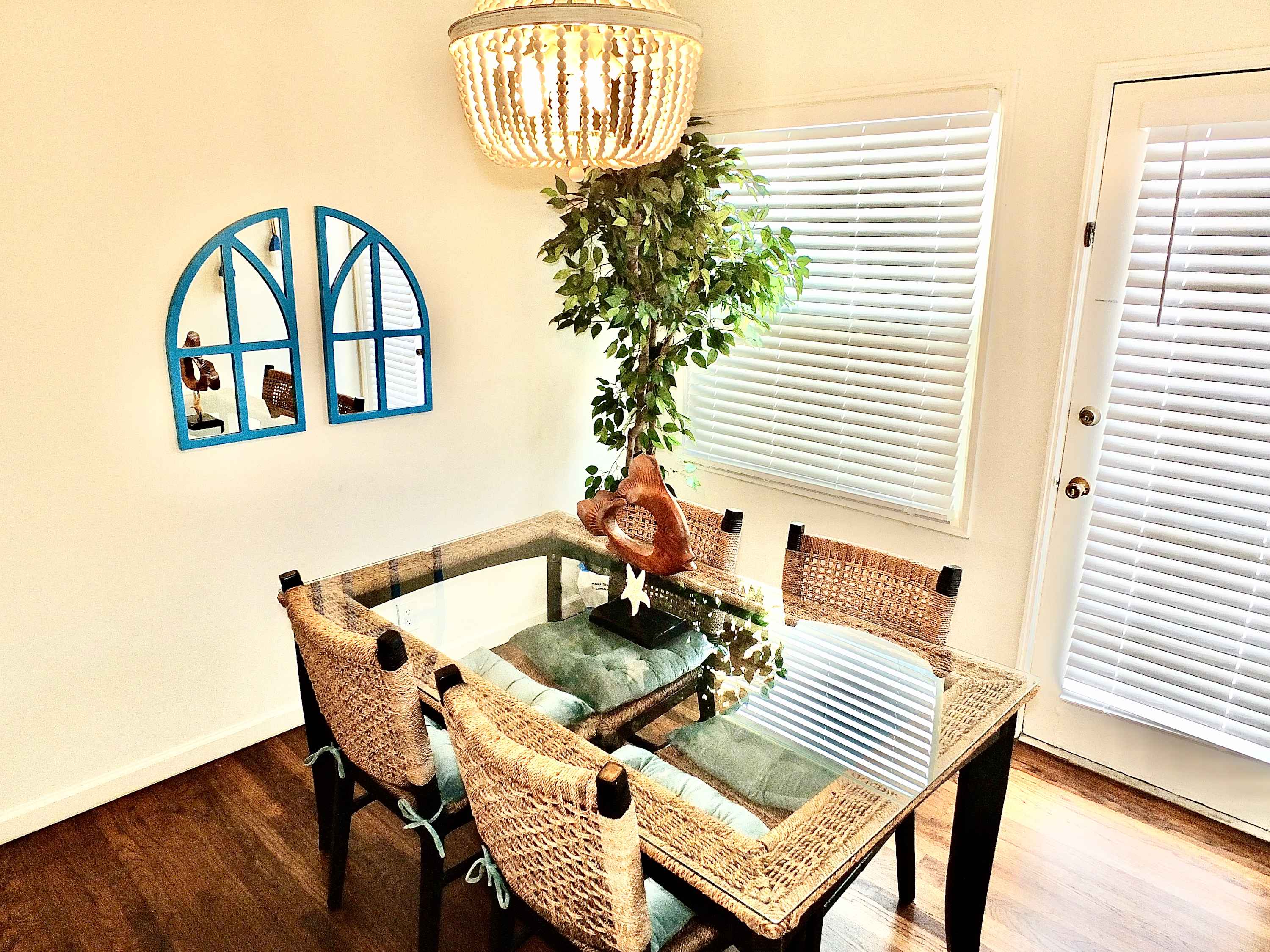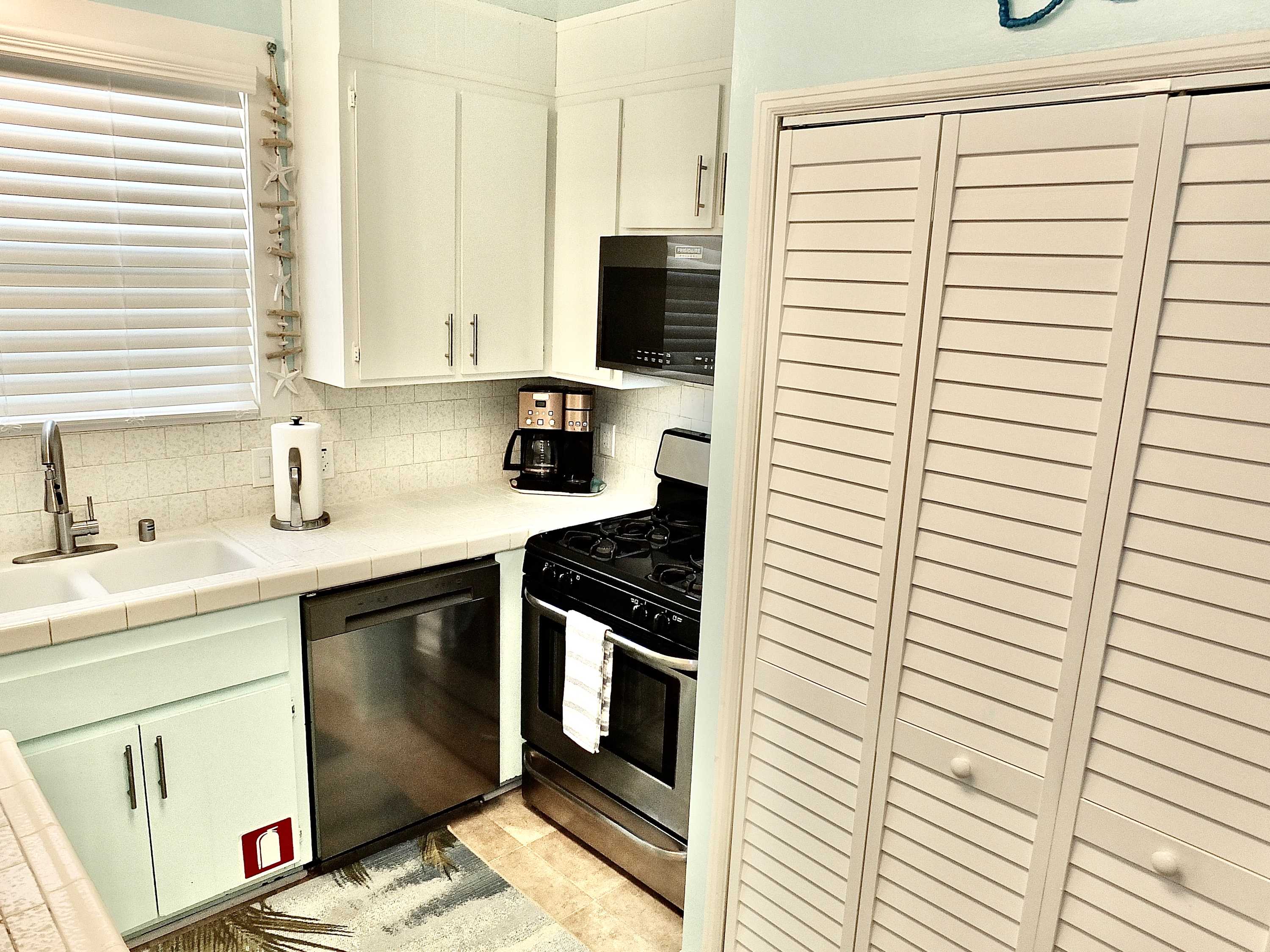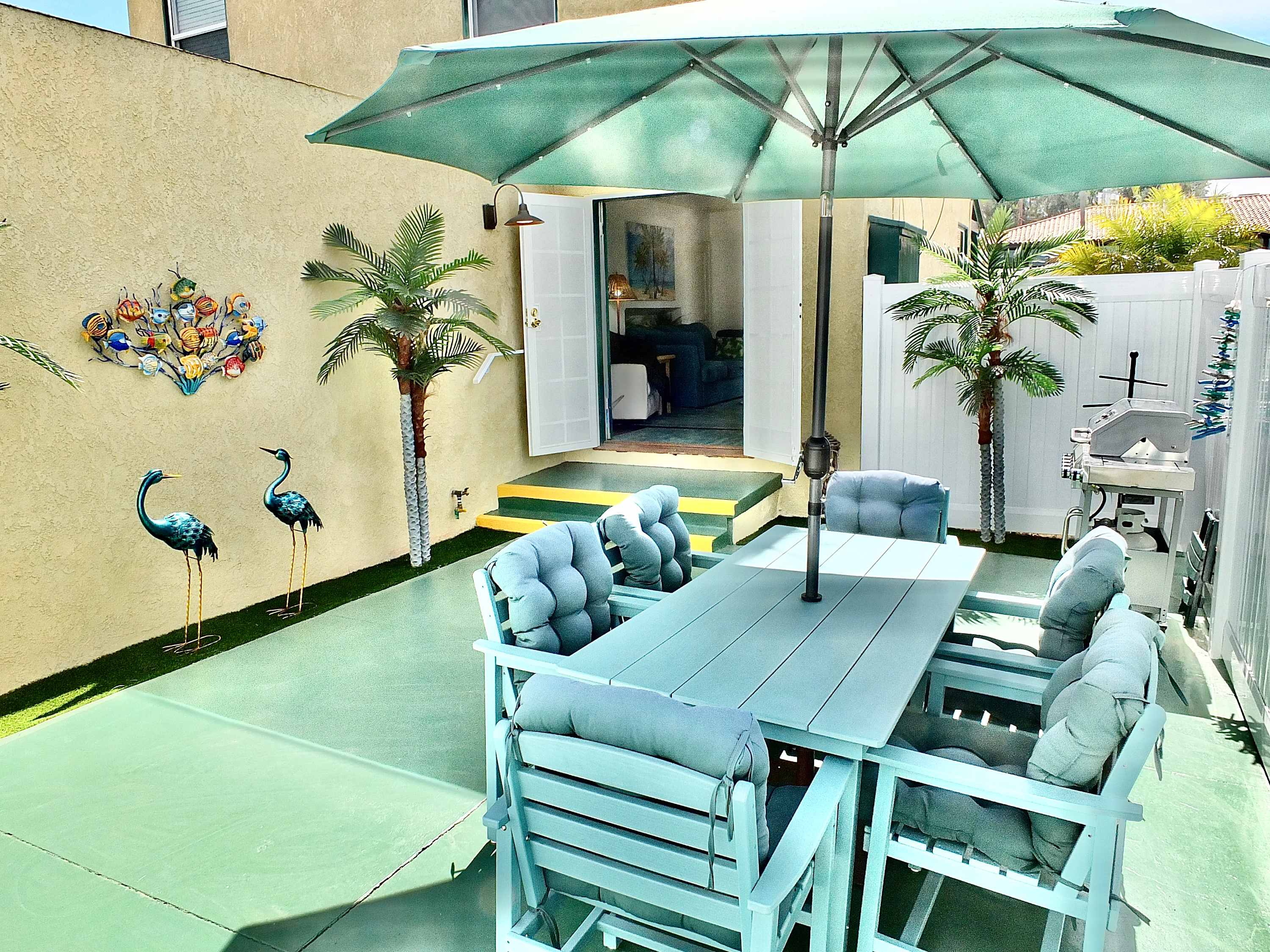Step inside and you’re welcomed by a warm, beachy atmosphere that instantly puts you at ease. The compact kitchen is thoughtfully equipped with stainless steel appliances, a drip and Keurig coffee setup, and everything you need to prepare easy meals at home. Gather around the dining table for four or unwind in the inviting living room, where a smart TV, cozy couch, recliner, and armchair create the perfect space to relax after a day in the sun. Step outside to the private patio and you’ll find your own outdoor oasis—complete with a grill and a dining table for six, perfect for al fresco dinners under the coastal sky.