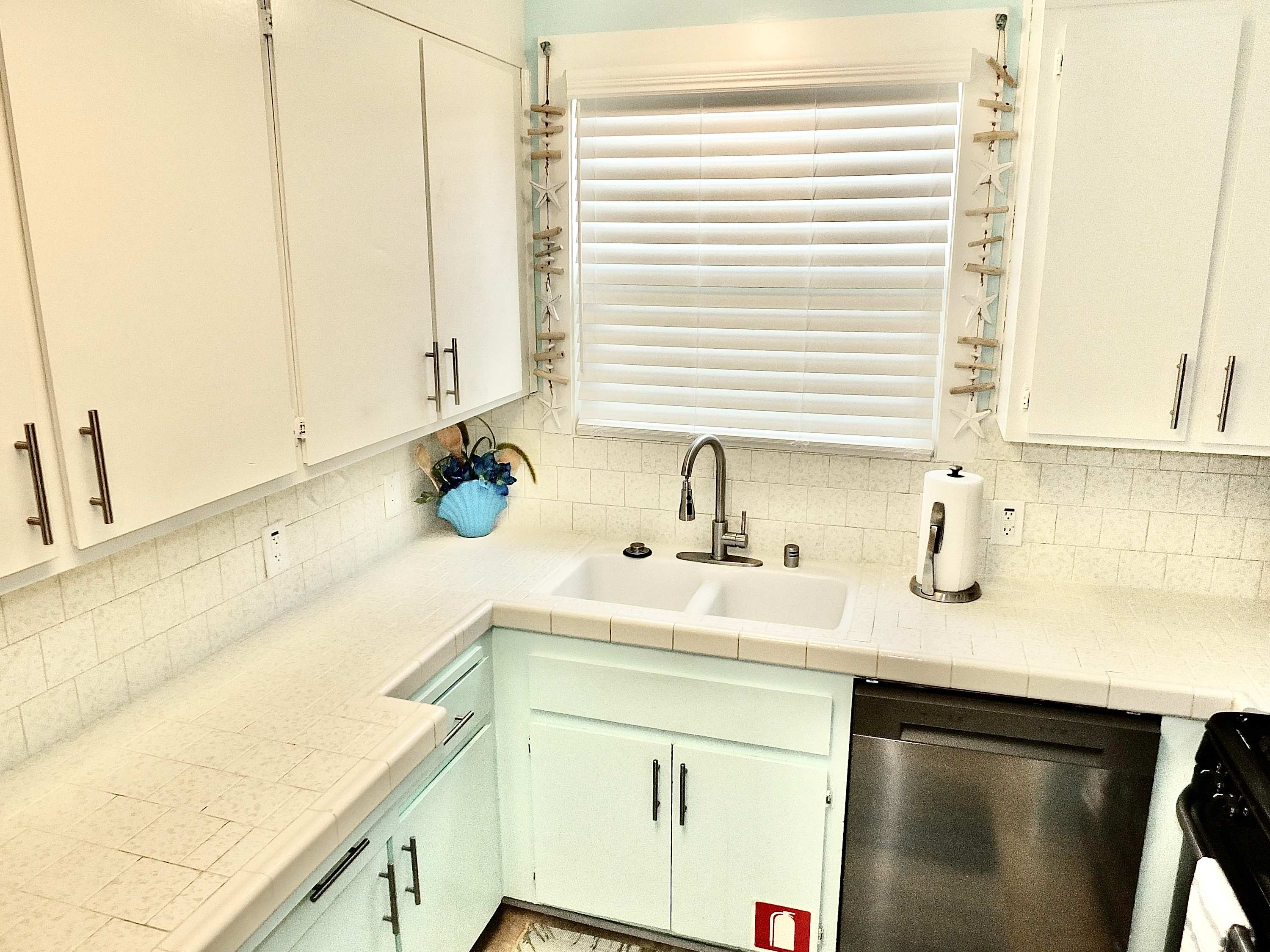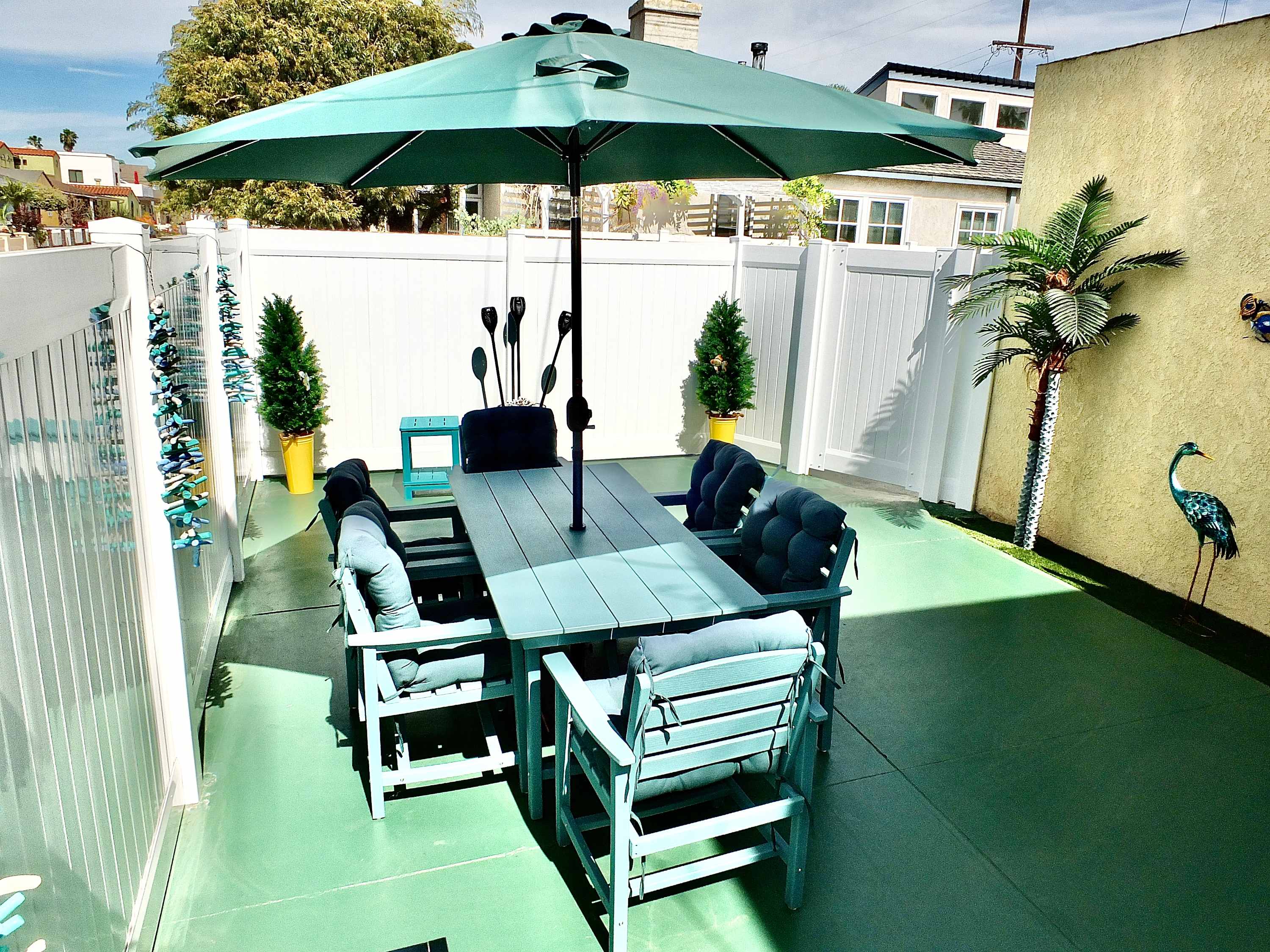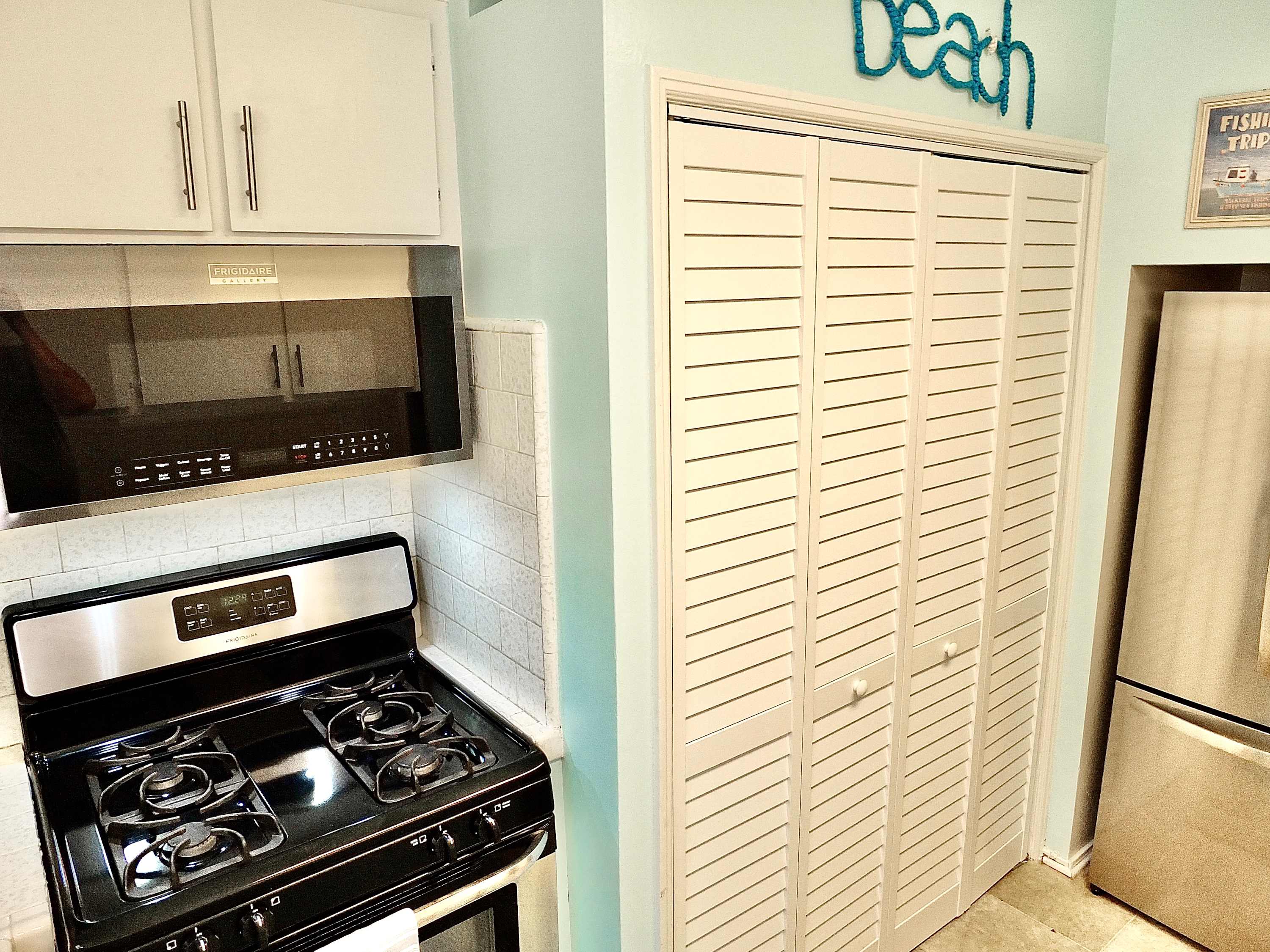 Step inside and you’re welcomed by a warm, beachy atmosphere that instantly puts you at ease. The compact kitchen is thoughtfully equipped with stainless steel appliances, a drip and Keurig coffee setup, and everything you need to prepare easy meals at home. Gather around the dining table for four or unwind in the inviting living room, where a smart TV, cozy couch, recliner, and armchair create the perfect space to relax after a day in the sun. Step outside to the private patio and you’ll find your own outdoor oasis—complete with a grill and a dining table for six, perfect for al fresco dinners under the coastal sky.