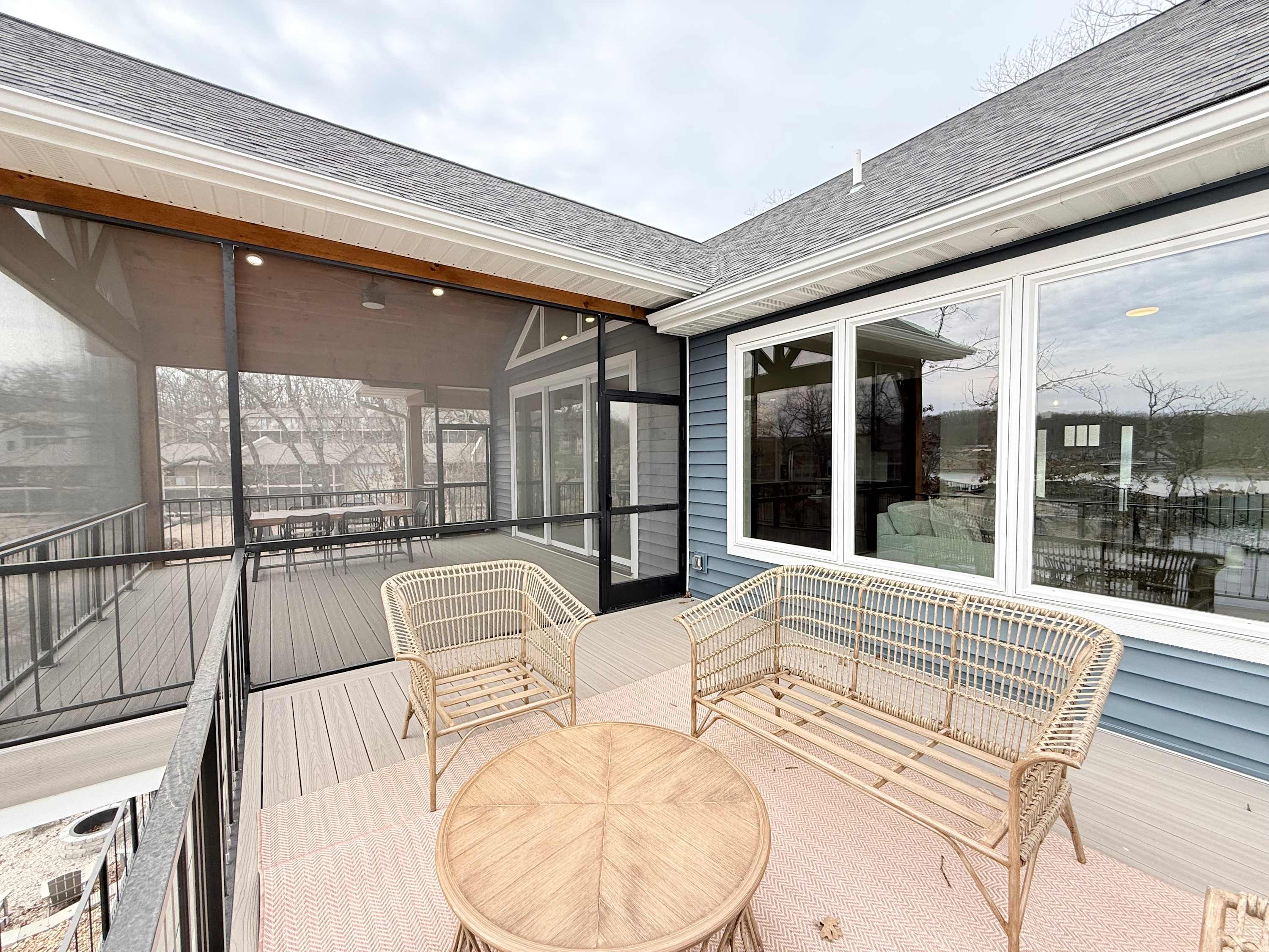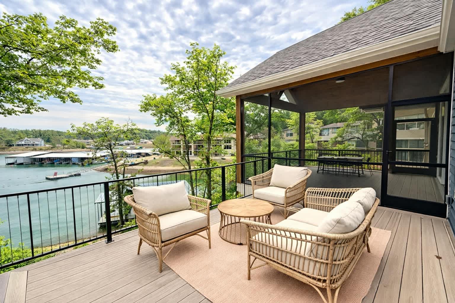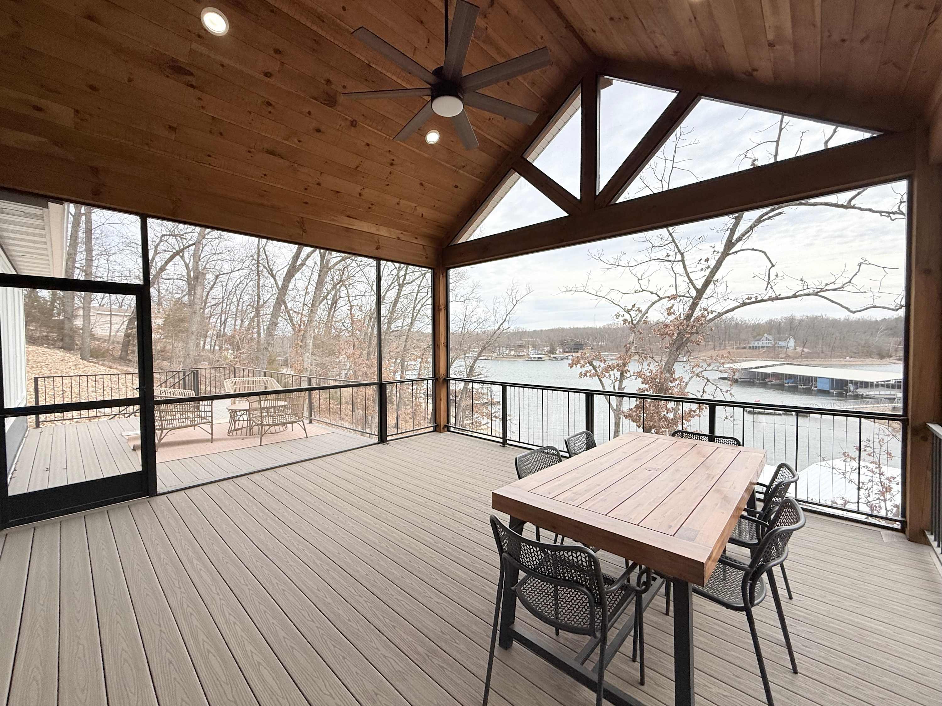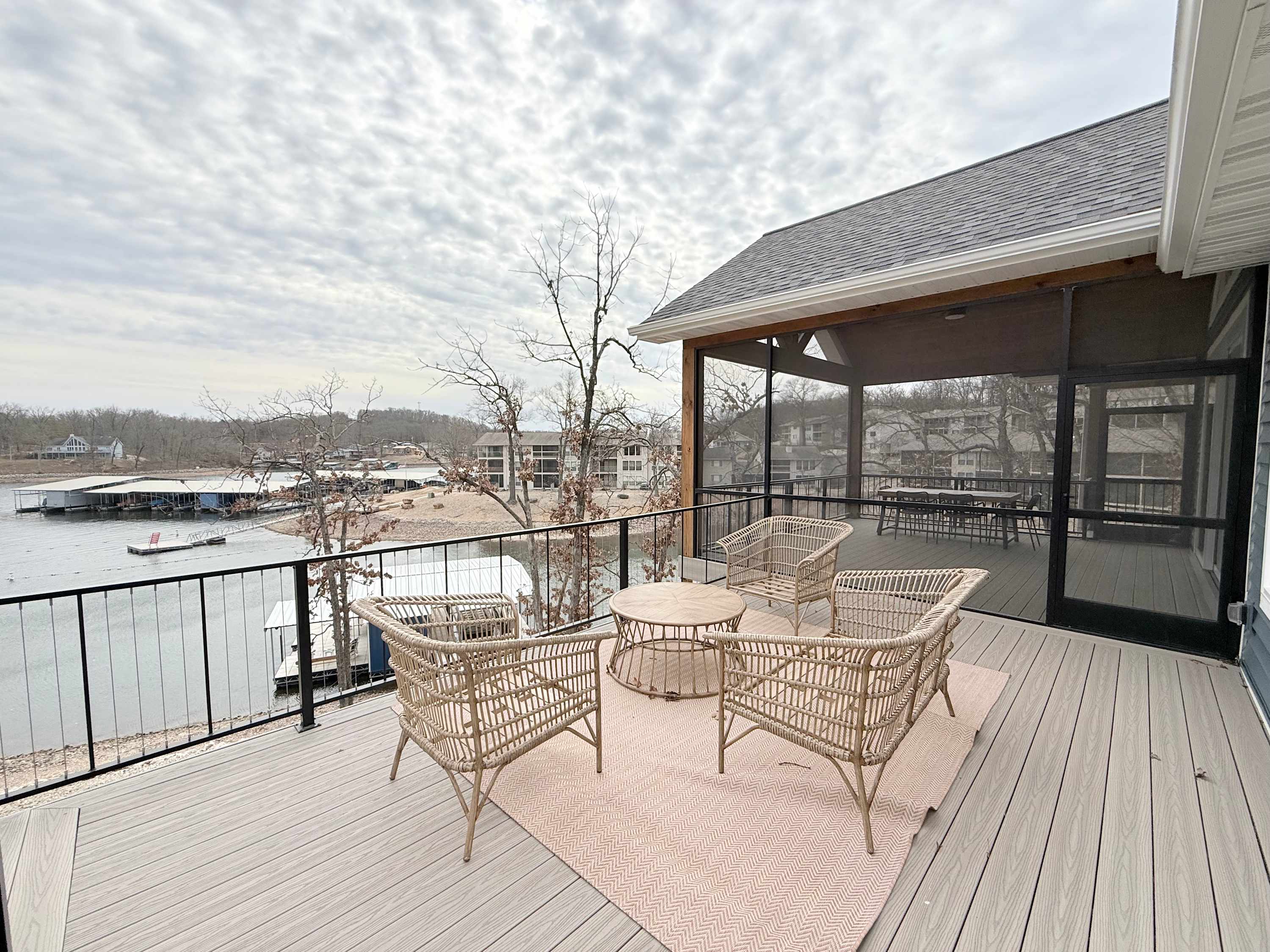 Step inside the main house and you’re greeted by a bright, open living space filled with natural light. The main floor living area is warm and welcoming, featuring a smart TV, cozy fireplace, plush couch, and armchair—perfect for gathering after a day on the water. The kitchen offers generous counter seating for five, making it easy to stay connected while preparing meals, while the dining table for six sets the scene for shared dinners and conversation. A screened-in deck with a dining table invites you to enjoy al fresco meals with sweeping lake views, while a lower-level deck provides another comfortable space to unwind.