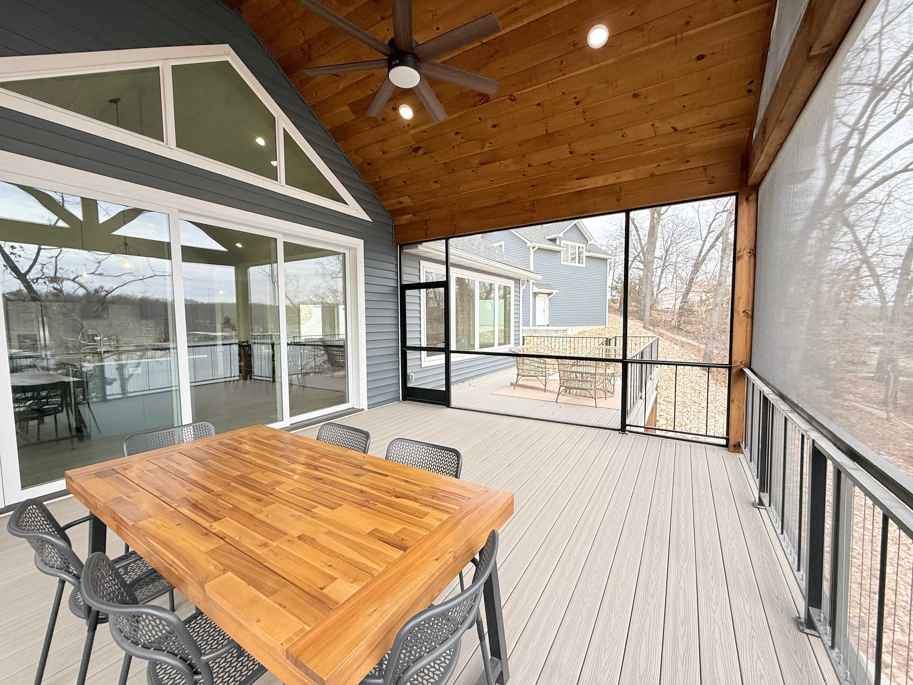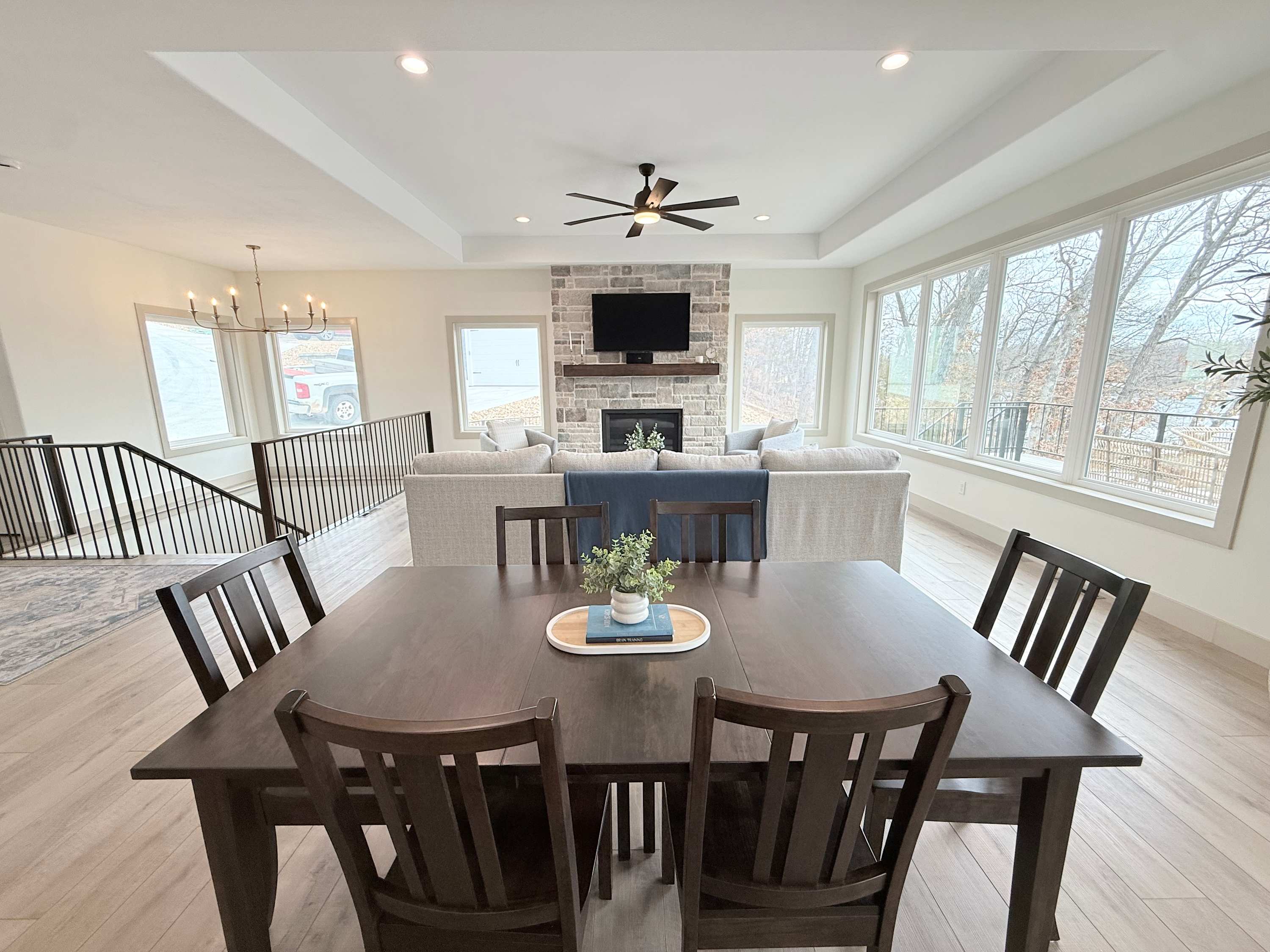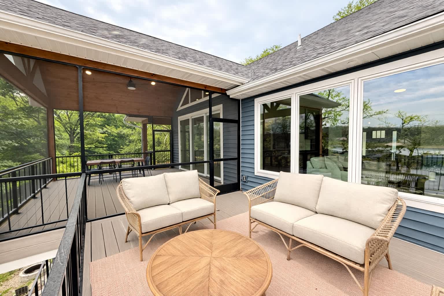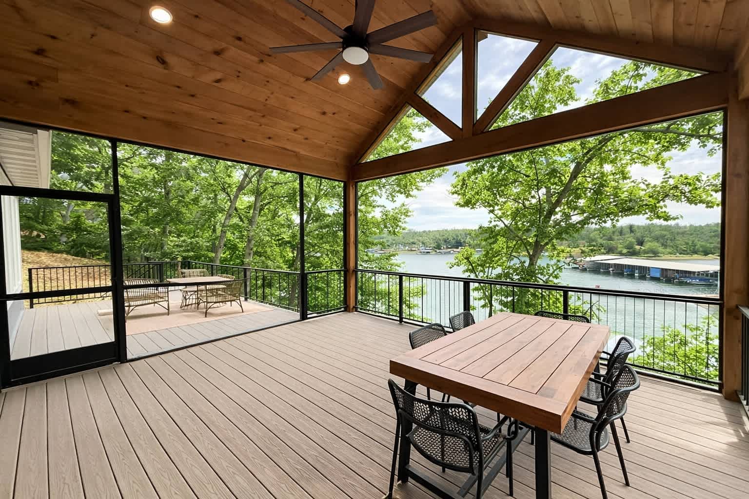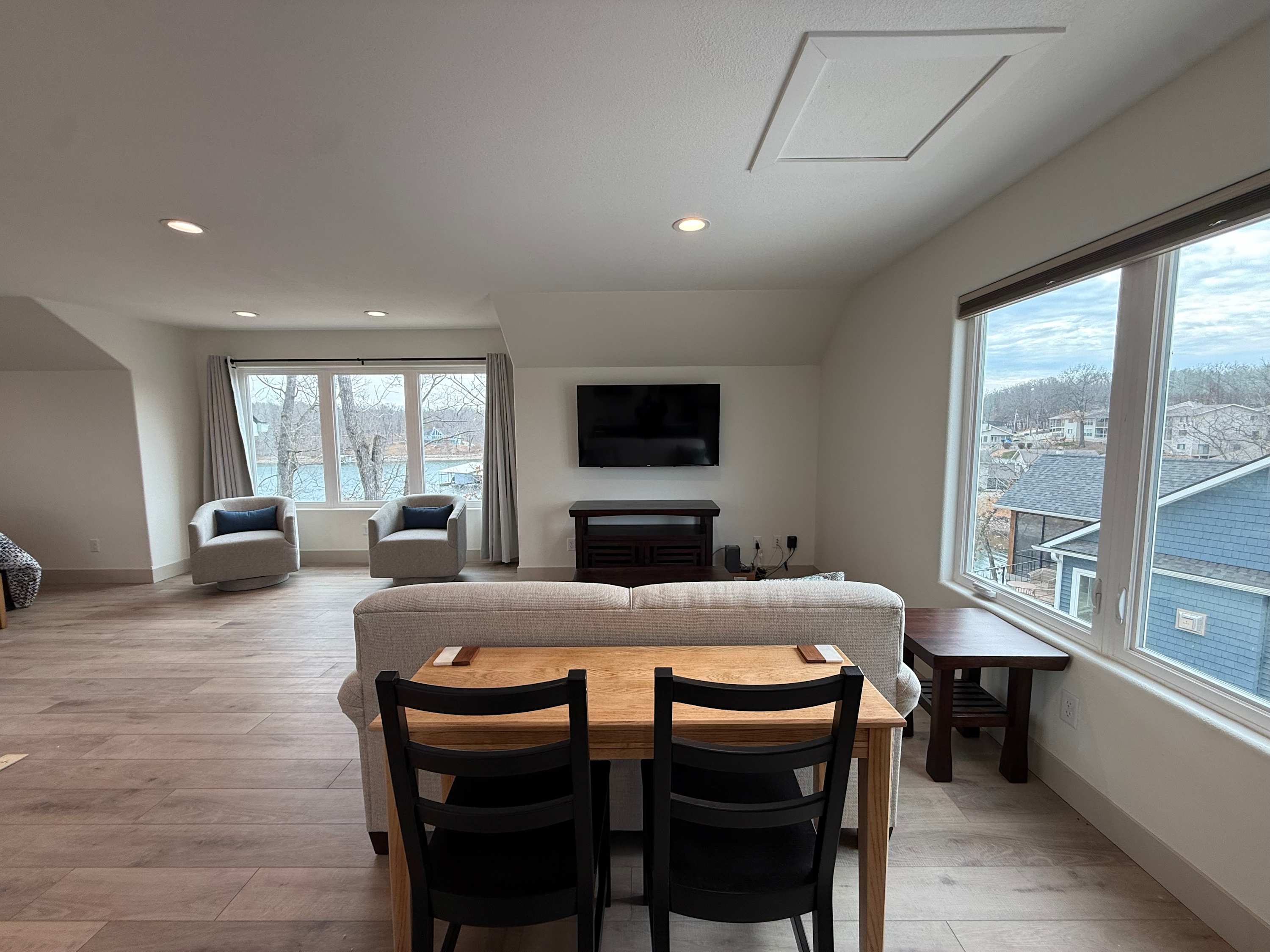 Step inside the main house and you’re greeted by a bright, open living space filled with natural light. The main floor living area is warm and welcoming, featuring a smart TV, cozy fireplace, plush couch, and armchair—perfect for gathering after a day on the water. The kitchen offers generous counter seating for five, making it easy to stay connected while preparing meals, while the dining table for six sets the scene for shared dinners and conversation. A screened-in deck with a dining table invites you to enjoy al fresco meals with sweeping lake views, while a lower-level deck provides another comfortable space to unwind.